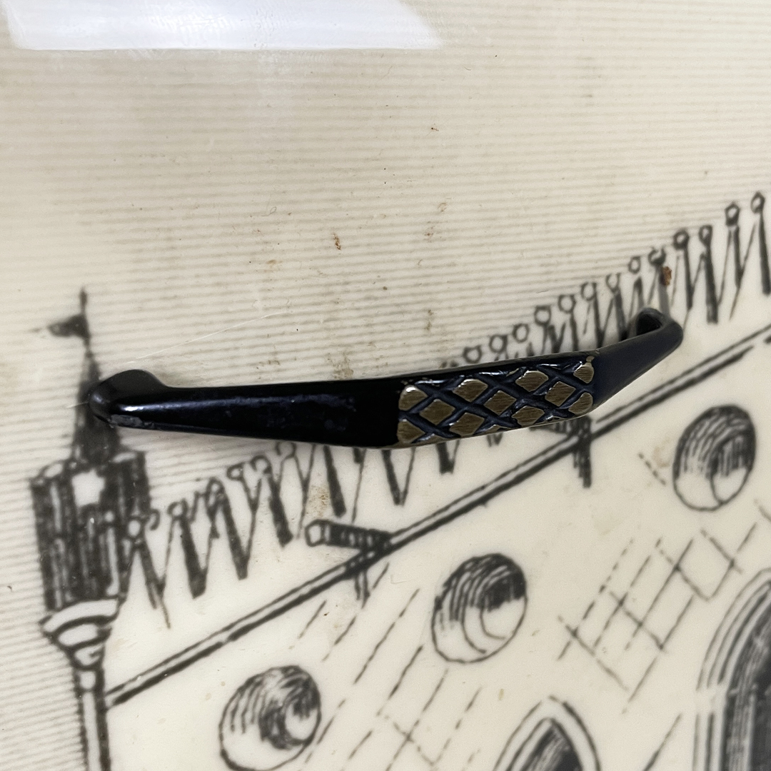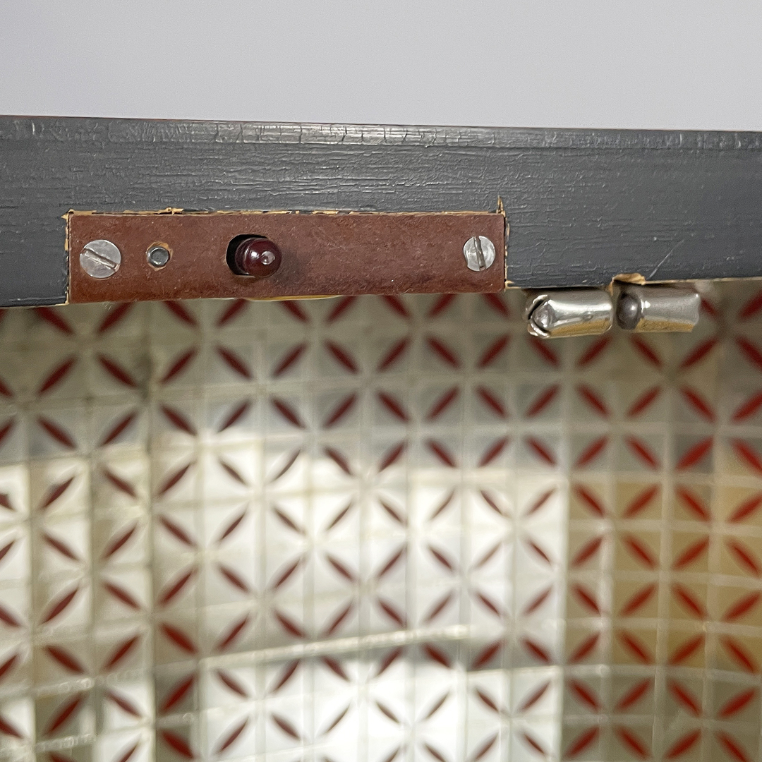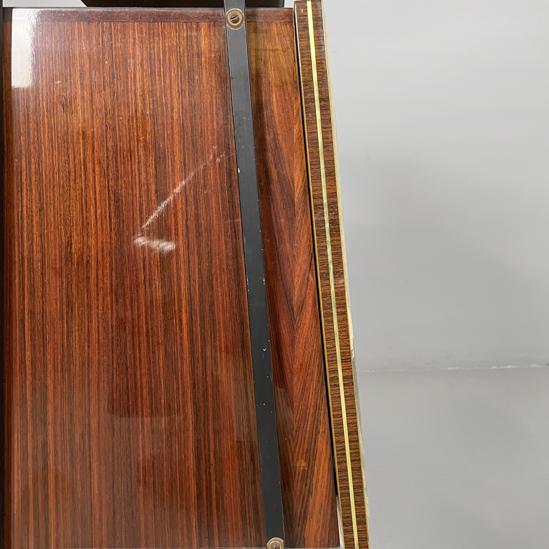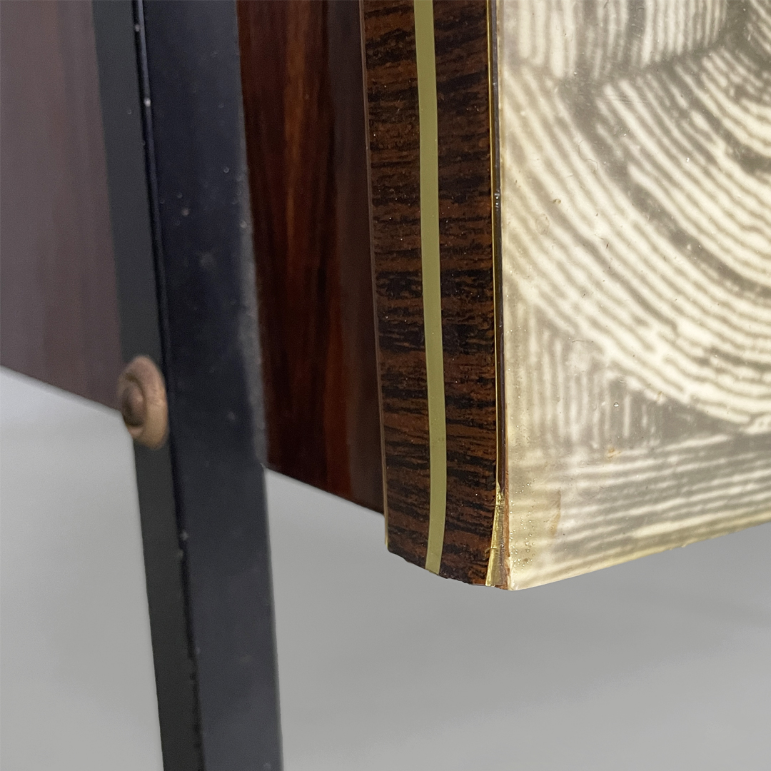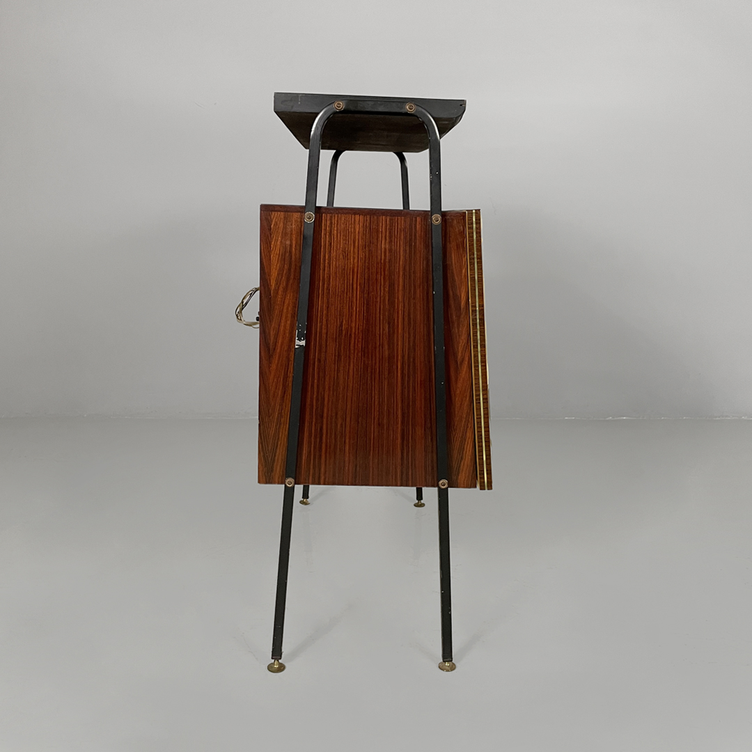 Mobile bar rettangolare interamente in legno. Presenta una struttura in metallo nero con piedini tondi in ottone regolabili. Il corpo è realizzato in legno, il fronte presenta un pannello decorativo illustrato, con un ambientazione veneziana. L’interno è rifinito con una grafica geometrica specchiata dai toni rossi e presenta una passamaneria di colore rosa. Il mobile è provvisto di illuminazione interna automatica all’apertura dello sportello.