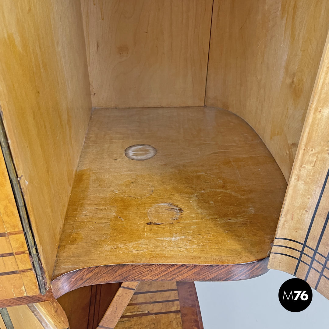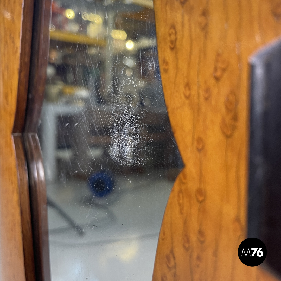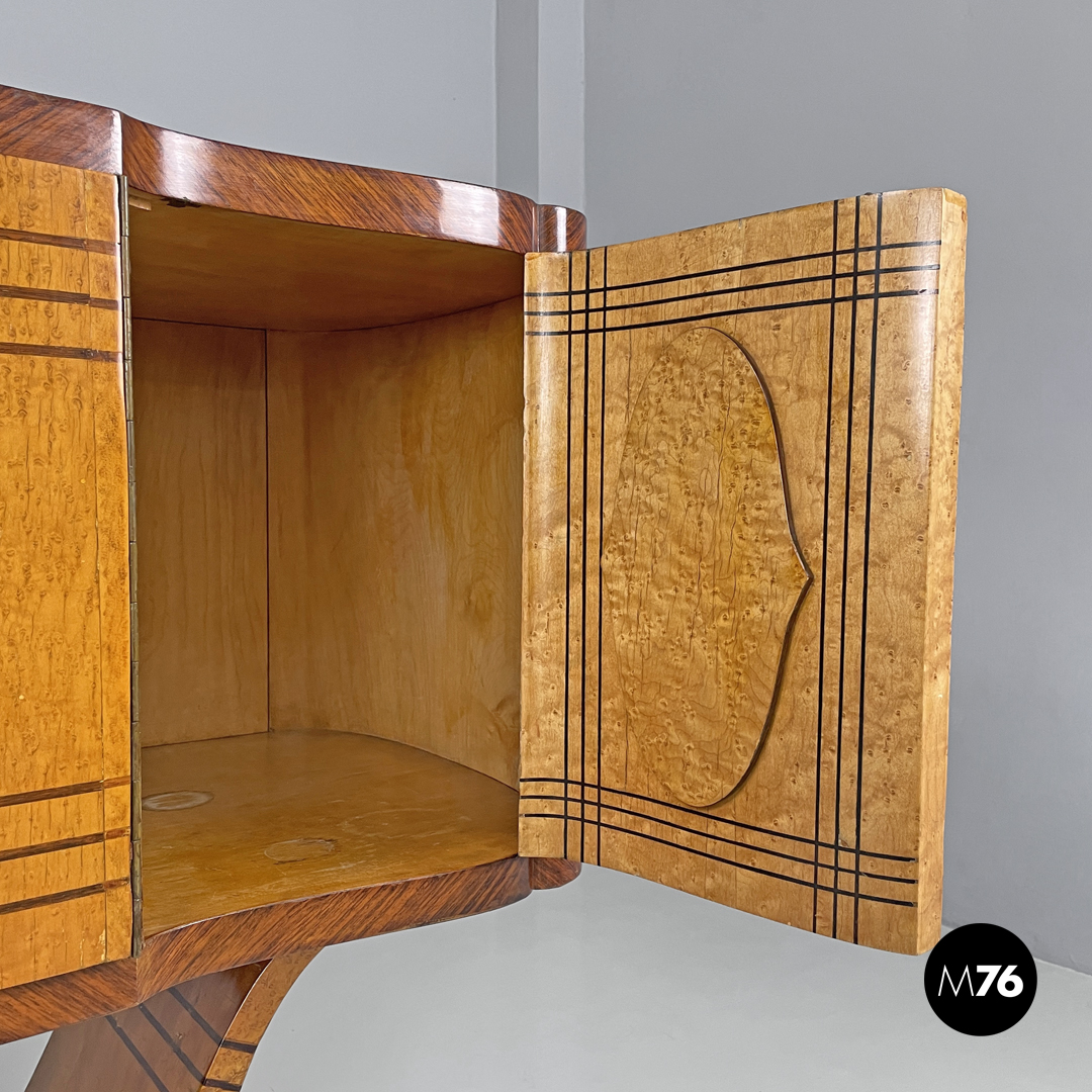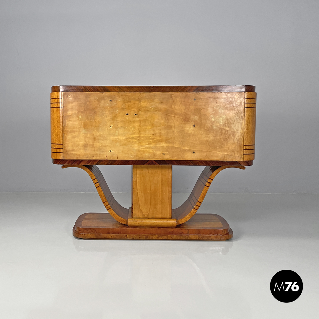 Mobile bar, sideboard, credenza o consolle in legno. Il piano è rettangolare allungato con angoli stondati, la parte frontale presenta cinque ante: due esterne con specchi che si aprono su due vani aperti e due centrali con all’interno quattro due cassetti e un piano estraibile, ed infine un’anta più piccola nella parte bassa. La base è della stessa forma del piano ma più piccola. Il mobile è interamente decorato da intarsi lineari e bordature di legno più scuro.
