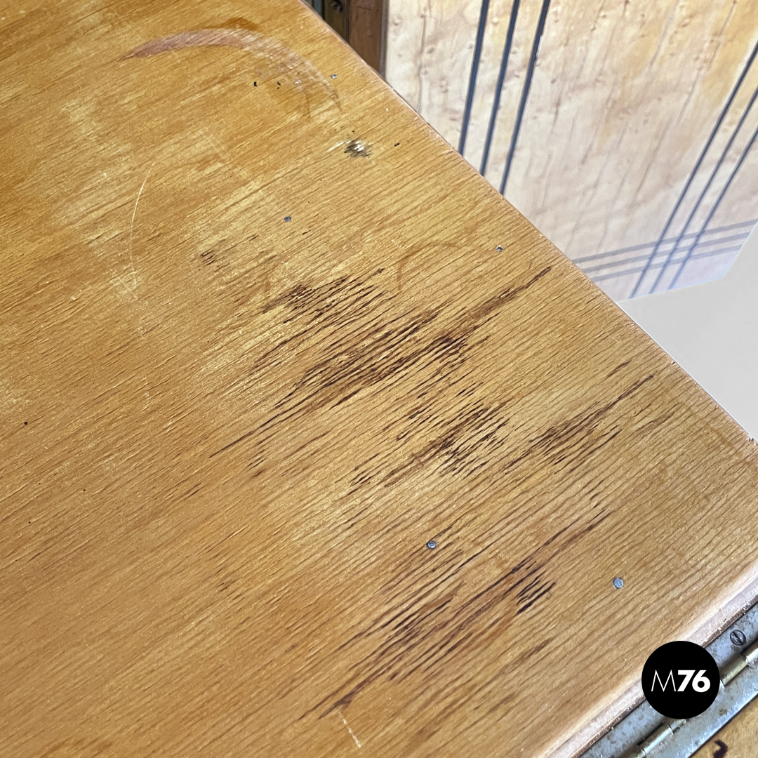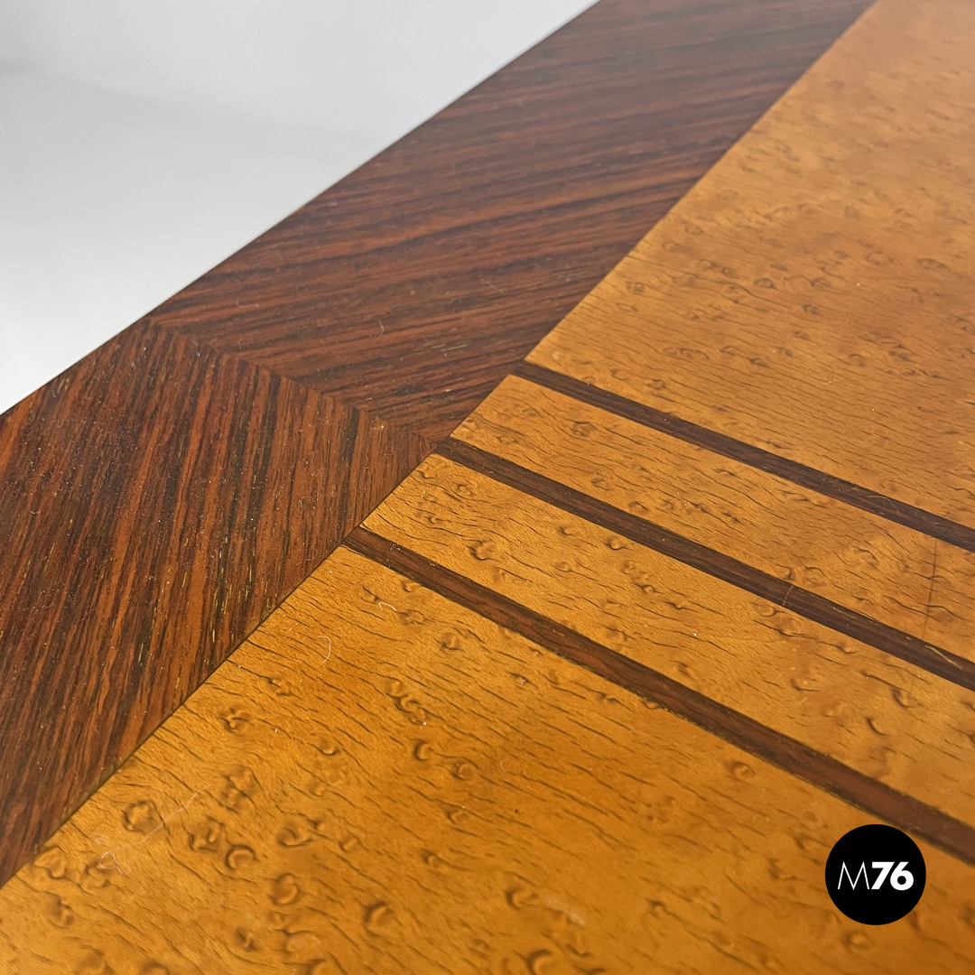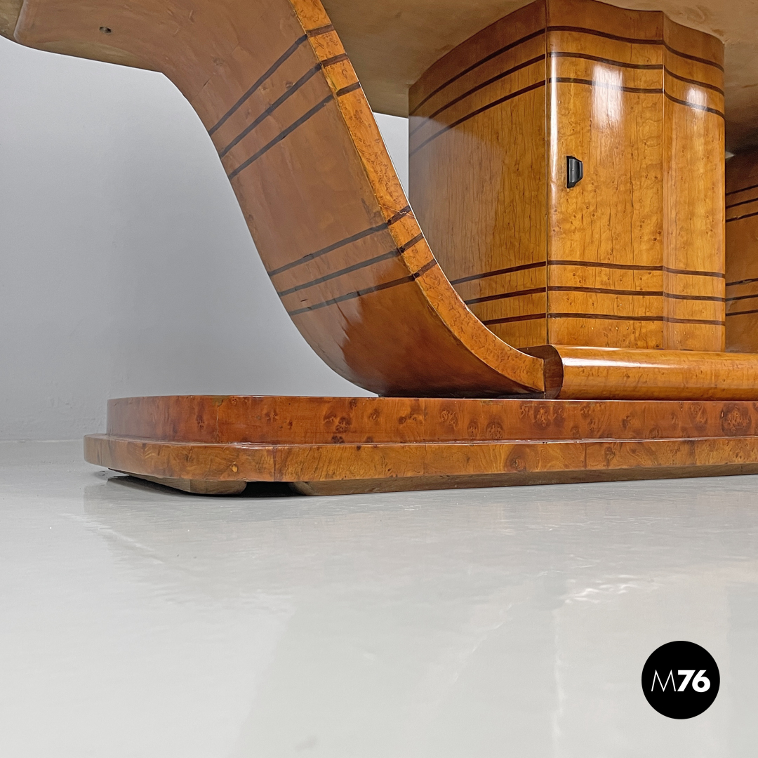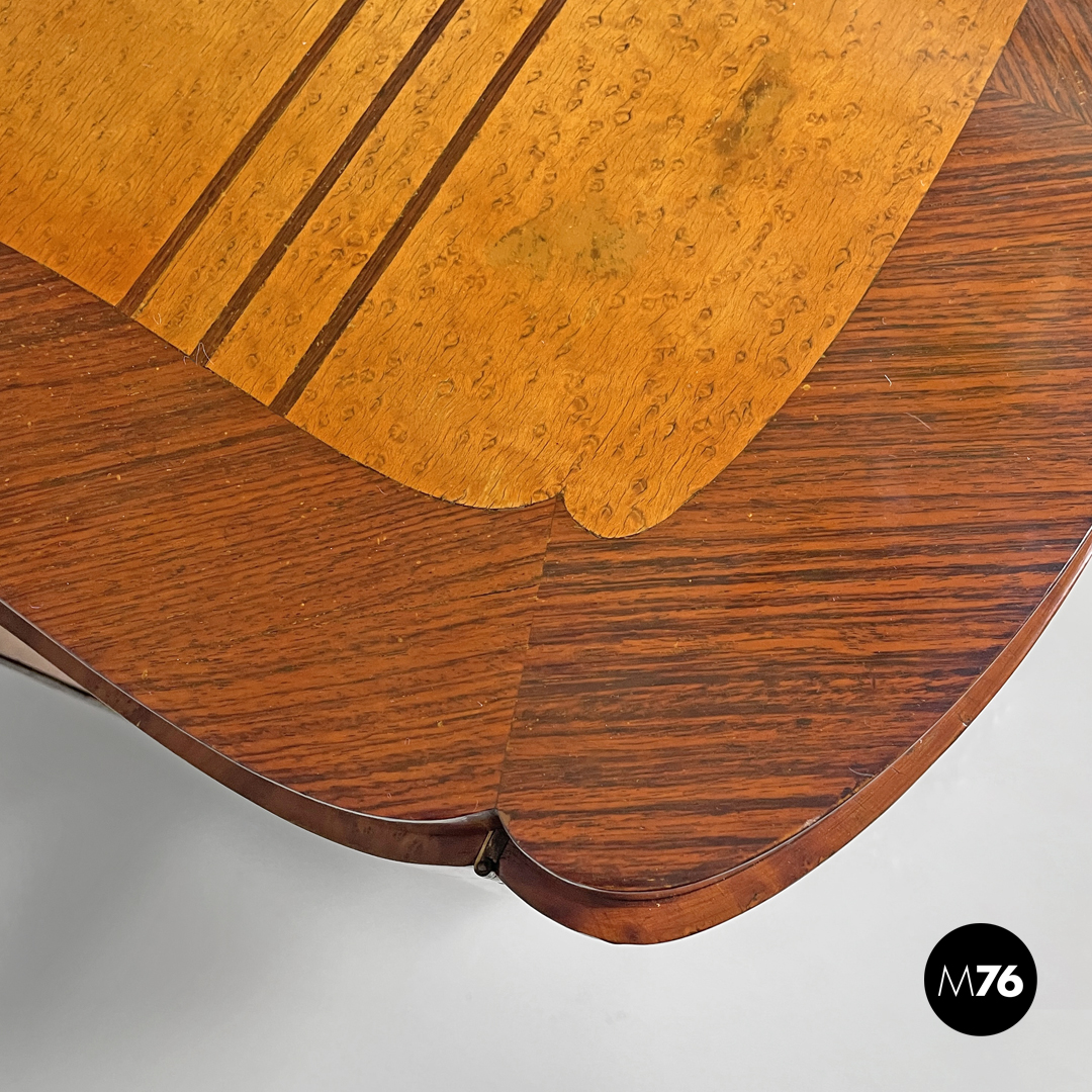 Mobile bar, sideboard, credenza o consolle in legno. Il piano è rettangolare allungato con angoli stondati, la parte frontale presenta cinque ante: due esterne con specchi che si aprono su due vani aperti e due centrali con all’interno quattro due cassetti e un piano estraibile, ed infine un’anta più piccola nella parte bassa. La base è della stessa forma del piano ma più piccola. Il mobile è interamente decorato da intarsi lineari e bordature di legno più scuro.