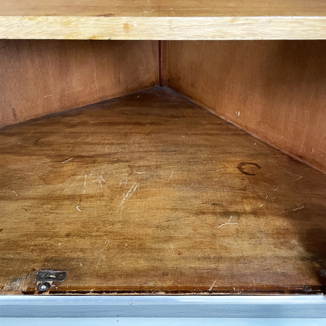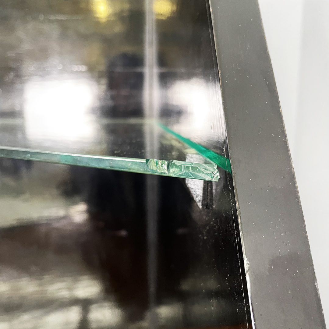 Condizioni vintage, segni di usura e del tempo, presenti diversi segni, graffi e macchie sul legno e sul metallo. Il vetro di una mensola presenta una sbeccatura.