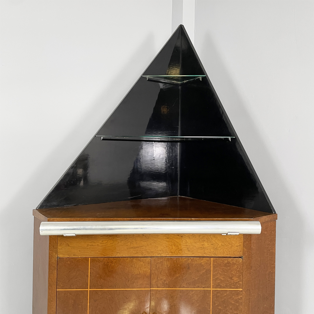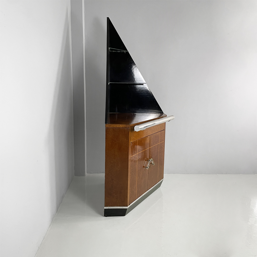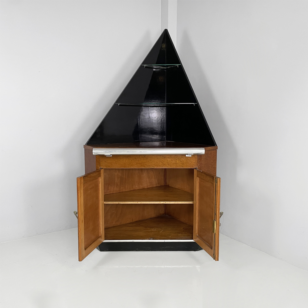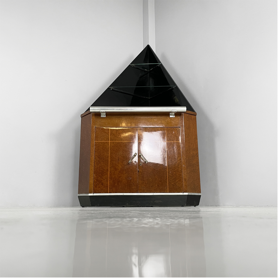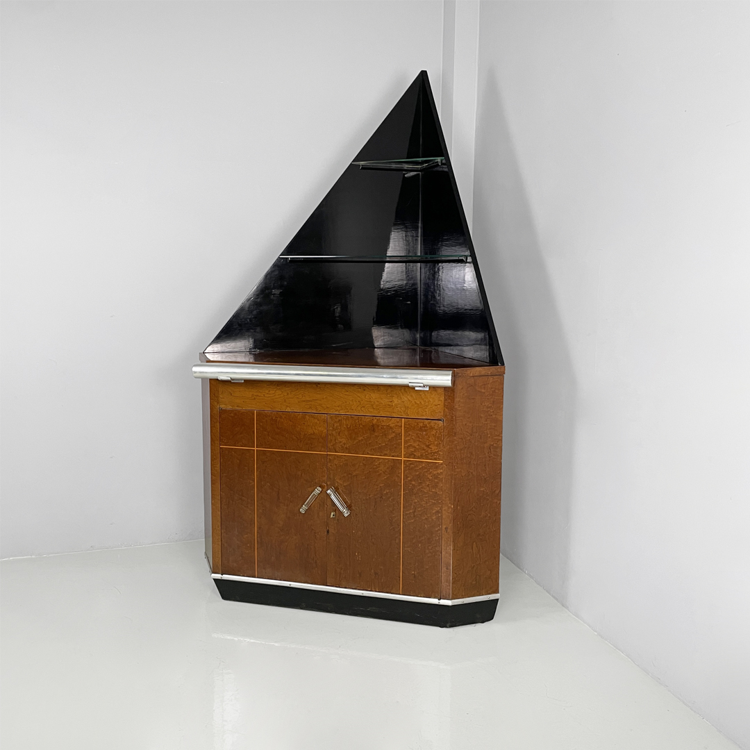 Mobile bar angolare in legno. La parte superiore ha una struttura triangolare verniciata di nero lucido, con due mensole sempre di forma triangolare in vetro. La parte inferiore è in radica di noce, comprende due ante con maniglia in vetro trasparente e chiave che si aprono rivelando un vano interno con ripiano intermedio. Le ante inferiori presentano un raffinato decoro geometrico lineare, costituito da filetti sottili intarsiati, che definiscono riquadri rettangolari. La base è di colore nero. E’ presente sul fronte un maniglione tubolare in metallo. Il retro nella parte inferiore non è rifinito.