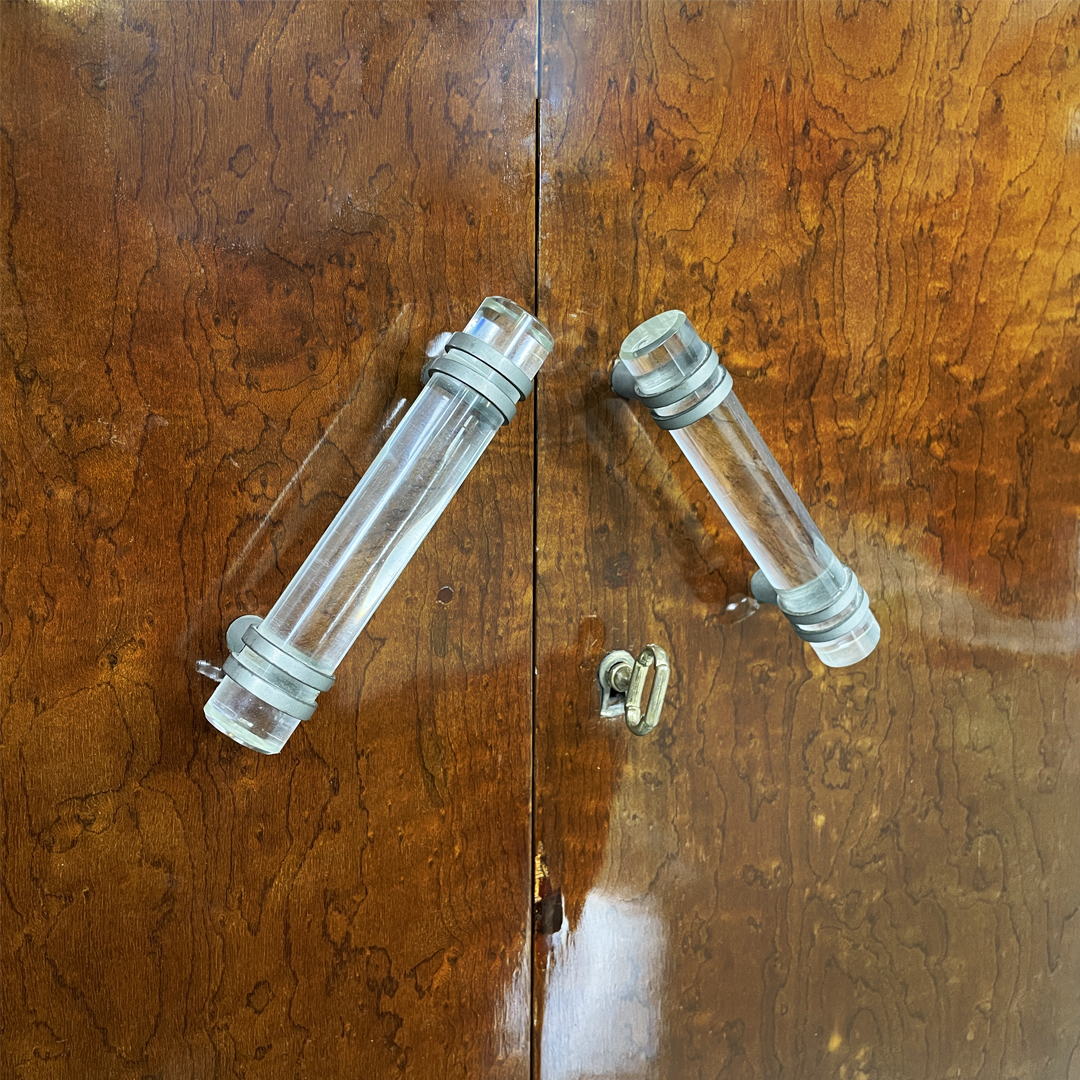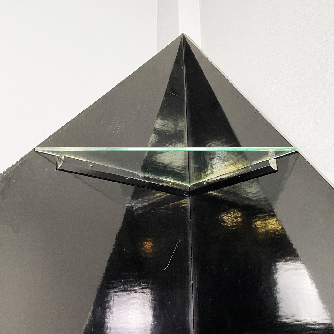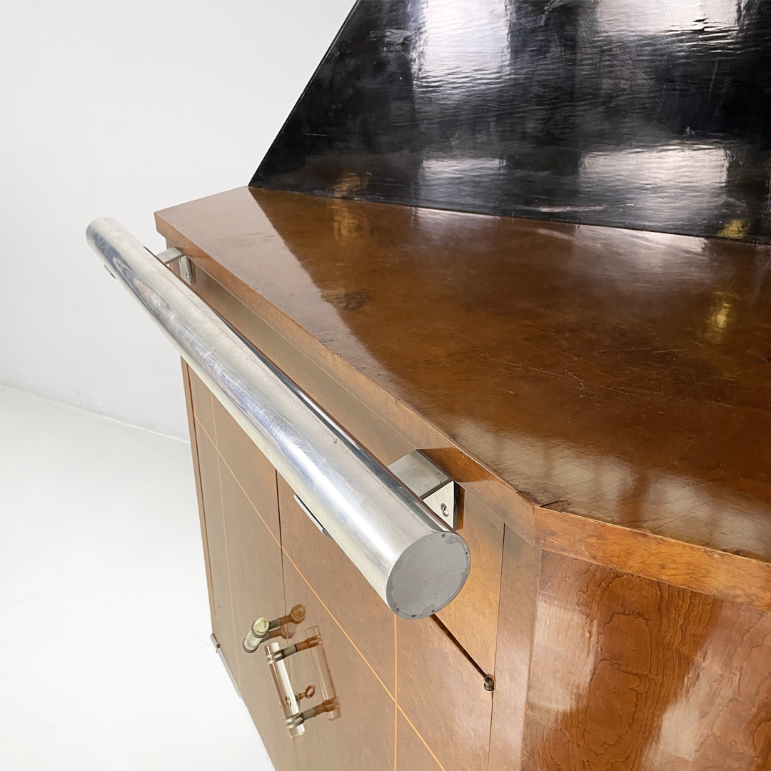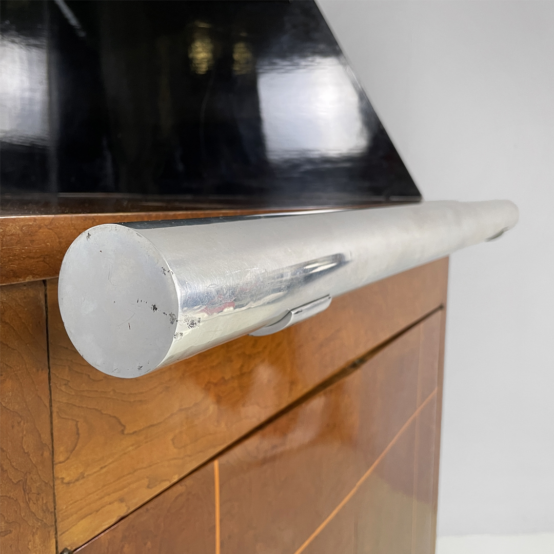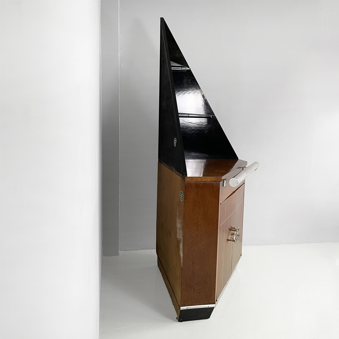 Mobile bar angolare in legno. La parte superiore ha una struttura triangolare verniciata di nero lucido, con due mensole sempre di forma triangolare in vetro. La parte inferiore è in radica di noce, comprende due ante con maniglia in vetro trasparente e chiave che si aprono rivelando un vano interno con ripiano intermedio. Le ante inferiori presentano un raffinato decoro geometrico lineare, costituito da filetti sottili intarsiati, che definiscono riquadri rettangolari. La base è di colore nero. E’ presente sul fronte un maniglione tubolare in metallo. Il retro nella parte inferiore non è rifinito.