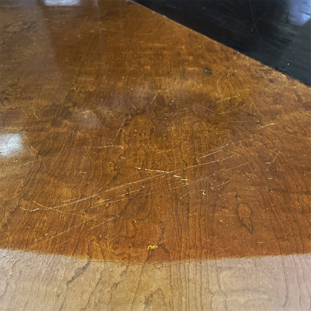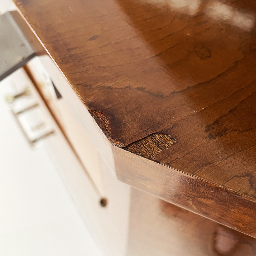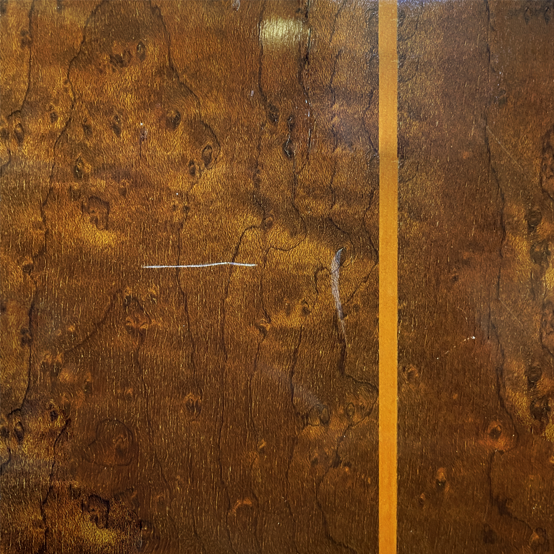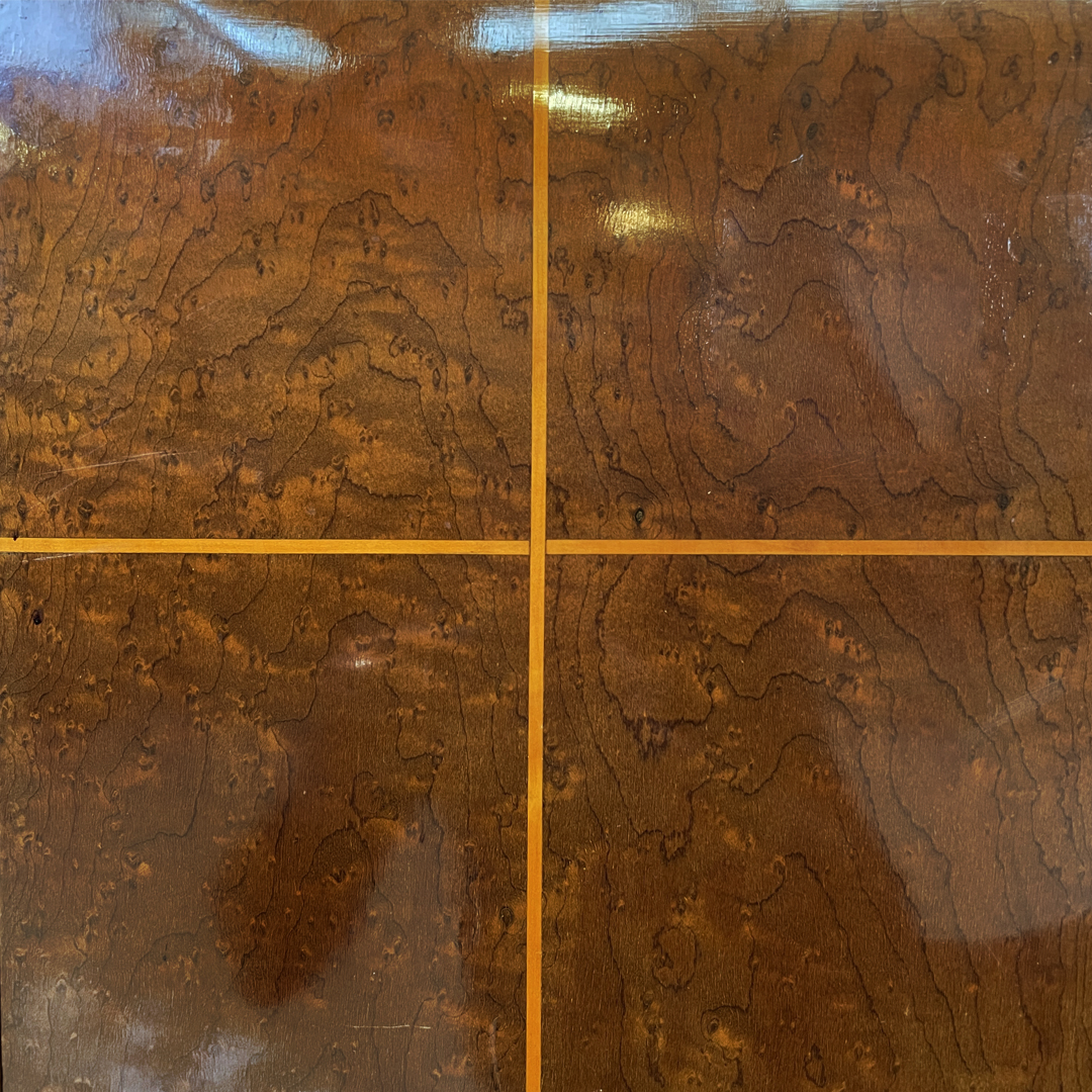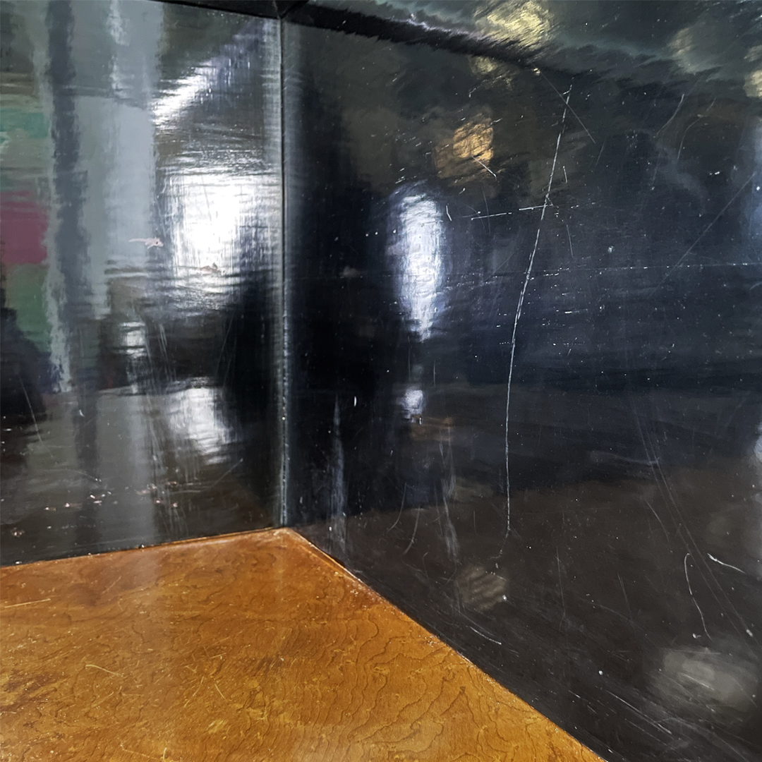 Mobile bar angolare in legno. La parte superiore ha una struttura triangolare verniciata di nero lucido, con due mensole sempre di forma triangolare in vetro. La parte inferiore è in radica di noce, comprende due ante con maniglia in vetro trasparente e chiave che si aprono rivelando un vano interno con ripiano intermedio. Le ante inferiori presentano un raffinato decoro geometrico lineare, costituito da filetti sottili intarsiati, che definiscono riquadri rettangolari. La base è di colore nero. E’ presente sul fronte un maniglione tubolare in metallo. Il retro nella parte inferiore non è rifinito.