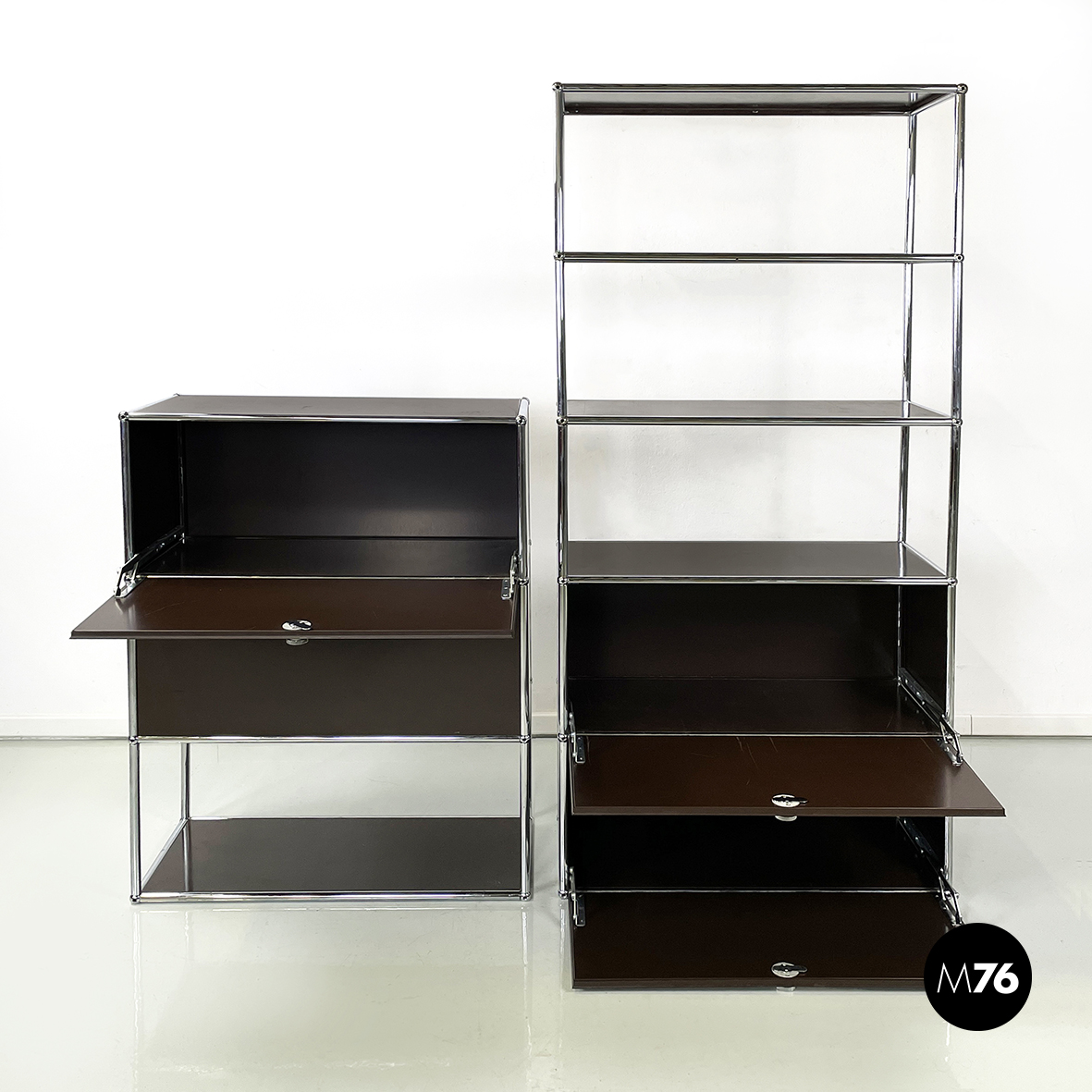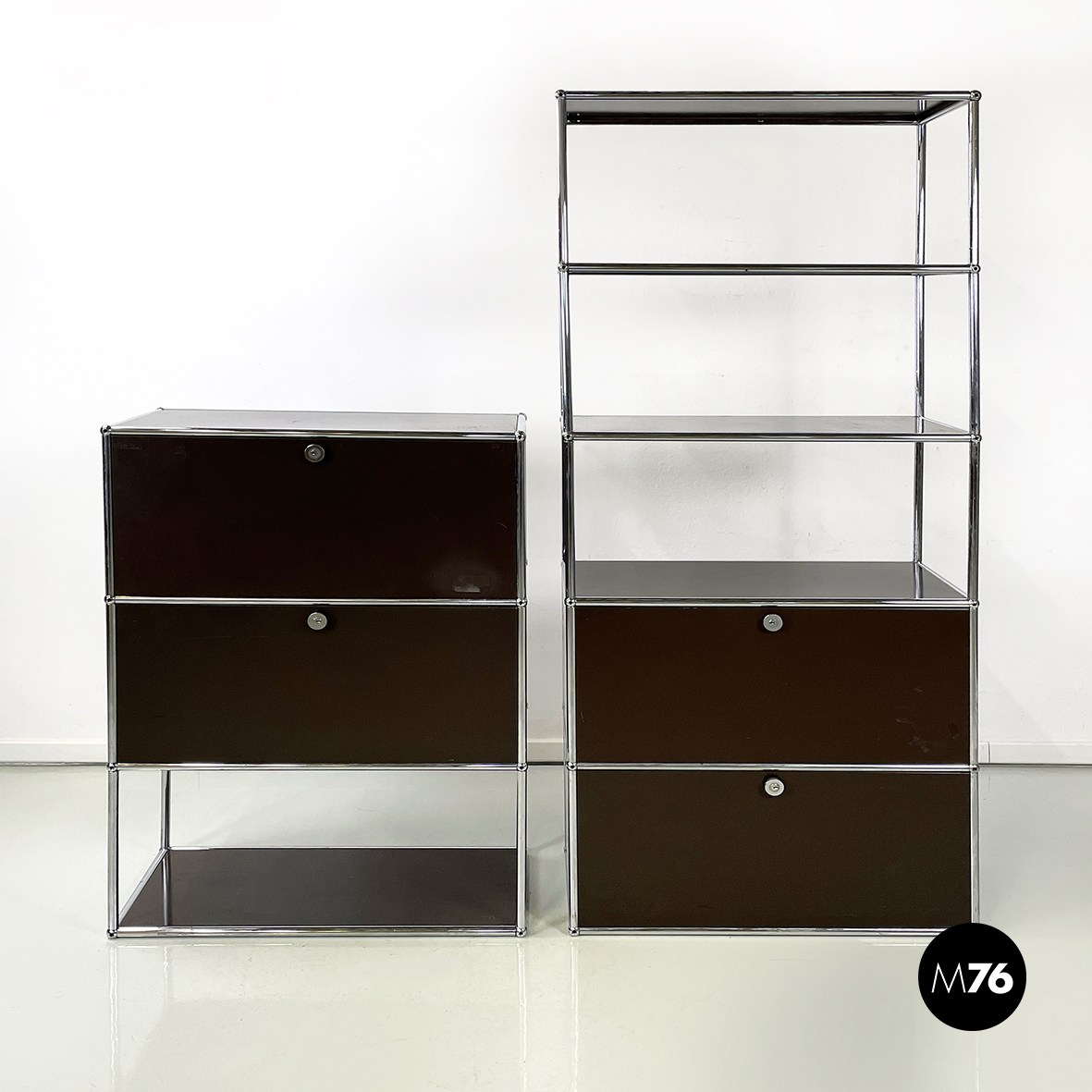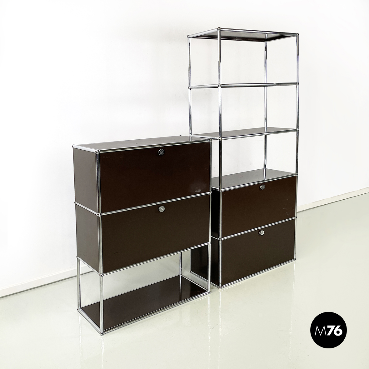 Coppia di mobili contenitori in metallo verniciato marrone scuro con profilo in tondino di metallo. La prima credenza presenta nella parte alta due vani con apertura a ribalta e una mensola nella parte bassa. Il secondo sideboard presenta nella parte alta tre mensole e nella parte bassa due vani con apertura a ribalta. Aprendo l’anta dello scomparto si ottiene un comodo ripiano di appoggio che diventa una postazione di lavoro personale o un ripiano di servizio.