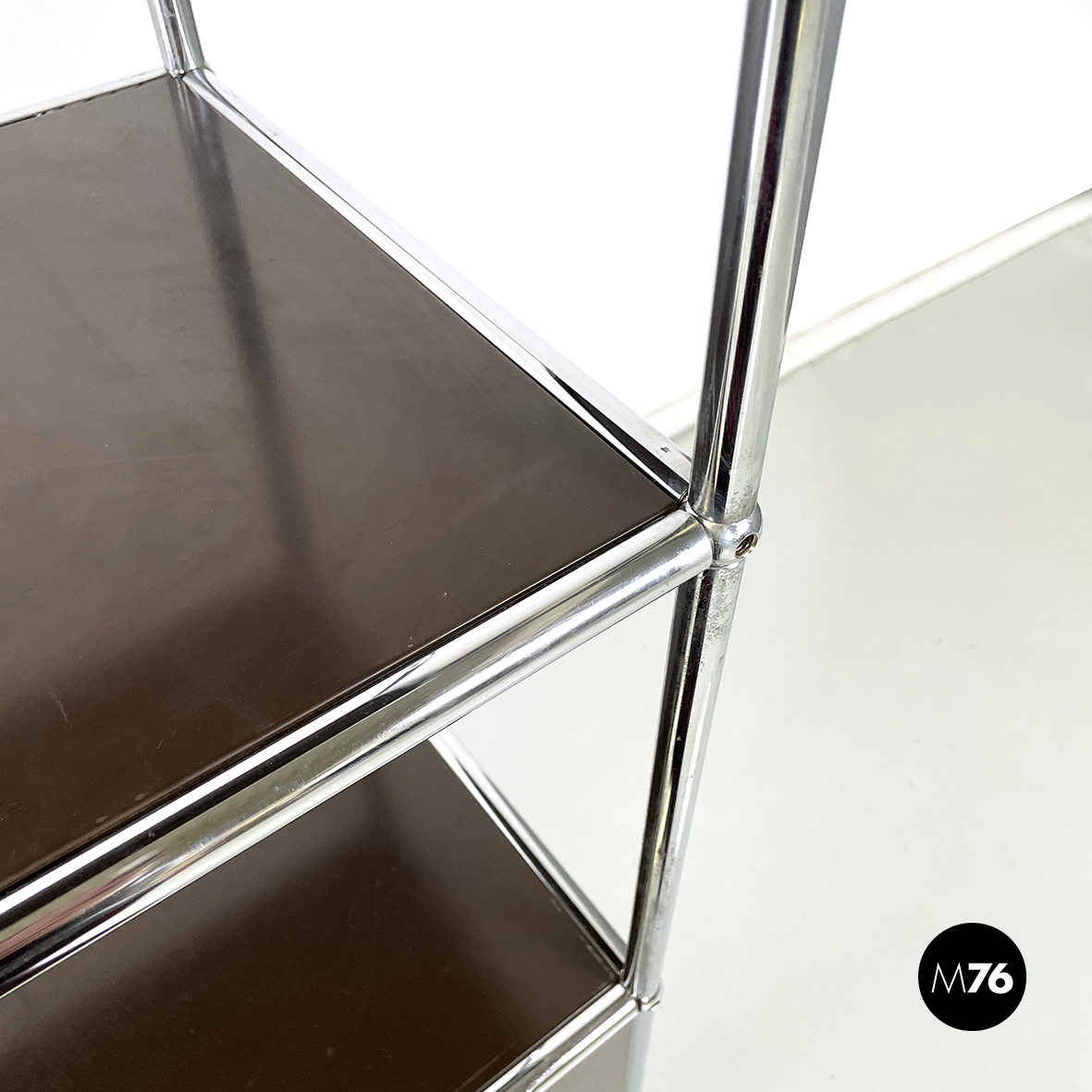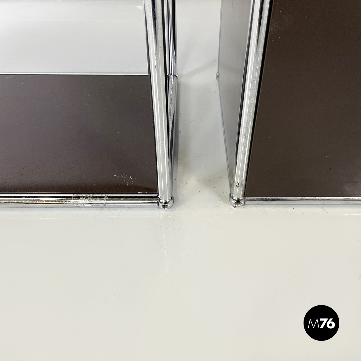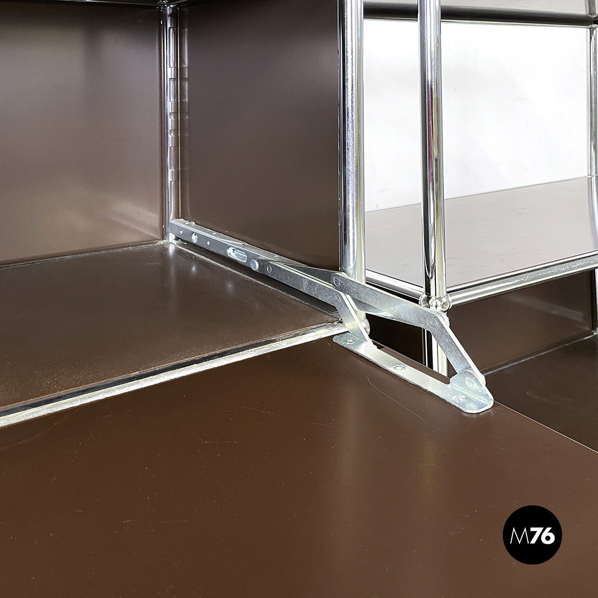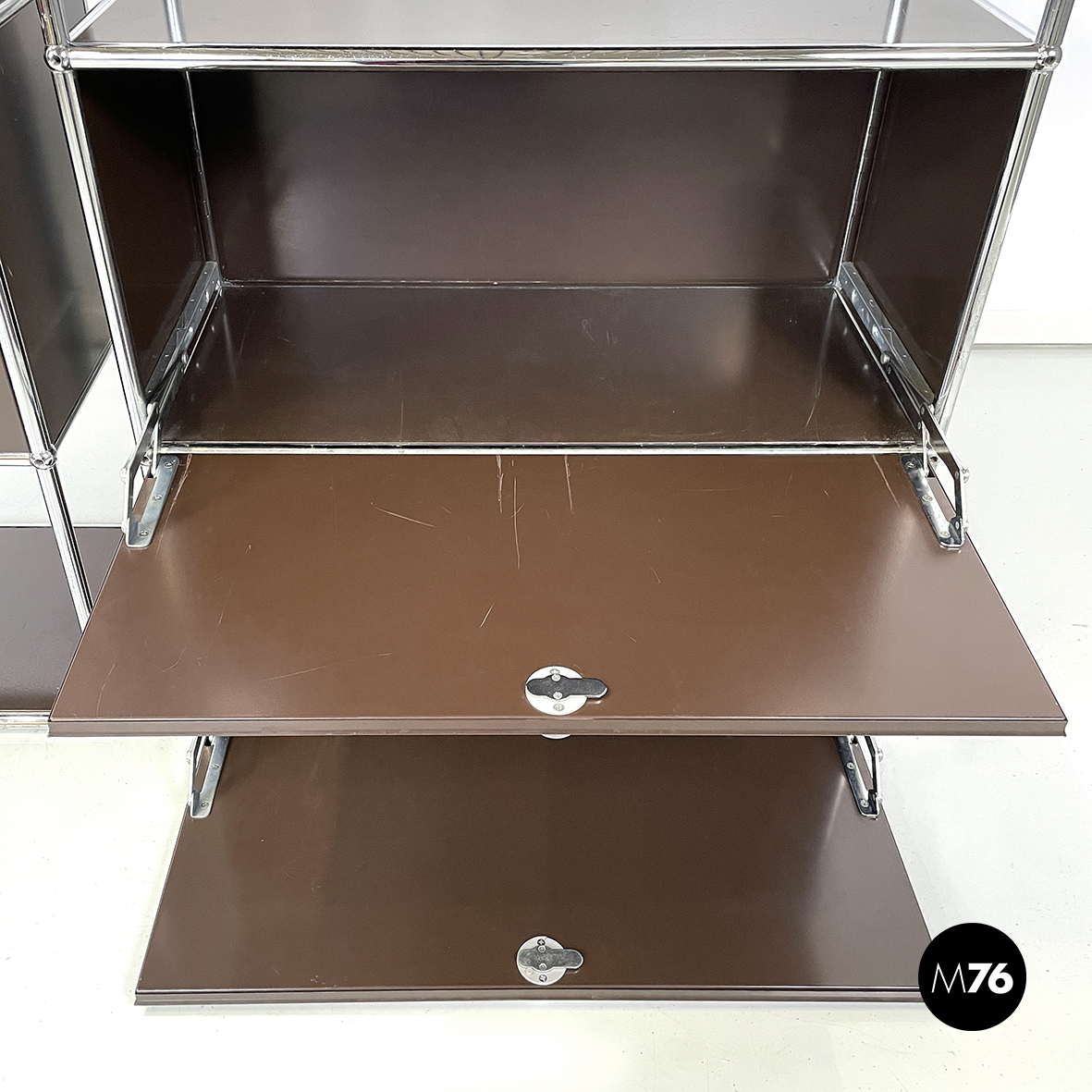 Coppia di mobili contenitori in metallo verniciato marrone scuro con profilo in tondino di metallo. La prima credenza presenta nella parte alta due vani con apertura a ribalta e una mensola nella parte bassa. Il secondo sideboard presenta nella parte alta tre mensole e nella parte bassa due vani con apertura a ribalta. Aprendo l’anta dello scomparto si ottiene un comodo ripiano di appoggio che diventa una postazione di lavoro personale o un ripiano di servizio.