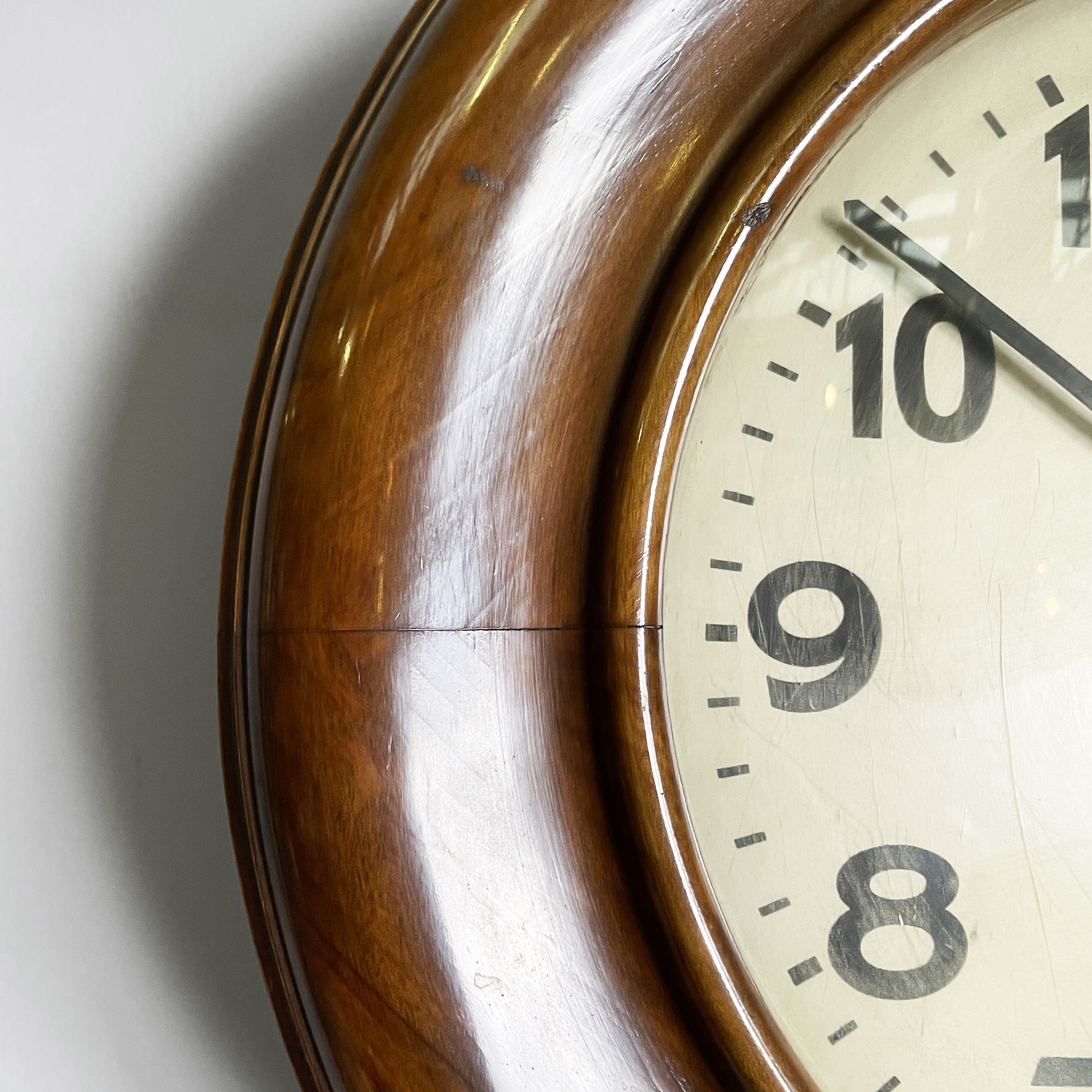 Orologio da parete in legno. Il quadrante tondo presenta un fondo in beige con numeri in nero, lancette nere e chiusura con vetro. La struttura in legno è di forma esagonale. Art Deco.