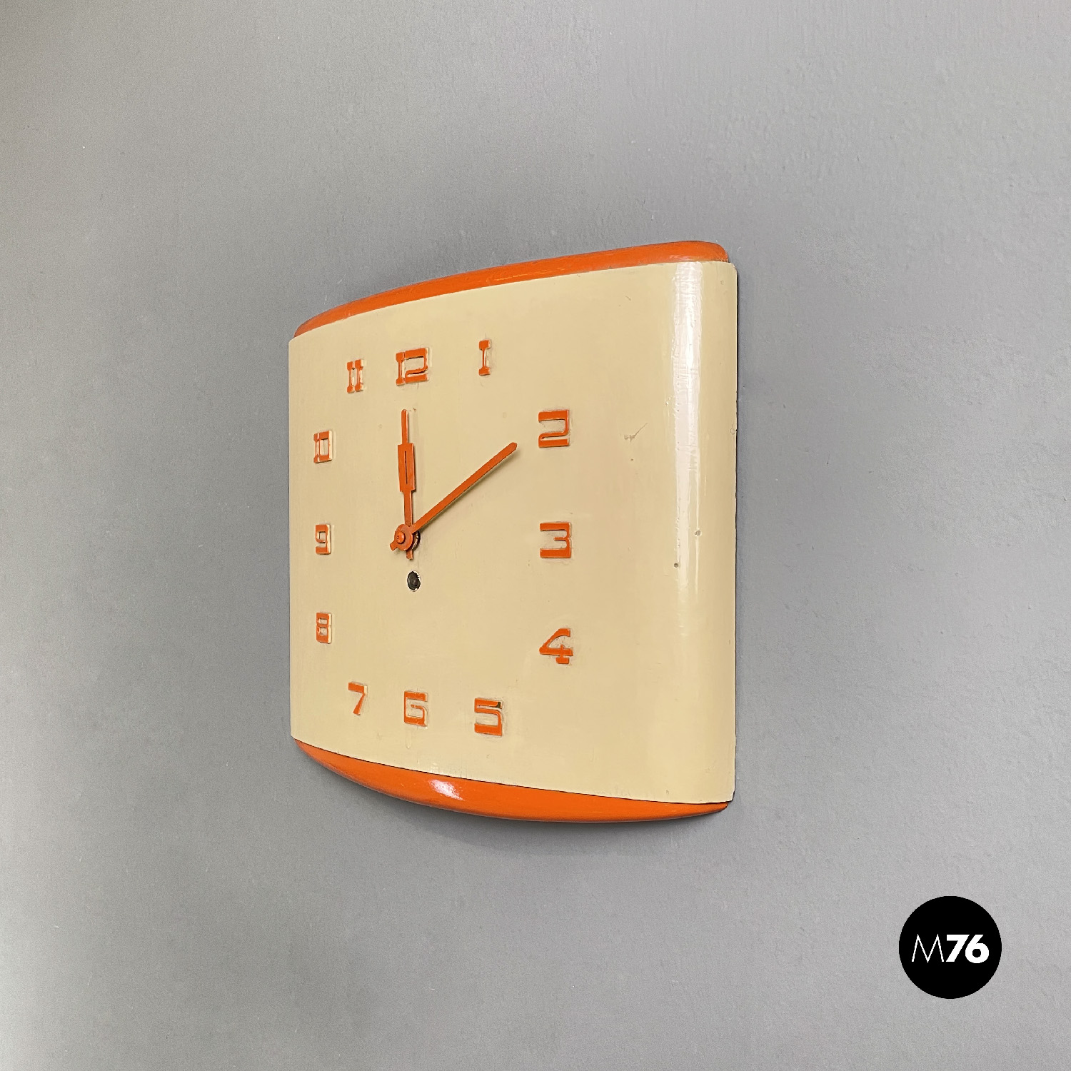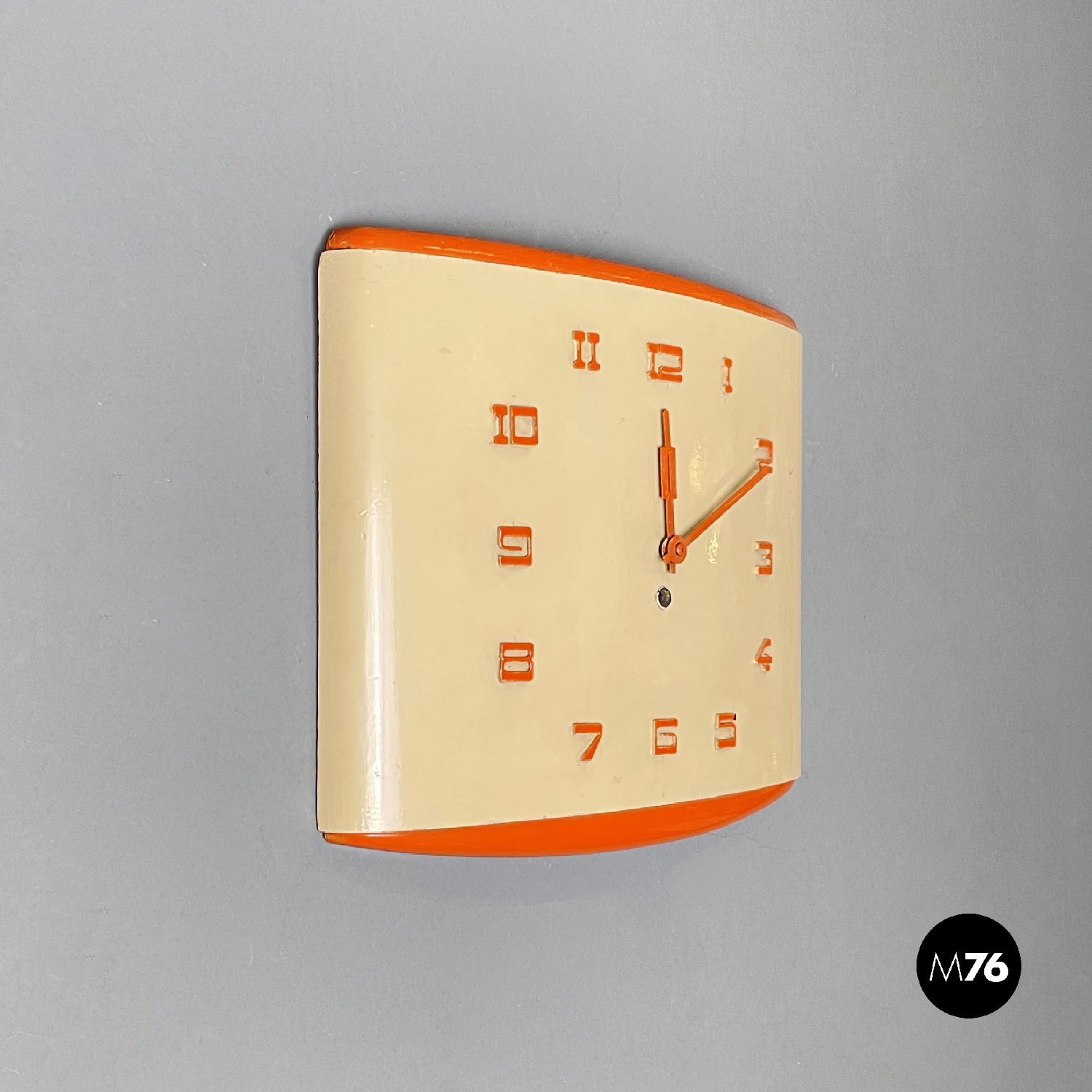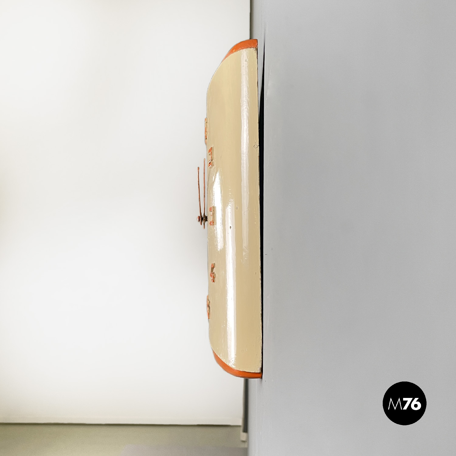 Orologio da parete di forma rettangolare in legno laccato color giallo crema e arancione. La struttura è leggermente bombata e tondeggiante verso l’esterno. Presenta i numeri con un leggero spessore e sono in metallo verniciati arancioni, così come le lancette.