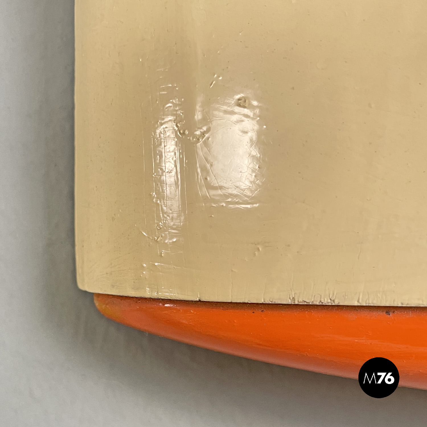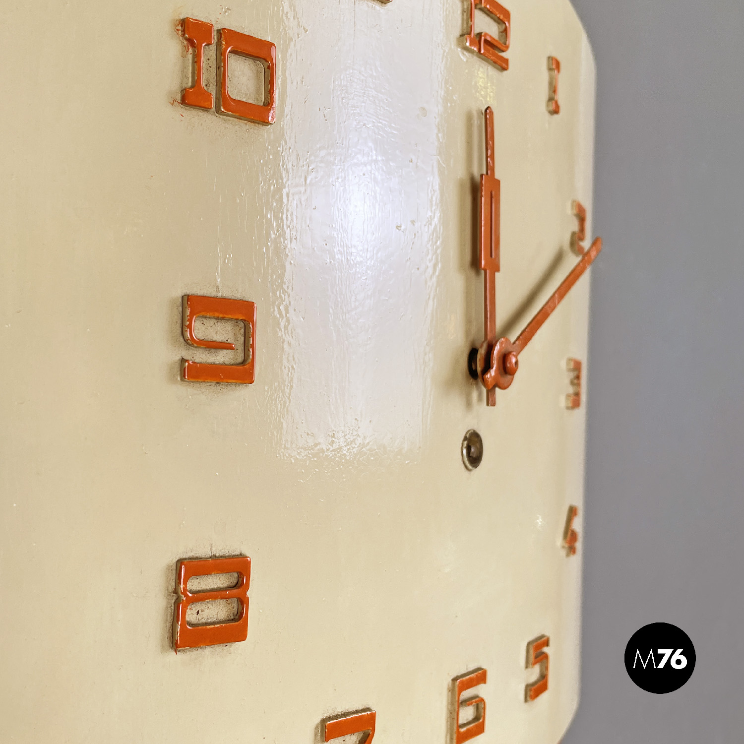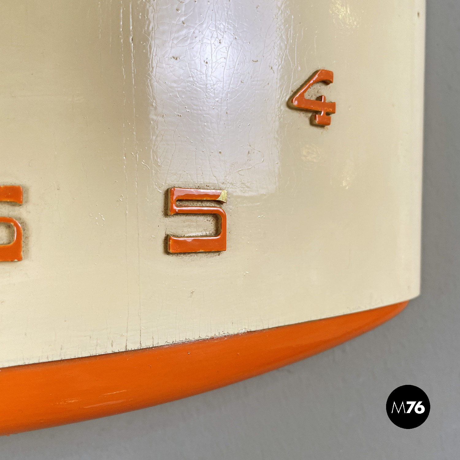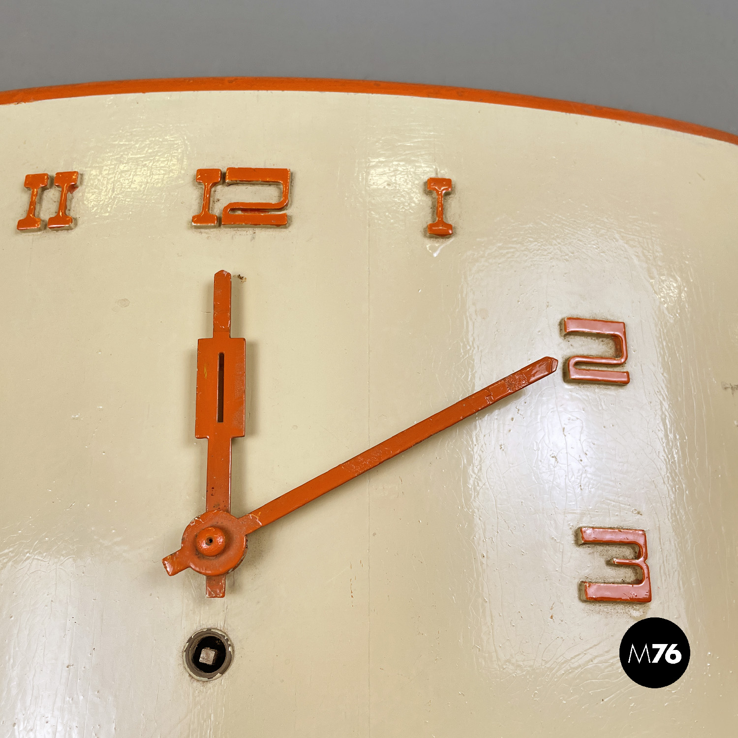 Orologio da parete di forma rettangolare in legno laccato color giallo crema e arancione. La struttura è leggermente bombata e tondeggiante verso l’esterno. Presenta i numeri con un leggero spessore e sono in metallo verniciati arancioni, così come le lancette.