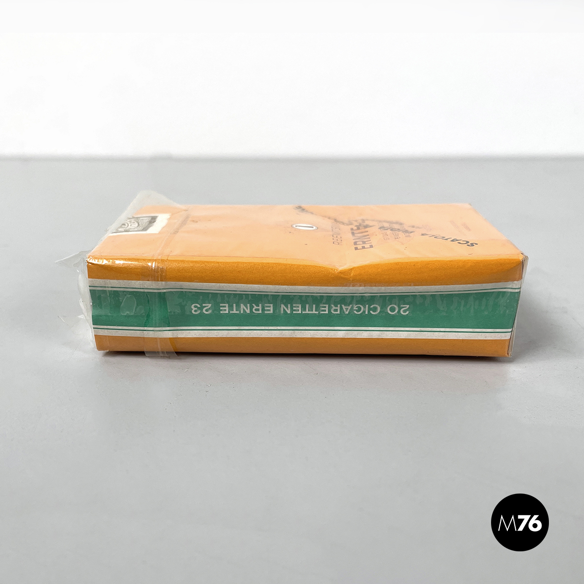 Pacchetto morbido di sigarette tedesche della marca Ernte 23 Reentsma utilizzato a scopo espositivo in vetrina. Il pacchetto in carta e plastica nella colorazione arancio e verde.