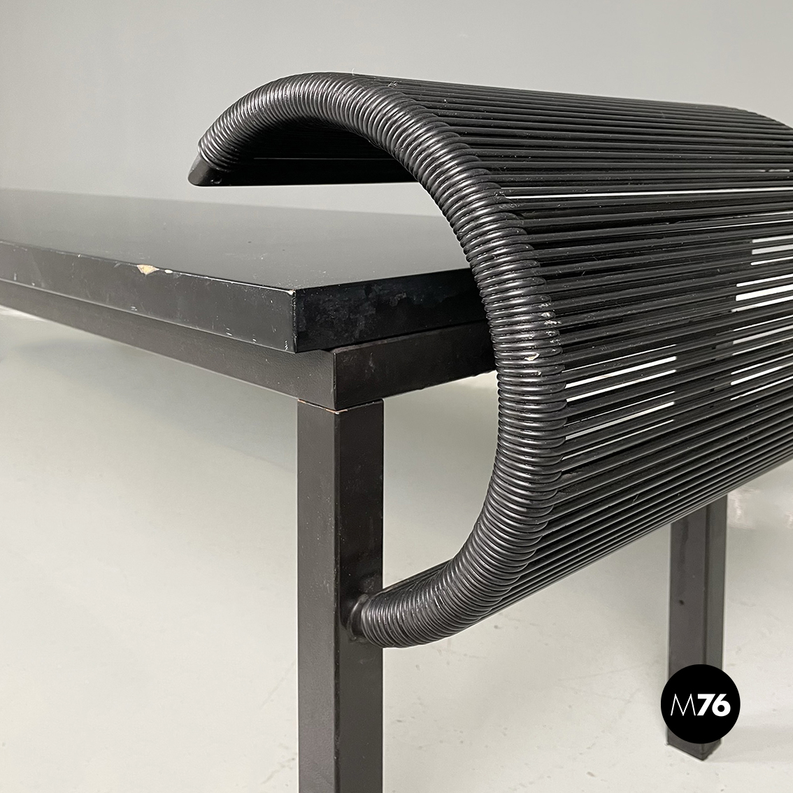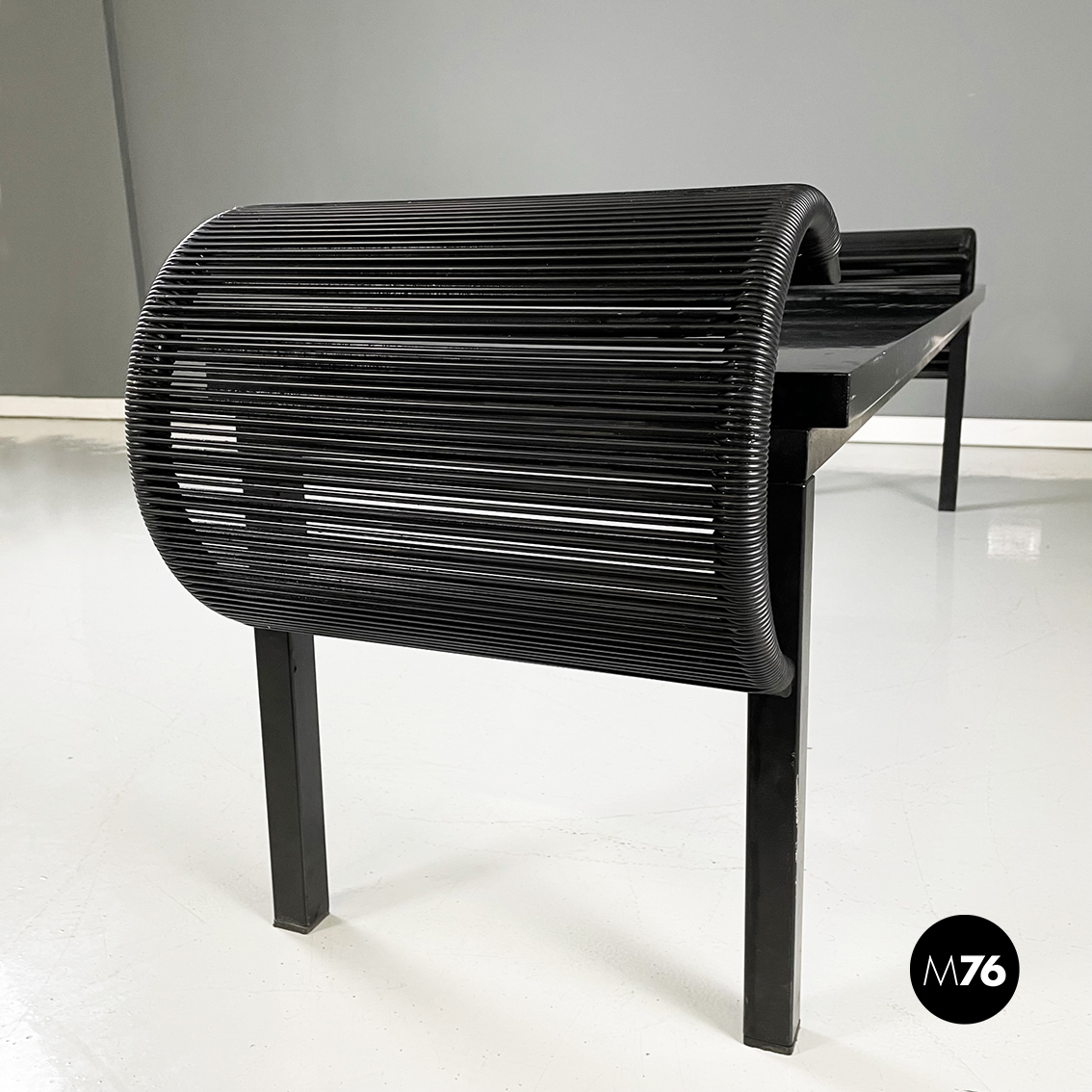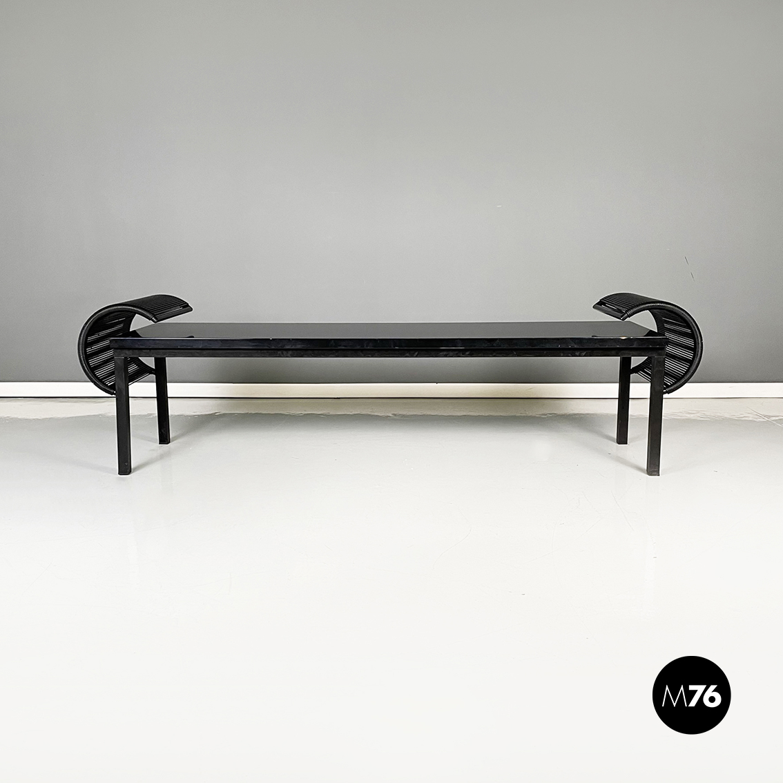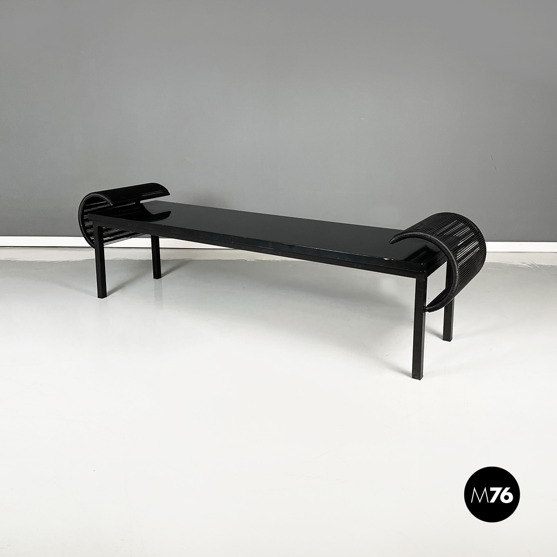 Panca con seduta rettangolare in legno laccato nero. Sugli esterni presenta due strutture a forma di C, con struttura in metallo verniciato nero e fili di plastica nera intrecciati. Zampe a sezione quadrata in legno laccato nero. Utilizzabile anche come tavolo da caffè.