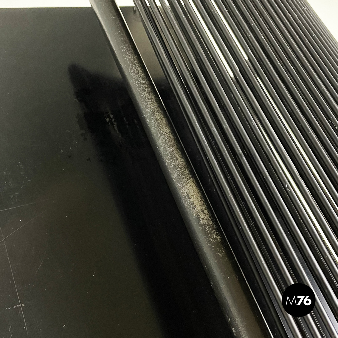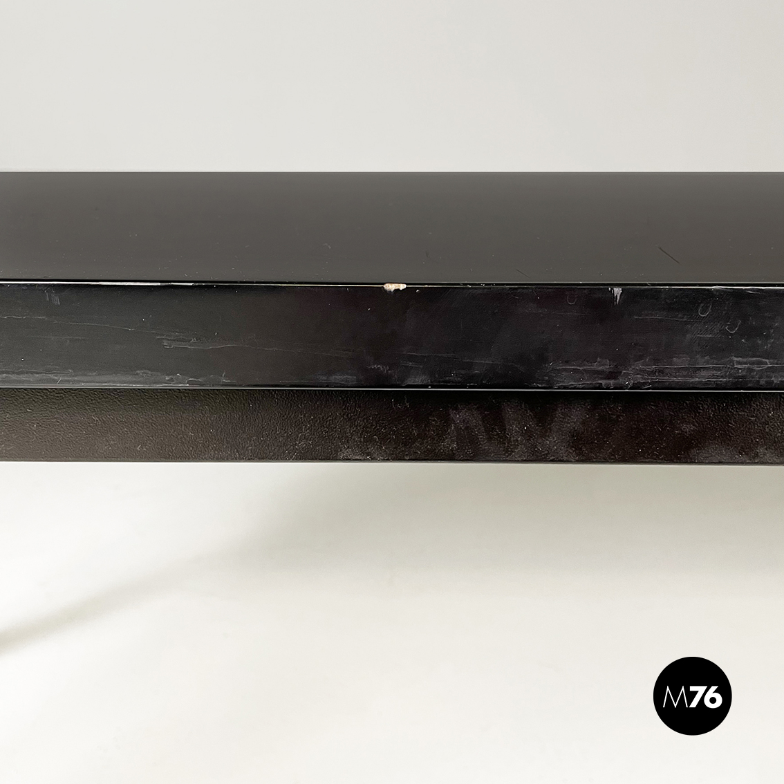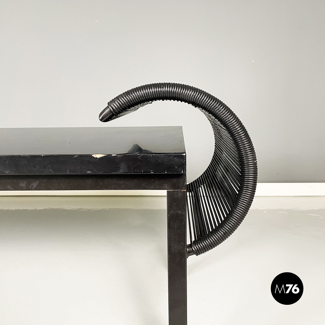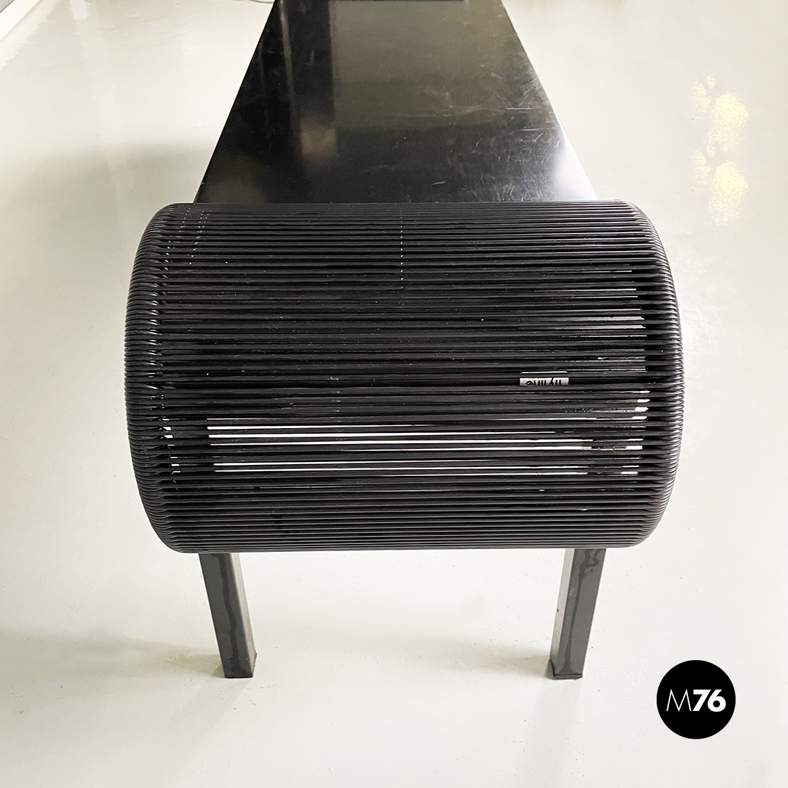 Panca con seduta rettangolare in legno laccato nero. Sugli esterni presenta due strutture a forma di C, con struttura in metallo verniciato nero e fili di plastica nera intrecciati. Zampe a sezione quadrata in legno laccato nero. Utilizzabile anche come tavolo da caffè.