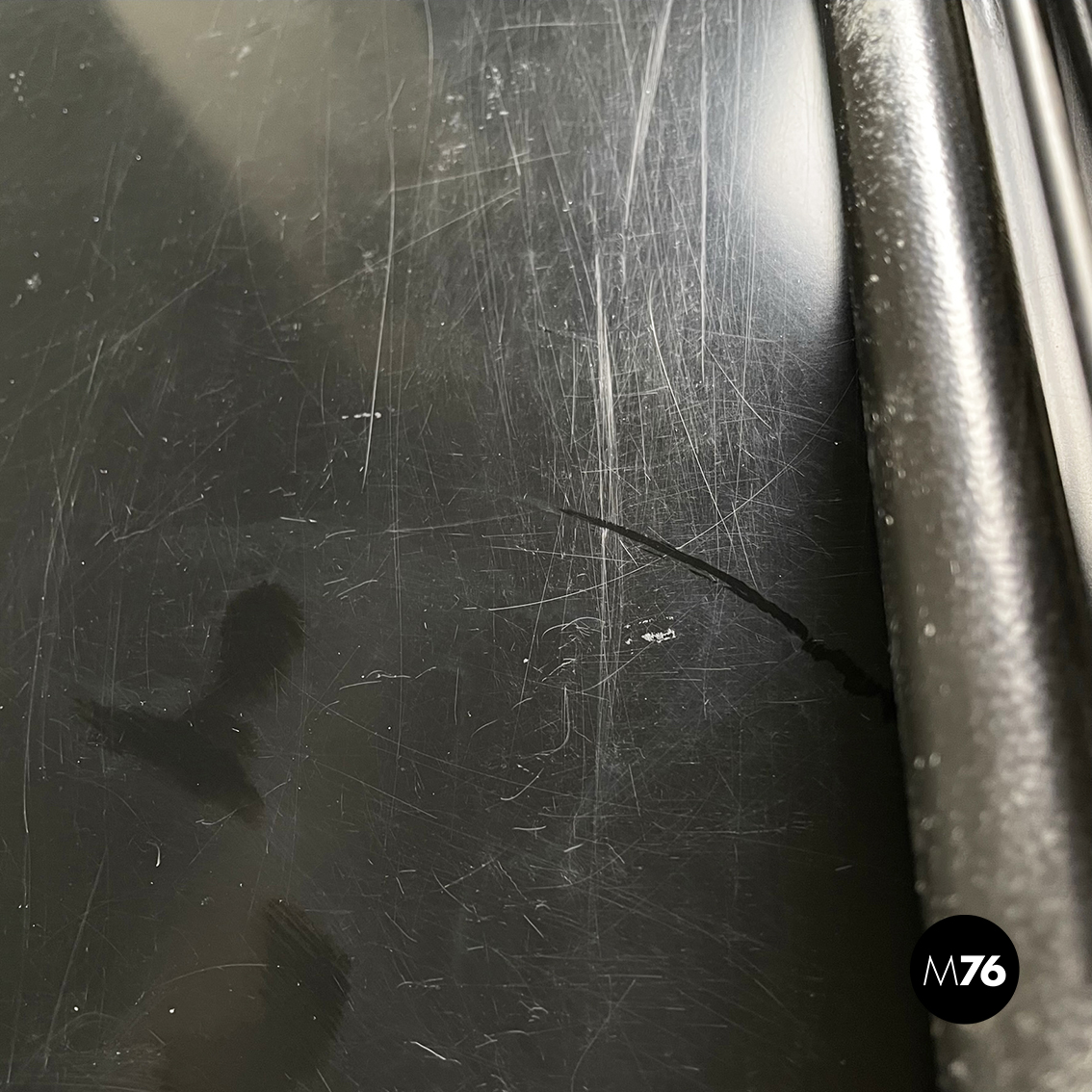 Buone condizioni, presenta mancanze di vernice sul metallo e sul legno. La seduta presenta dei graffi.