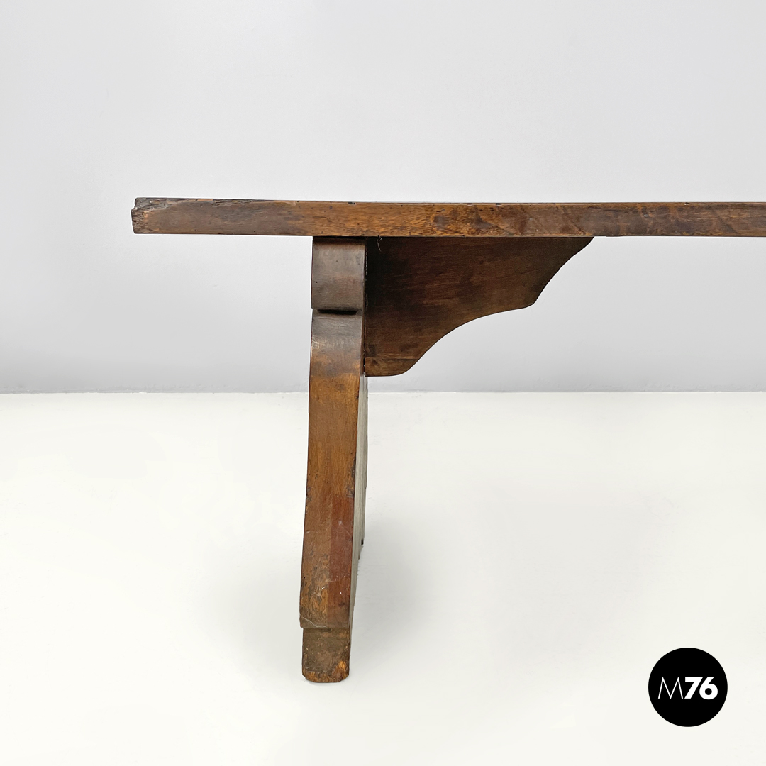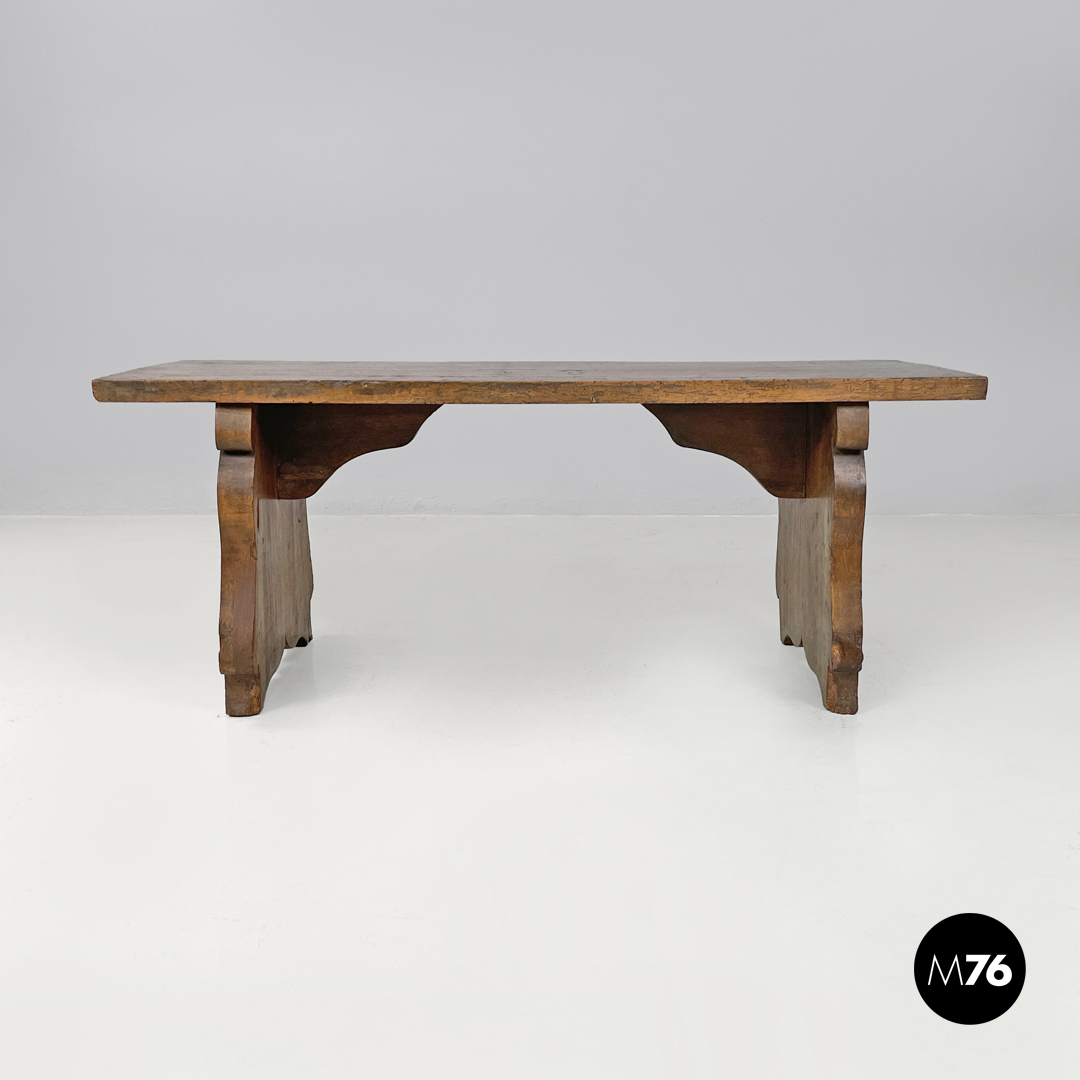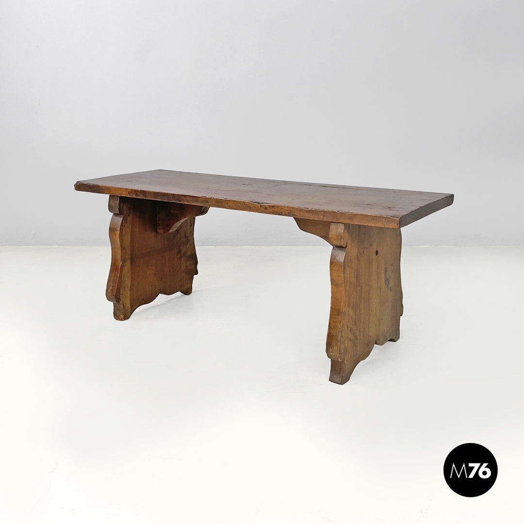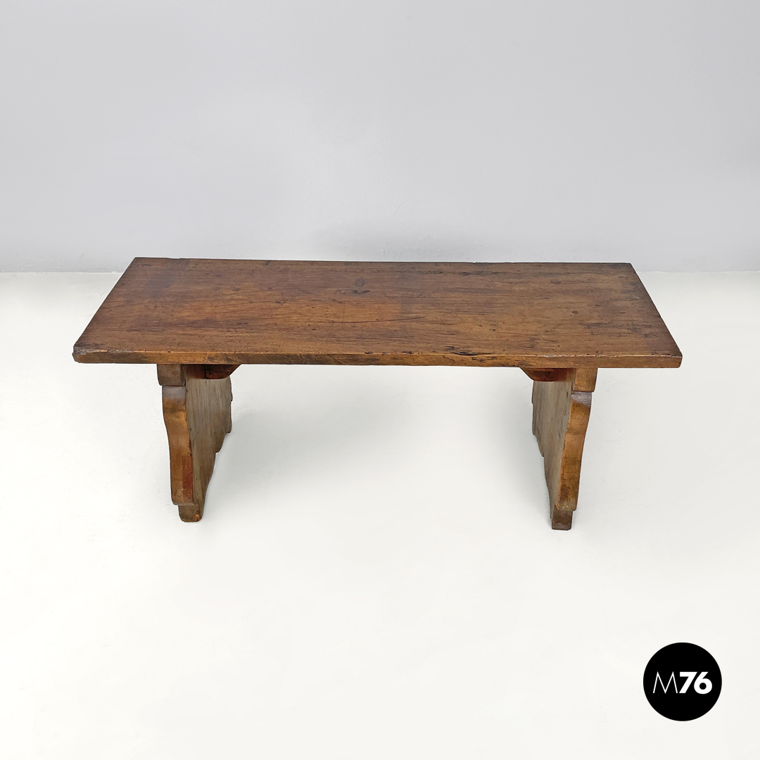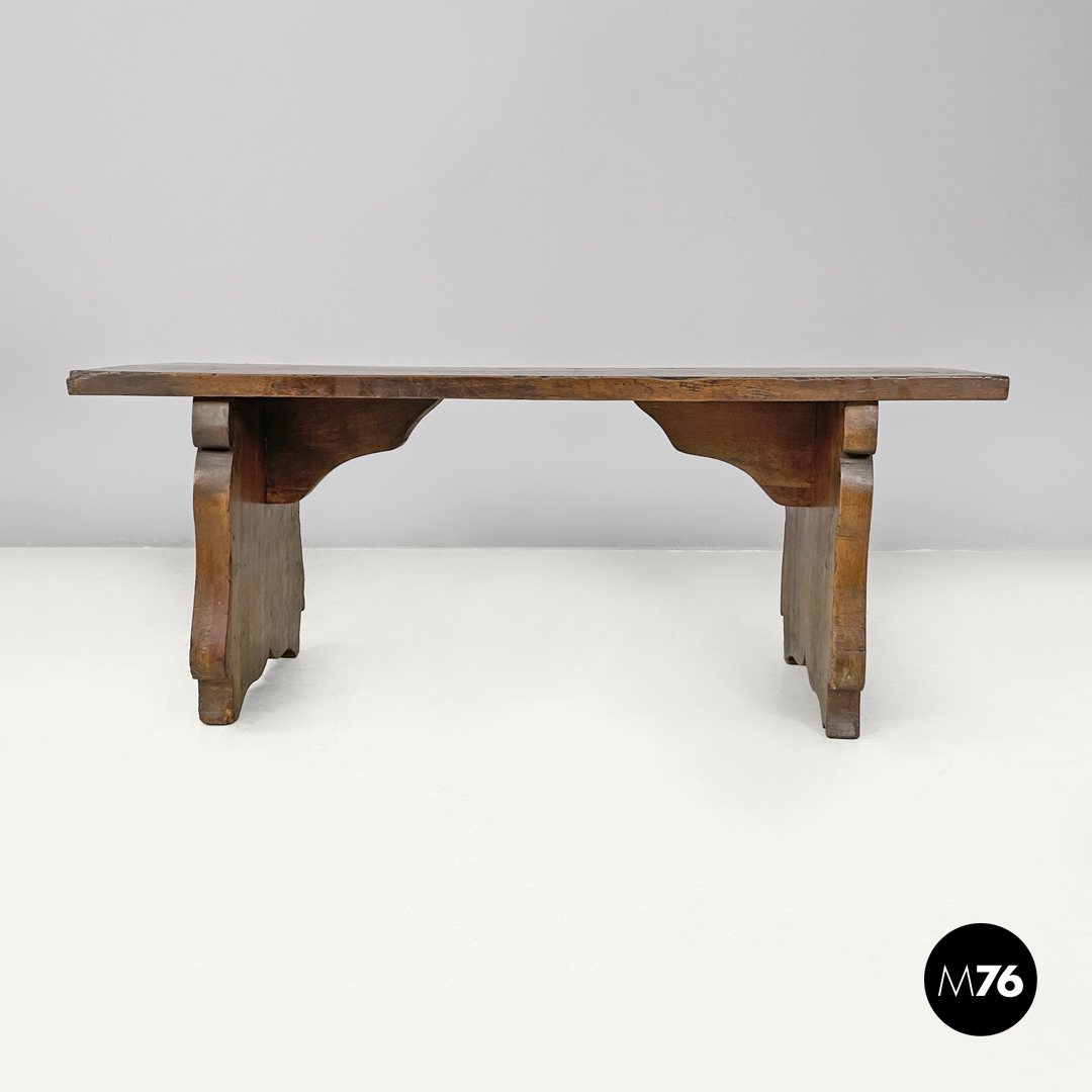 Panca in legno con piano rettangolare. Le due gambe hai lati hanno la stessa profondità della seduta, ed hanno i profili decorati con linee curve.