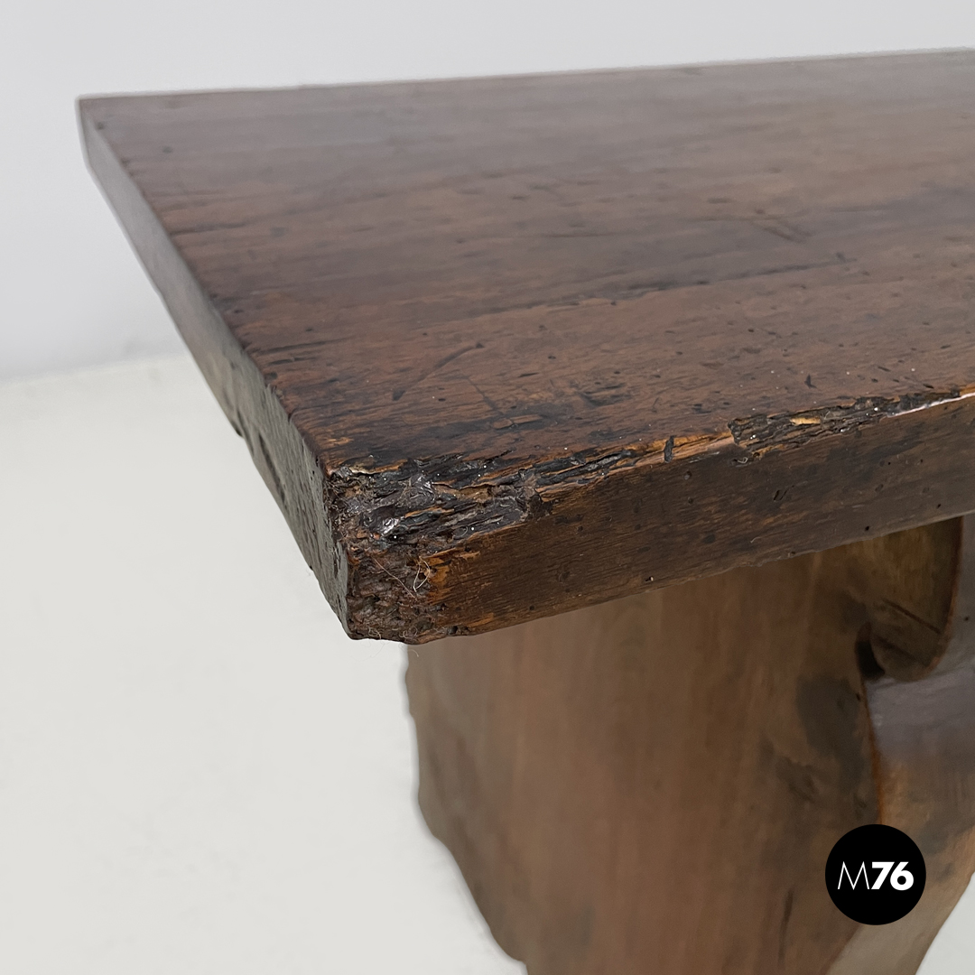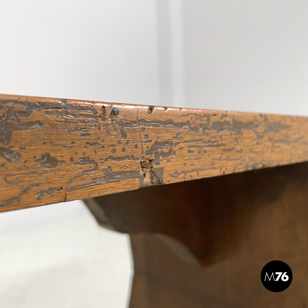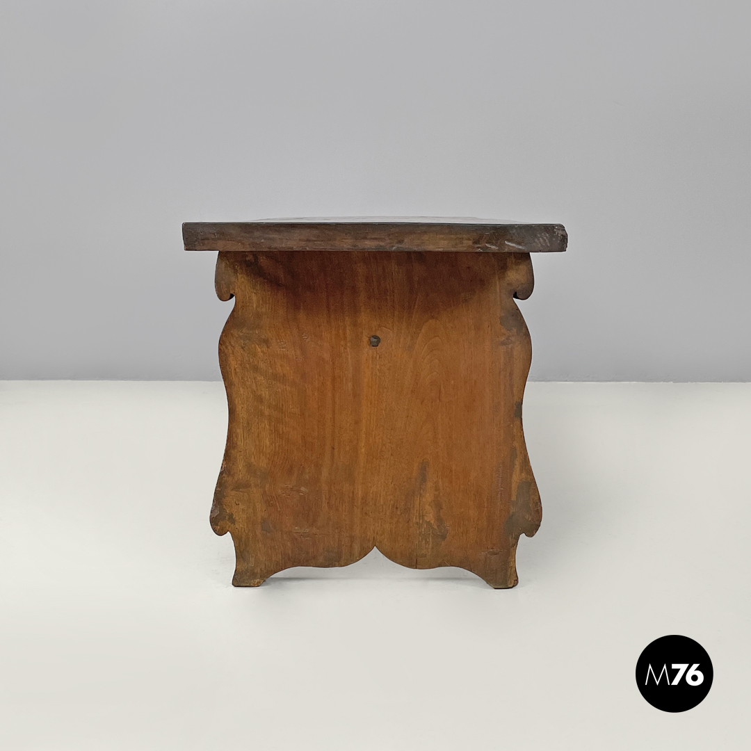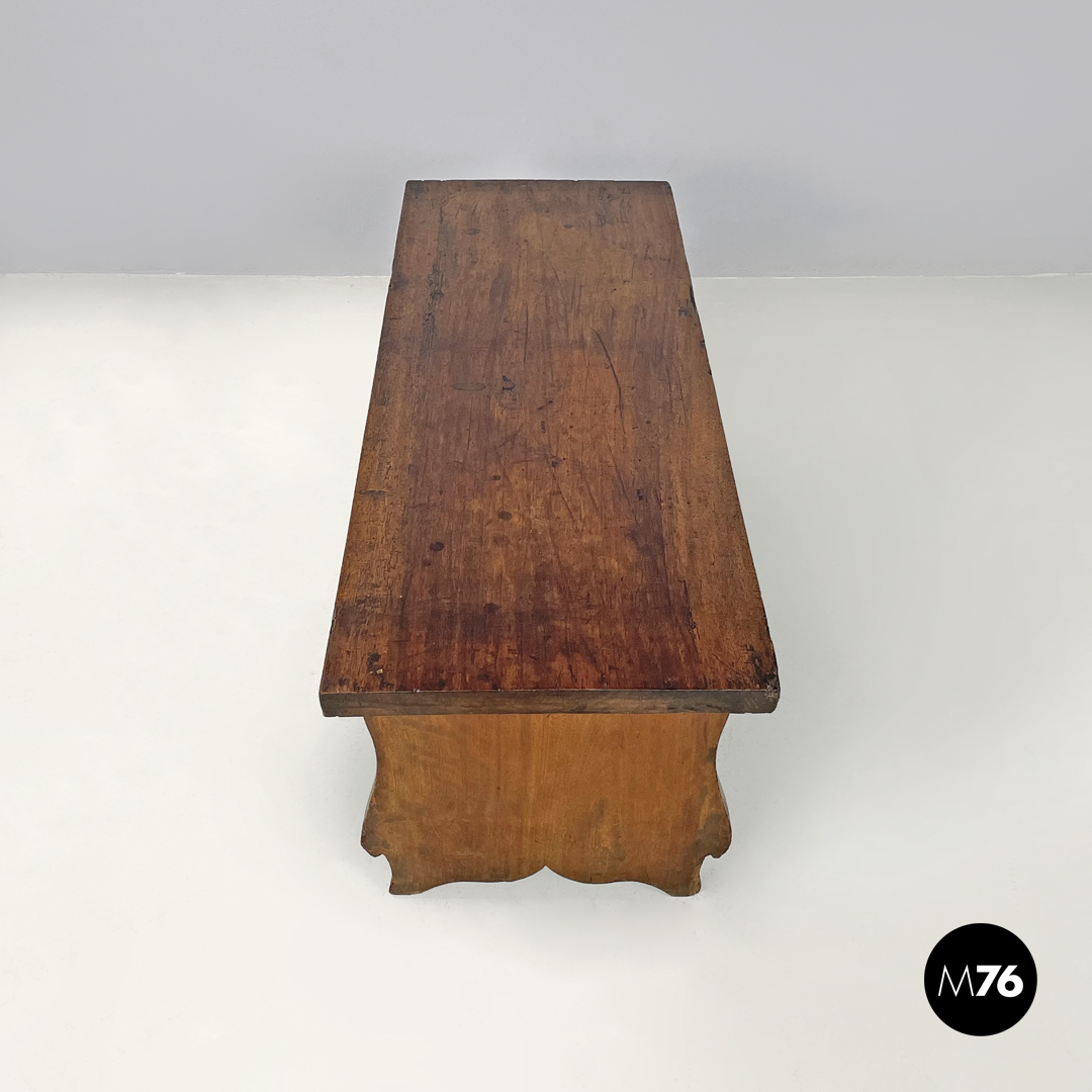 Panca in legno con piano rettangolare. Le due gambe hai lati hanno la stessa profondità della seduta, ed hanno i profili decorati con linee curve.