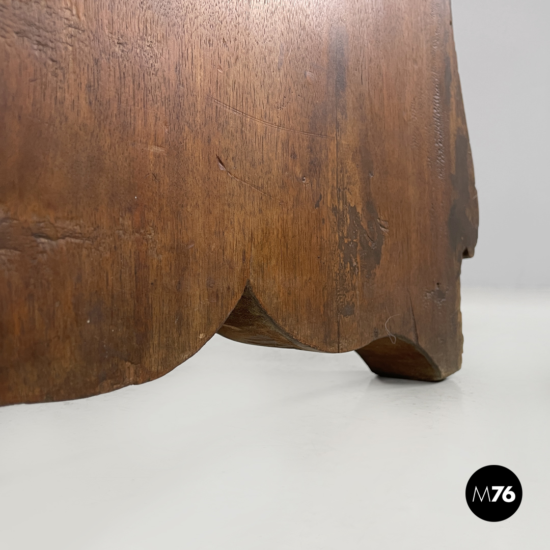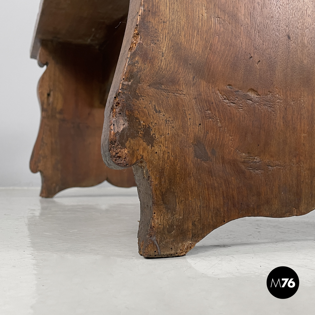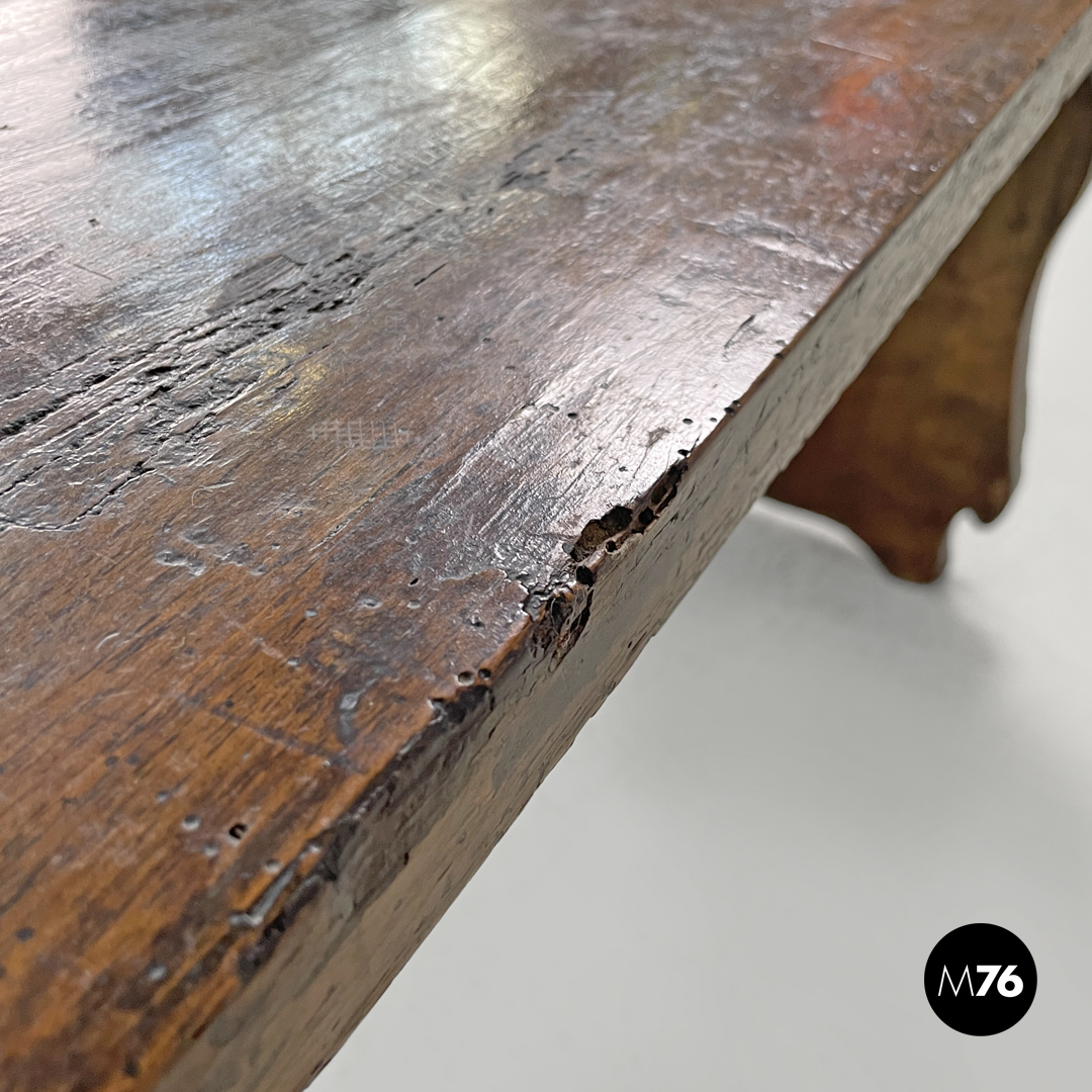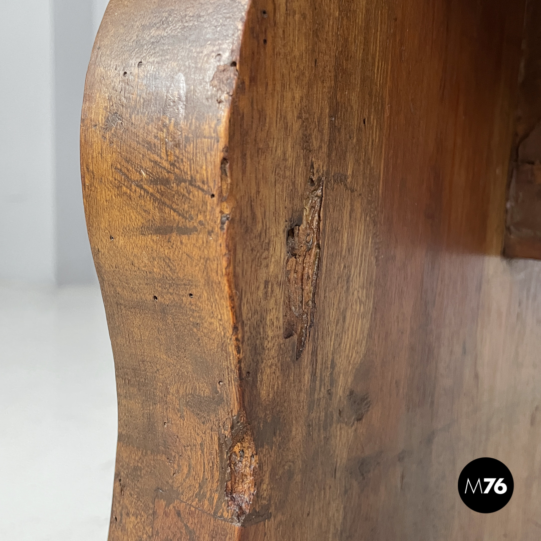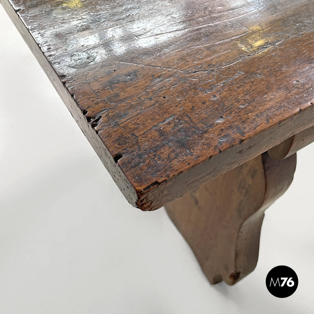Panca in legno con piano rettangolare. Le due gambe hai lati hanno la stessa profondità della seduta, ed hanno i profili decorati con linee curve.