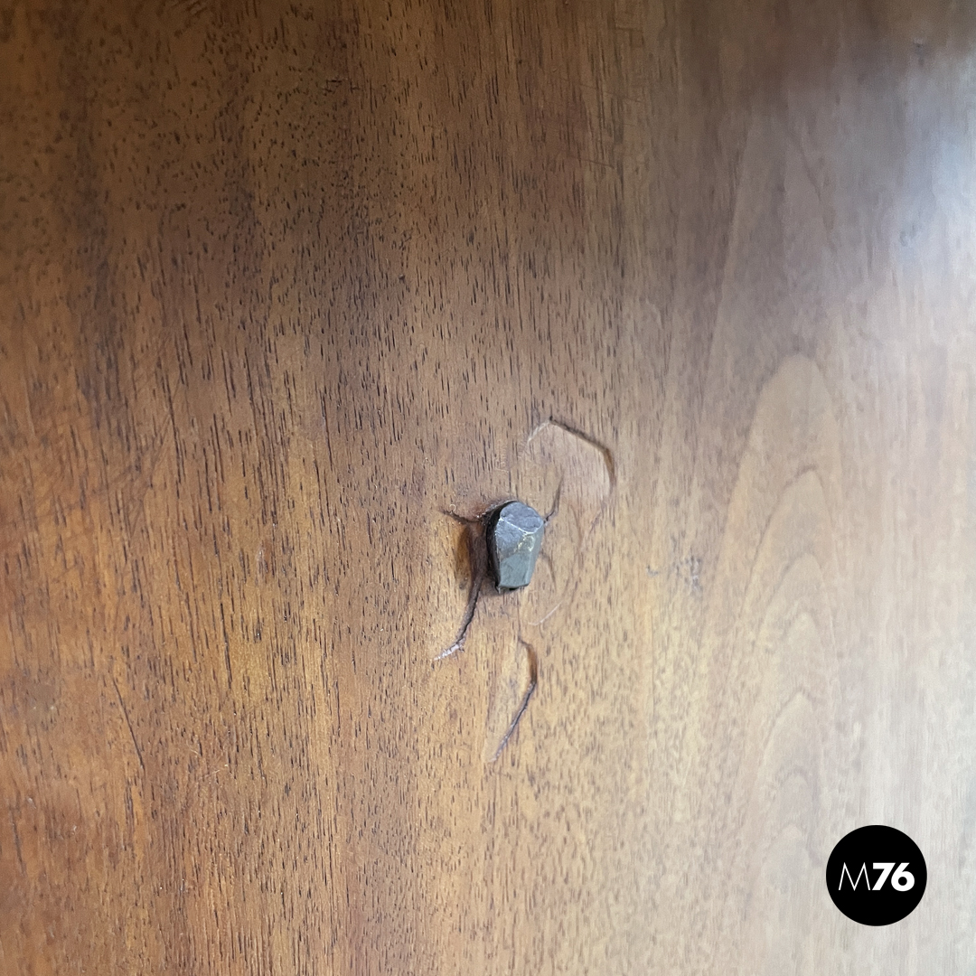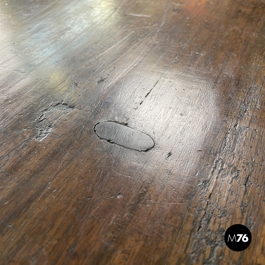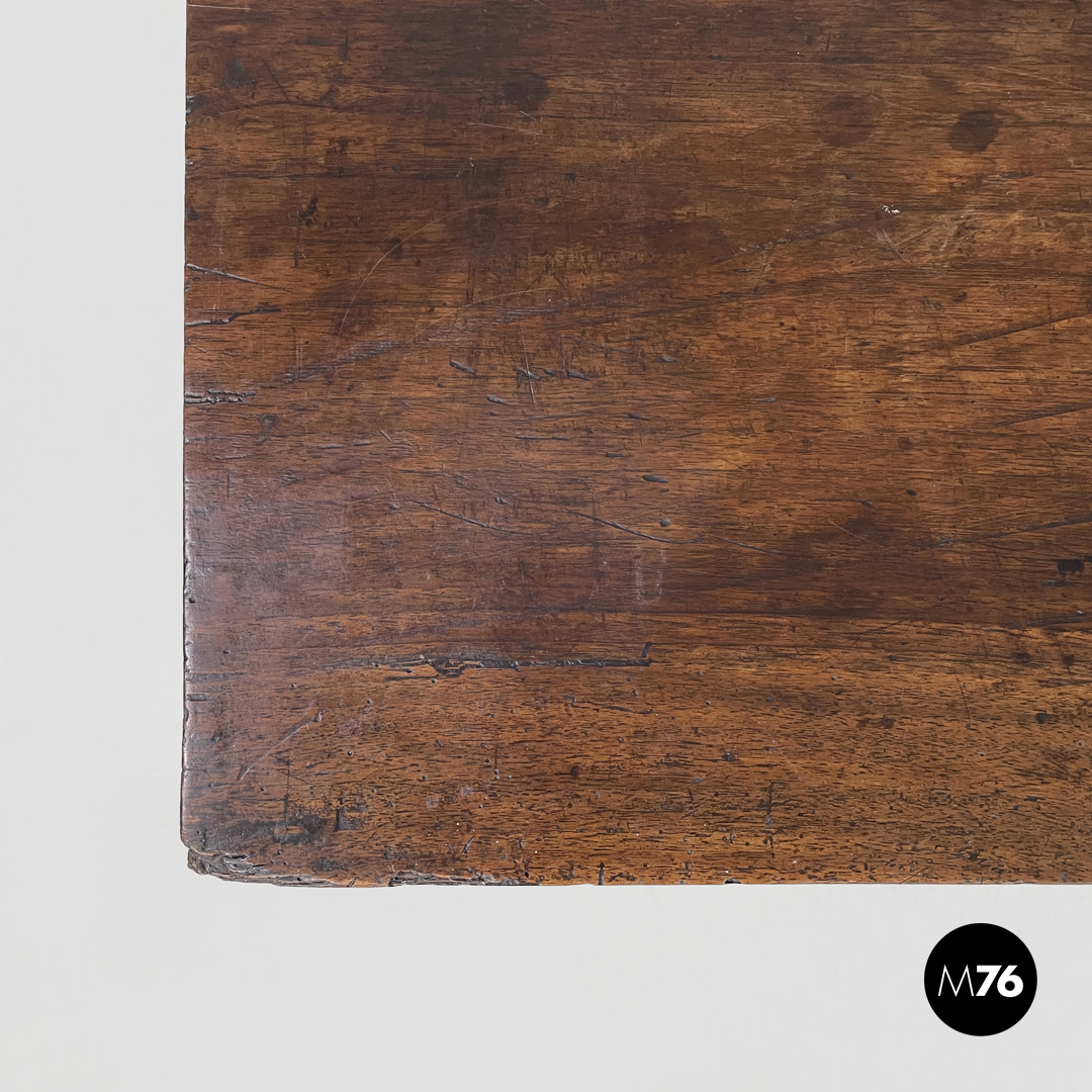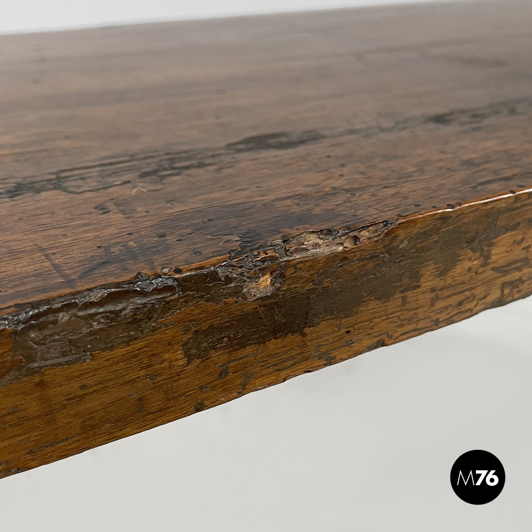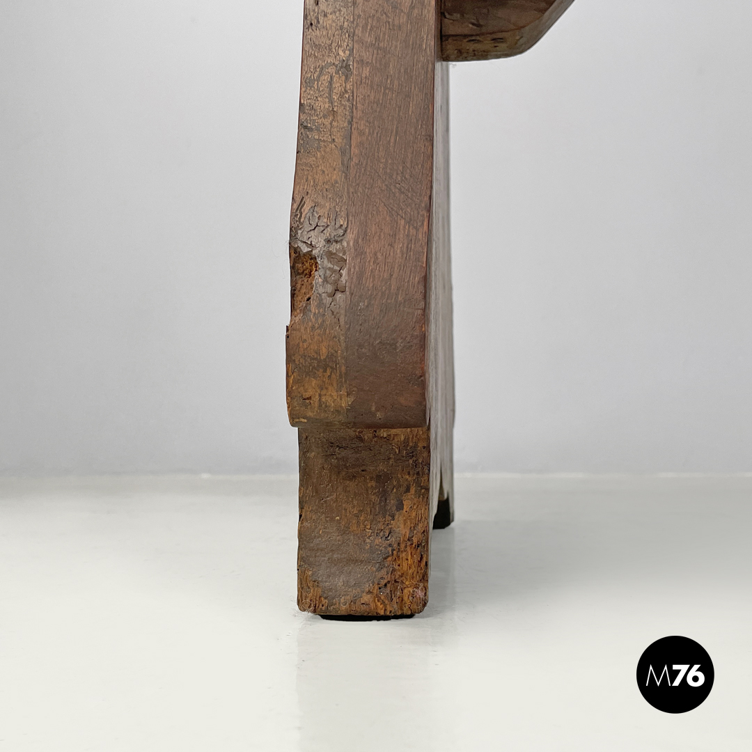 Panca in legno con piano rettangolare. Le due gambe hai lati hanno la stessa profondità della seduta, ed hanno i profili decorati con linee curve.