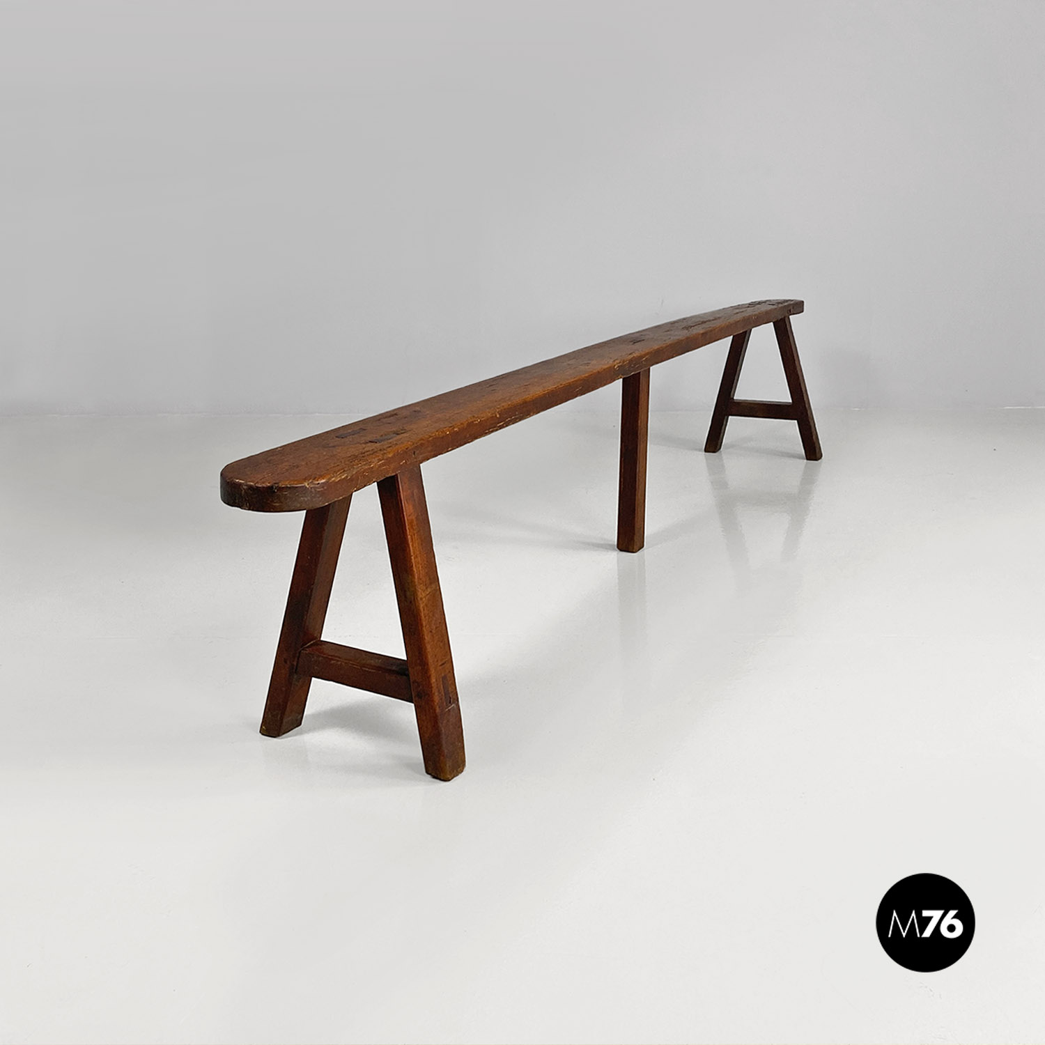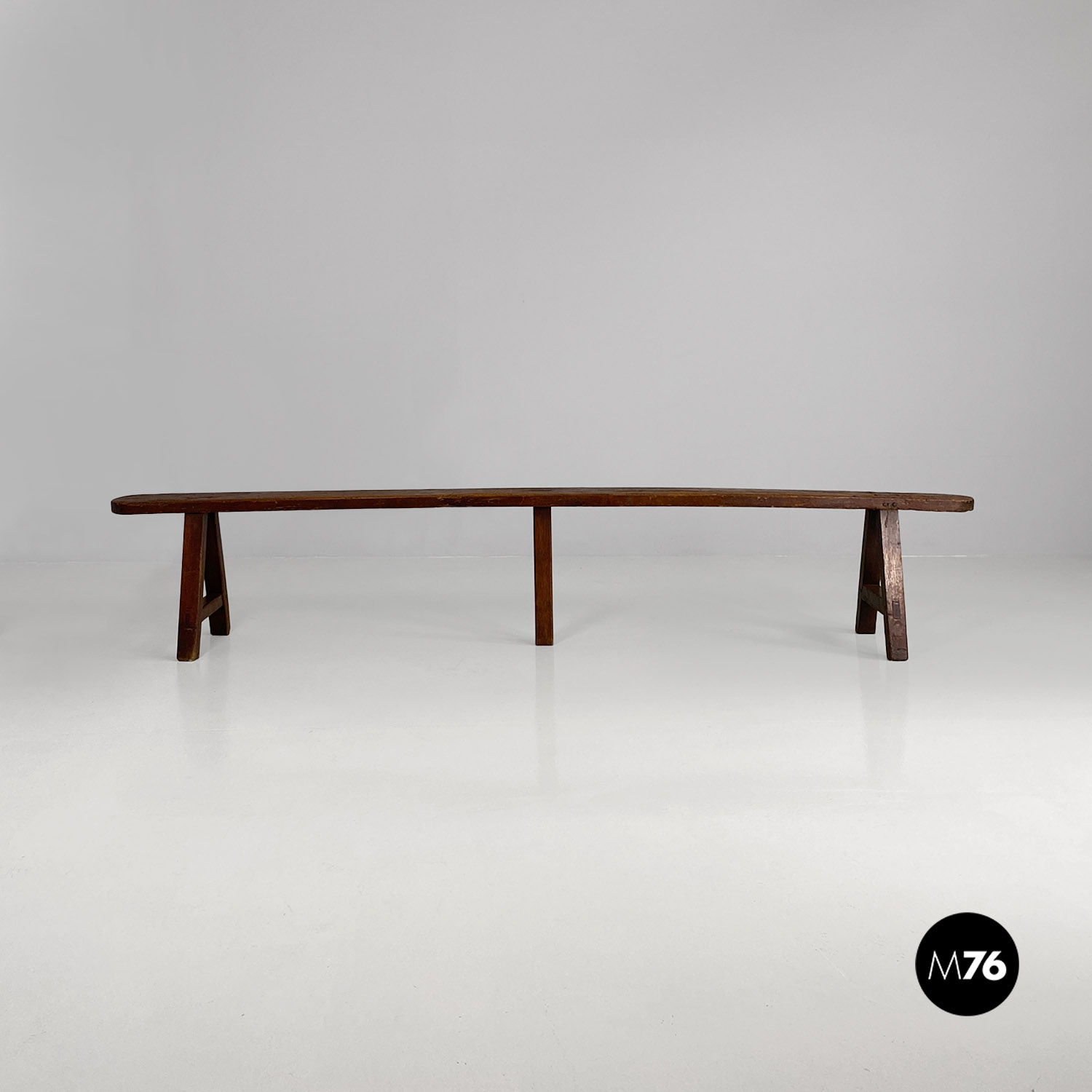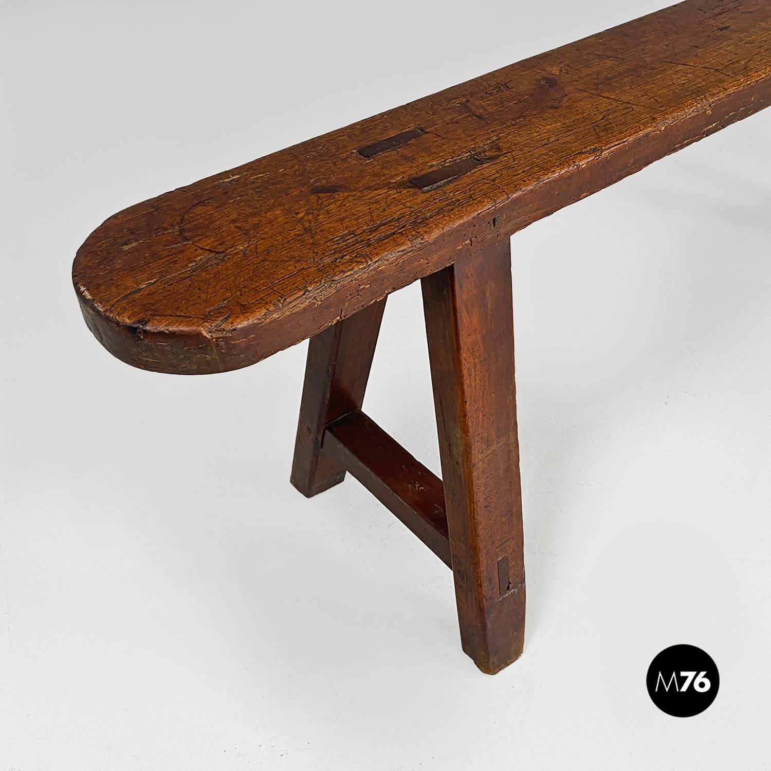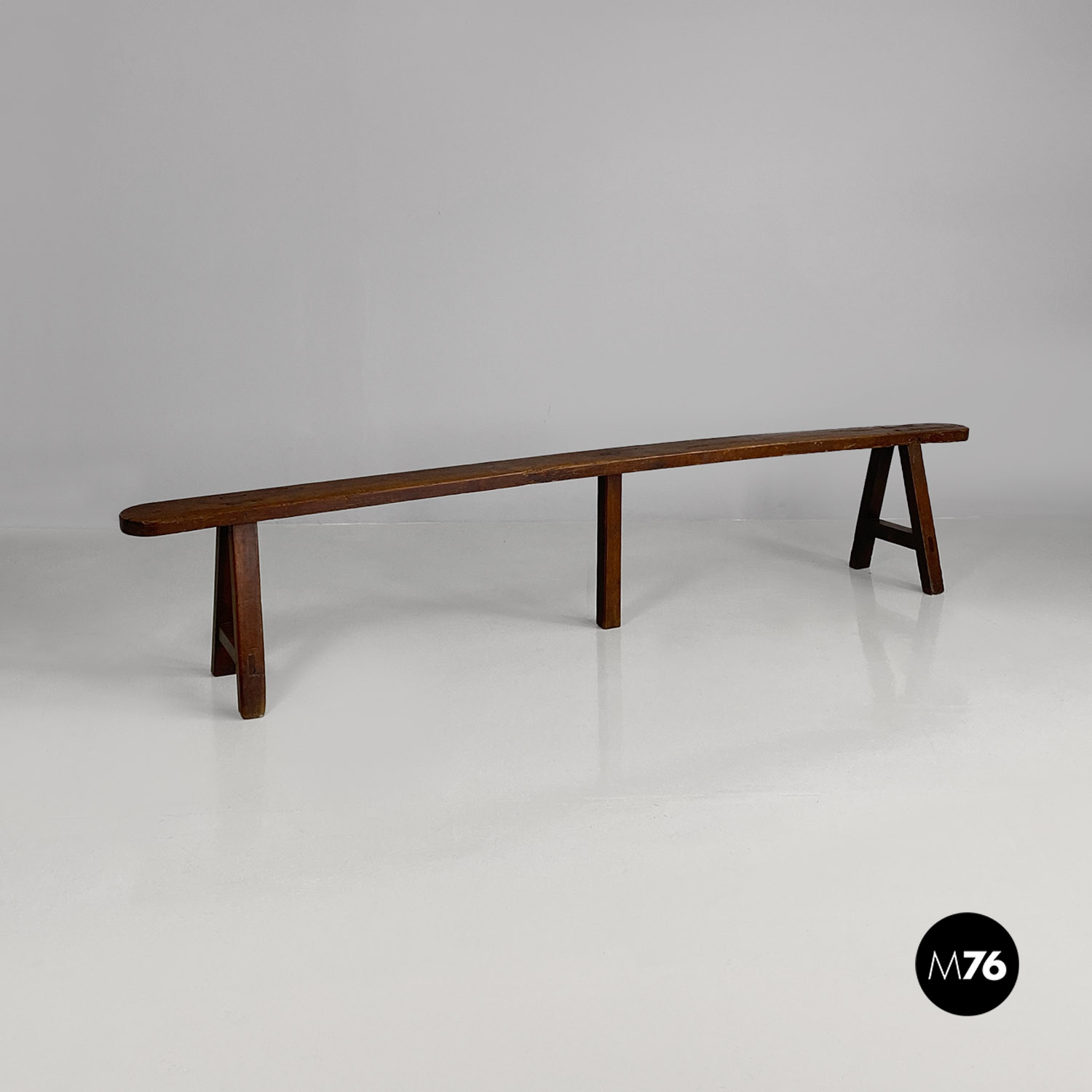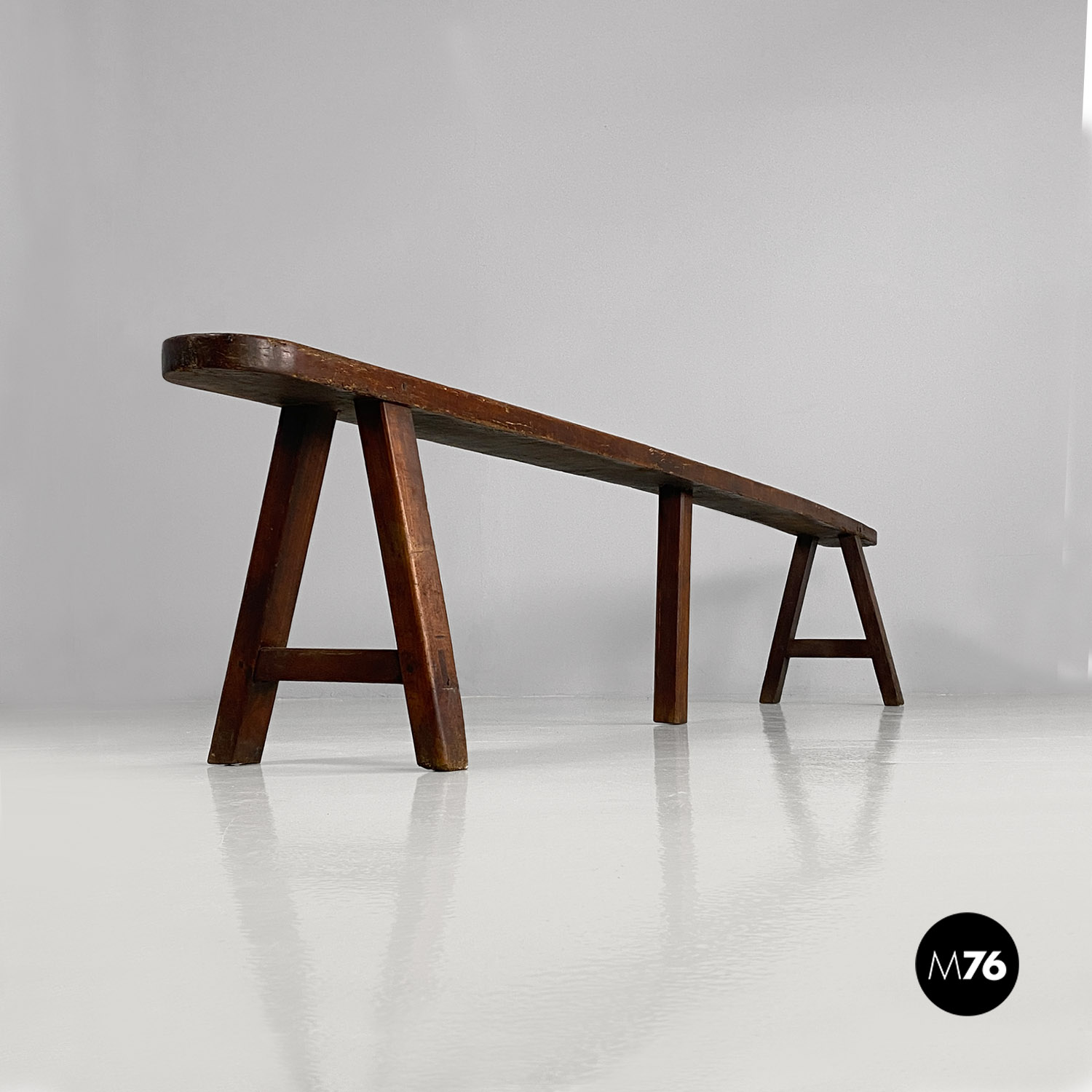 Panca con seduta stretta e lunga con angoli arrotondati, interamente in legno massello. Le zampe della panca a sezione quadrata, sono posizionate in diagonale congiunte da un listello, mentre la centrale è rettangolare e verticale.
