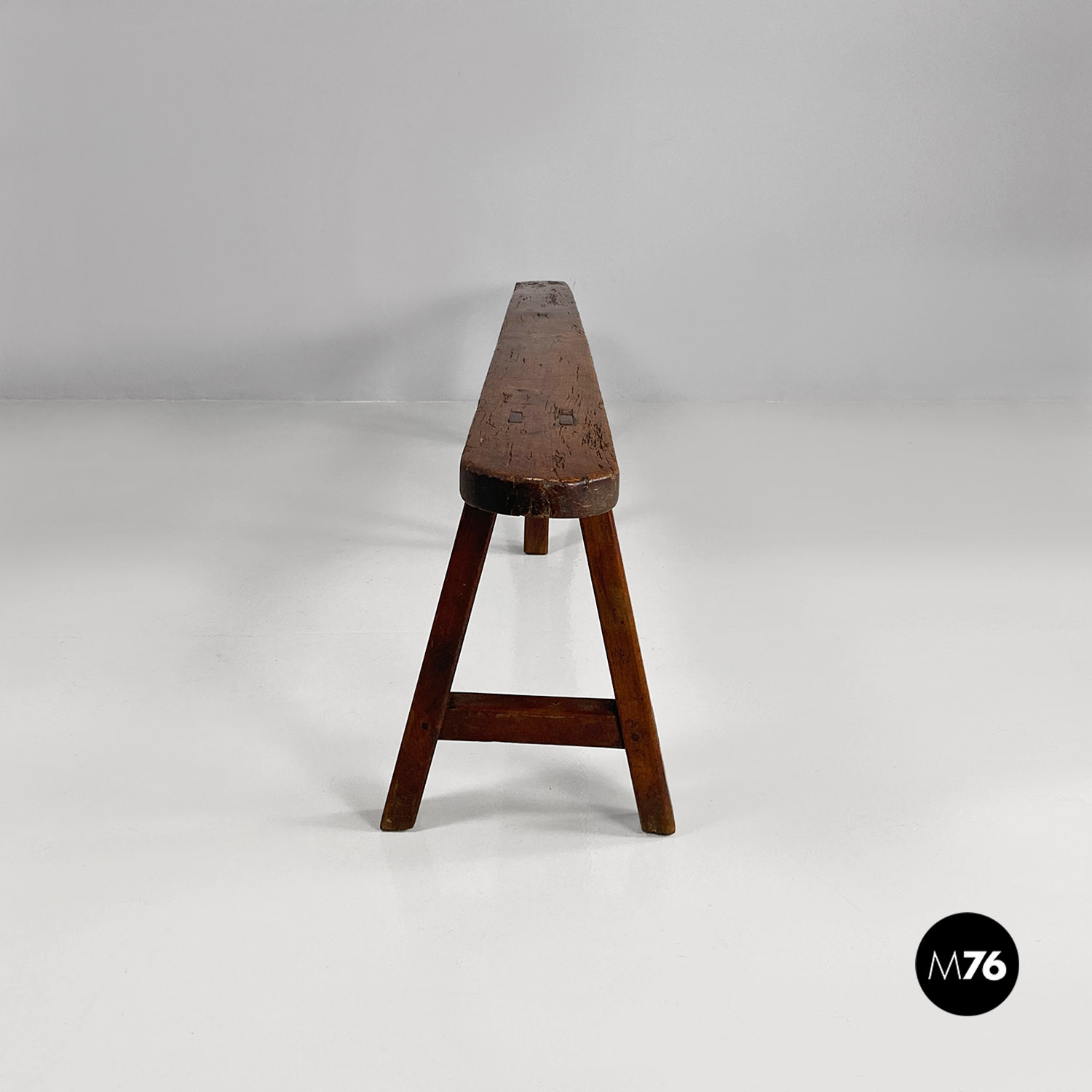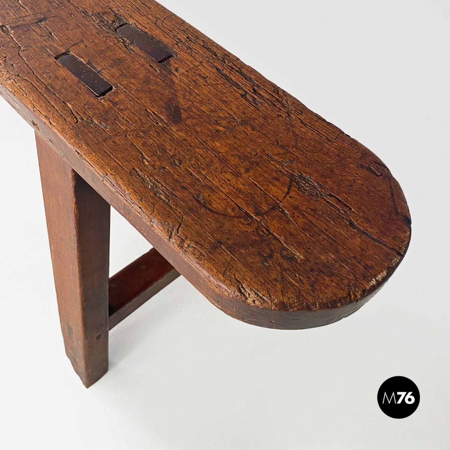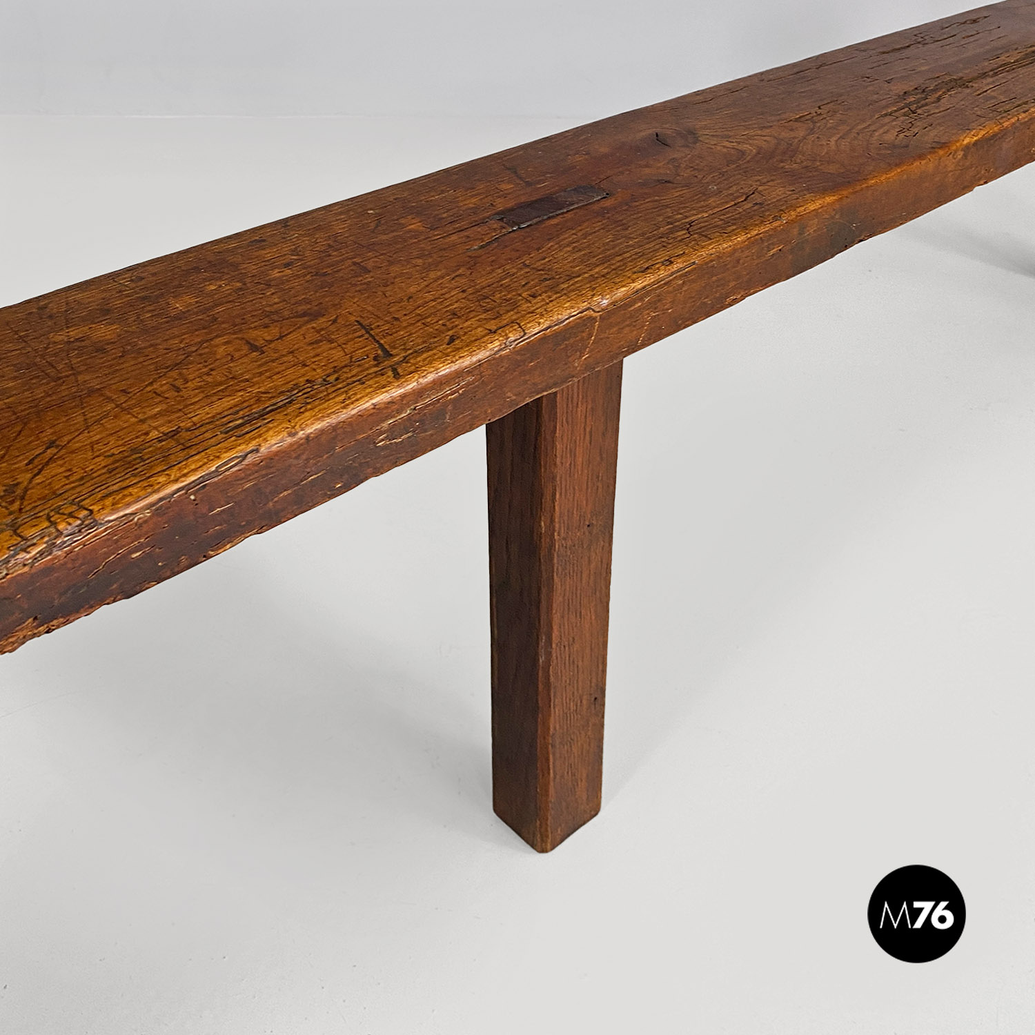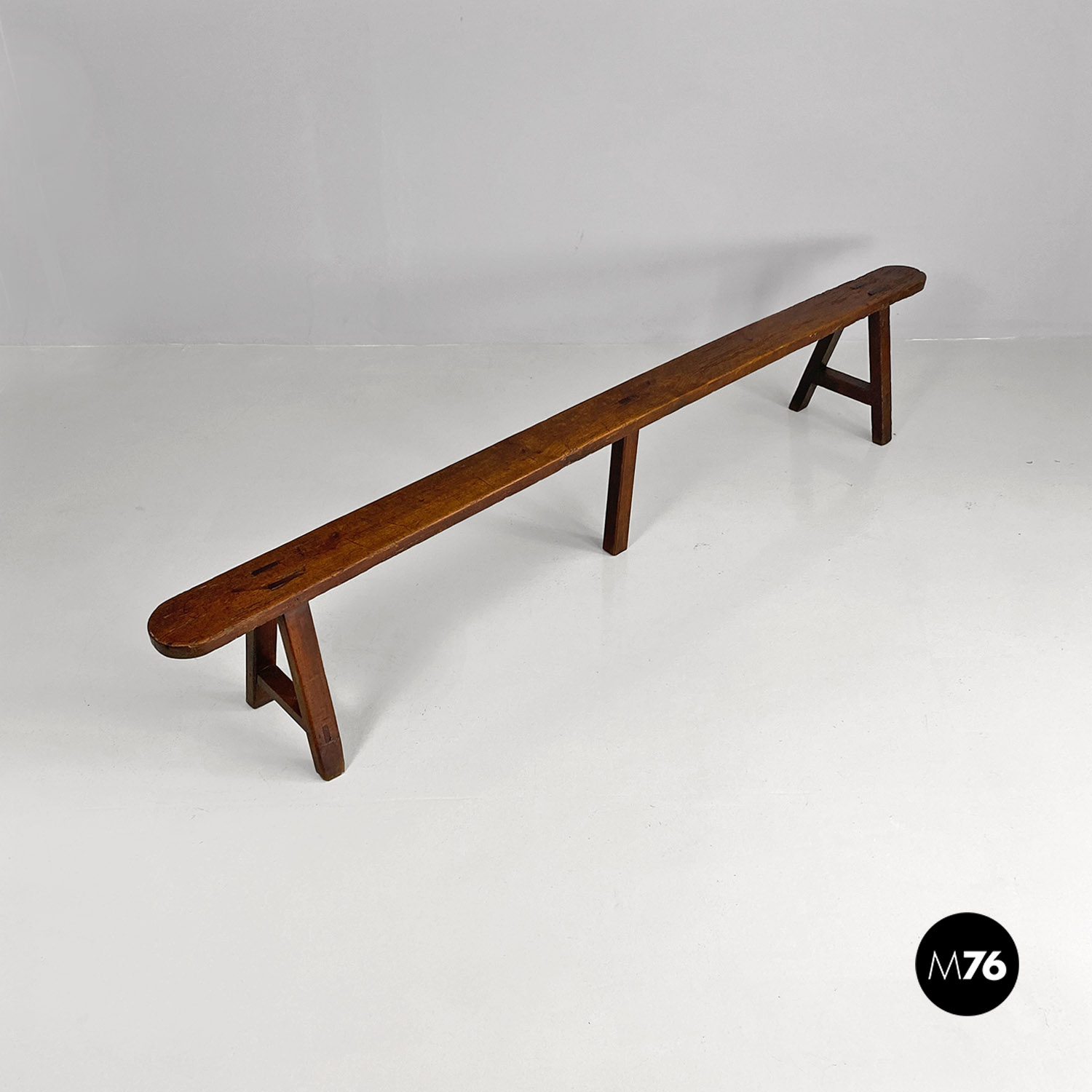 Panca con seduta stretta e lunga con angoli arrotondati, interamente in legno massello. Le zampe della panca a sezione quadrata, sono posizionate in diagonale congiunte da un listello, mentre la centrale è rettangolare e verticale.