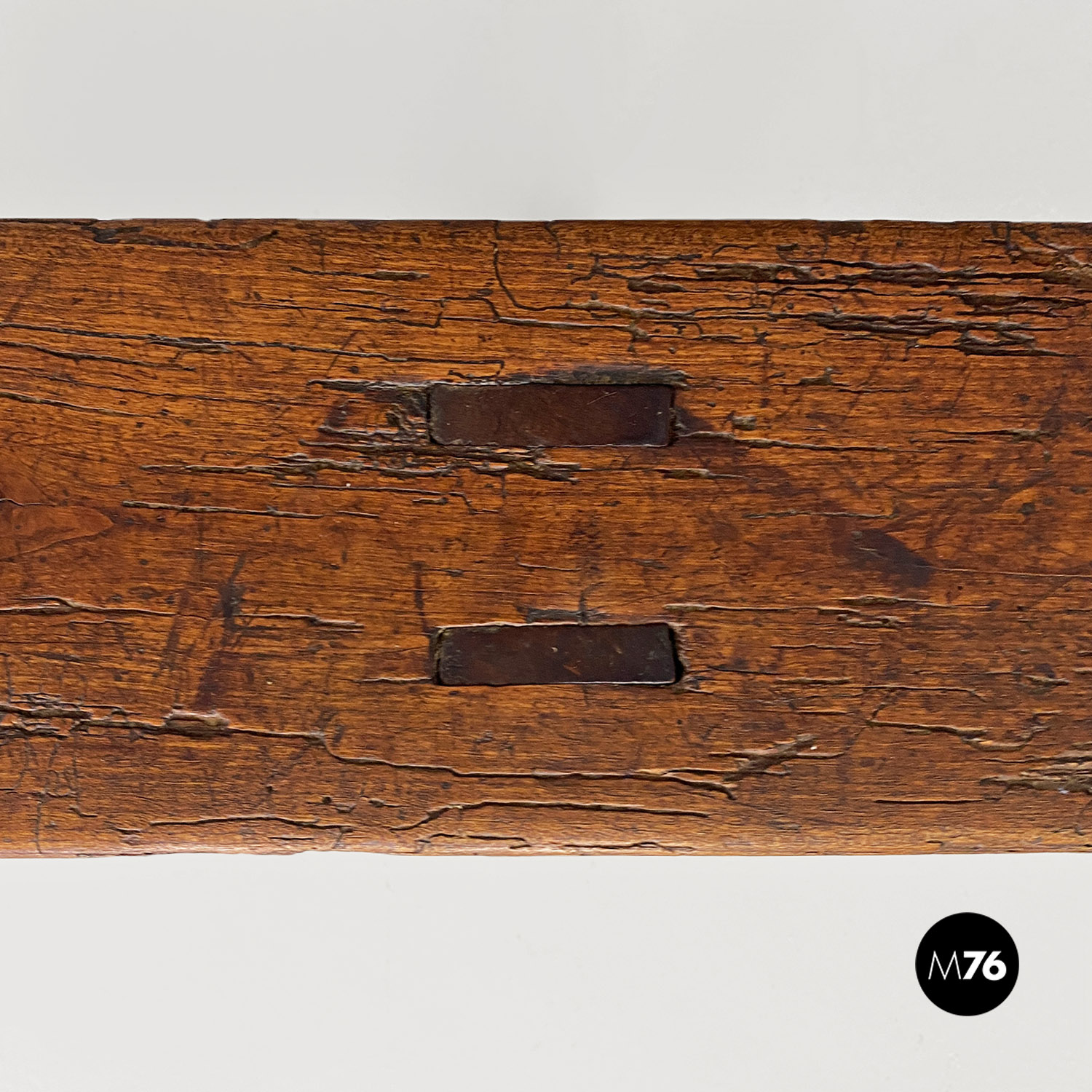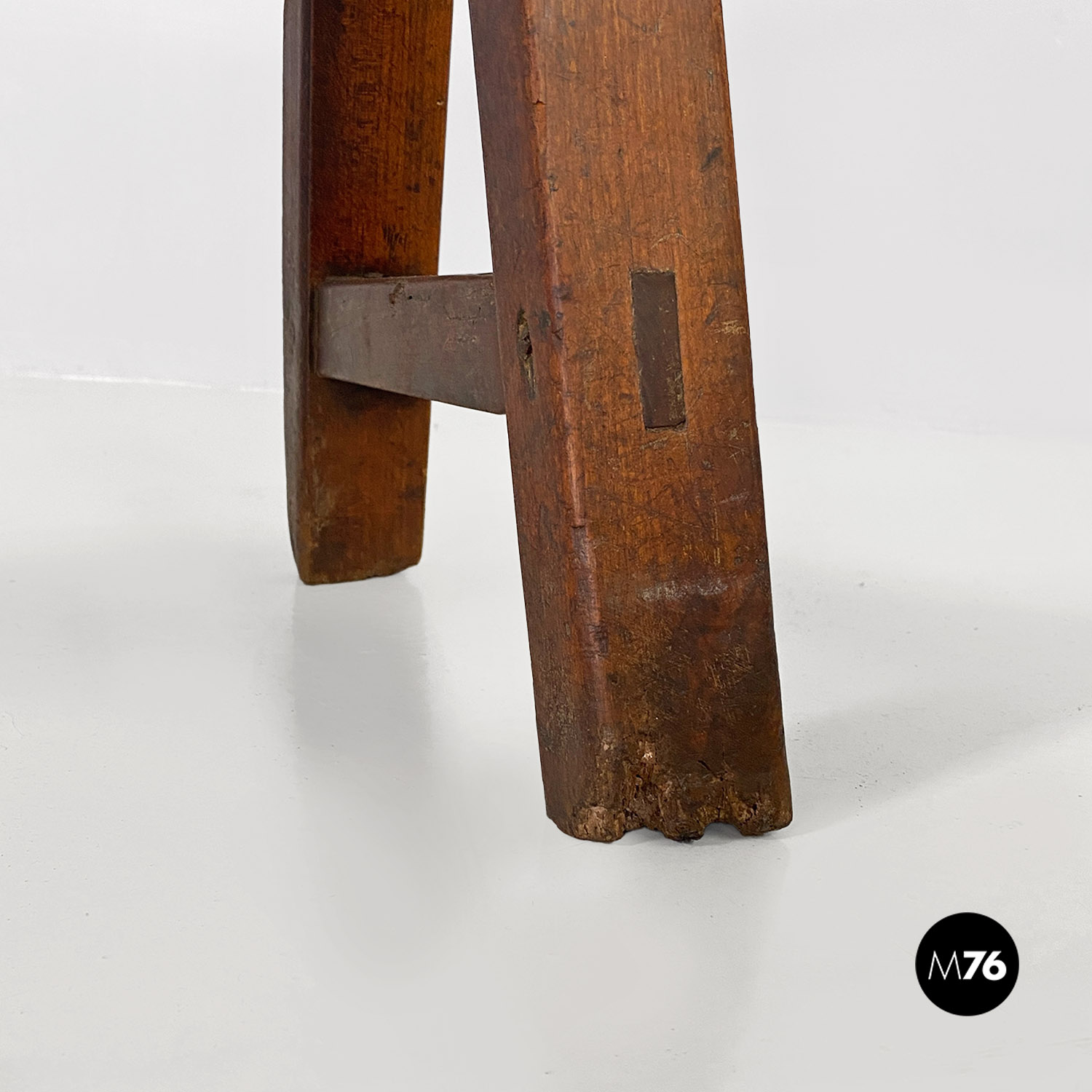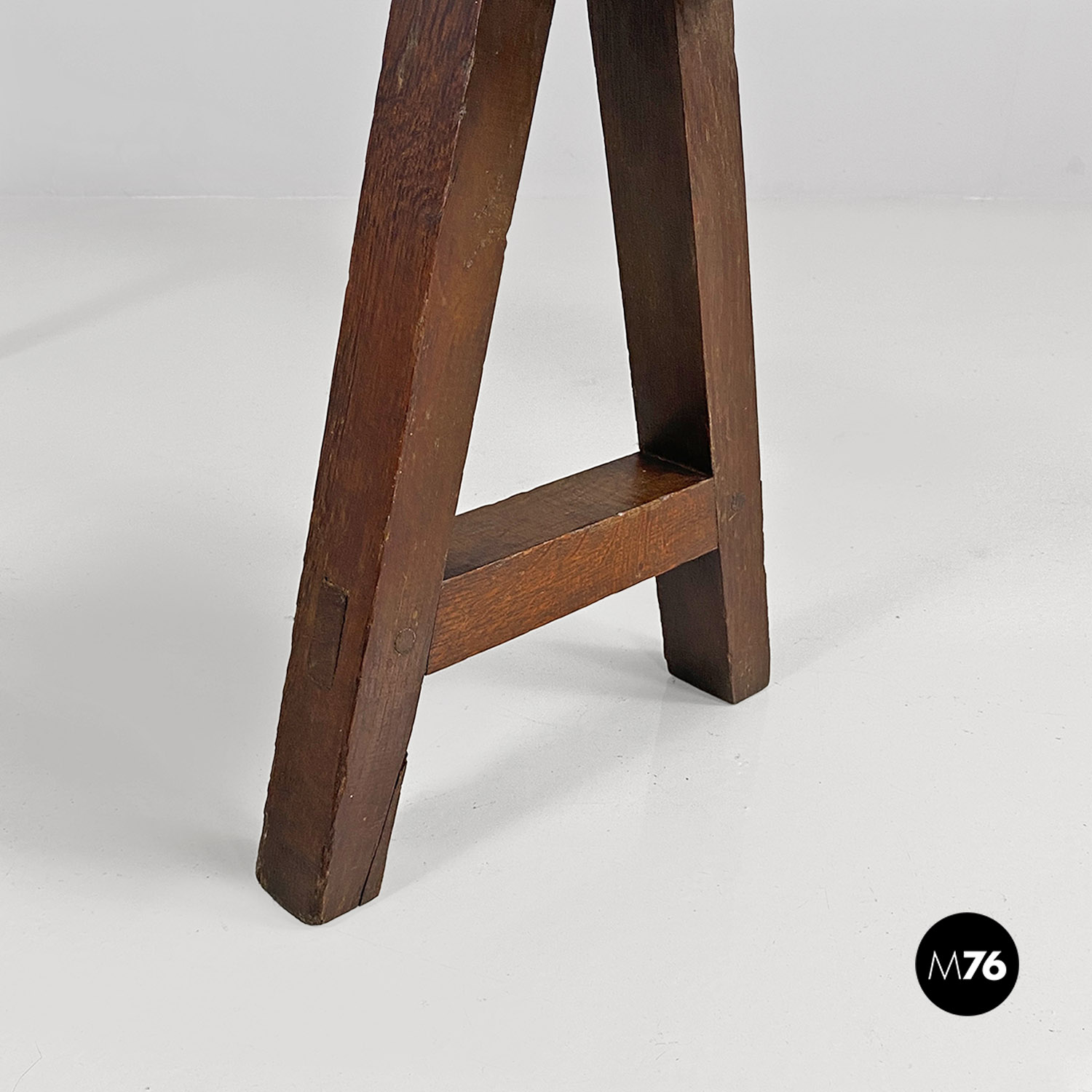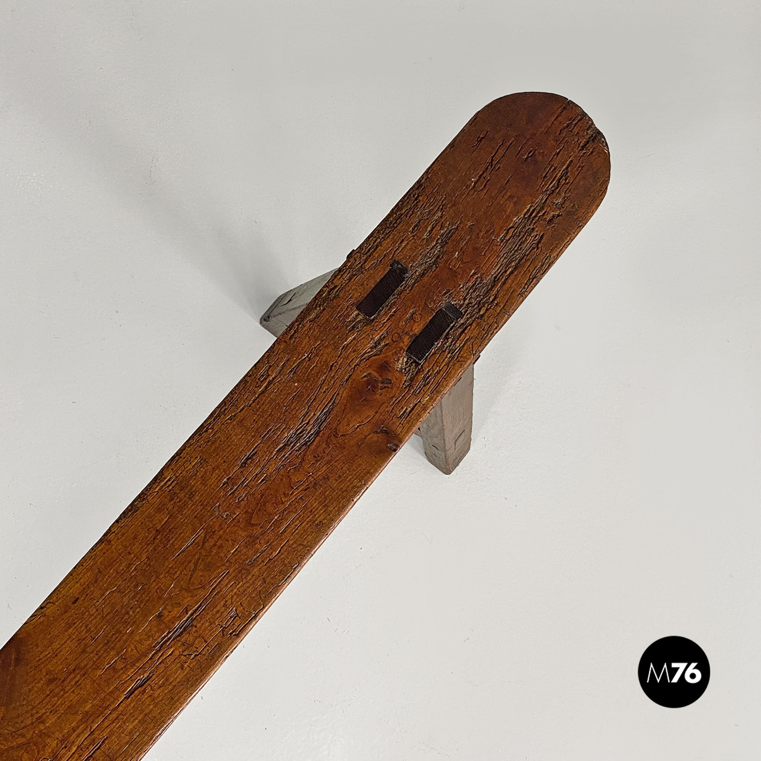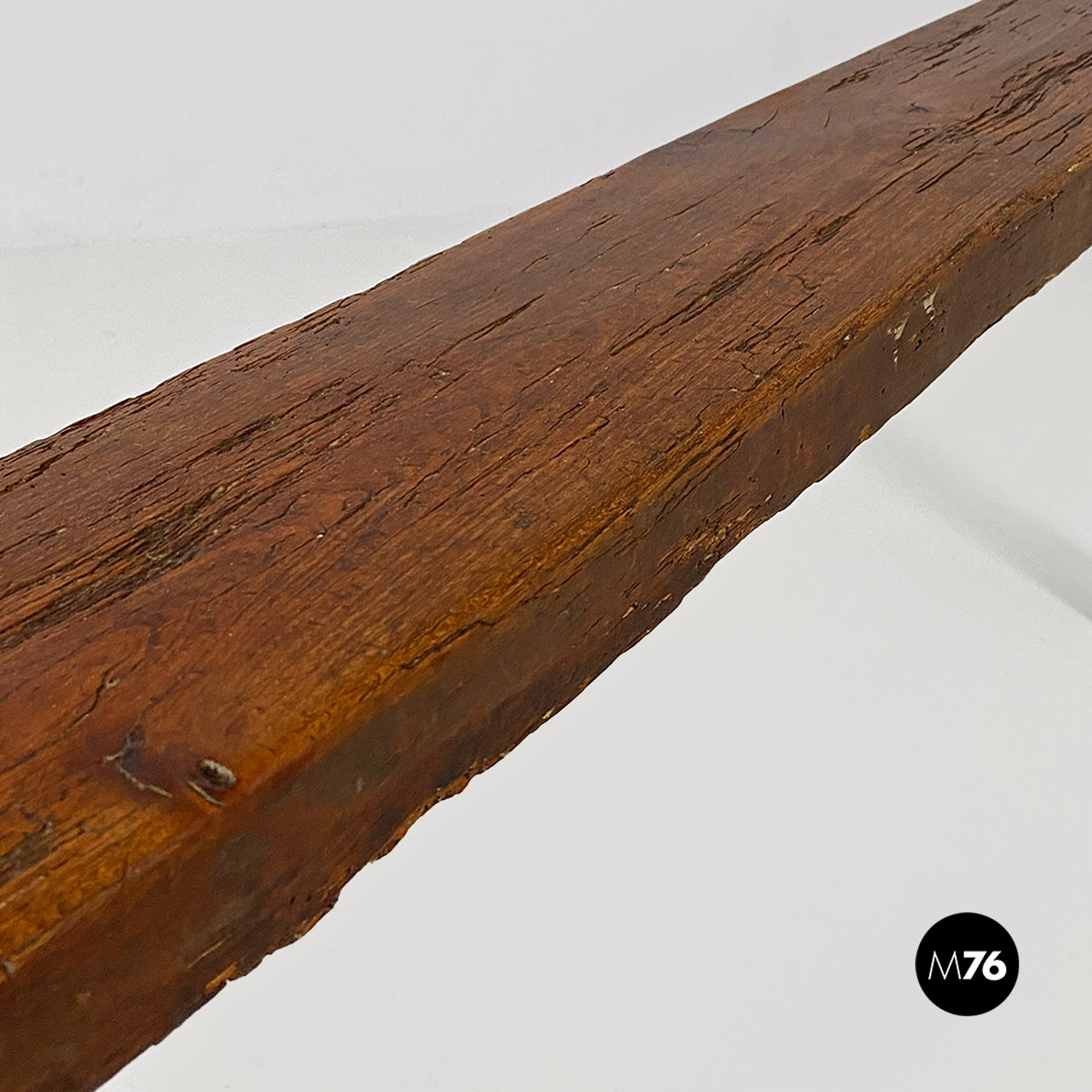 Panca con seduta stretta e lunga con angoli arrotondati, interamente in legno massello. Le zampe della panca a sezione quadrata, sono posizionate in diagonale congiunte da un listello, mentre la centrale è rettangolare e verticale.