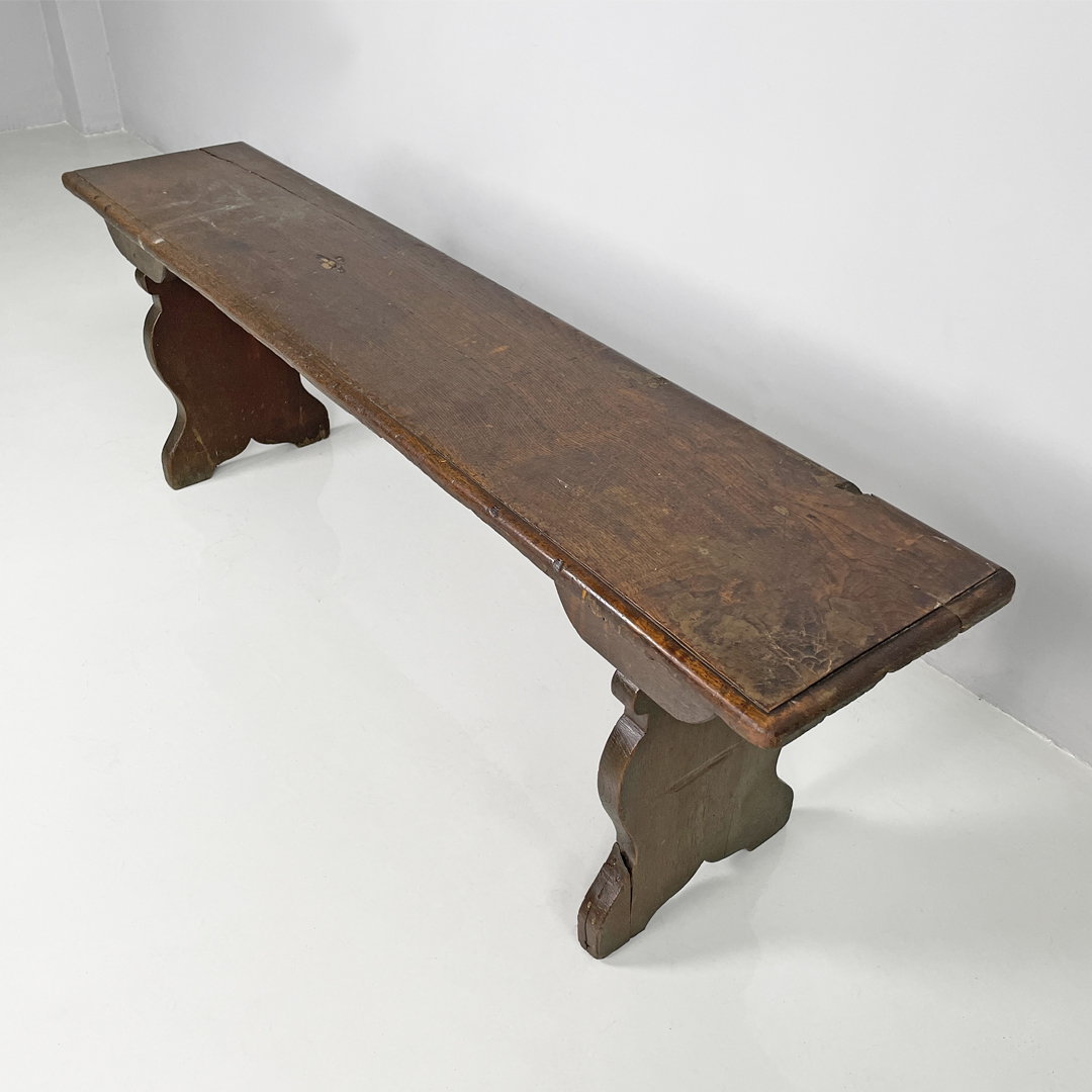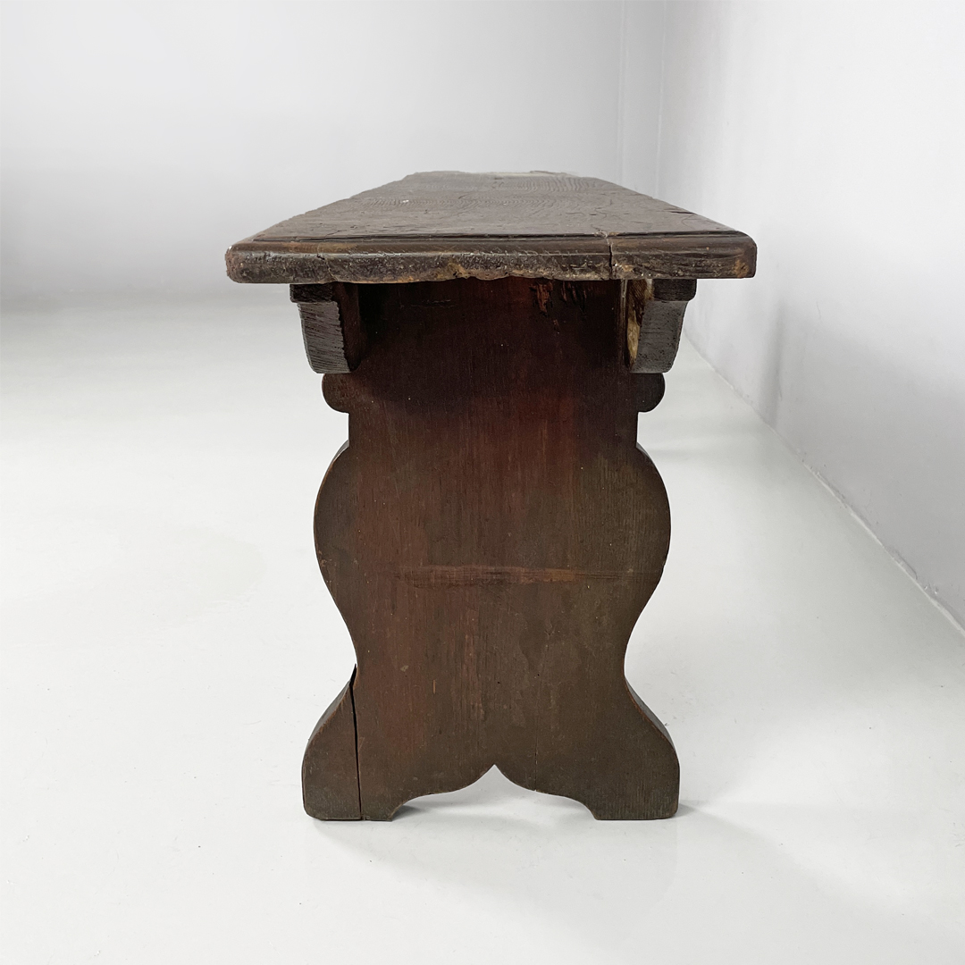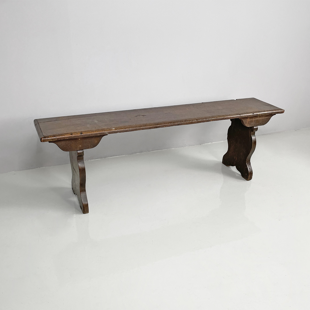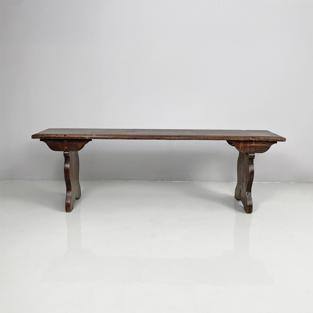 Panca in legno con piano rettangolare. Le due gambe ai lati hanno profili decorati con linee curve.