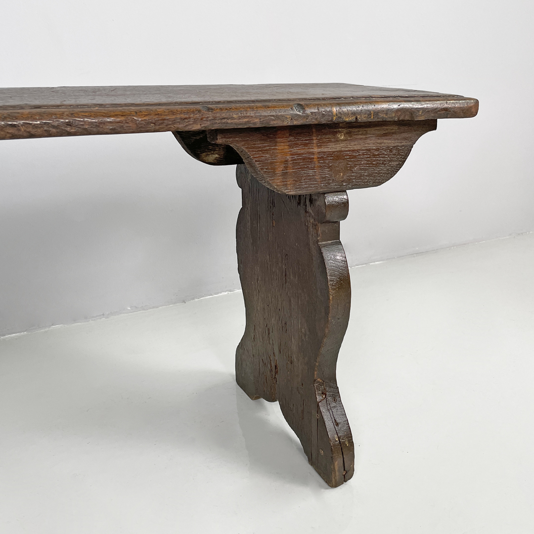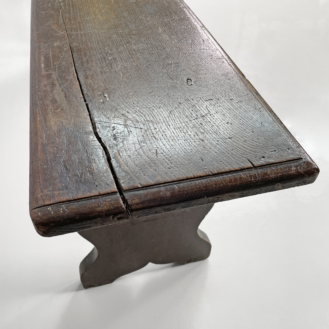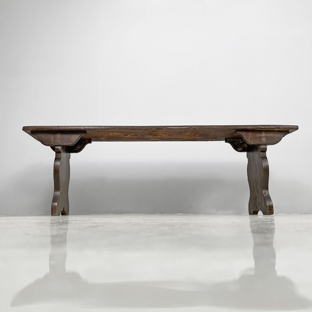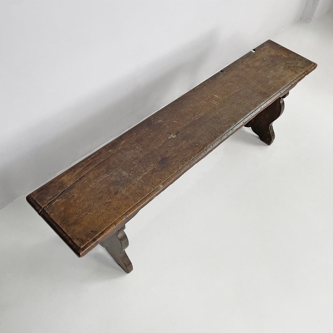Panca in legno con piano rettangolare. Le due gambe ai lati hanno profili decorati con linee curve.
