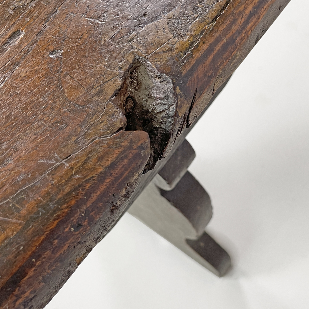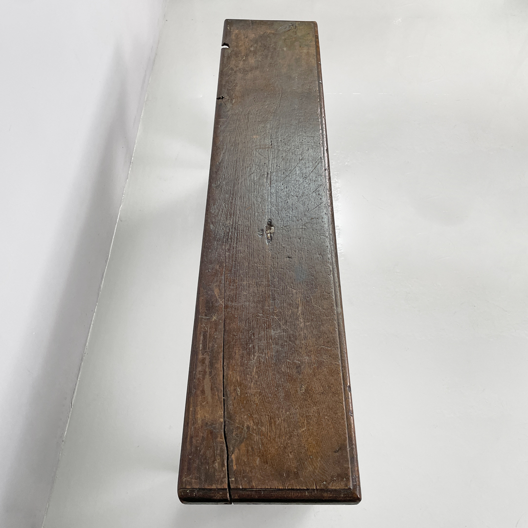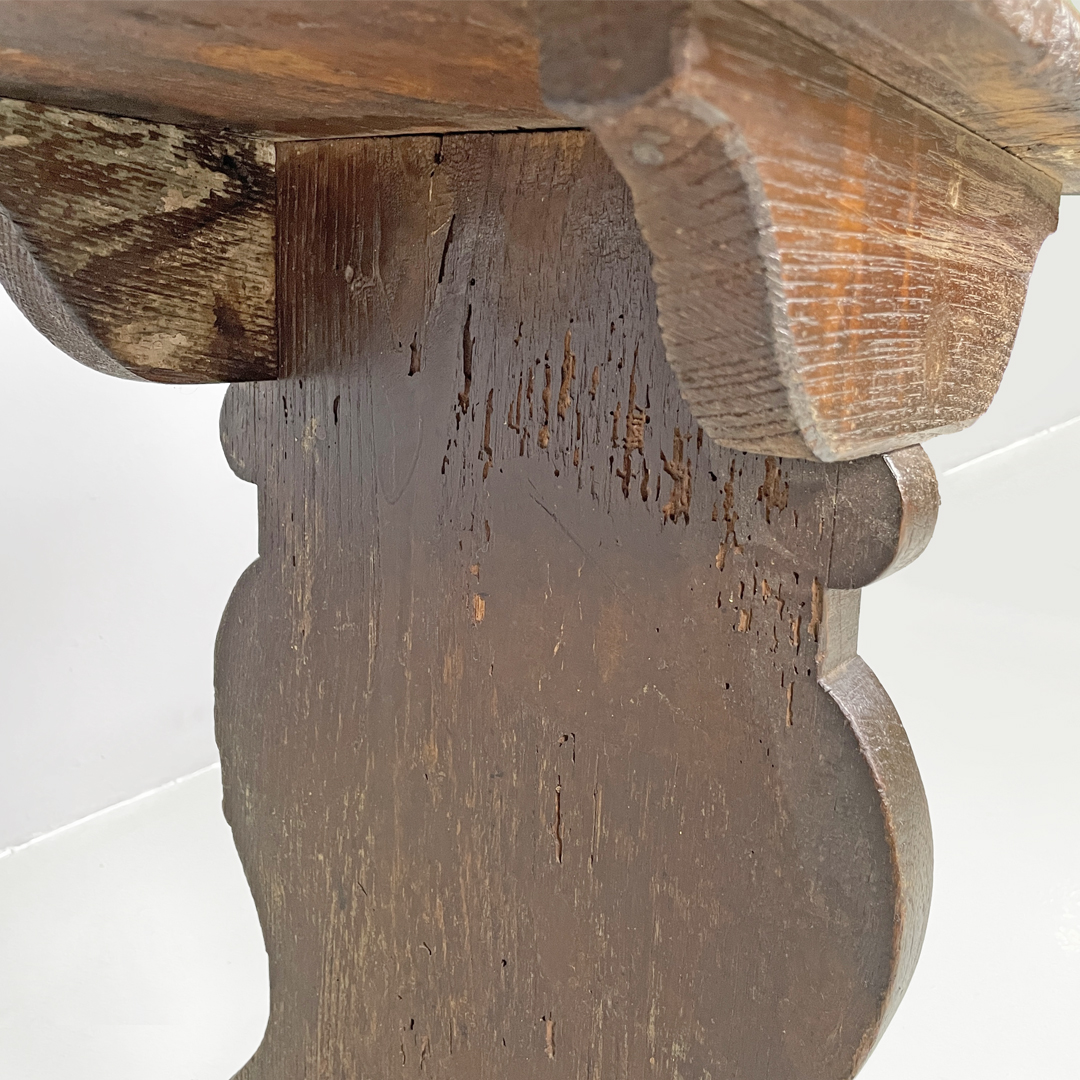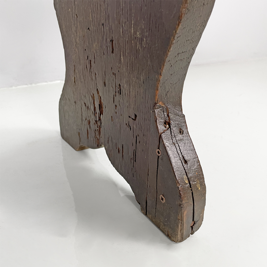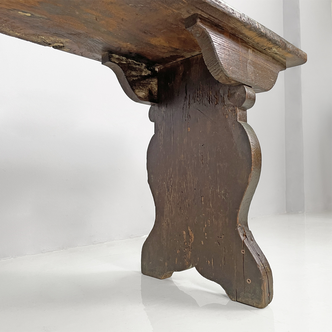 Panca in legno con piano rettangolare. Le due gambe ai lati hanno profili decorati con linee curve.