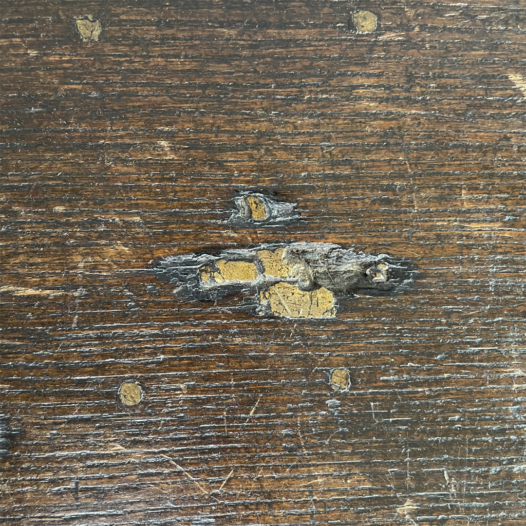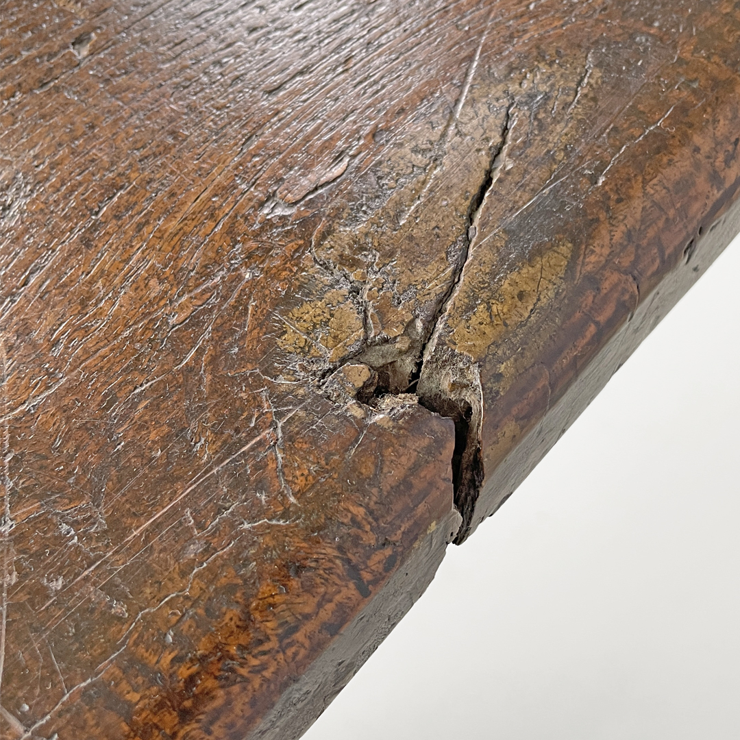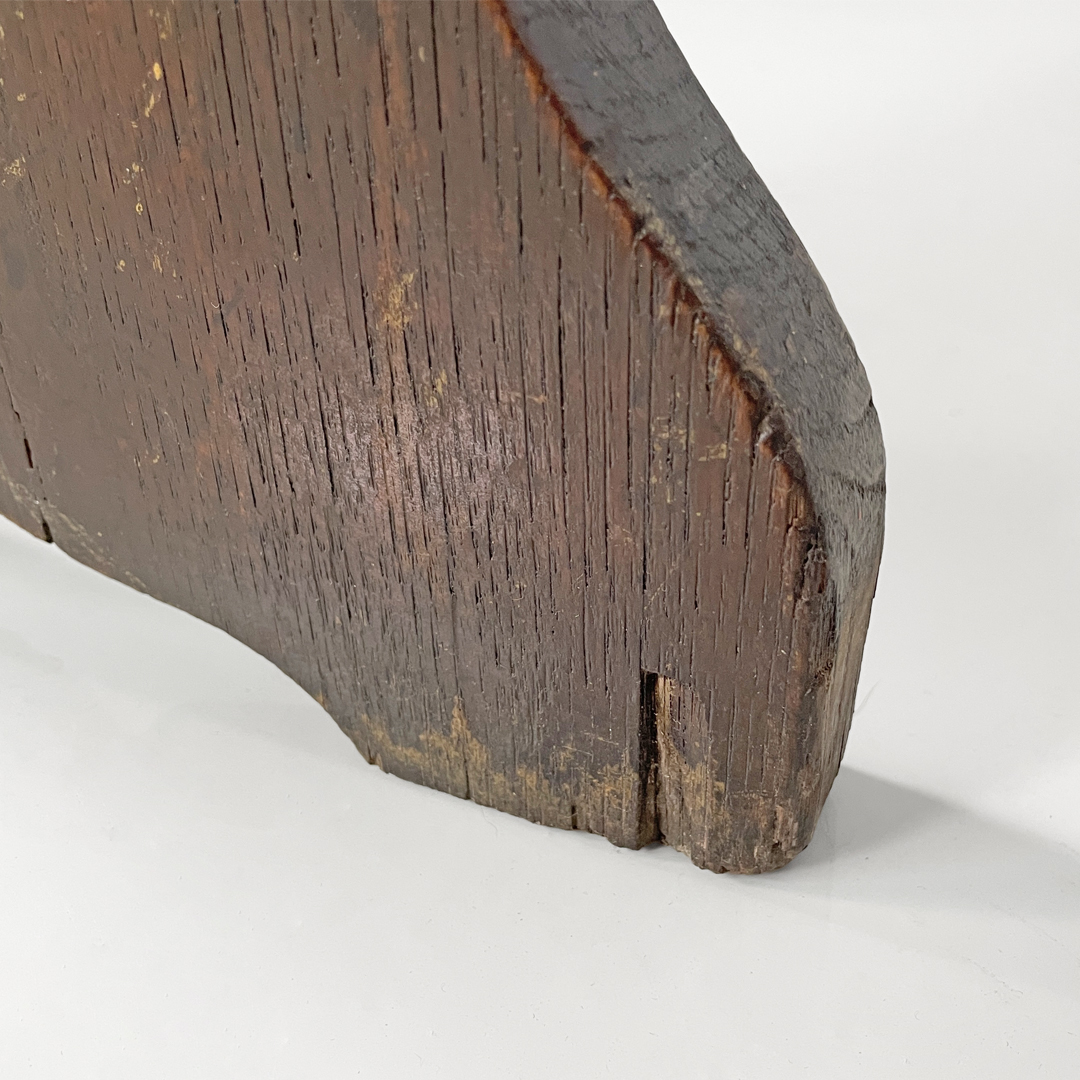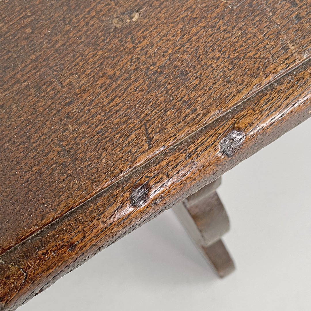 Panca in legno con piano rettangolare. Le due gambe ai lati hanno profili decorati con linee curve.