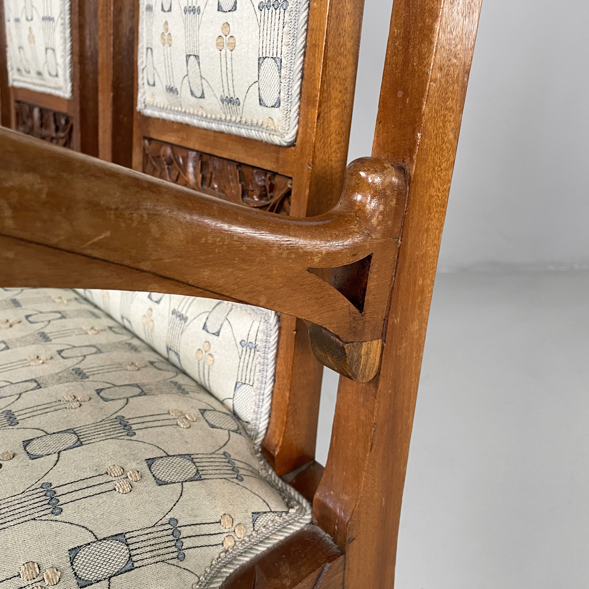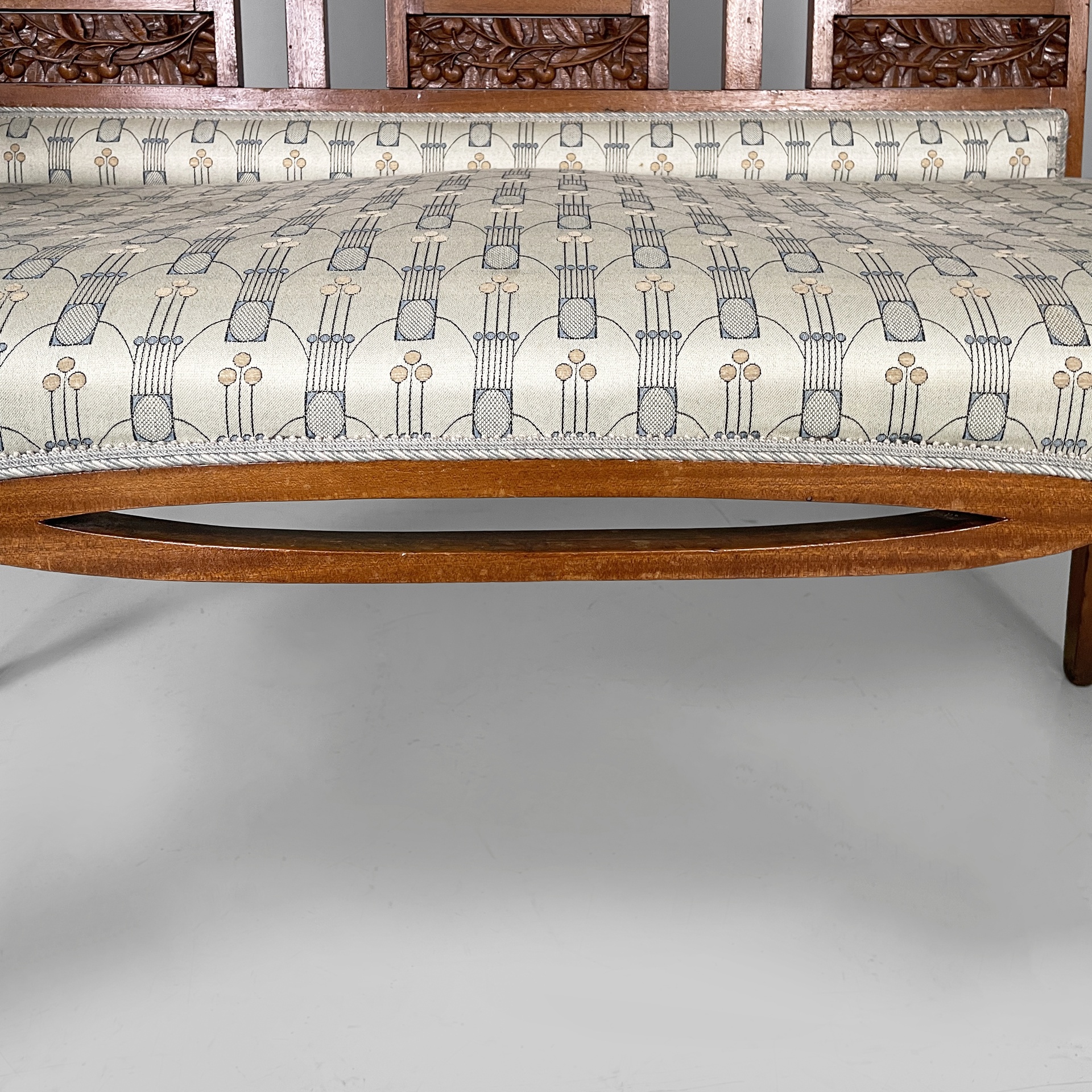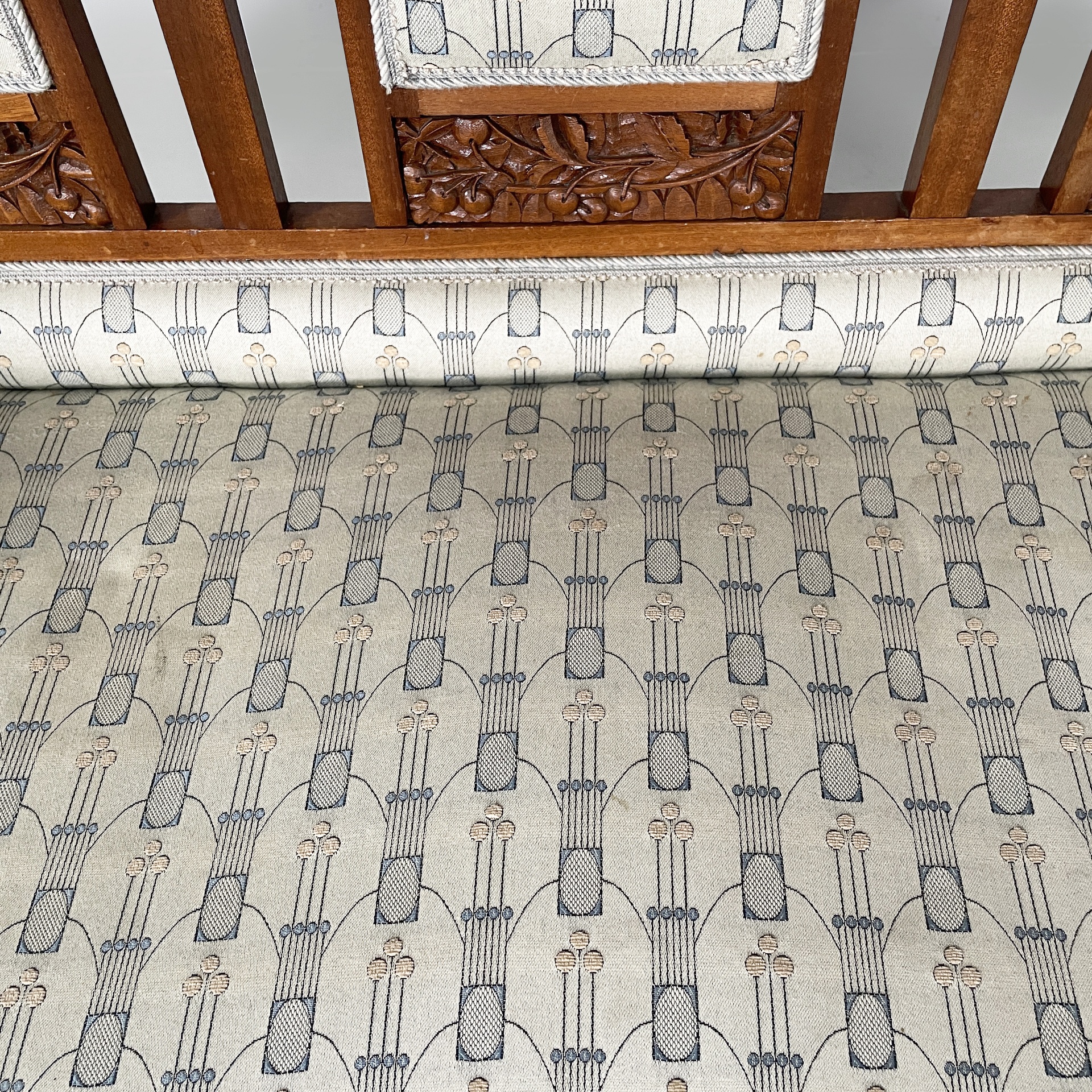 Panca con struttura in legno. La seduta rettangolare è imbottita e rivestita in tessuto grigio chiaro con decori beige e blue. Lo schienale è composto da tre parti rettangolari, imbottite e rivestite nello stesso tessuto della seduta, con struttura in legno decorato. I braccioli sono in legno. Sulle zampe a sezione squadrata in legno sono presenti dei decorazioni a forma di foglie. In stile Liberty- Art Nouveau. Utilizzabile con divano.