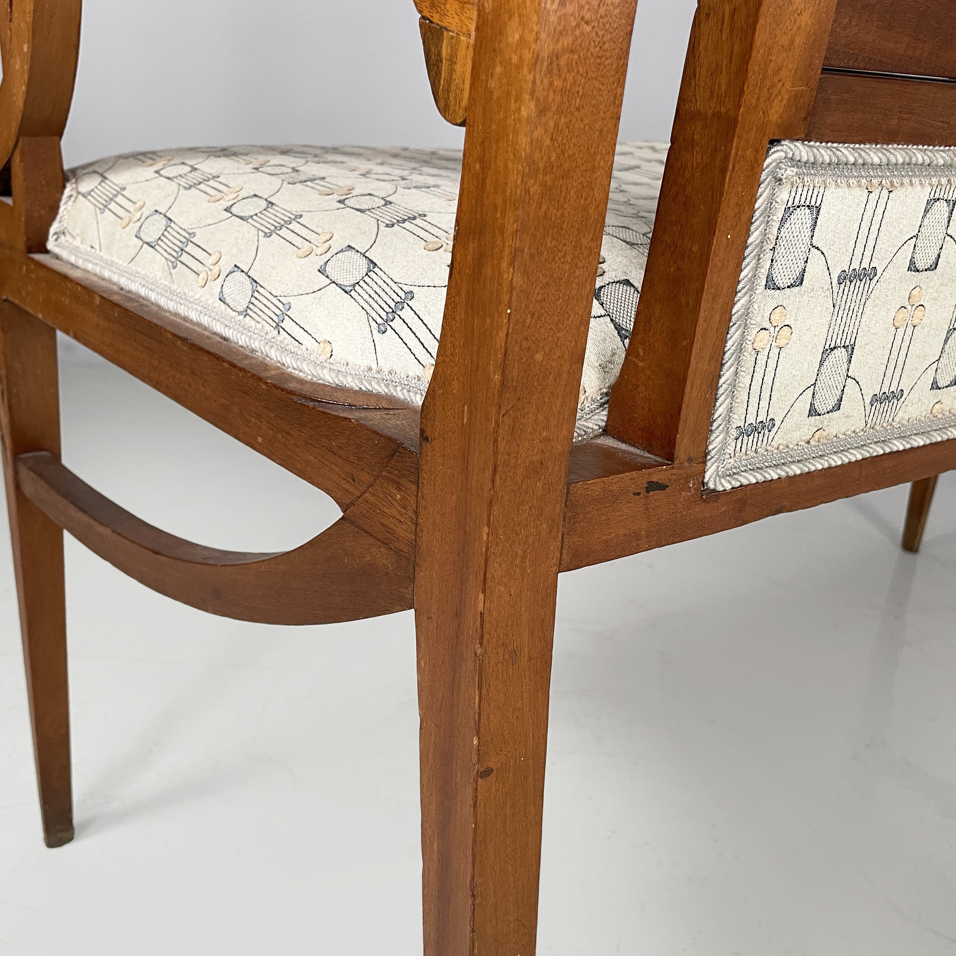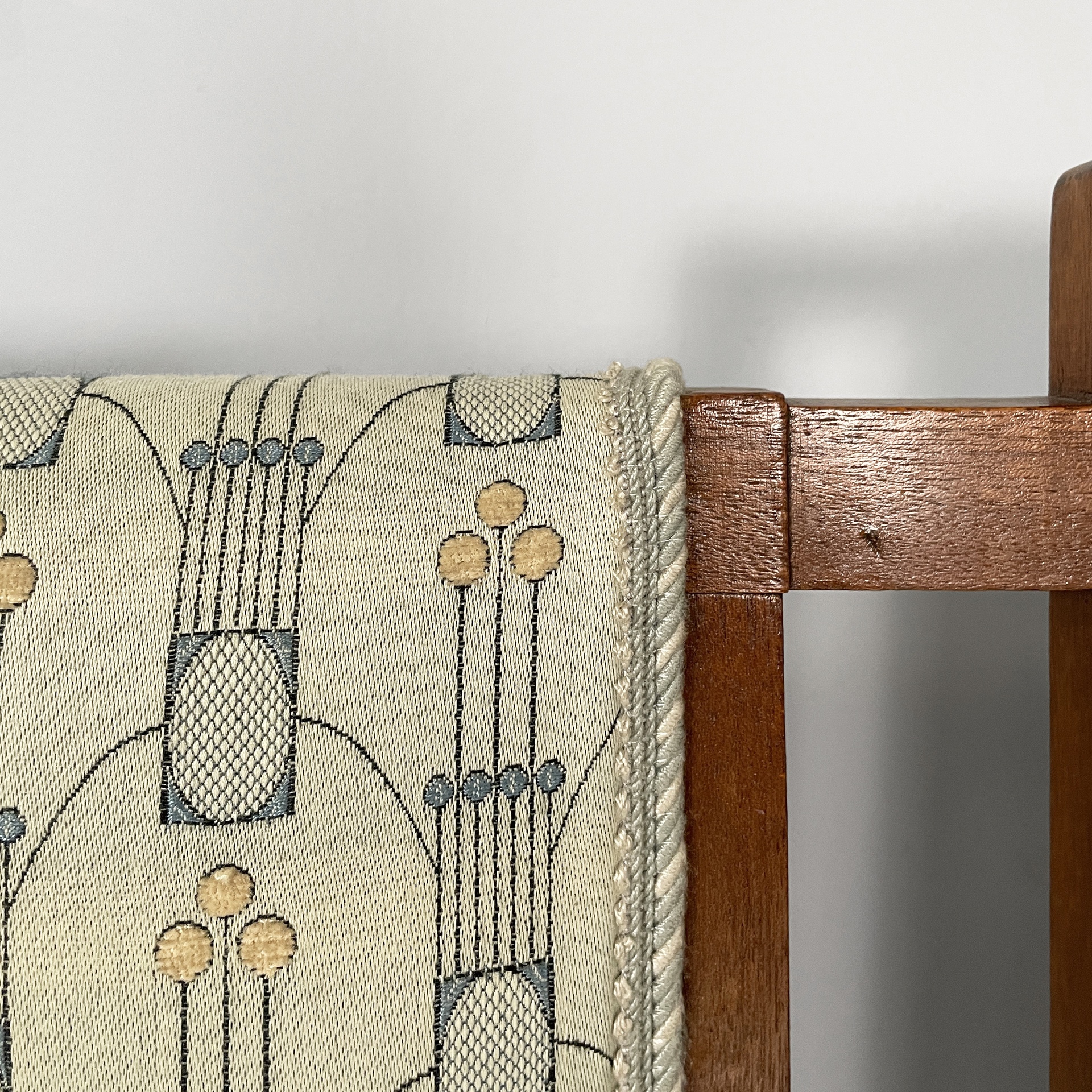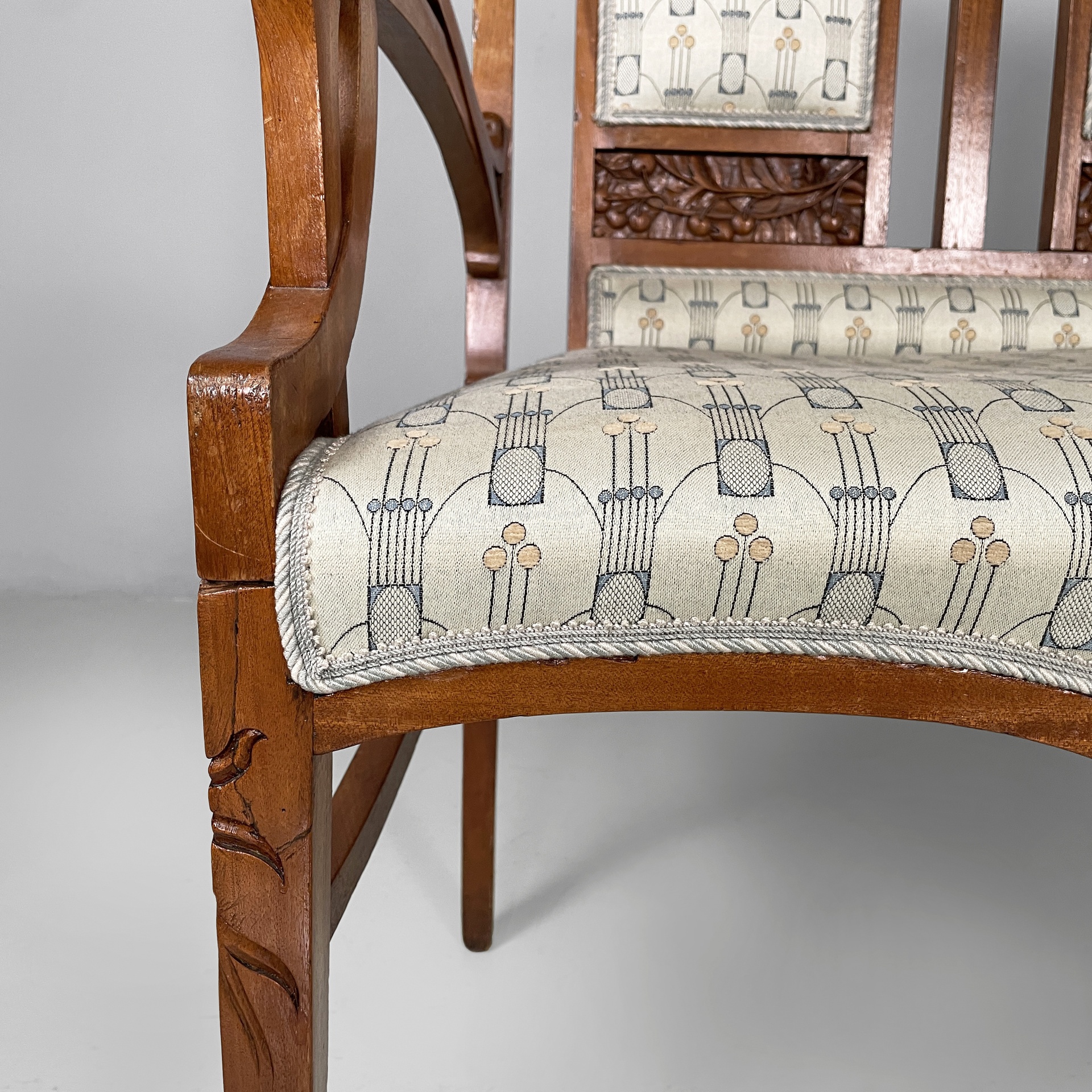 Panca con struttura in legno. La seduta rettangolare è imbottita e rivestita in tessuto grigio chiaro con decori beige e blue. Lo schienale è composto da tre parti rettangolari, imbottite e rivestite nello stesso tessuto della seduta, con struttura in legno decorato. I braccioli sono in legno. Sulle zampe a sezione squadrata in legno sono presenti dei decorazioni a forma di foglie. In stile Liberty- Art Nouveau. Utilizzabile con divano.