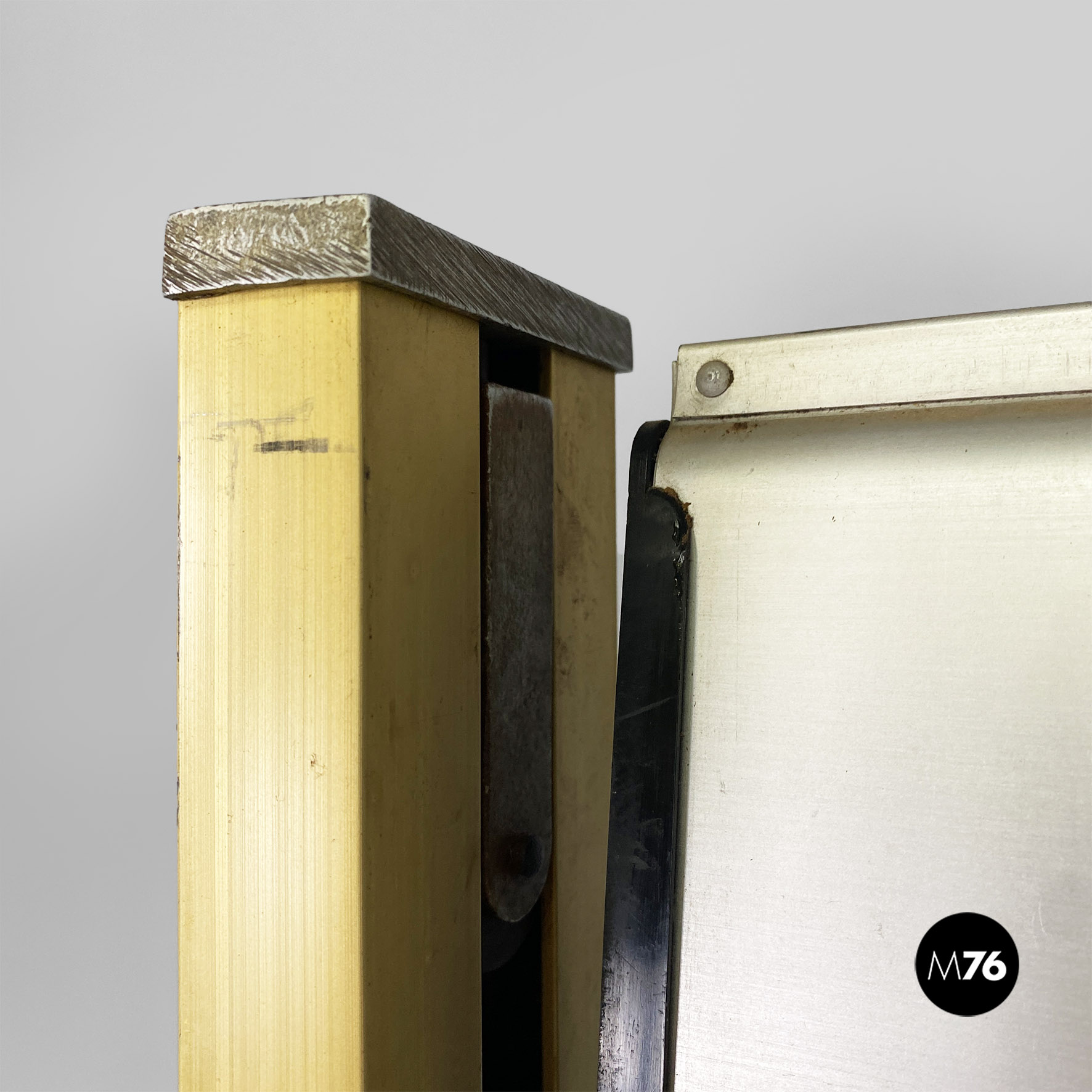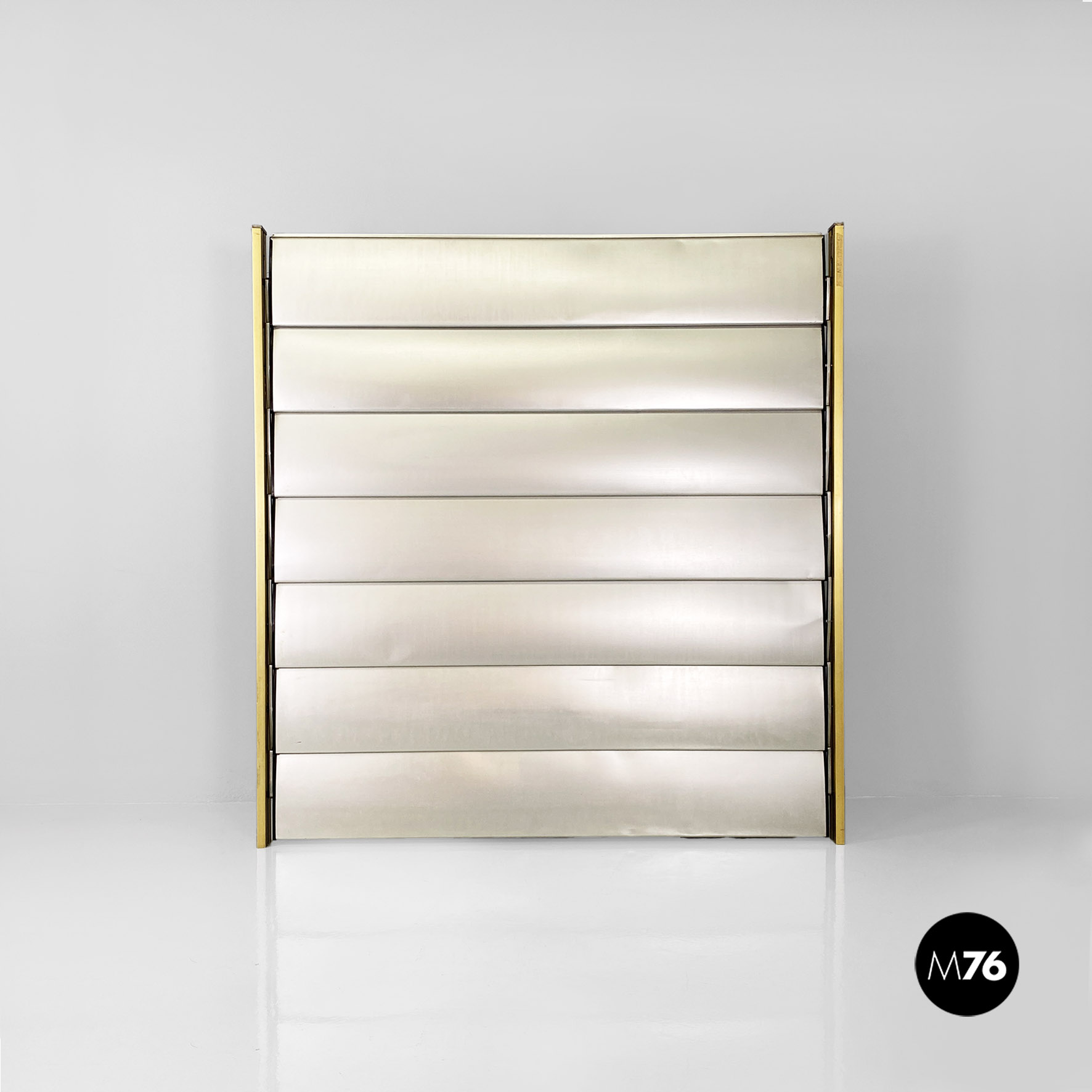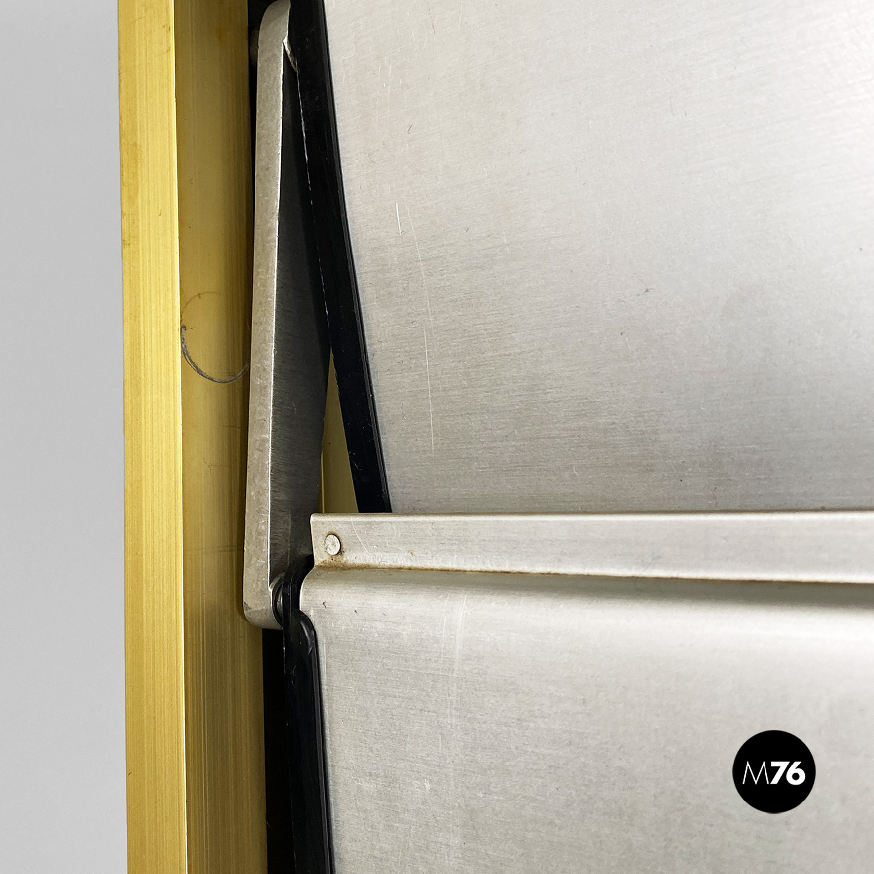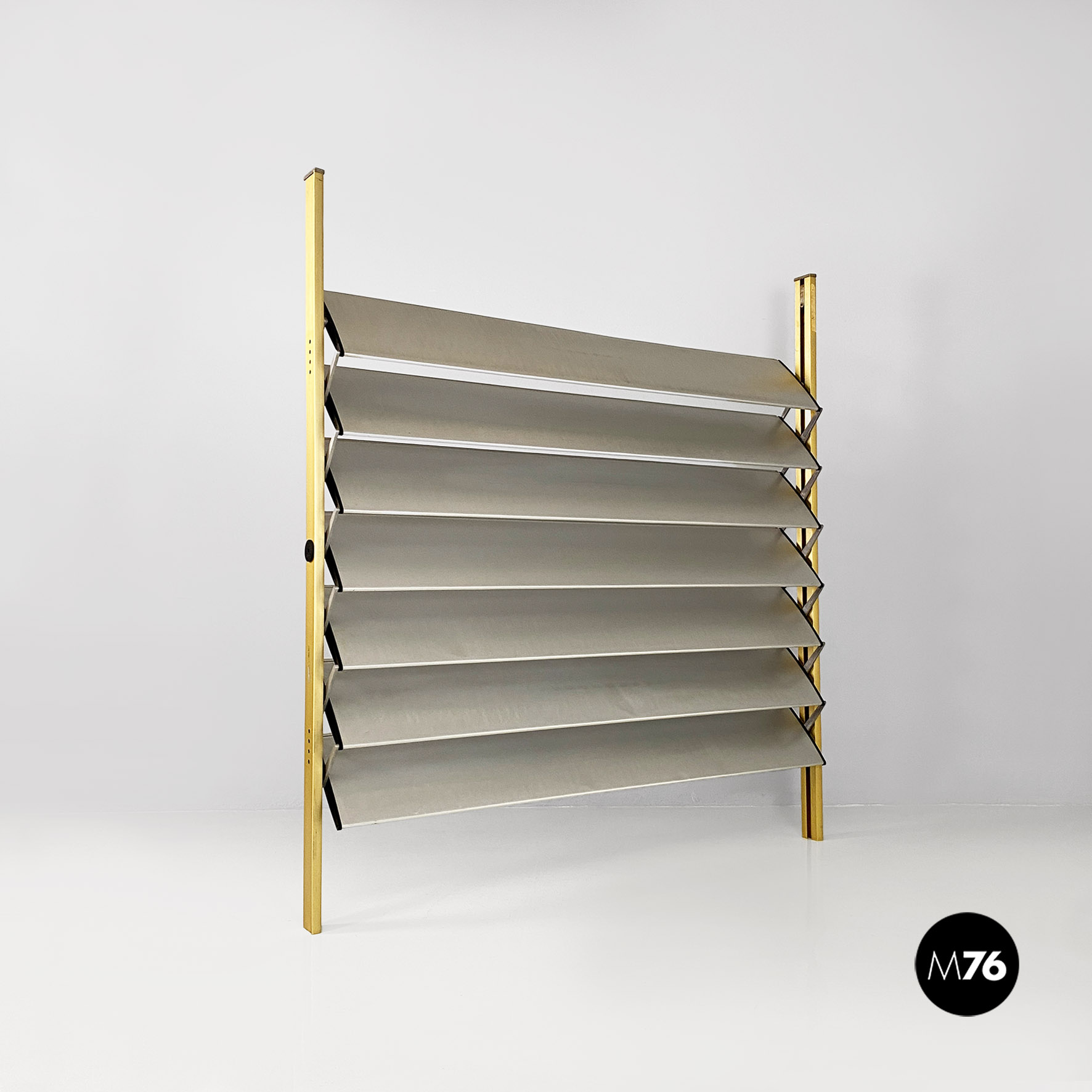 Pannello o brise-soleil in alluminio, proveniente dalla facciata della scuola di Beziers, in Francia. La struttura è composta da un’intelaiatura in alluminio con finitura dorata che sostiene sette fasce frangisole, sempre in alluminio, mosse tramite un ingranaggio a catena posto all’interno dei montanti. Nonostante la sua imponenza formale pesa meno di 30 kg.
