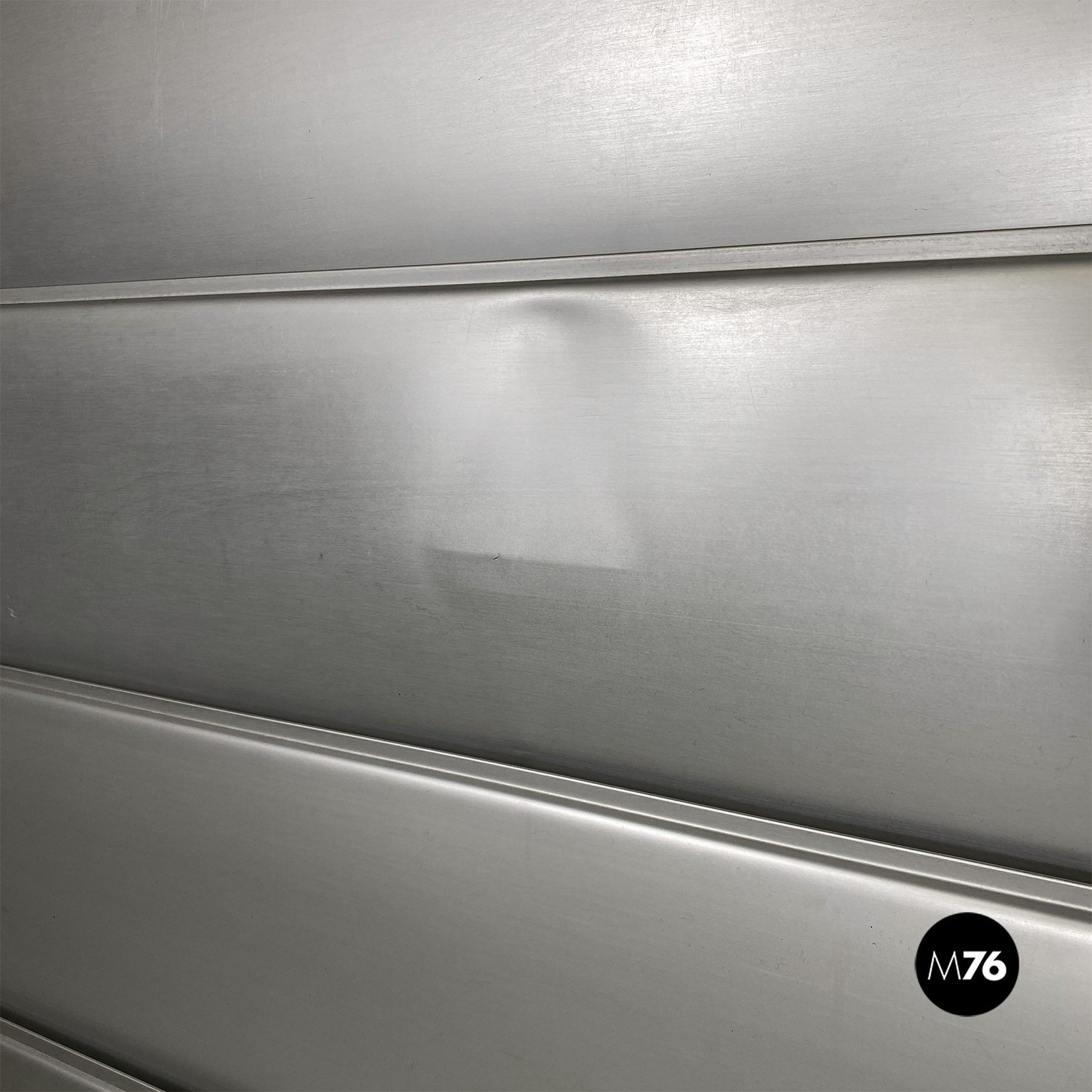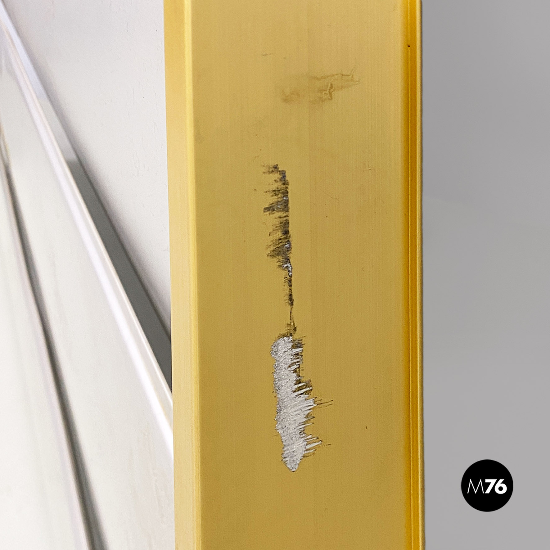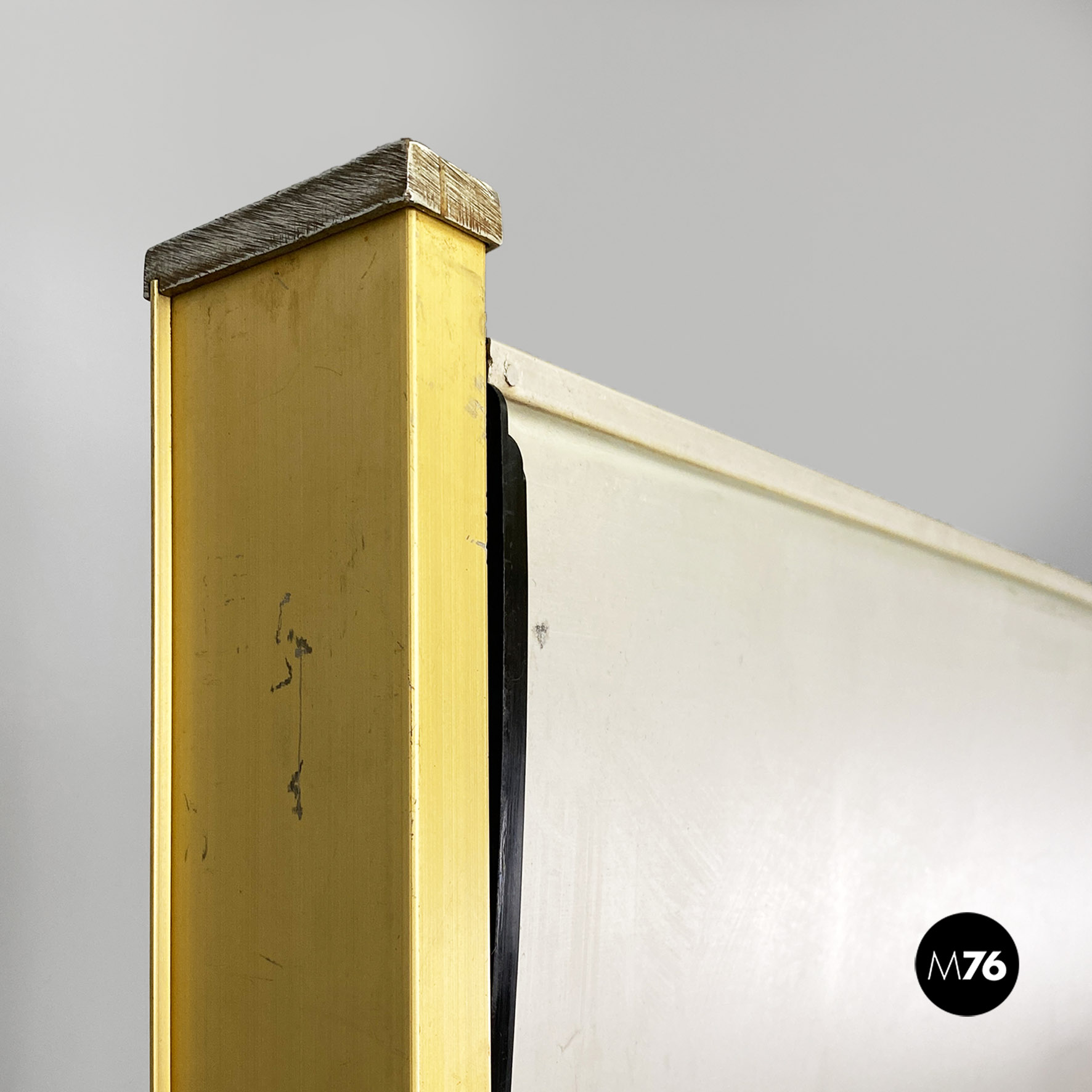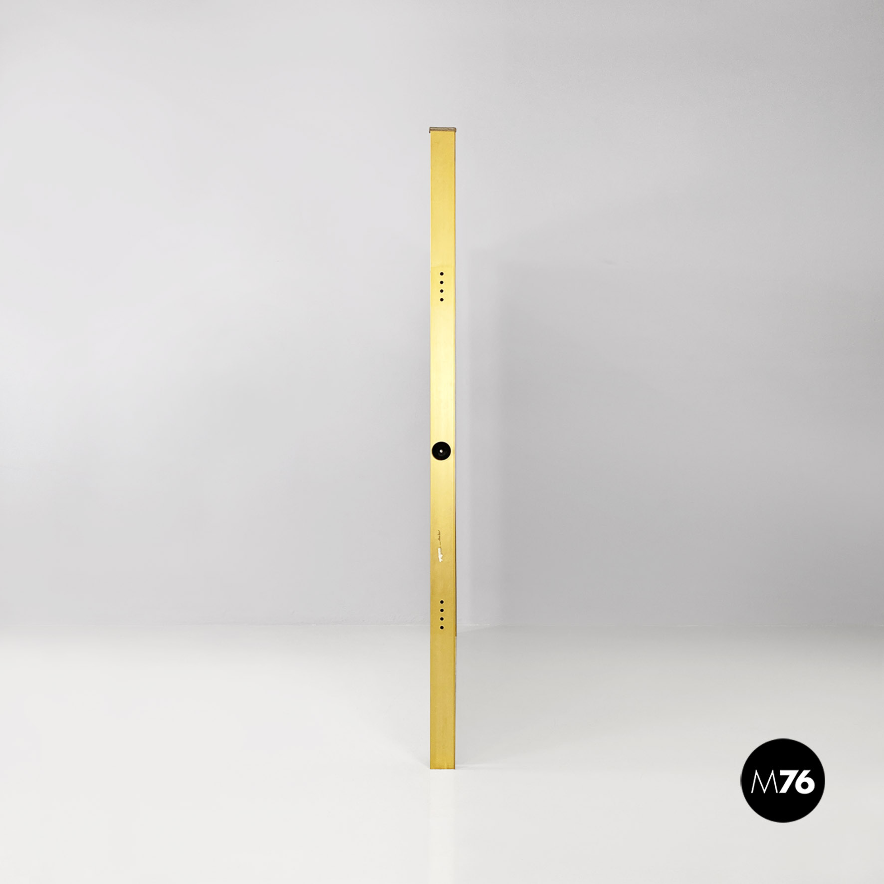 Pannello o brise-soleil in alluminio, proveniente dalla facciata della scuola di Beziers, in Francia. La struttura è composta da un’intelaiatura in alluminio con finitura dorata che sostiene sette fasce frangisole, sempre in alluminio, mosse tramite un ingranaggio a catena posto all’interno dei montanti. Nonostante la sua imponenza formale pesa meno di 30 kg.