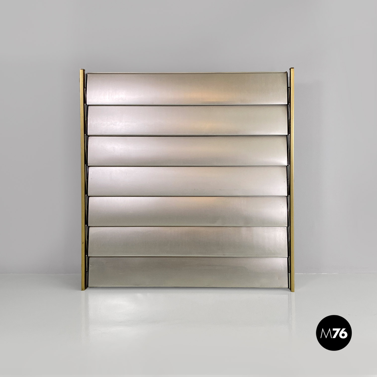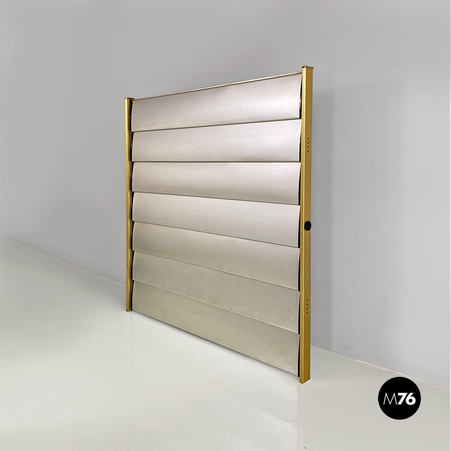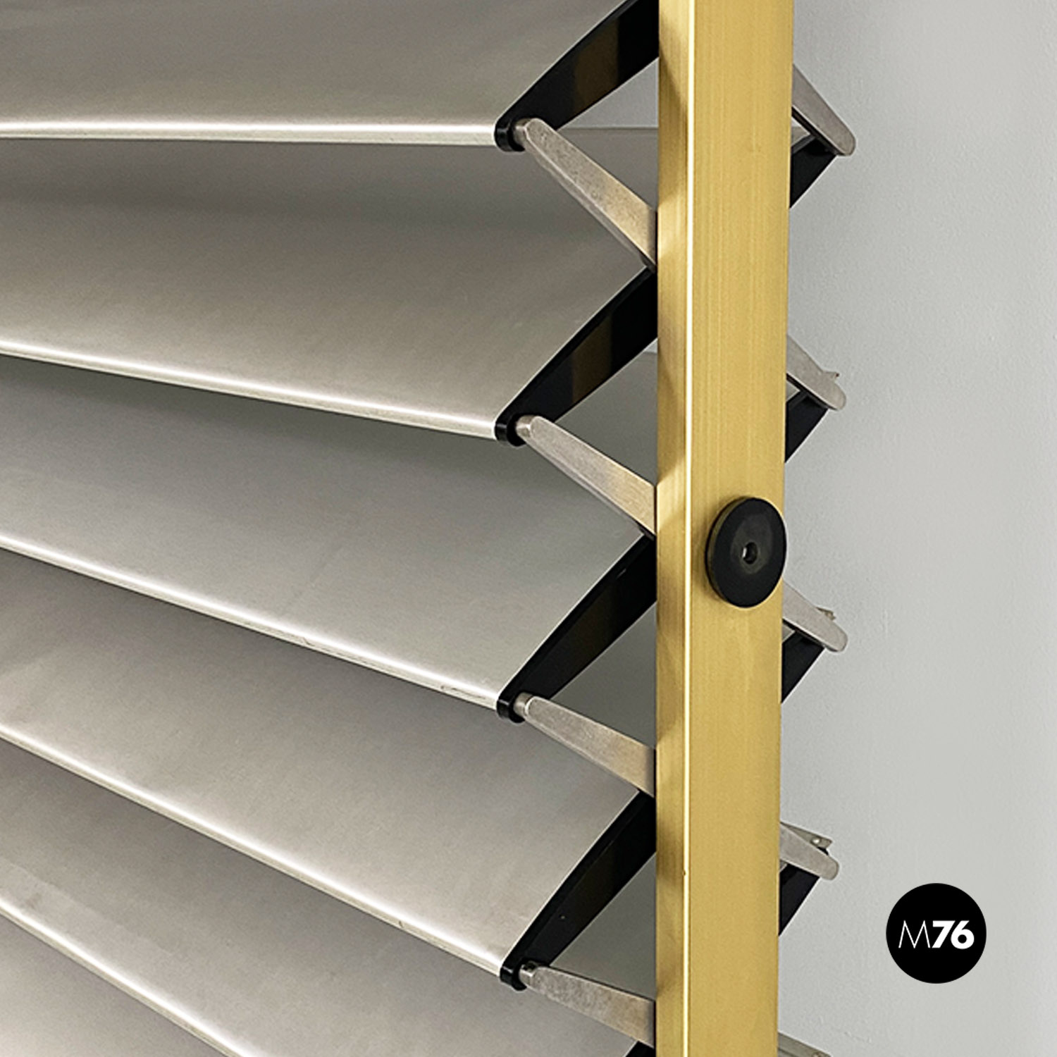 La struttura è composta da un’intelaiatura in alluminio con finitura dorata che sostiene sette fasce frangisole, sempre in alluminio, mosse tramite un ingranaggio a catena posto all’interno dei montanti.