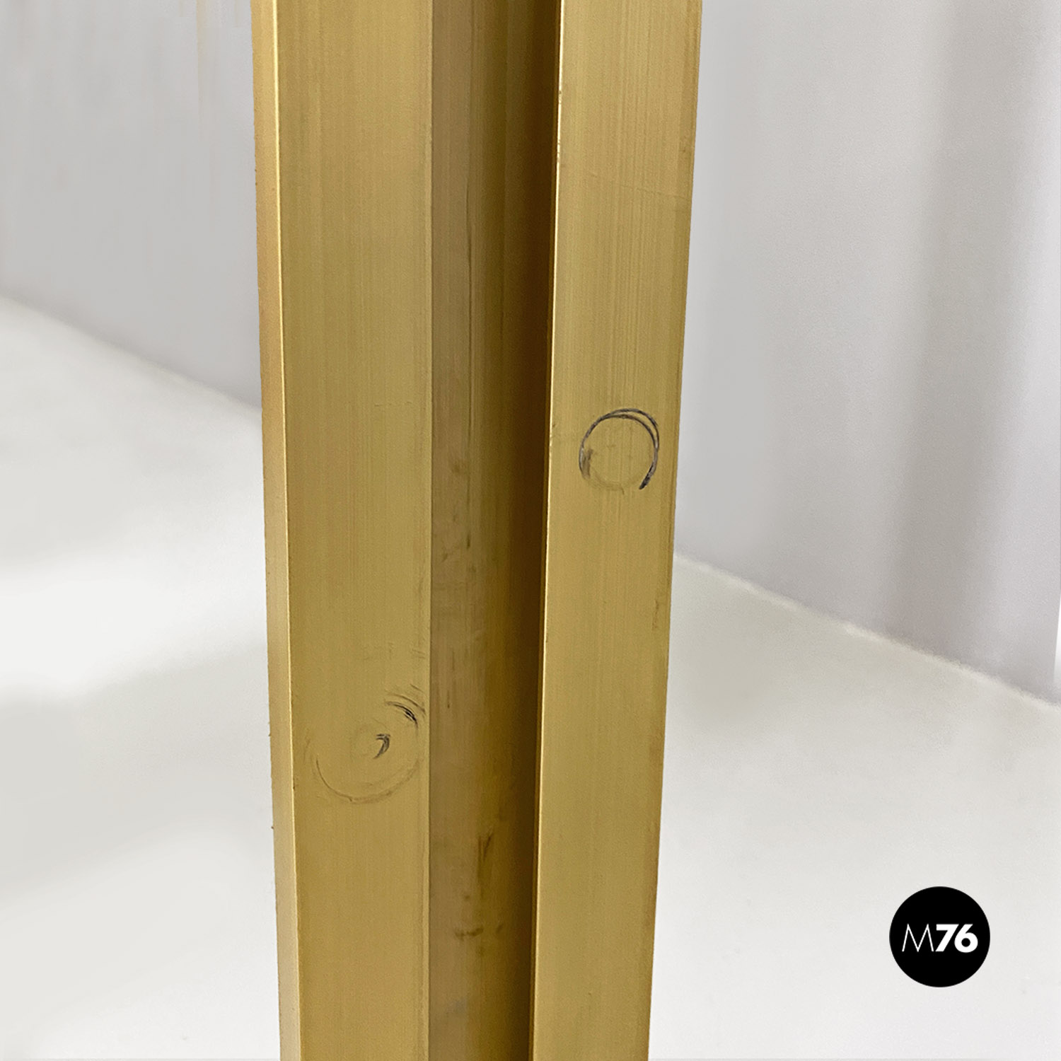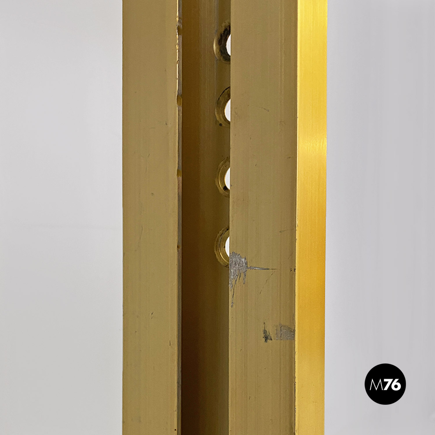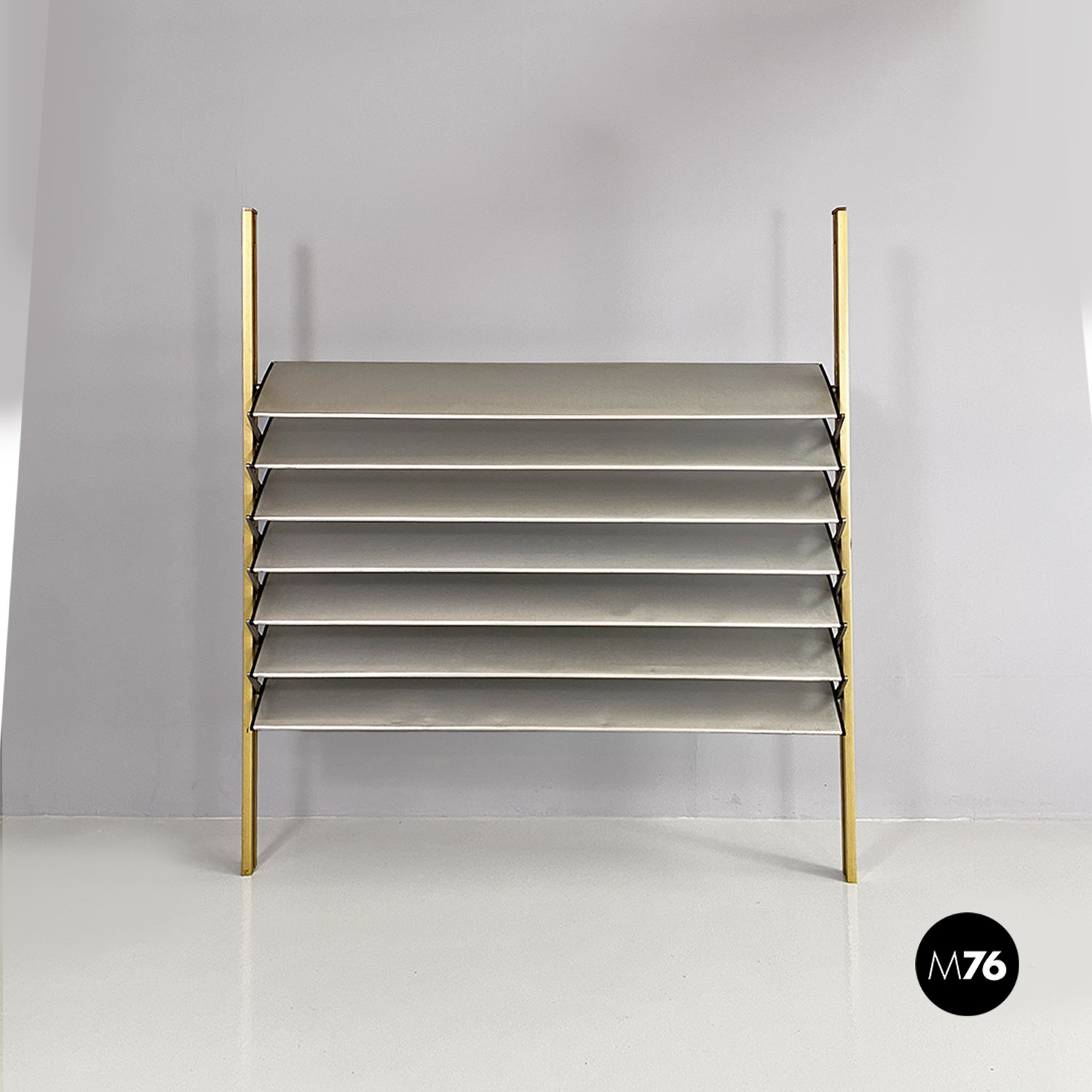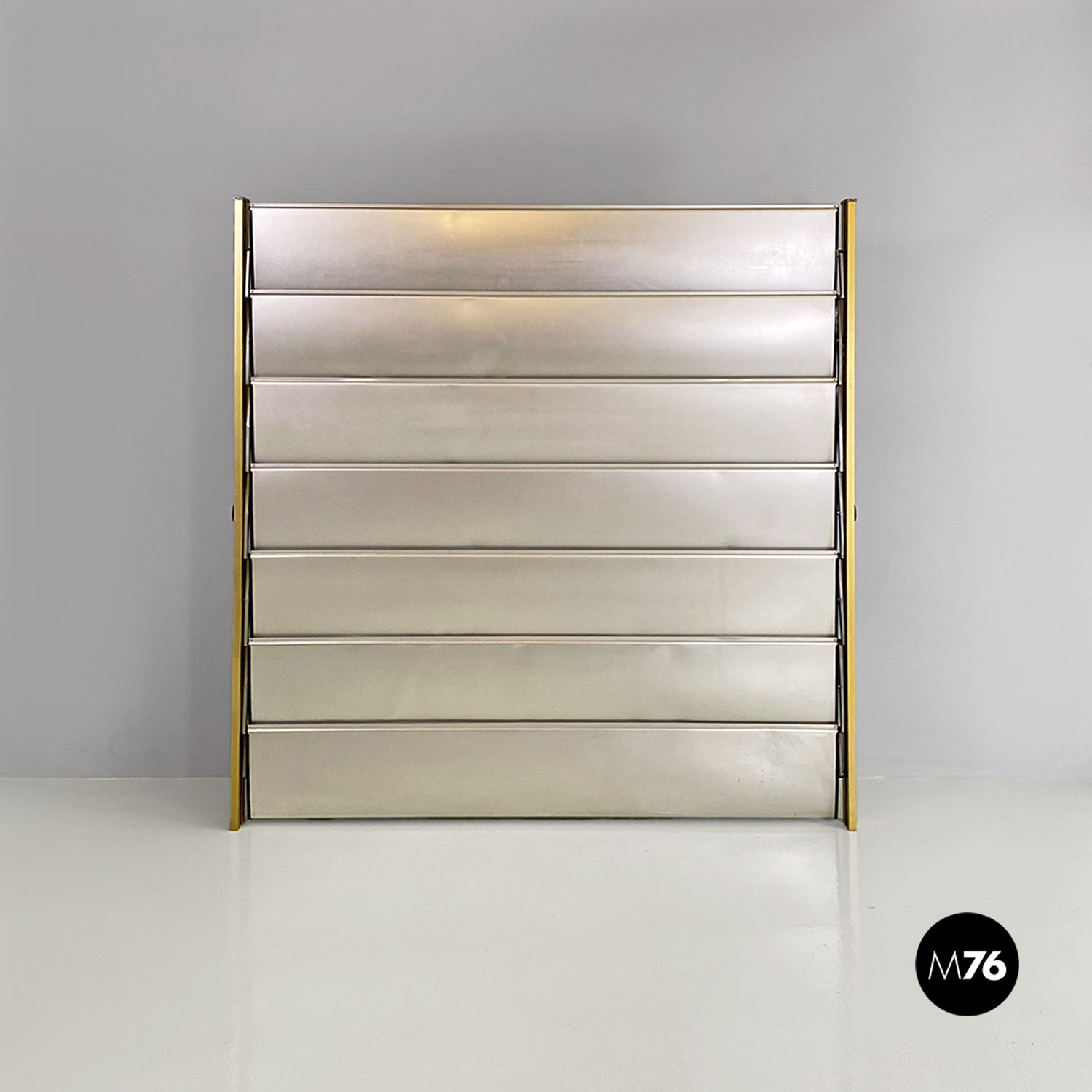 La struttura è composta da un’intelaiatura in alluminio con finitura dorata che sostiene sette fasce frangisole, sempre in alluminio, mosse tramite un ingranaggio a catena posto all’interno dei montanti.
