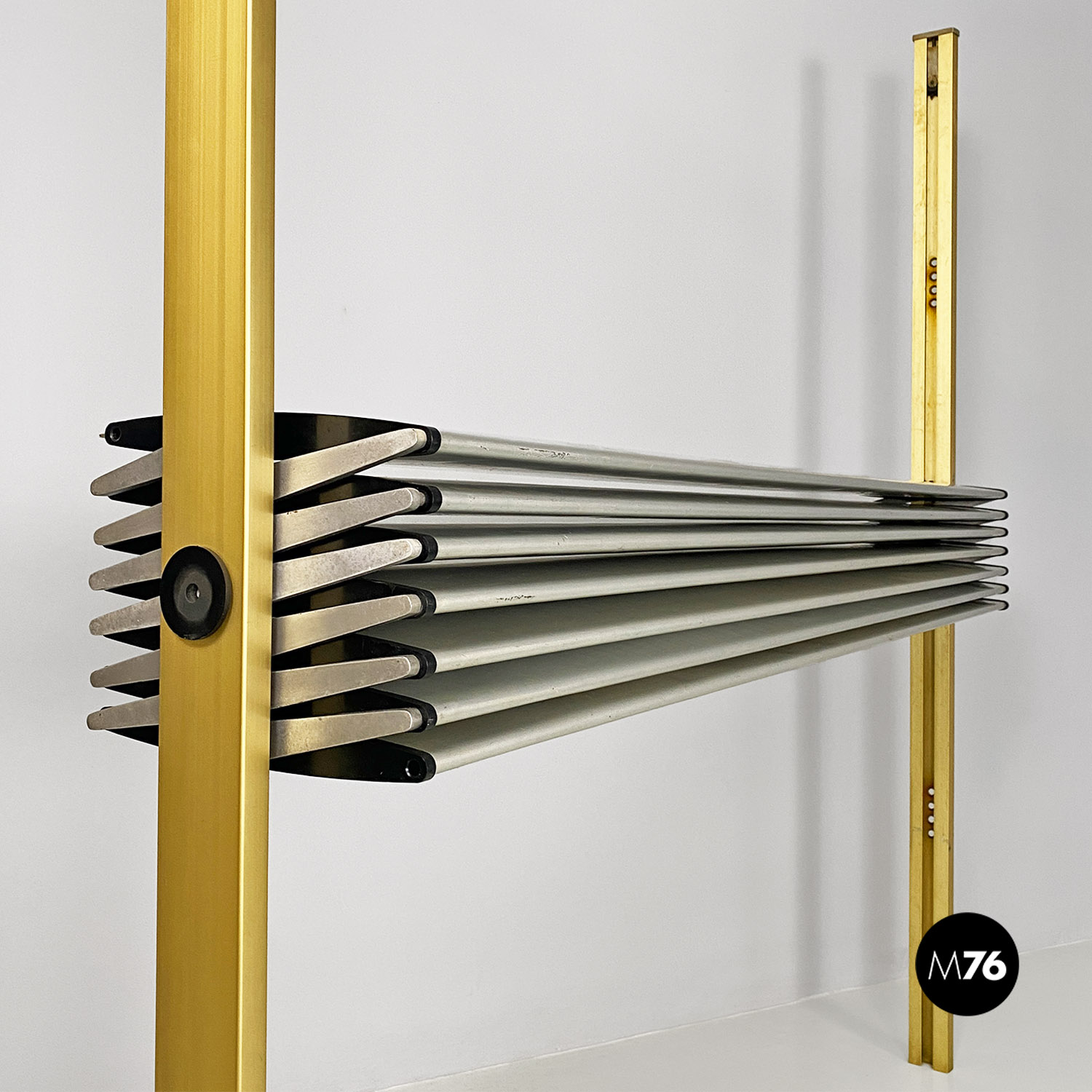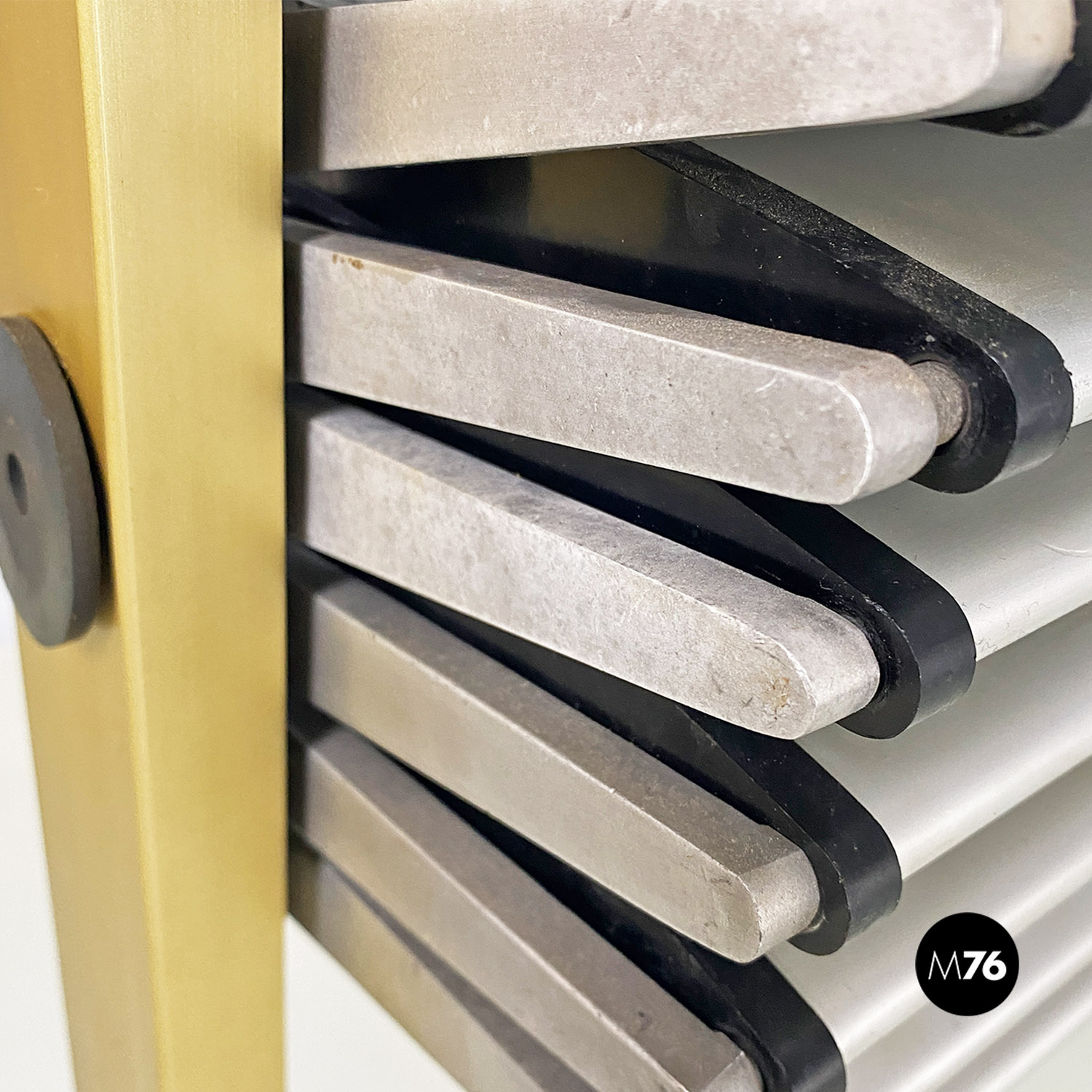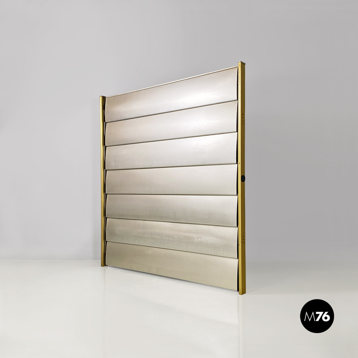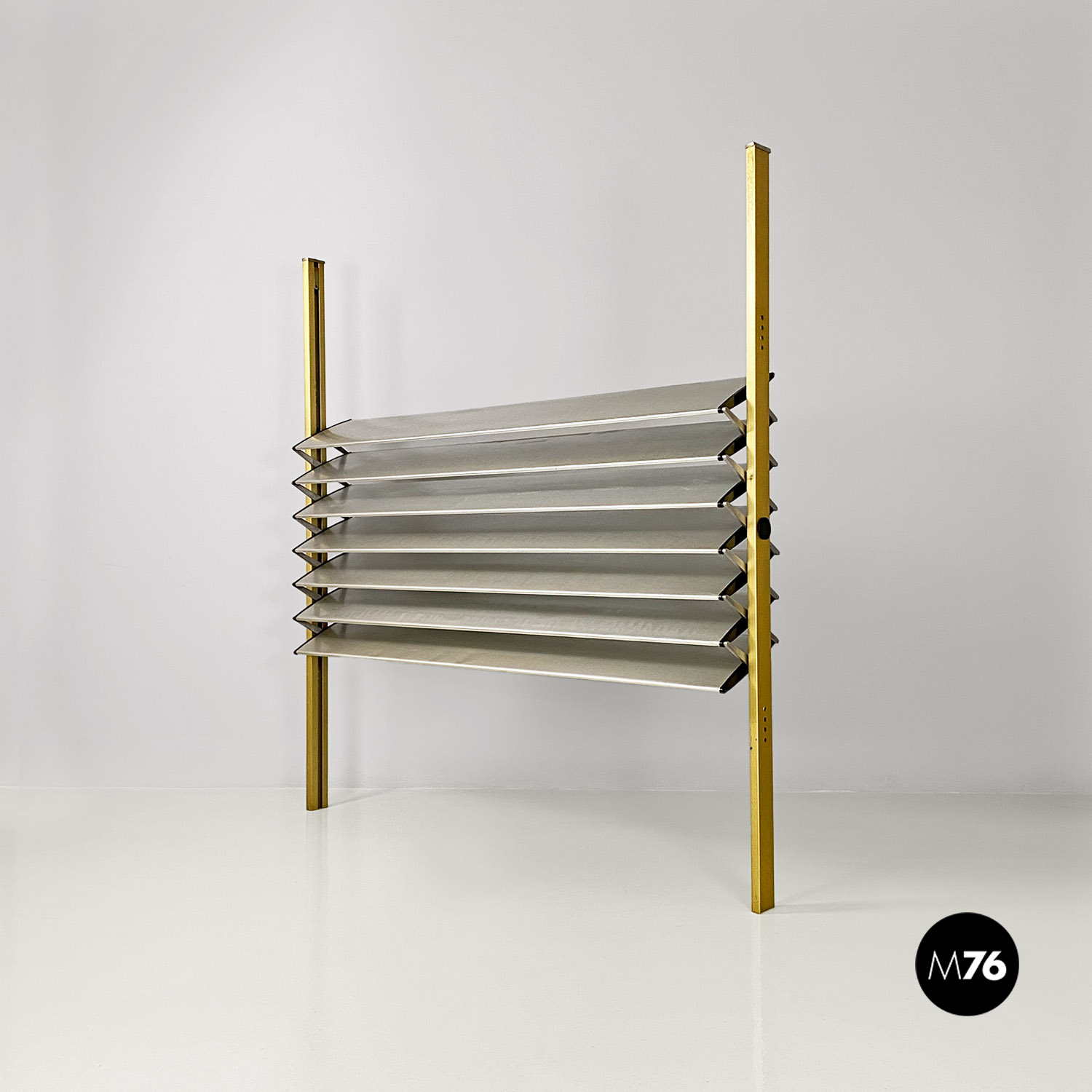 La struttura è composta da un’intelaiatura in alluminio con finitura dorata che sostiene sette fasce frangisole, sempre in alluminio, mosse tramite un ingranaggio a catena posto all’interno dei montanti. Nonostante la sua imponenza formale pesa meno di 30 kg.