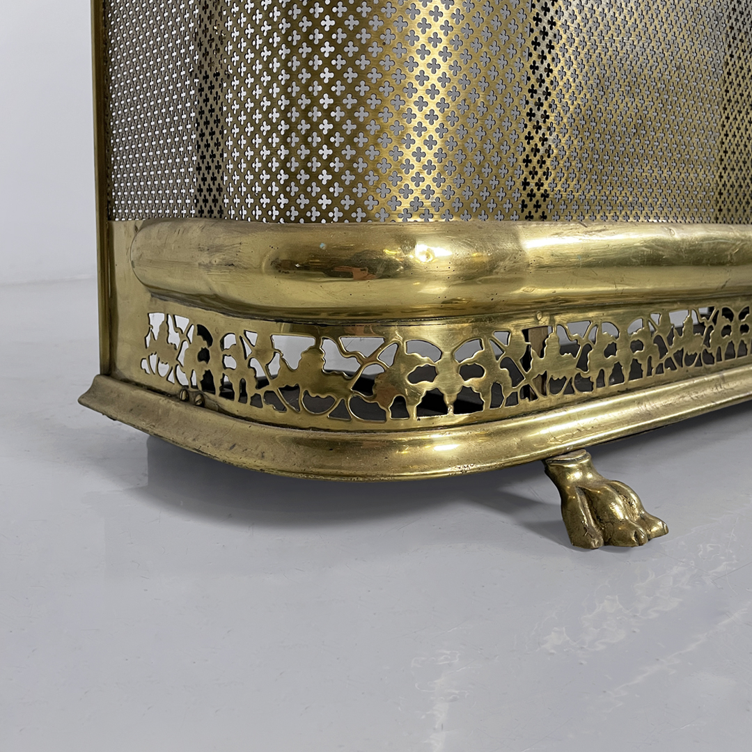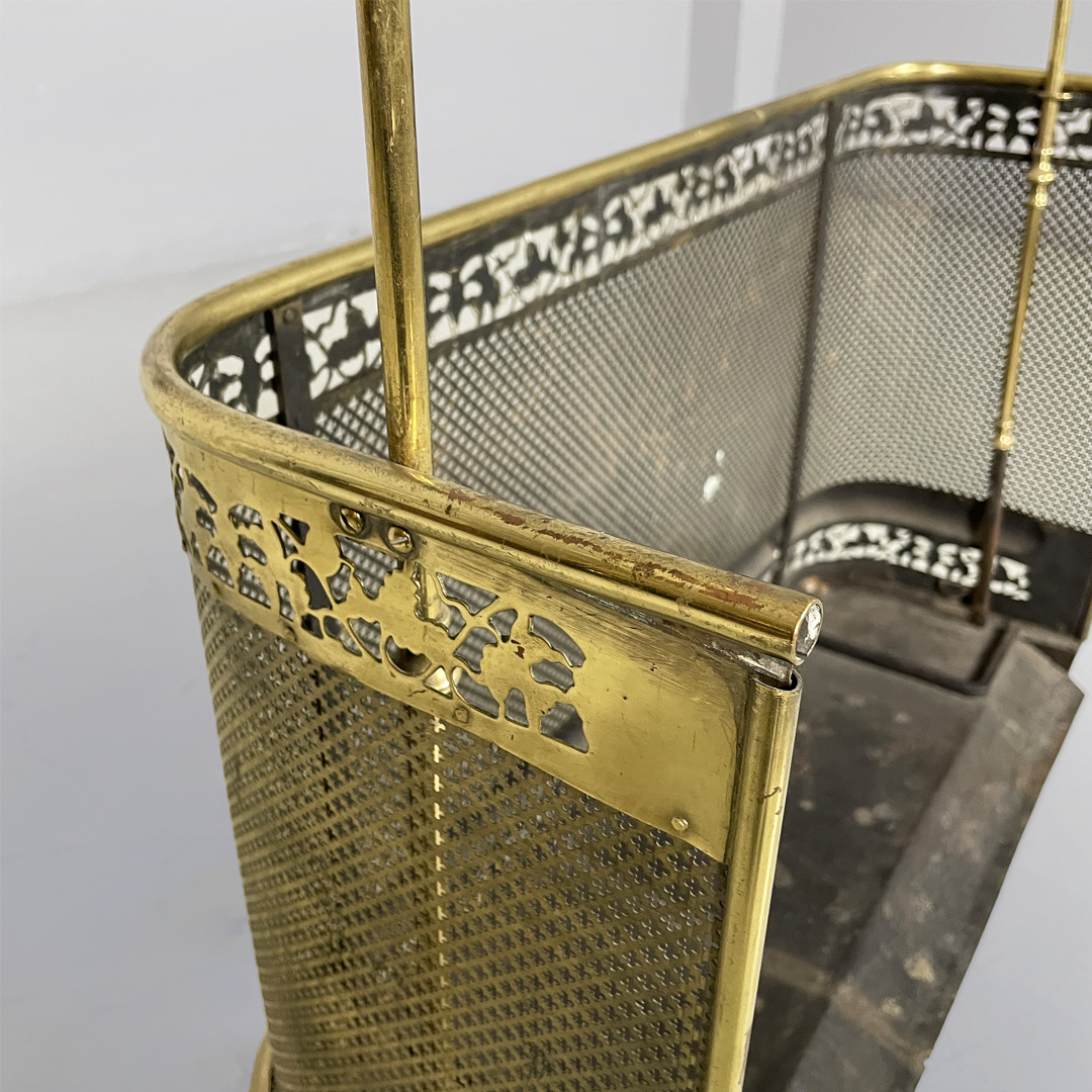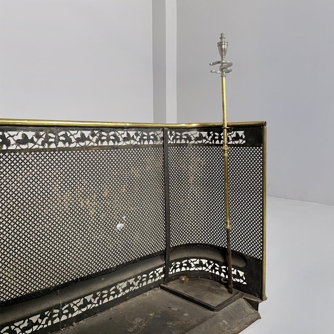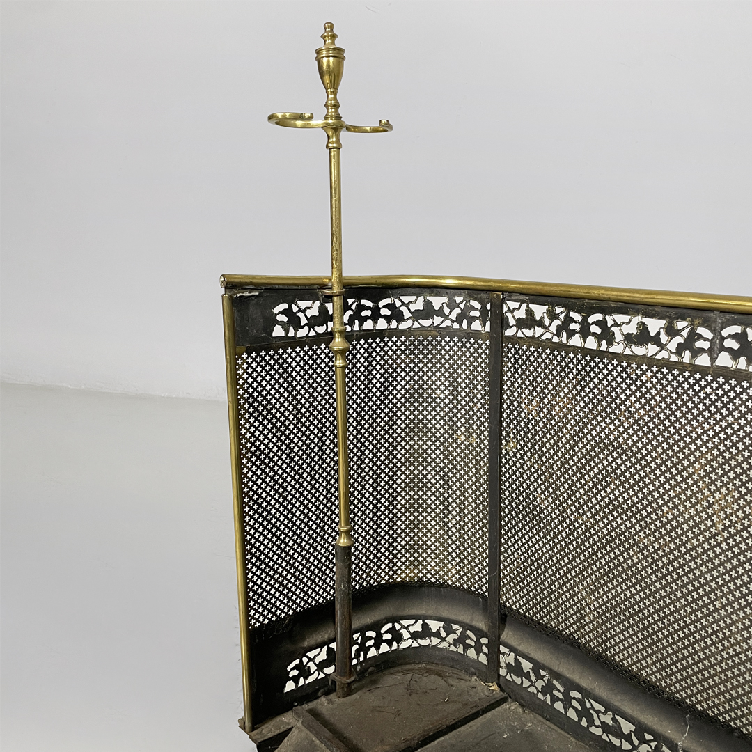 Paracamino con struttura curva, realizzato in ottone con rete traforata metallica. La cornice superiore e inferiore è arricchita da decori traforati a motivo floreale e fogliato. E’ dotato, ai lati, di due aste verticali accessorie. In stile 1800.