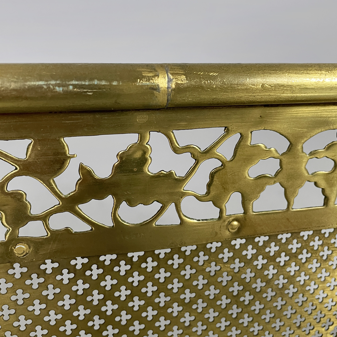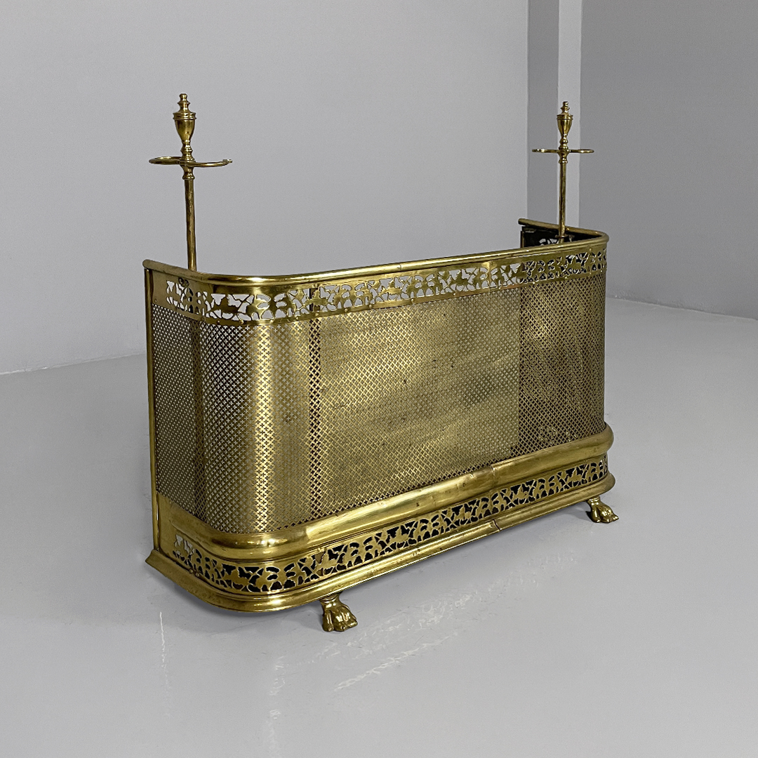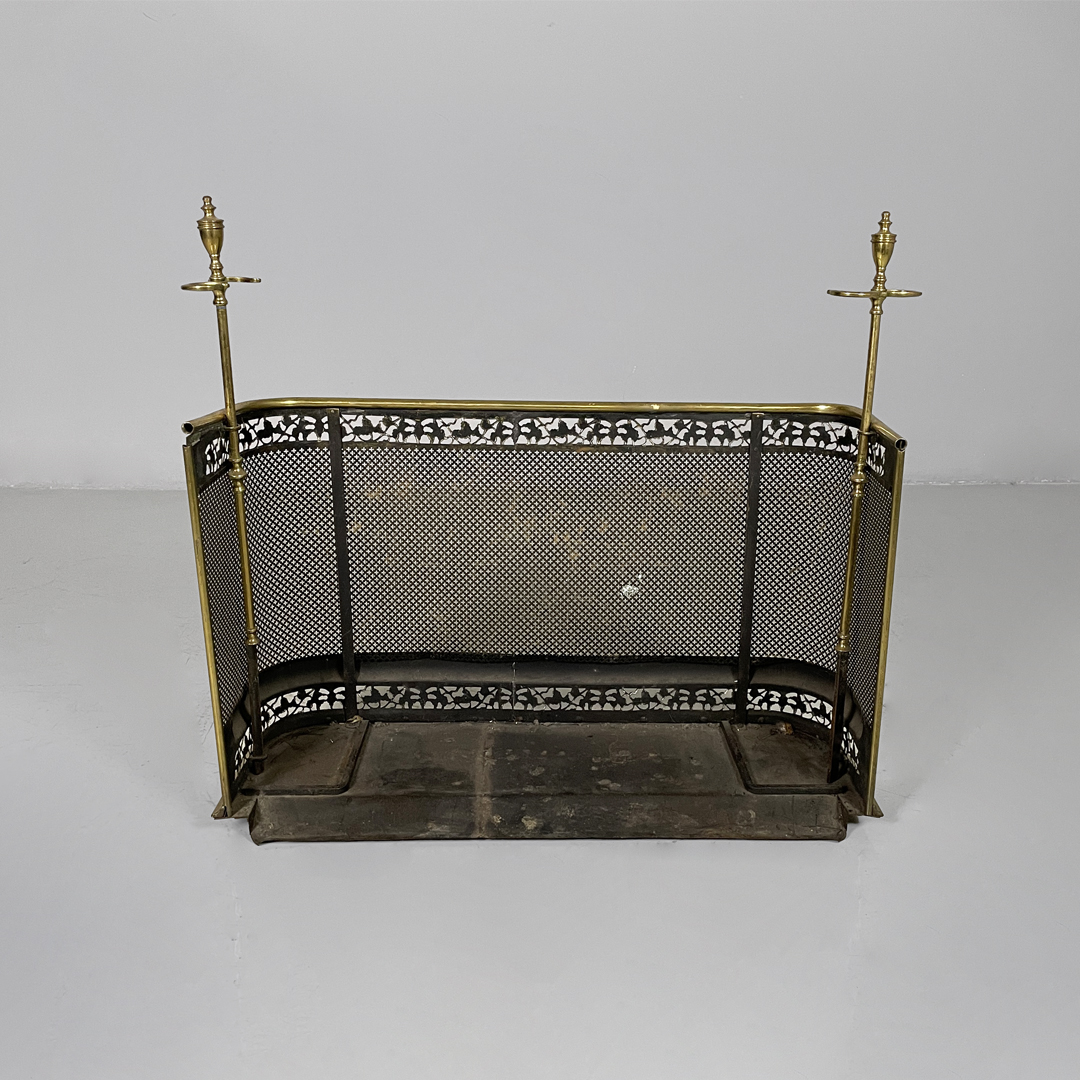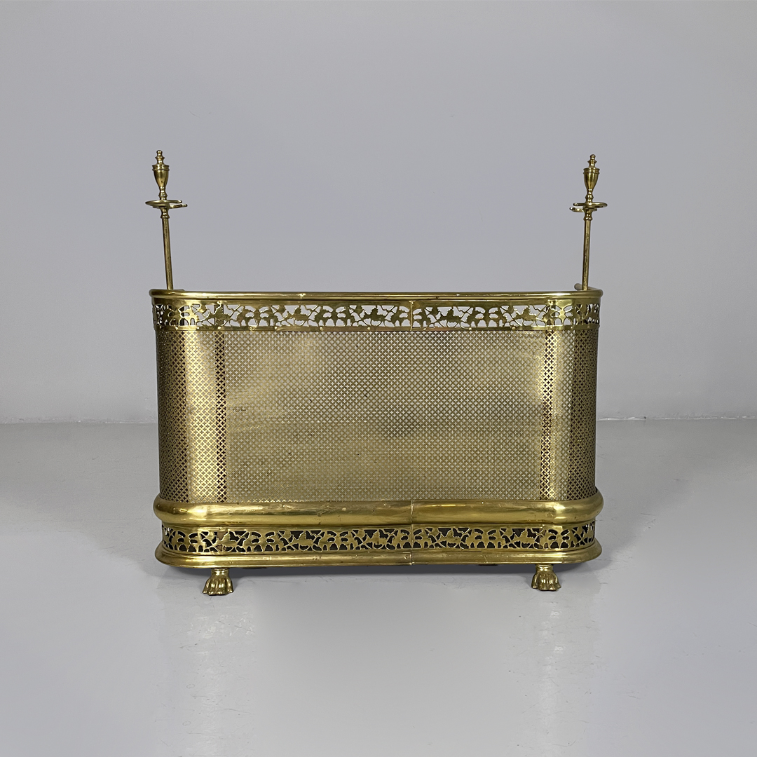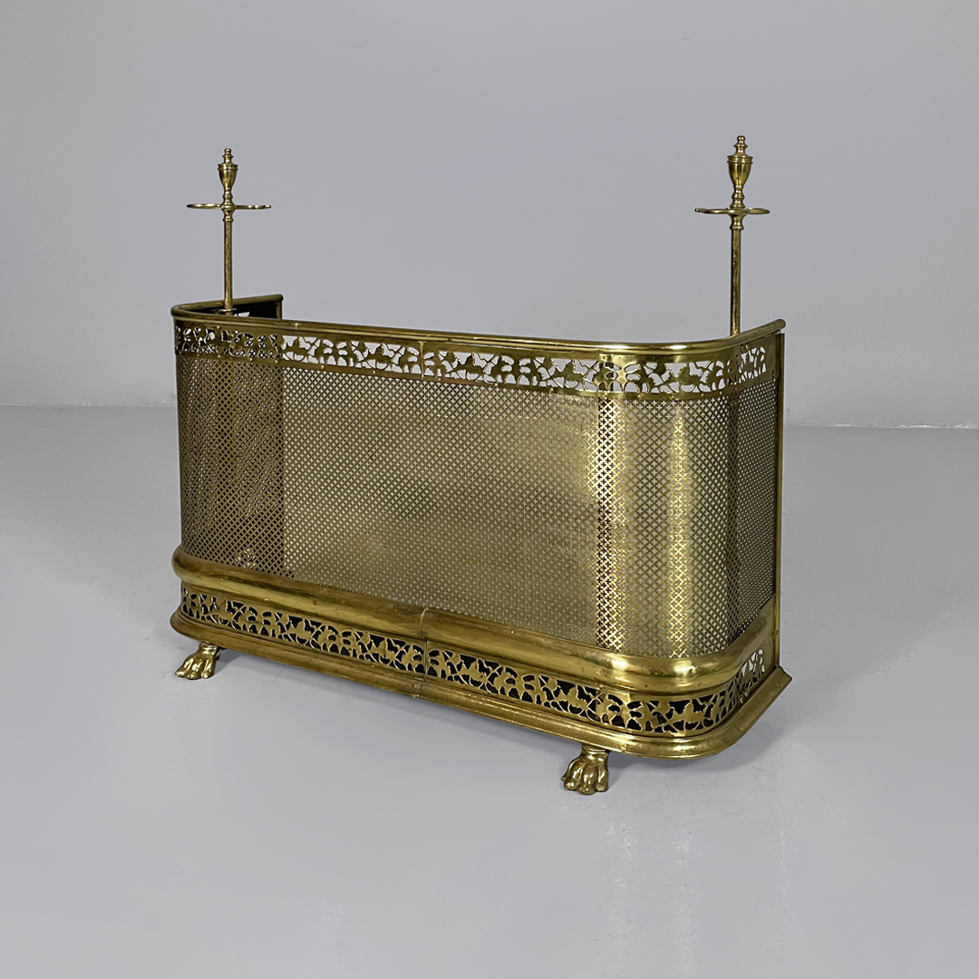 Paracamino con struttura curva, realizzato in ottone con rete traforata metallica. La cornice superiore e inferiore è arricchita da decori traforati a motivo floreale e fogliato. E’ dotato, ai lati, di due aste verticali accessorie. In stile 1800.