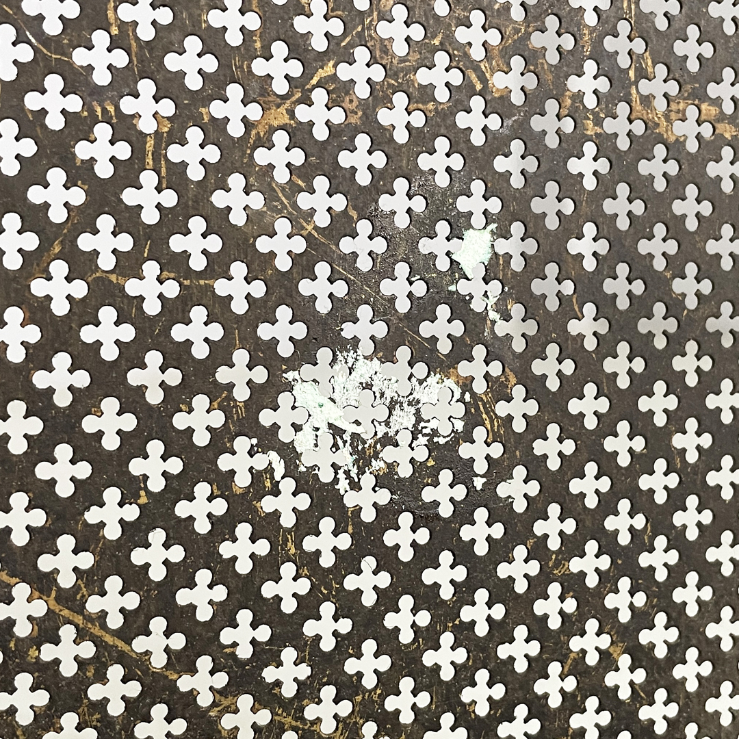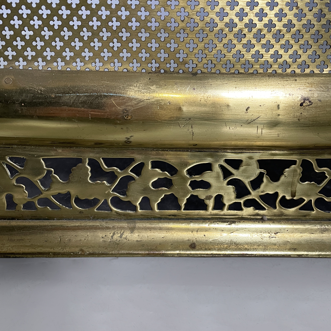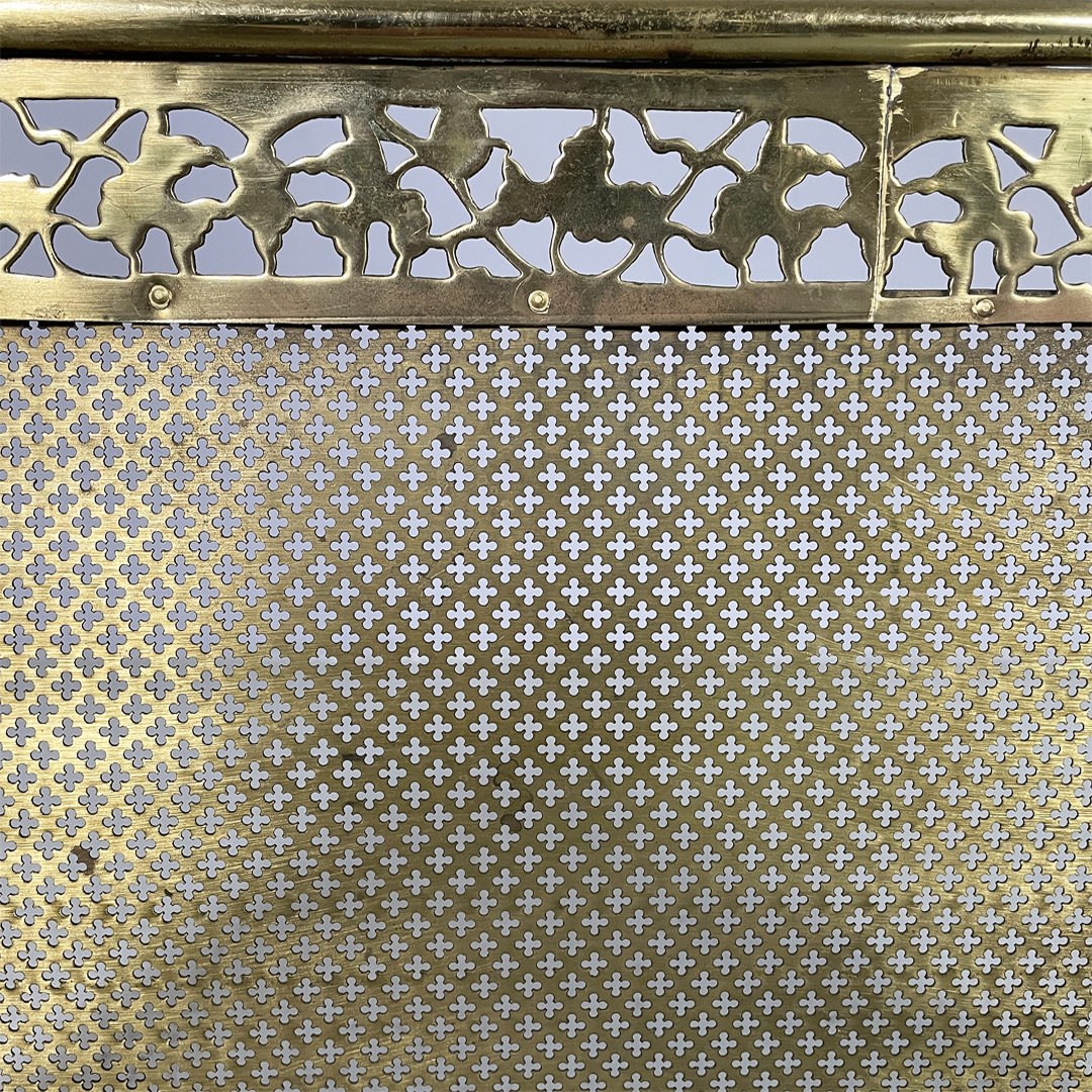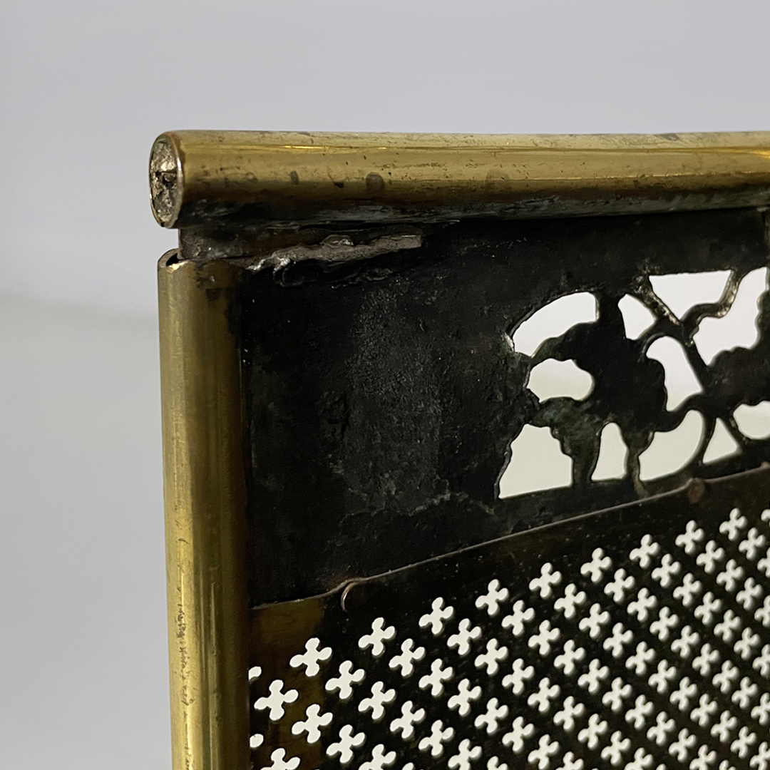 Paracamino con struttura curva, realizzato in ottone con rete traforata metallica. La cornice superiore e inferiore è arricchita da decori traforati a motivo floreale e fogliato. E’ dotato, ai lati, di due aste verticali accessorie. In stile 1800.