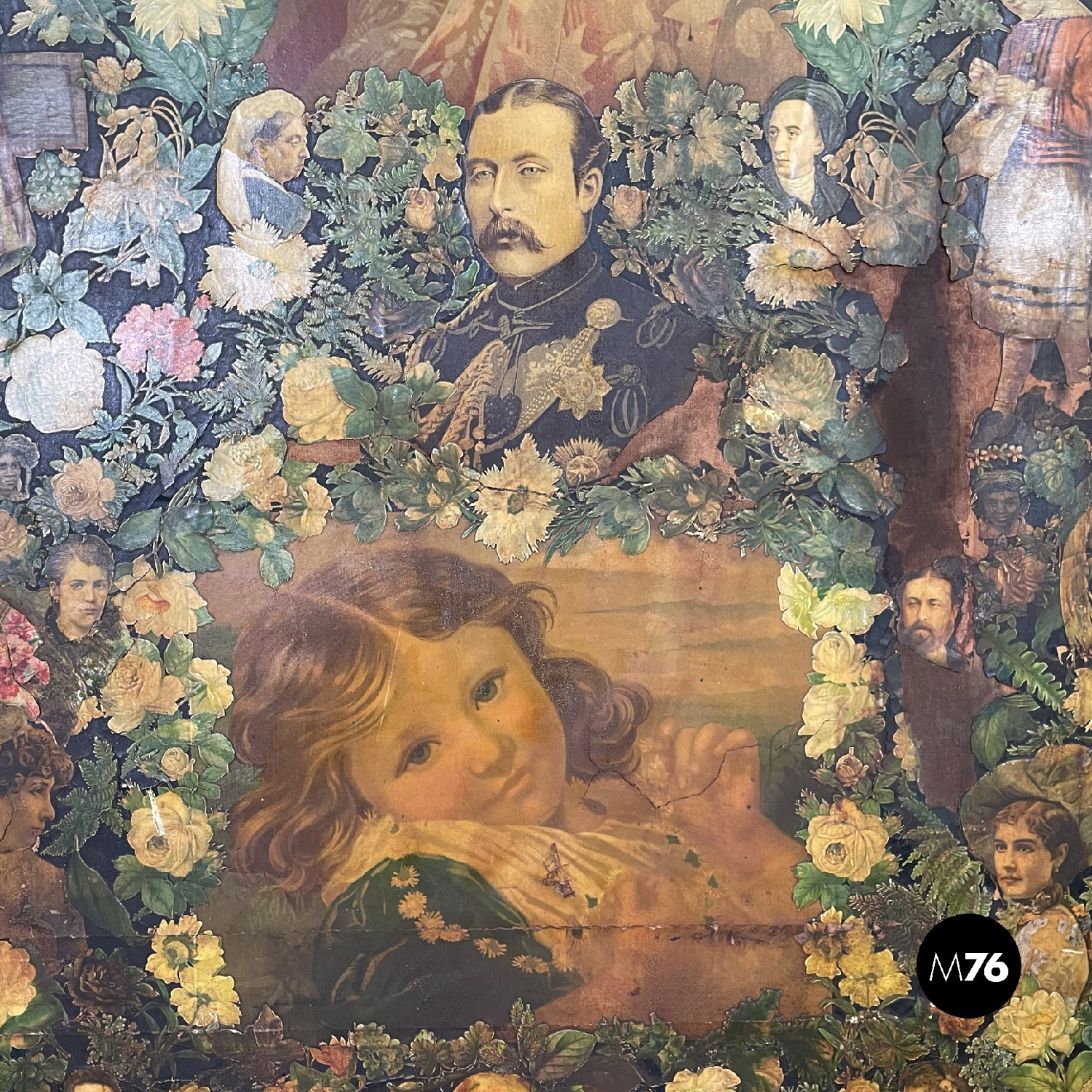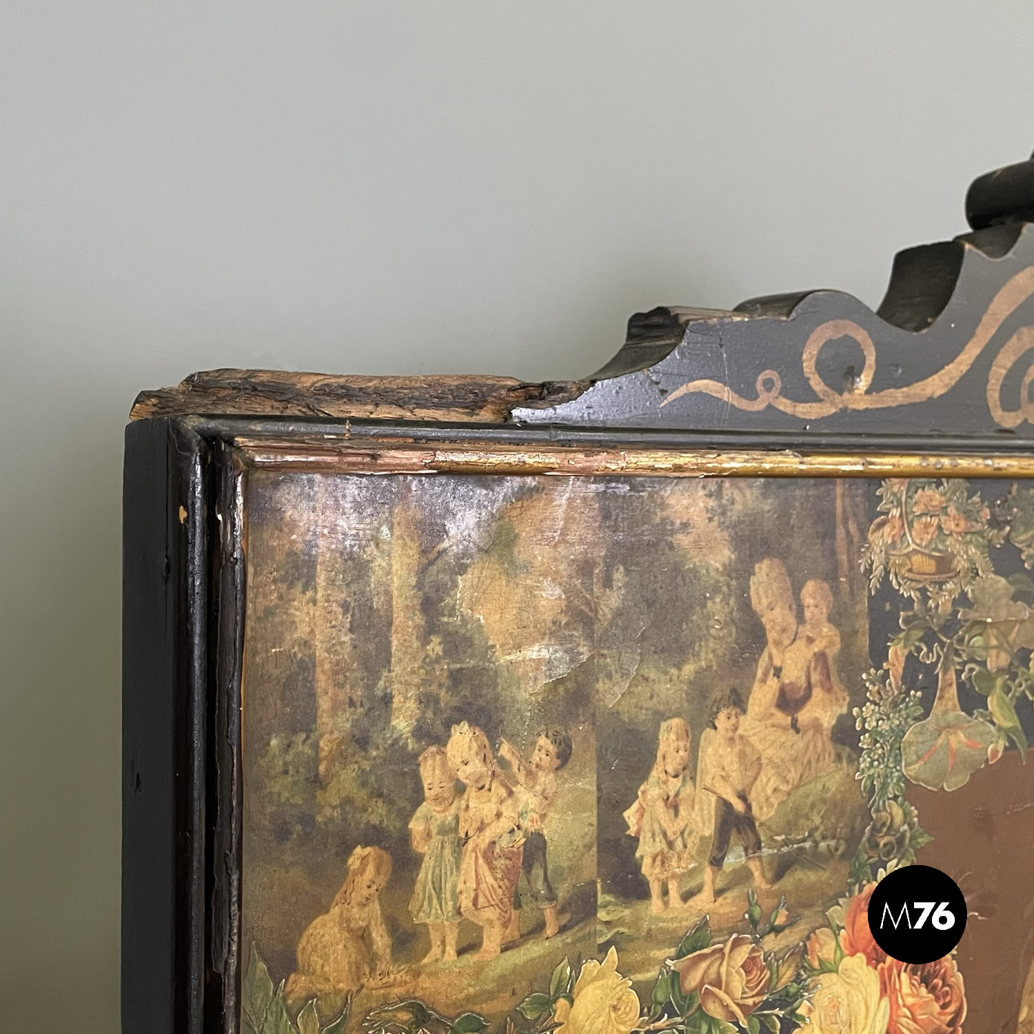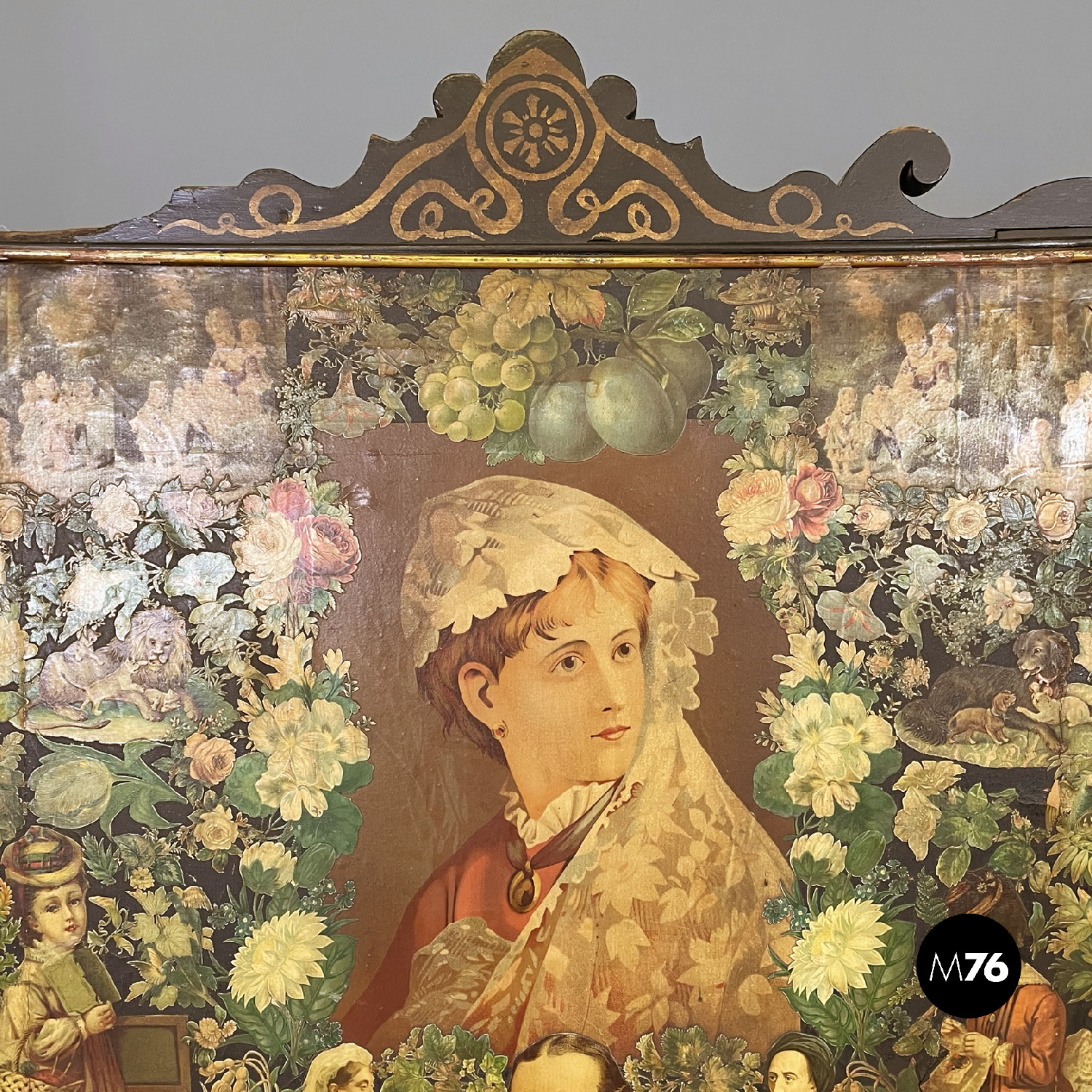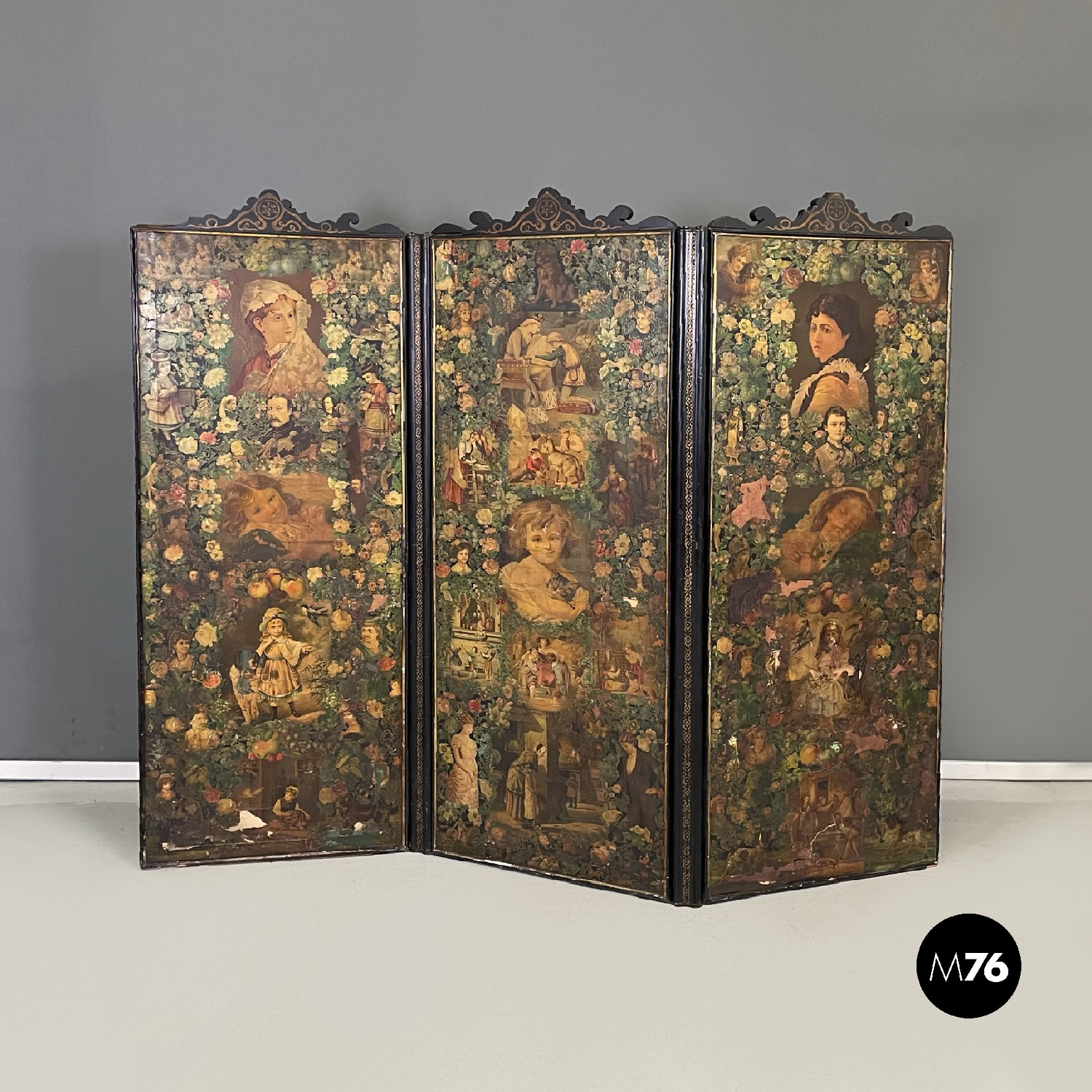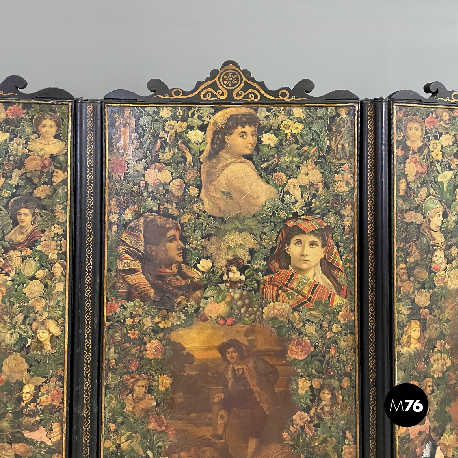 Paravento a tre ante con struttura in legno e interamente decorato con la tecnica del collage. Su ogni lato sono presenti motivi floreali che incorniciano mezzi busti e figurini di persone nobili o reali di diverse nazioni e epoche. Utilizzabile come divisorio nelle stanze.