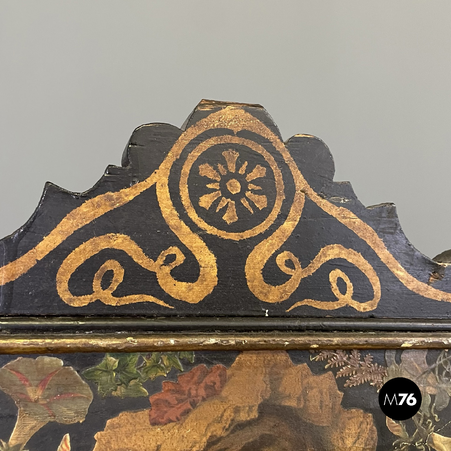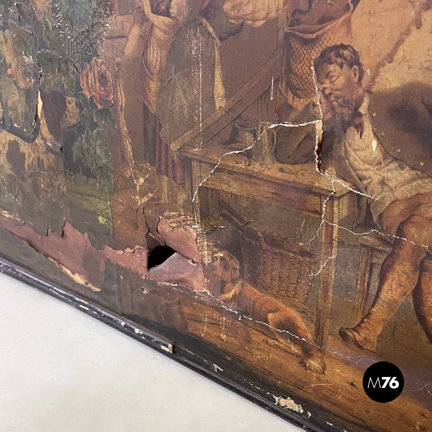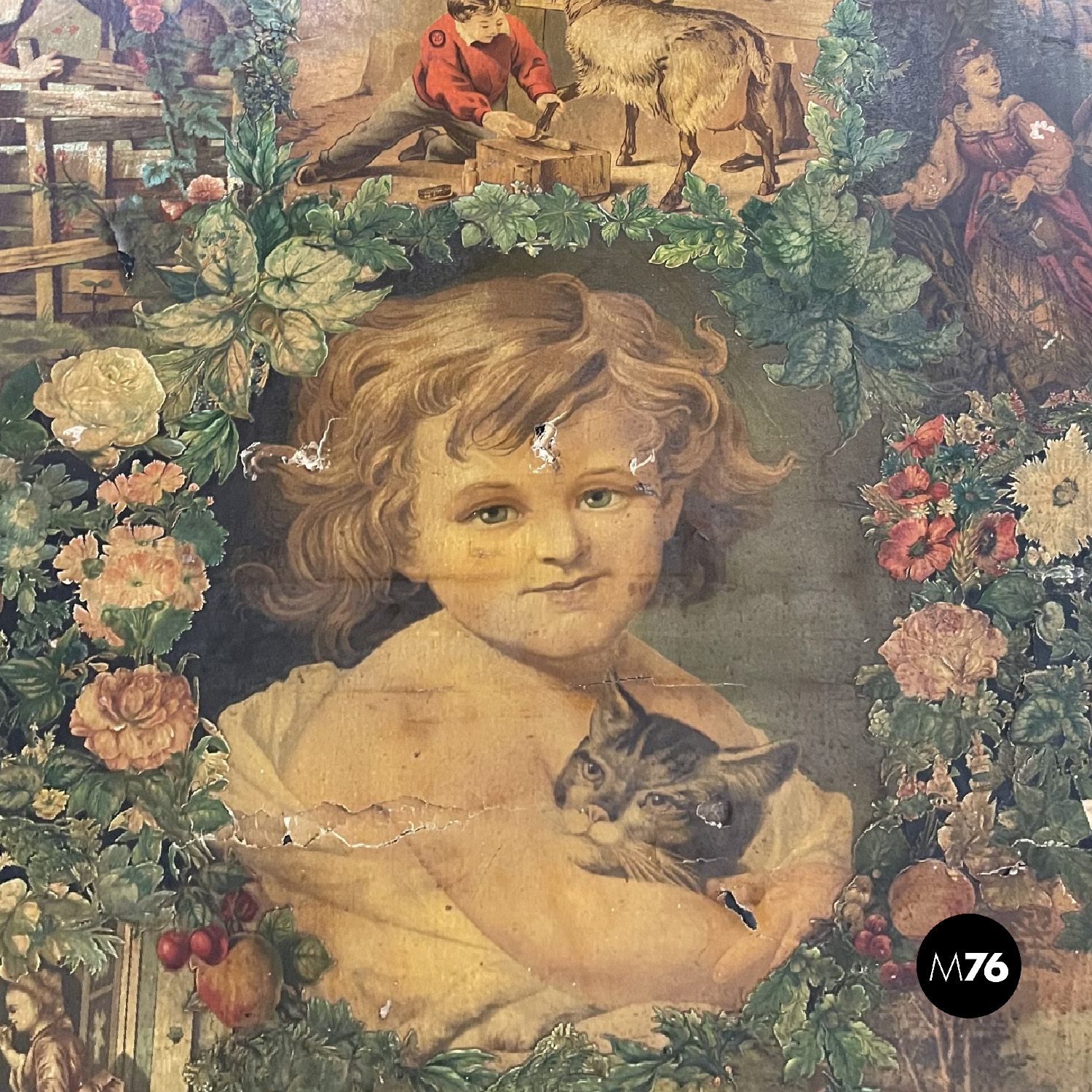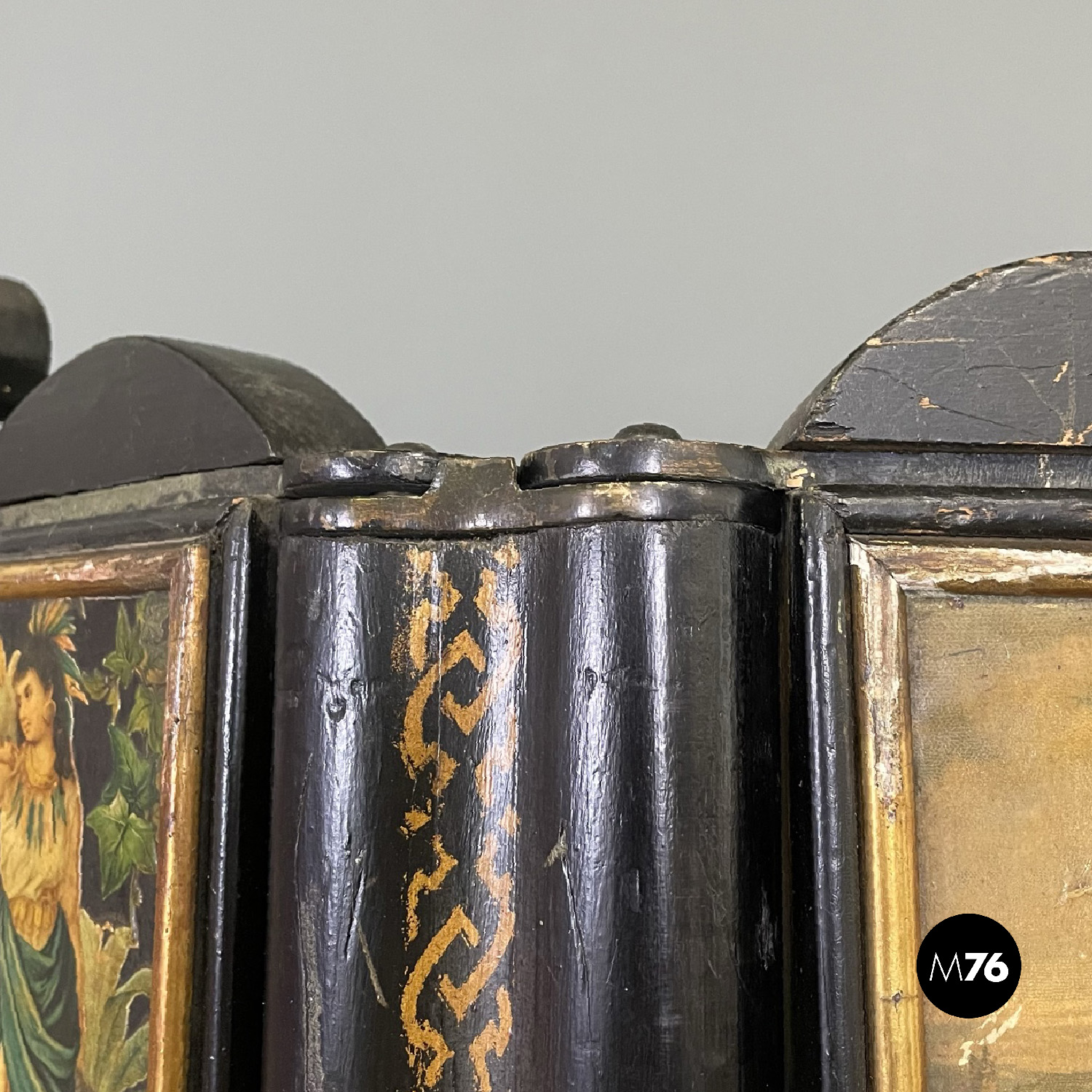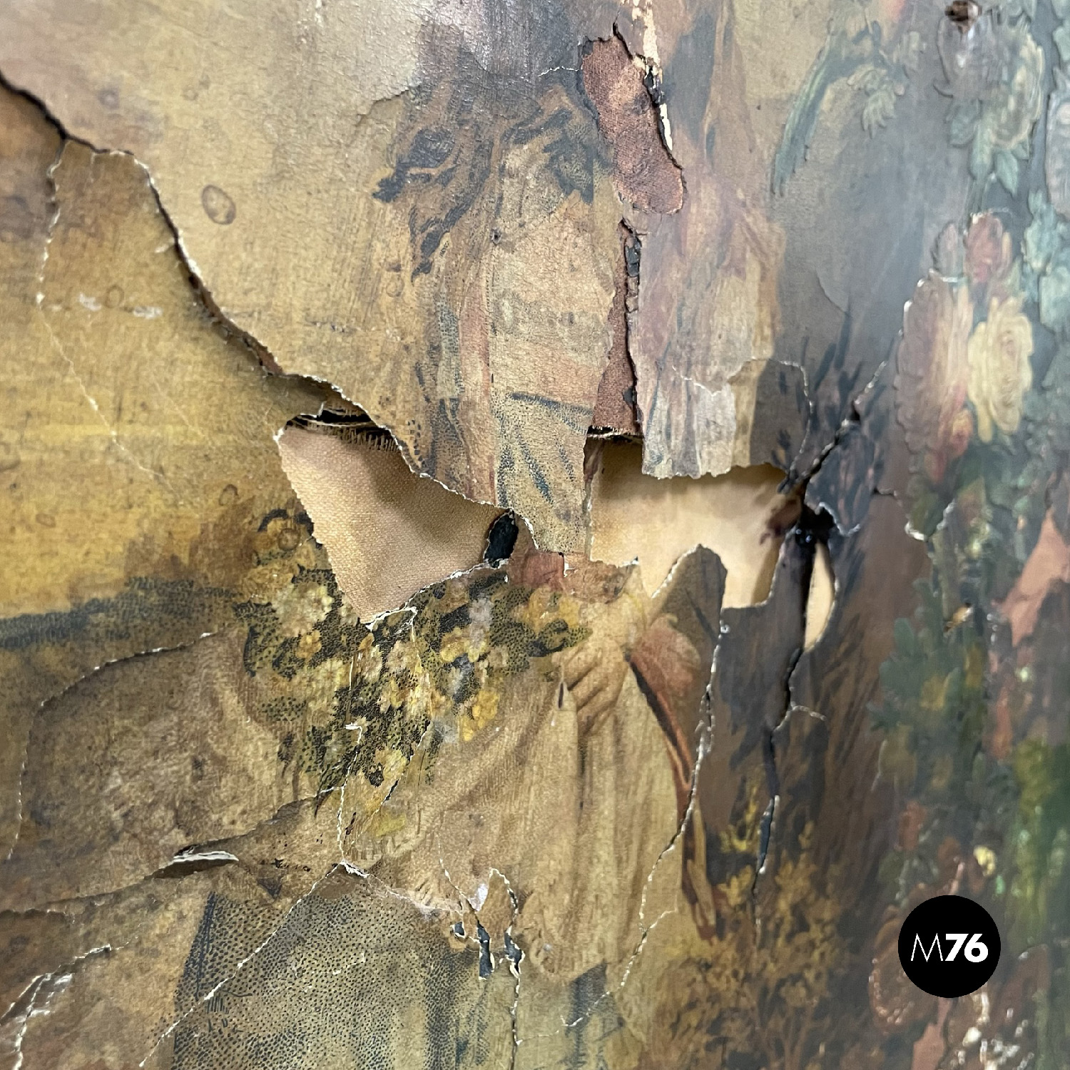 Paravento a tre ante con struttura in legno e interamente decorato con la tecnica del collage. Su ogni lato sono presenti motivi floreali che incorniciano mezzi busti e figurini di persone nobili o reali di diverse nazioni e epoche. Utilizzabile come divisorio nelle stanze.