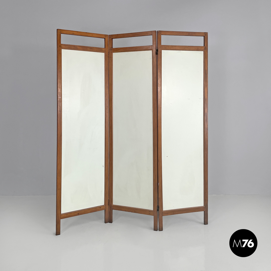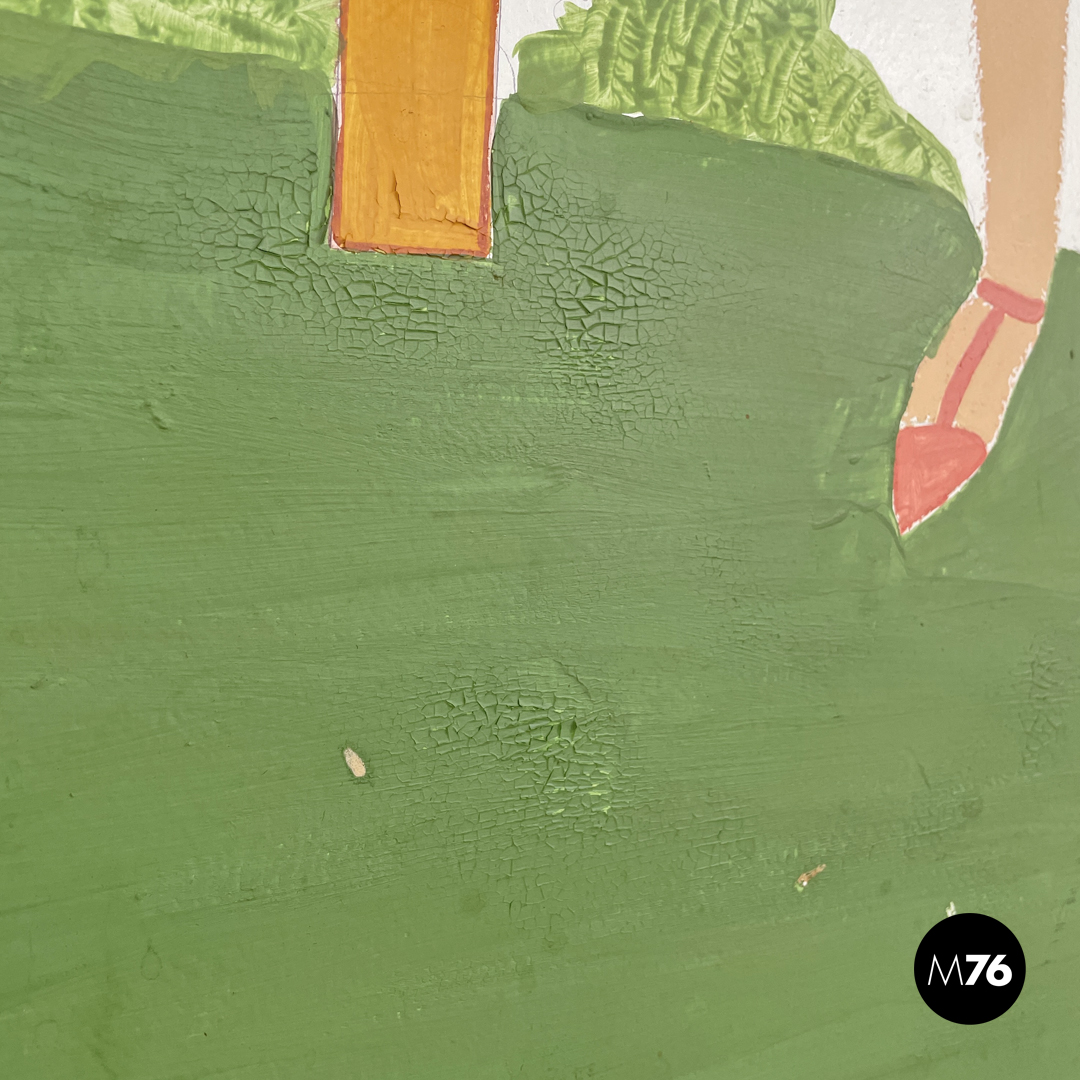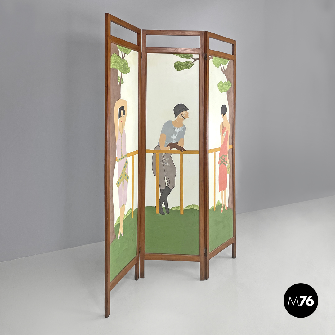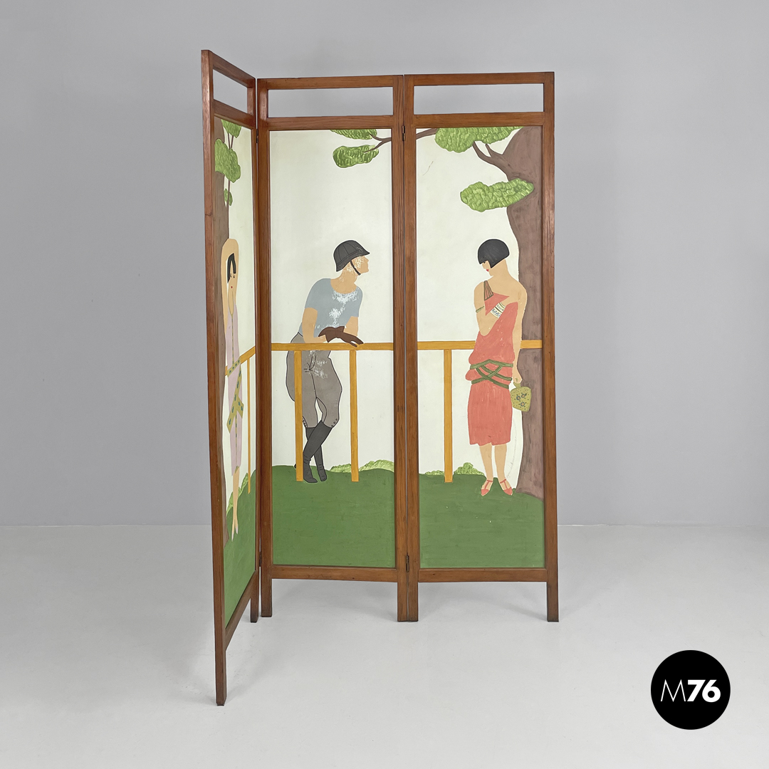 Paravento pieghevole con struttura in legno, composto da tre pannelli orientabili a piacimento. Il separè ha una struttura a sezione rettangolare, i tre pannelli dipinti presentano due figure femminili e una centrale maschile, che sono intorno ad uno steccato in una scena all’aperto. Il retro dei pannelli è bianco.