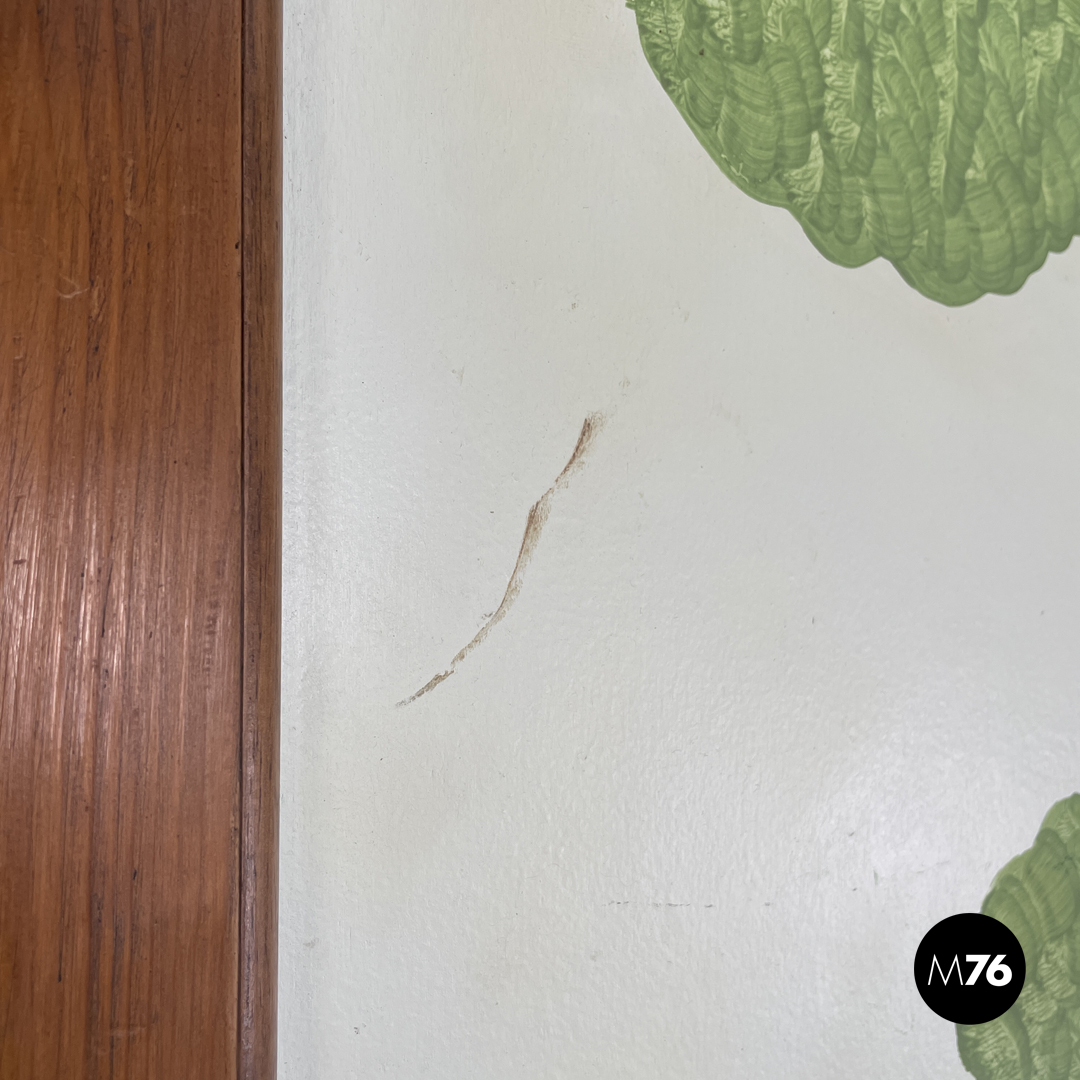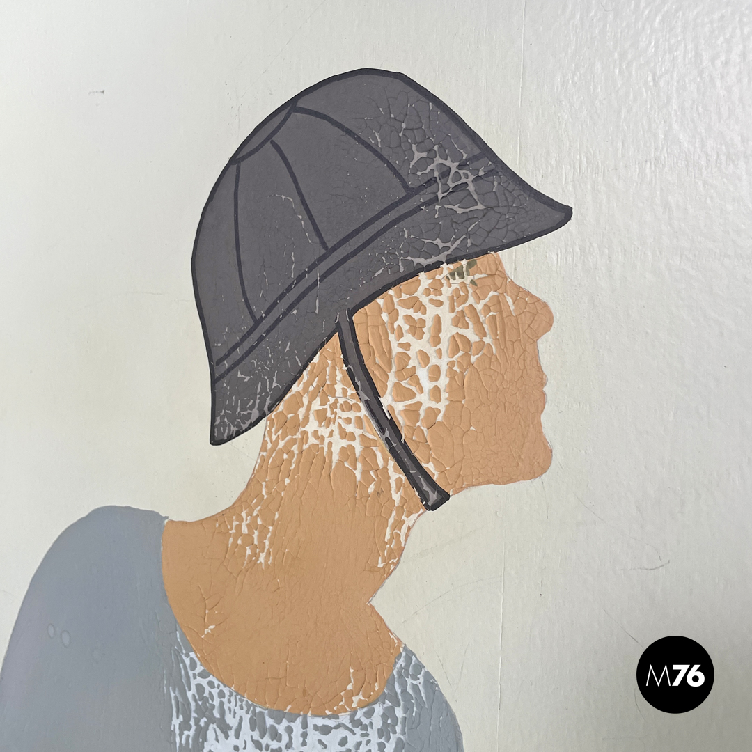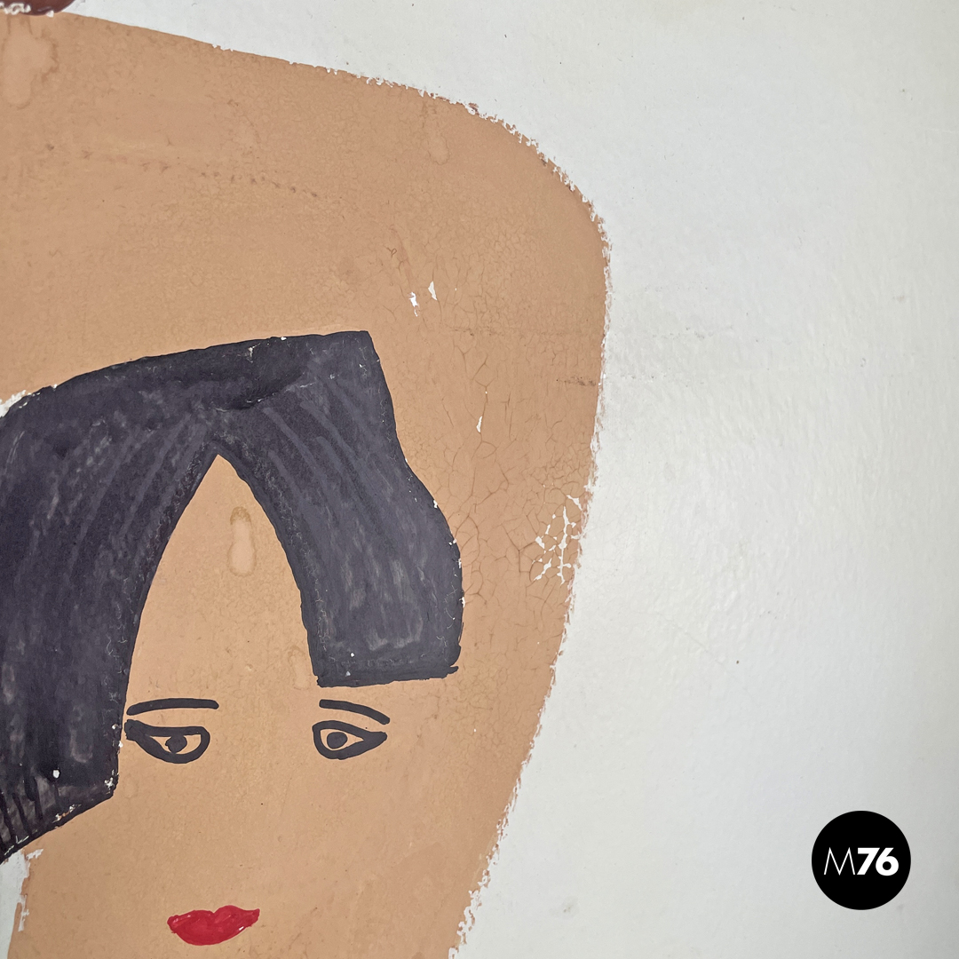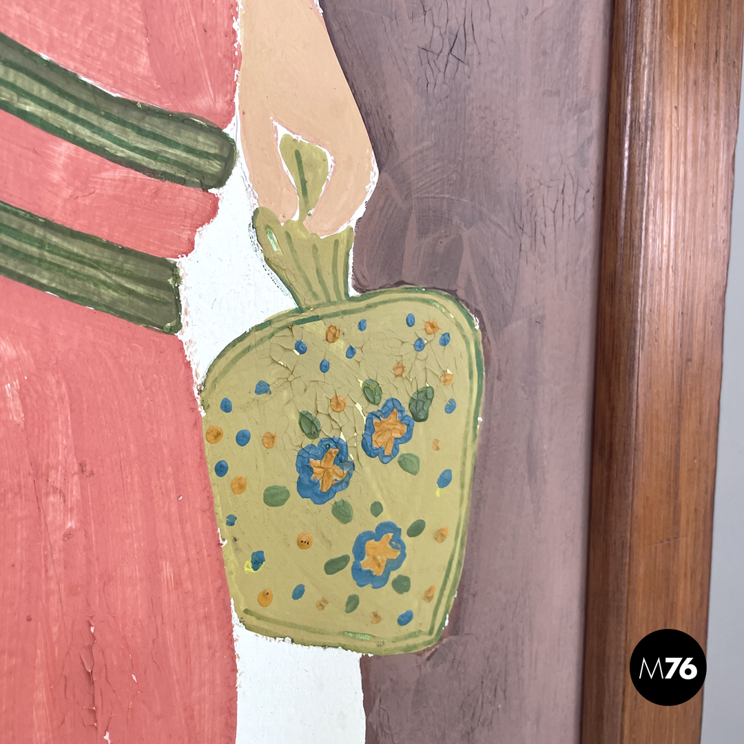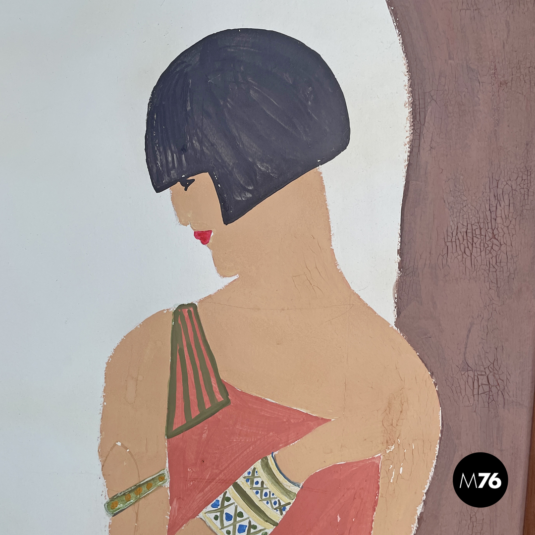 Paravento pieghevole con struttura in legno, composto da tre pannelli orientabili a piacimento. Il separè ha una struttura a sezione rettangolare, i tre pannelli dipinti presentano due figure femminili e una centrale maschile, che sono intorno ad uno steccato in una scena all’aperto. Il retro dei pannelli è bianco.