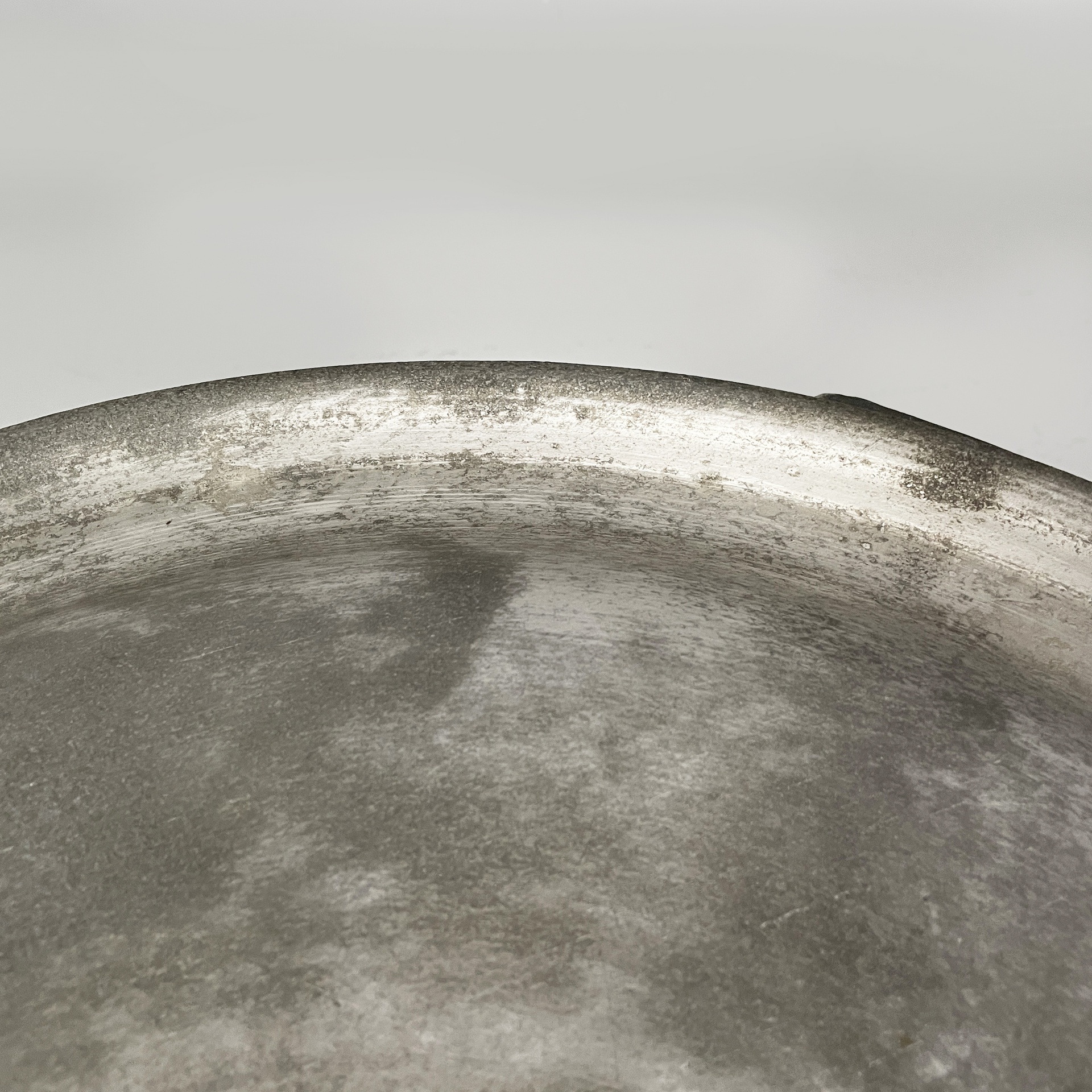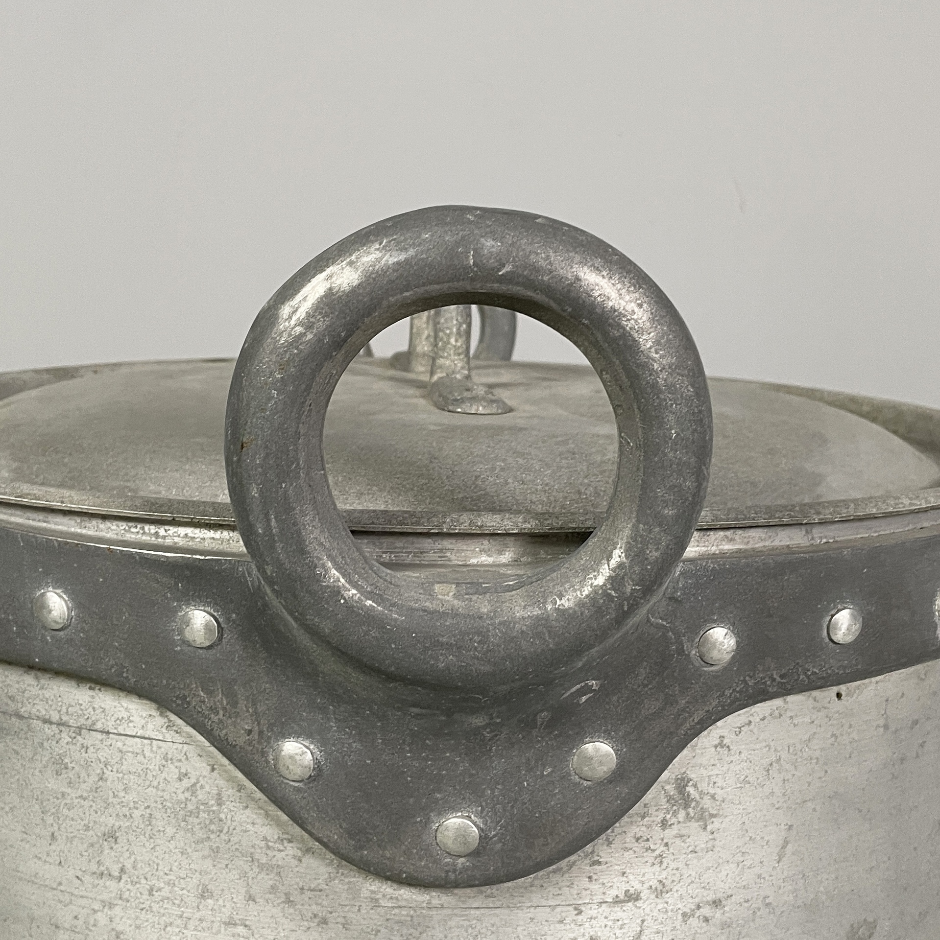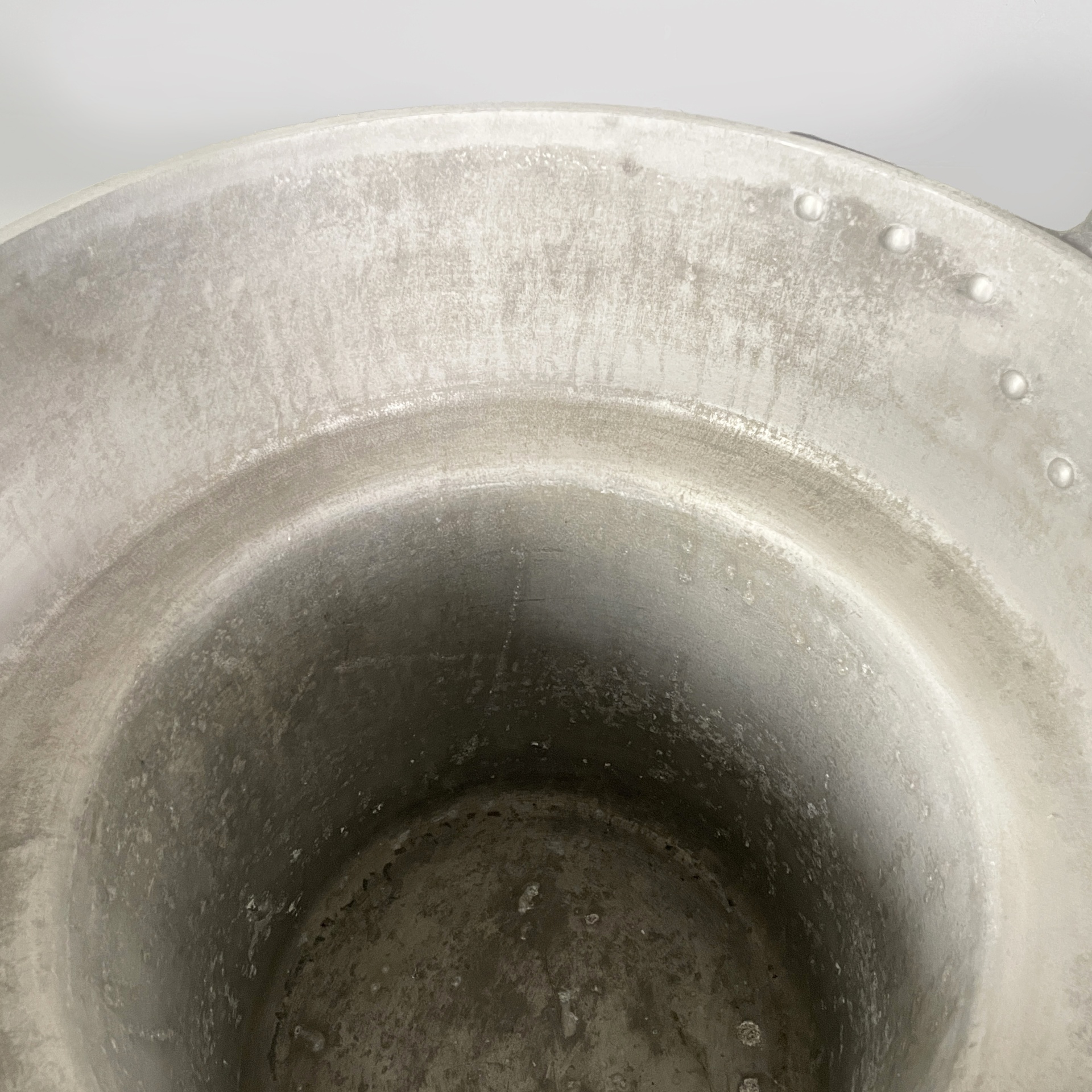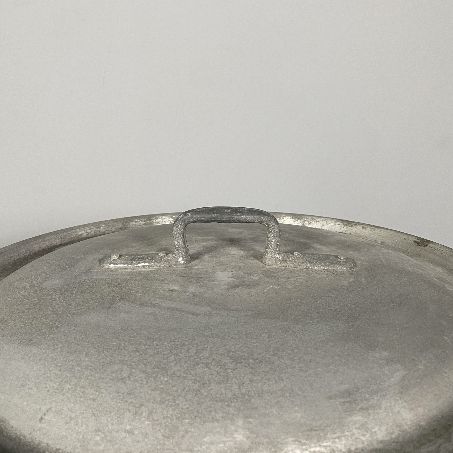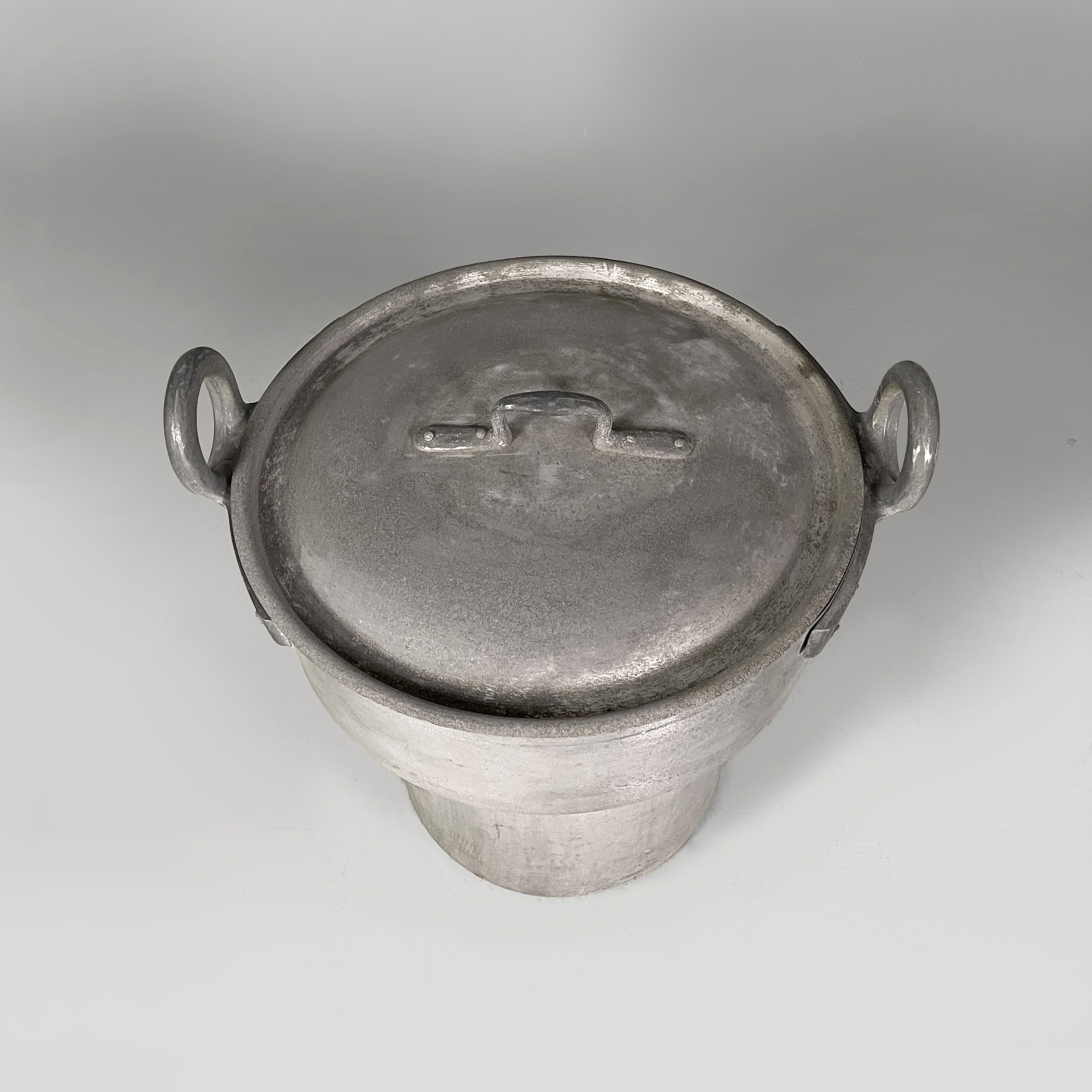 Pentola o cesto con coperchio a base tonda, interamente in alluminio. Sui lati sono presenti due manici tondi.