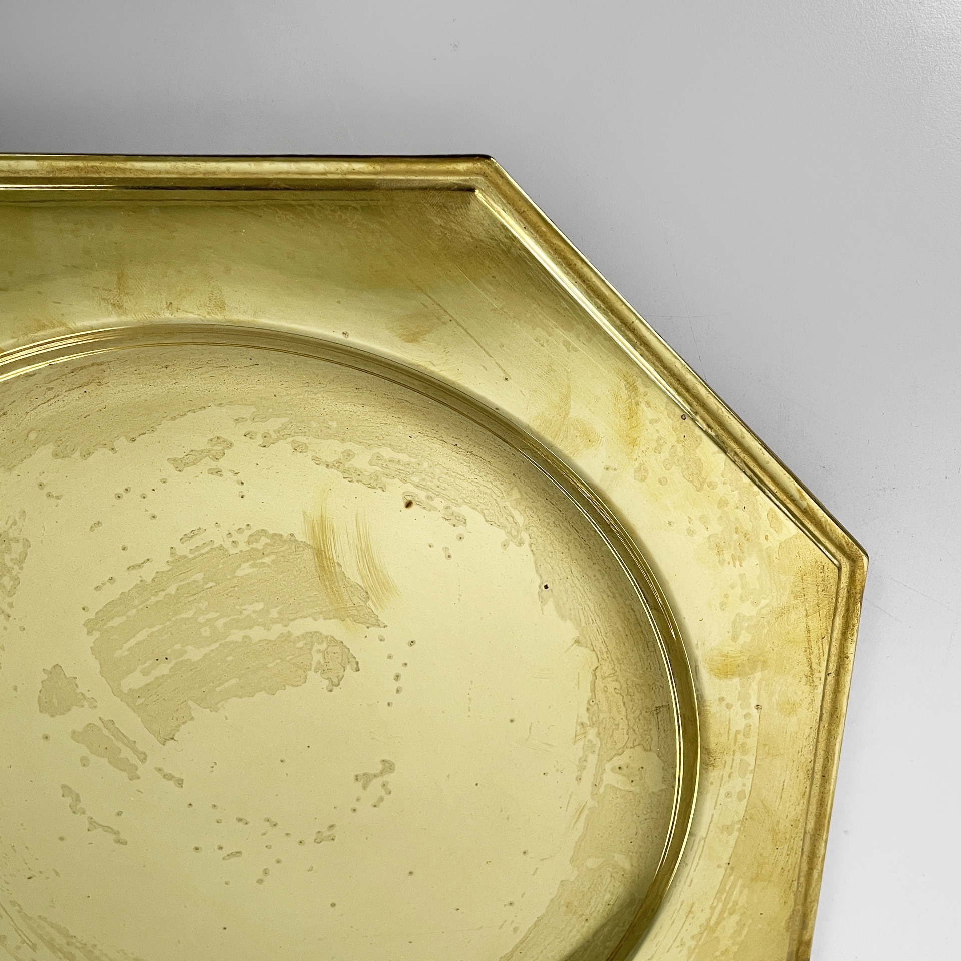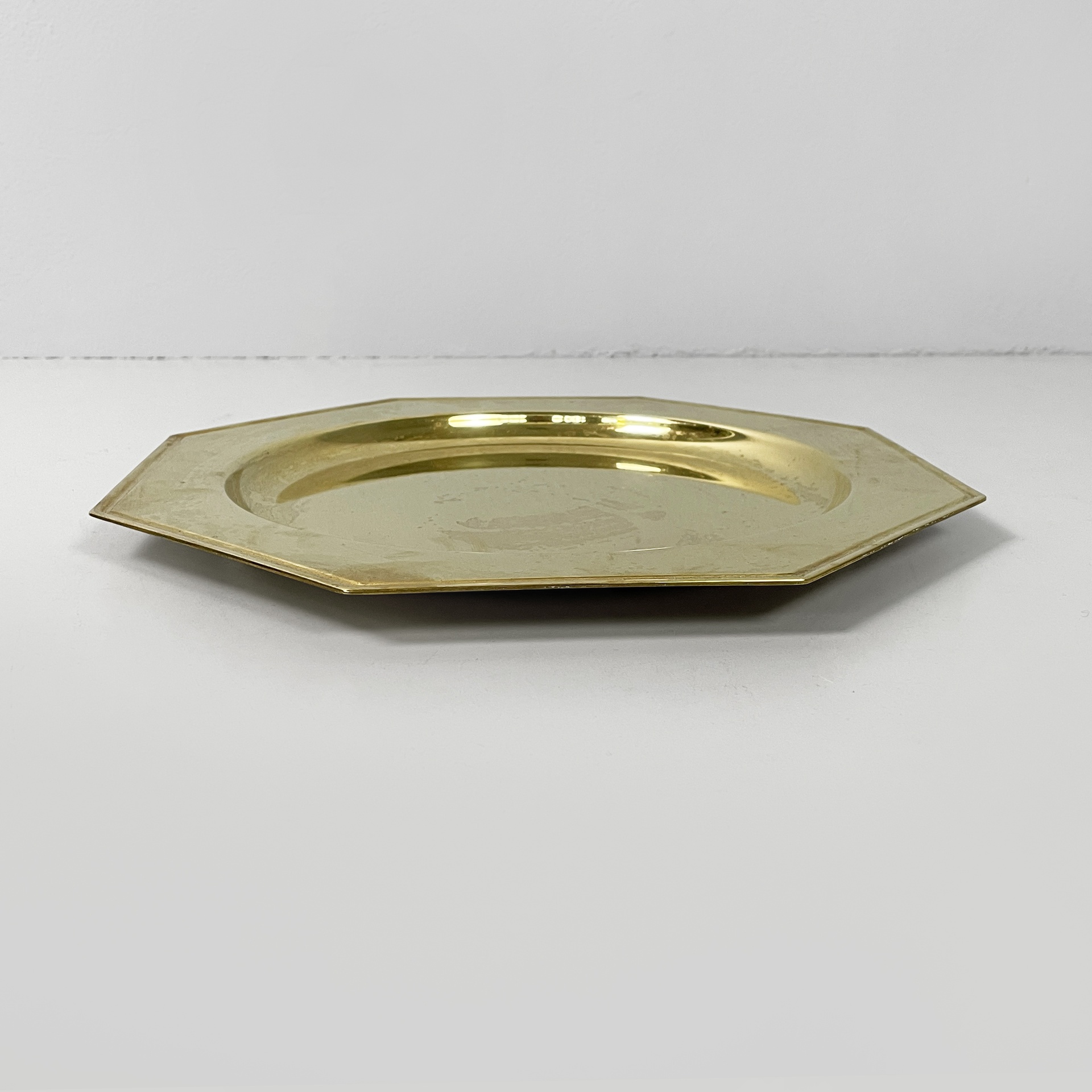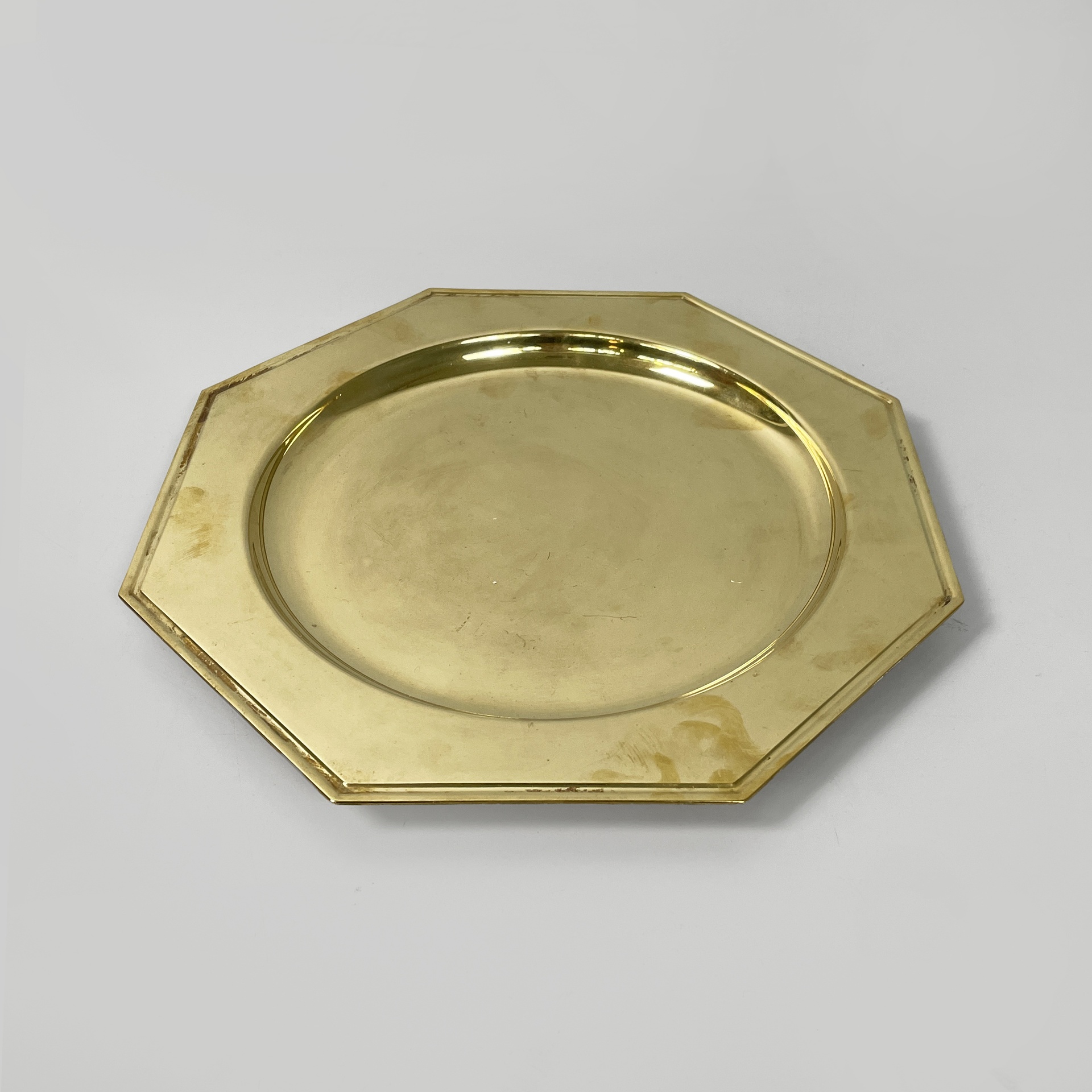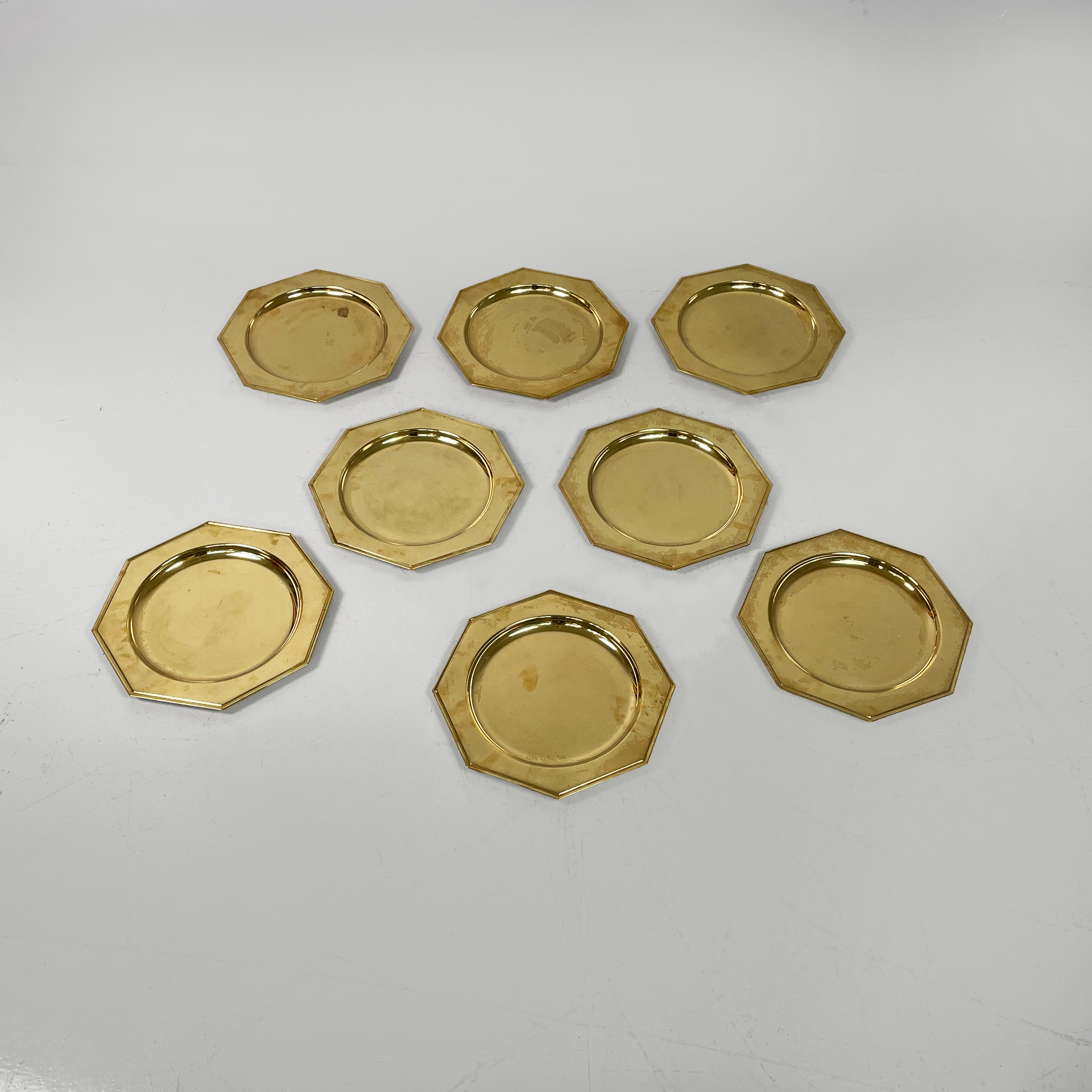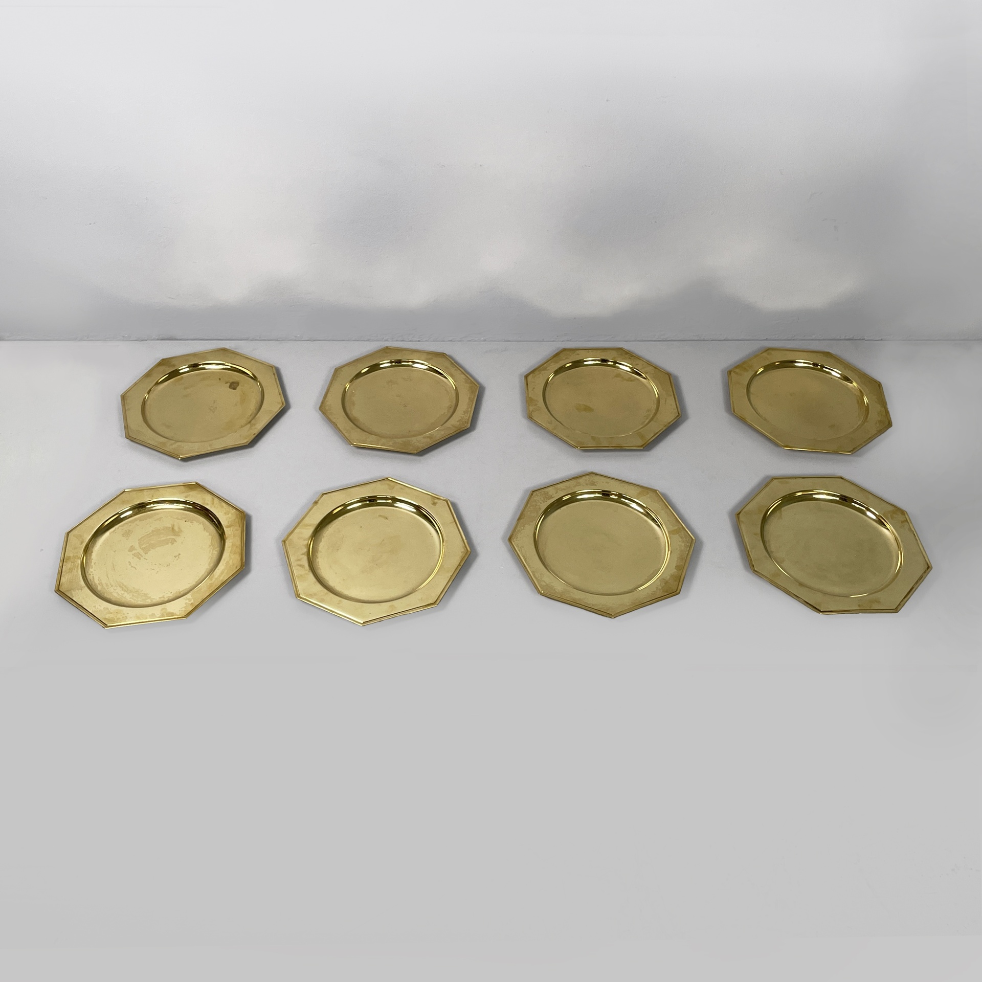 Set di otto piatti di grandi dimensioni a forma esagonale interamente in ottone. La parte centrale di forma tonda per contenere. Utilizzabili come sottopiatti, vassoi o centrotavola.