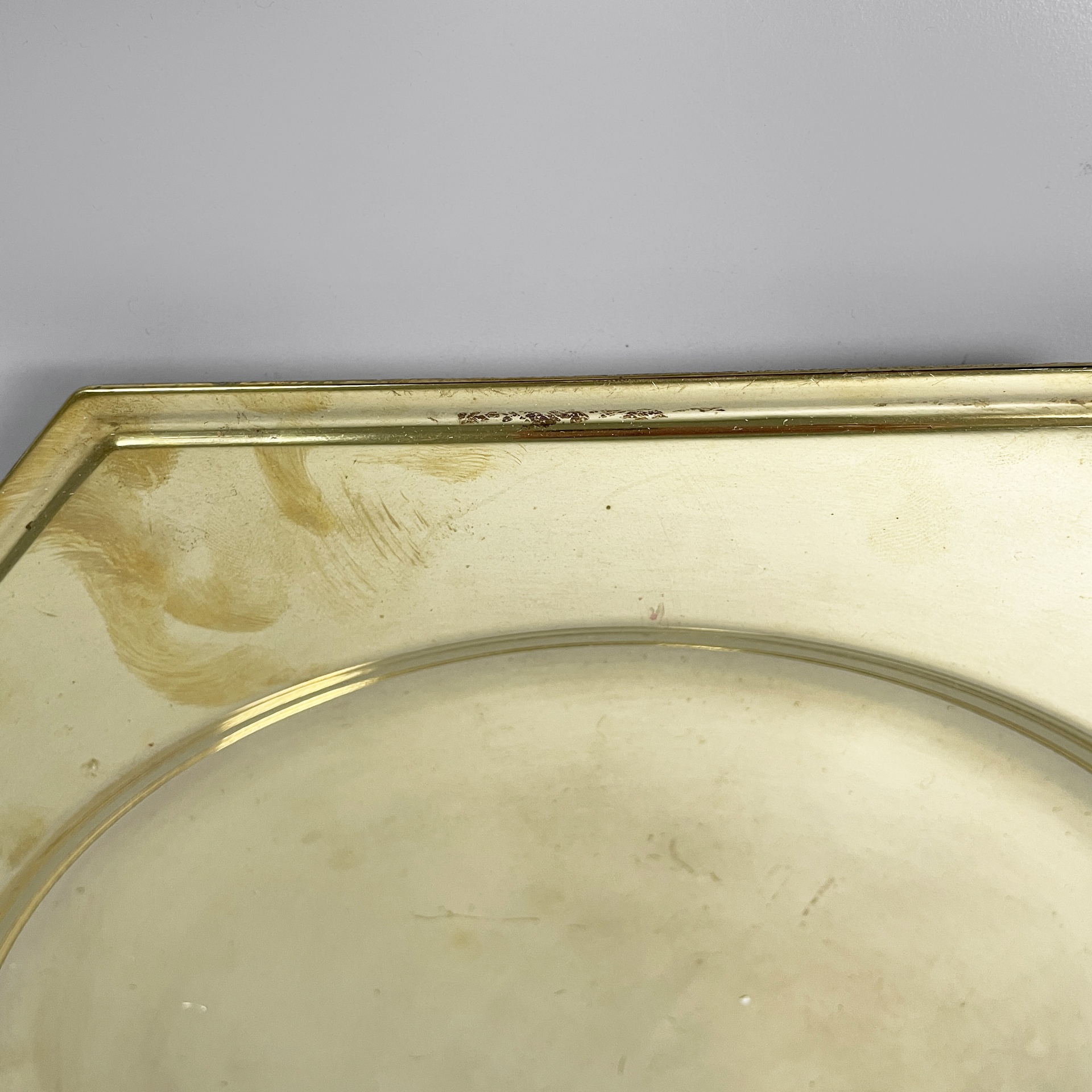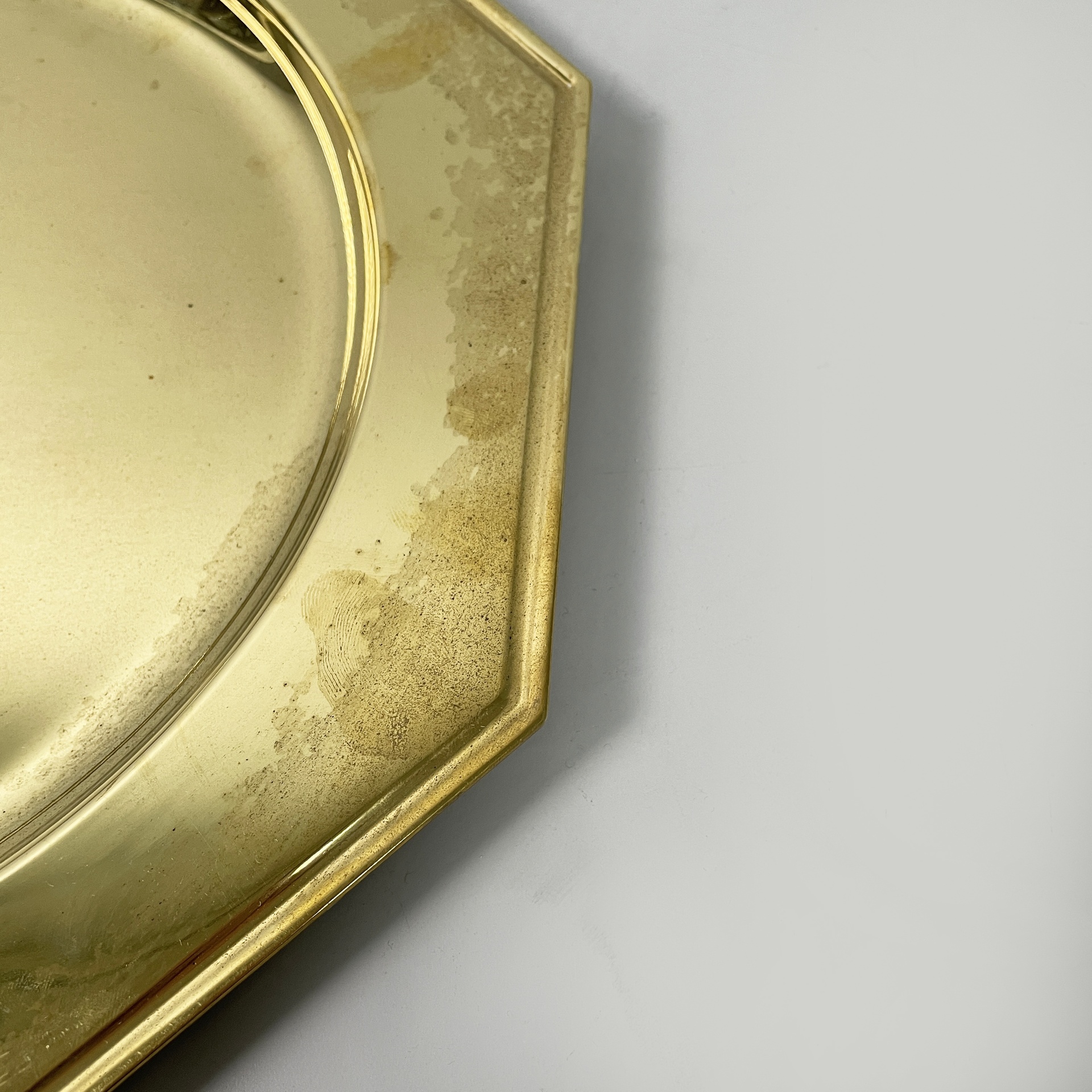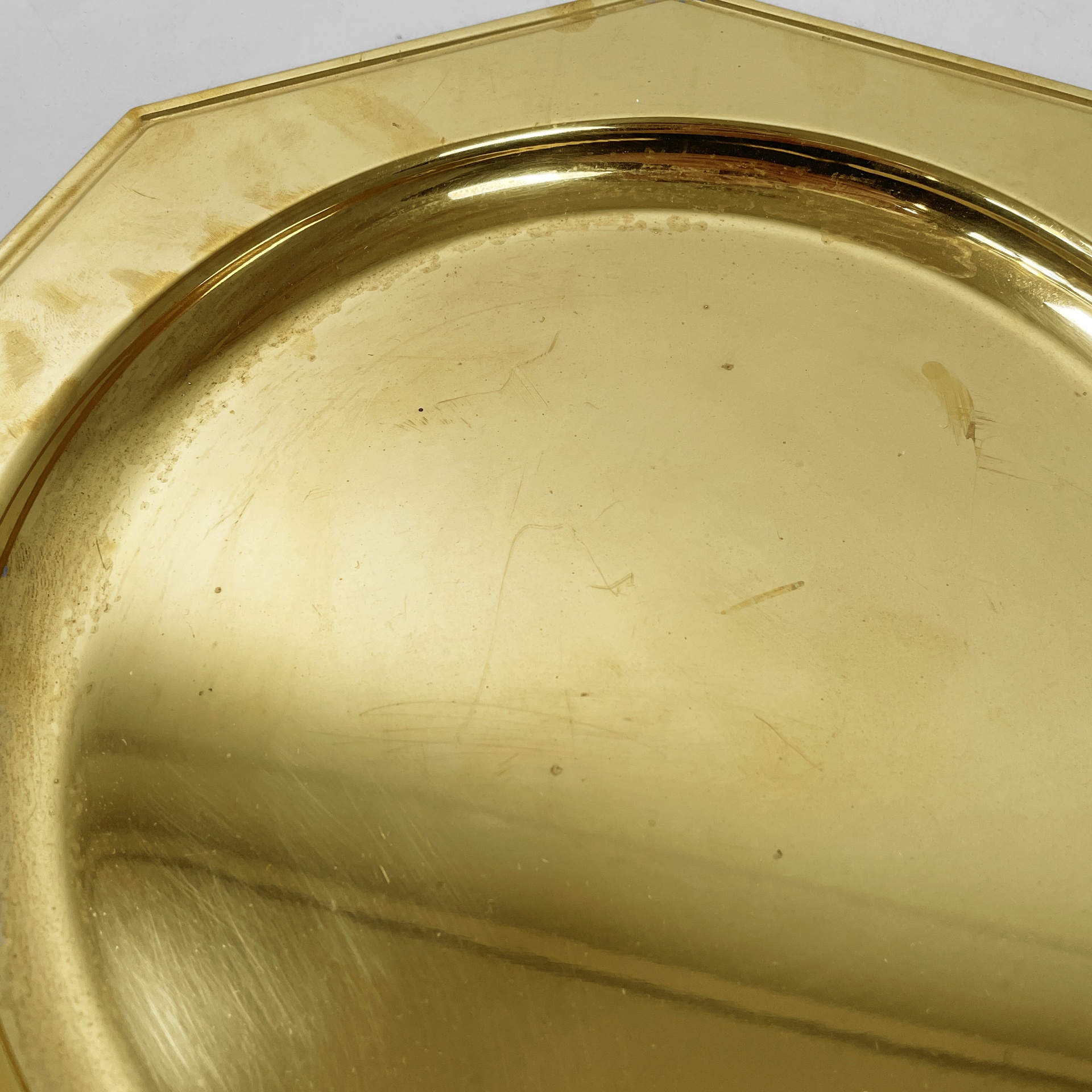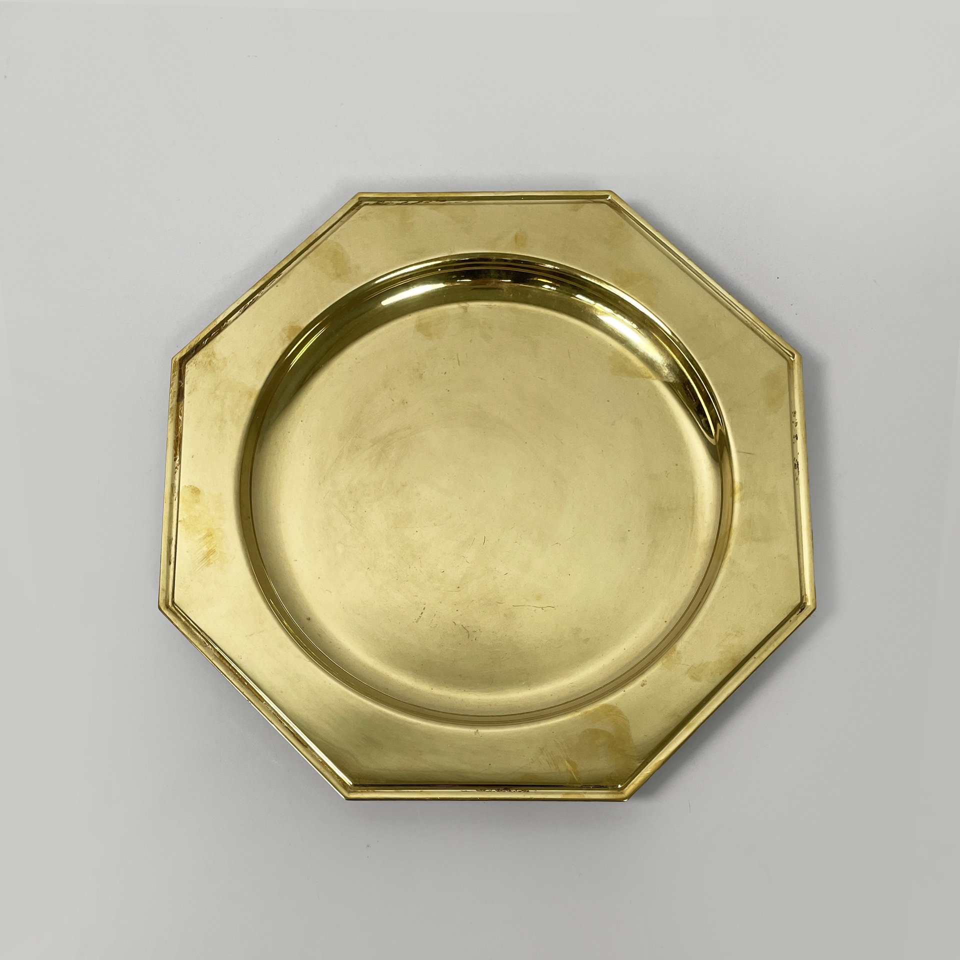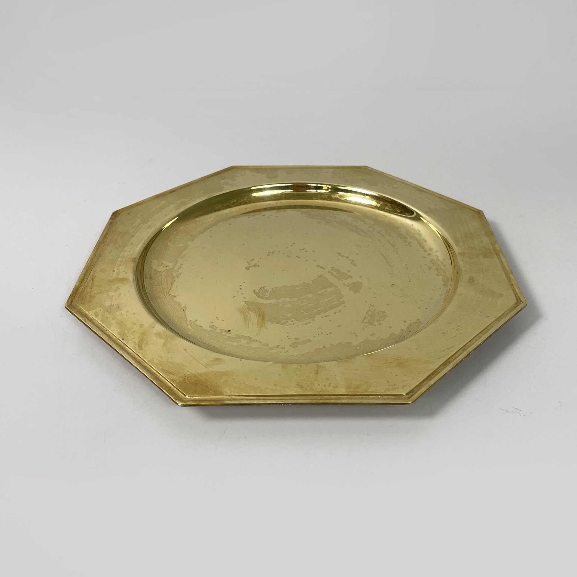 Set di otto piatti di grandi dimensioni a forma esagonale interamente in ottone. La parte centrale di forma tonda per contenere. Utilizzabili come sottopiatti, vassoi o centrotavola.