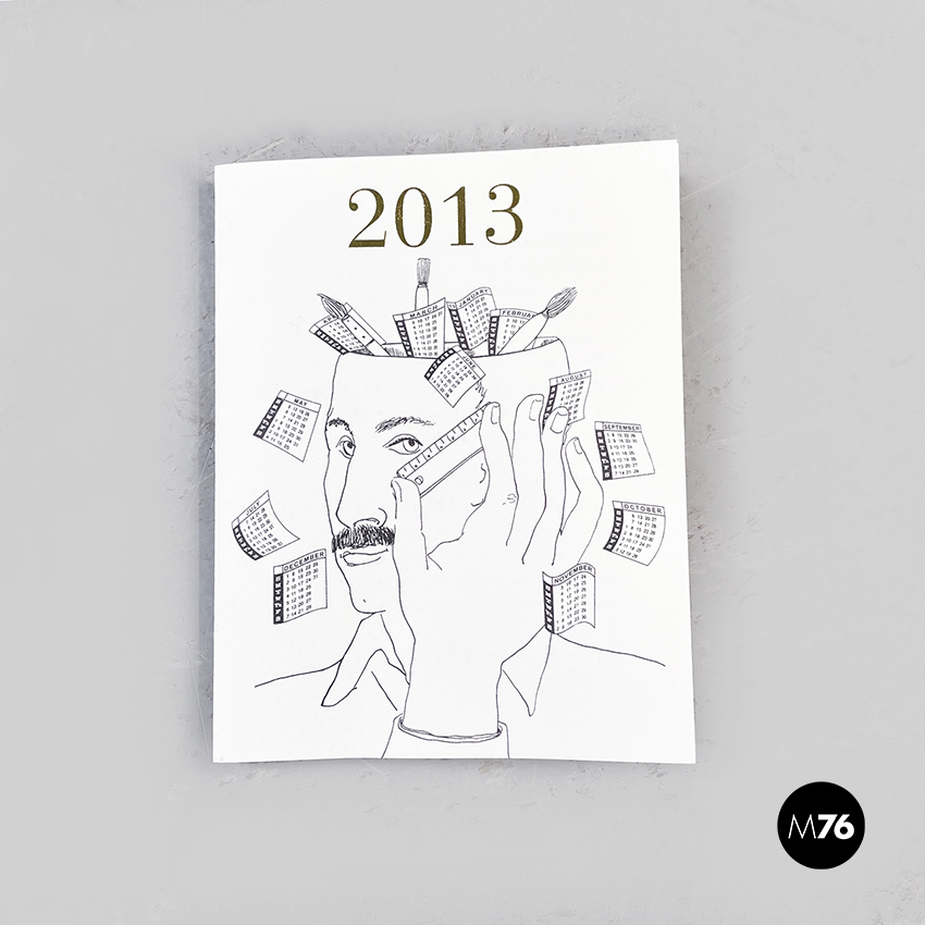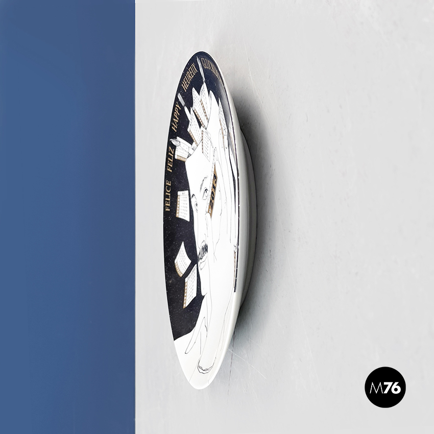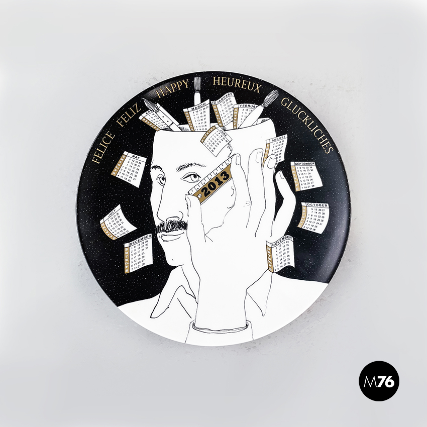 Piatto calendario da parete del 2013, edizione limitata, in ceramica. Presenta il disegno del volto di un uomo con righello in bianco e nero con inserti dorati.