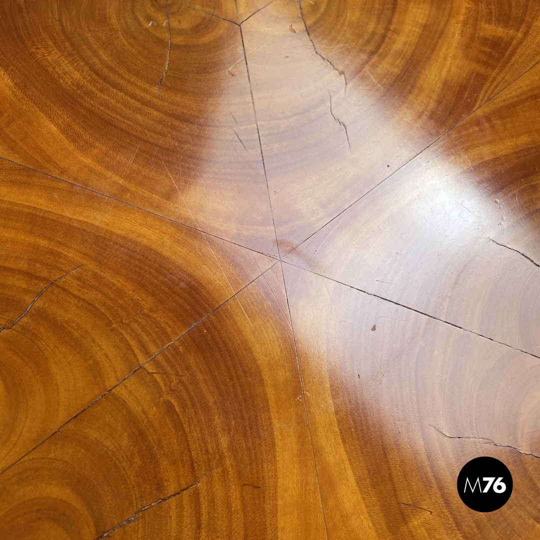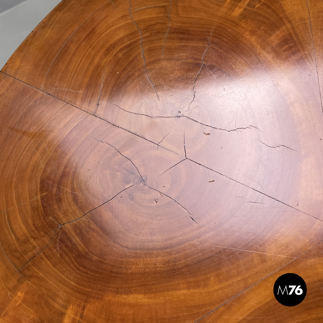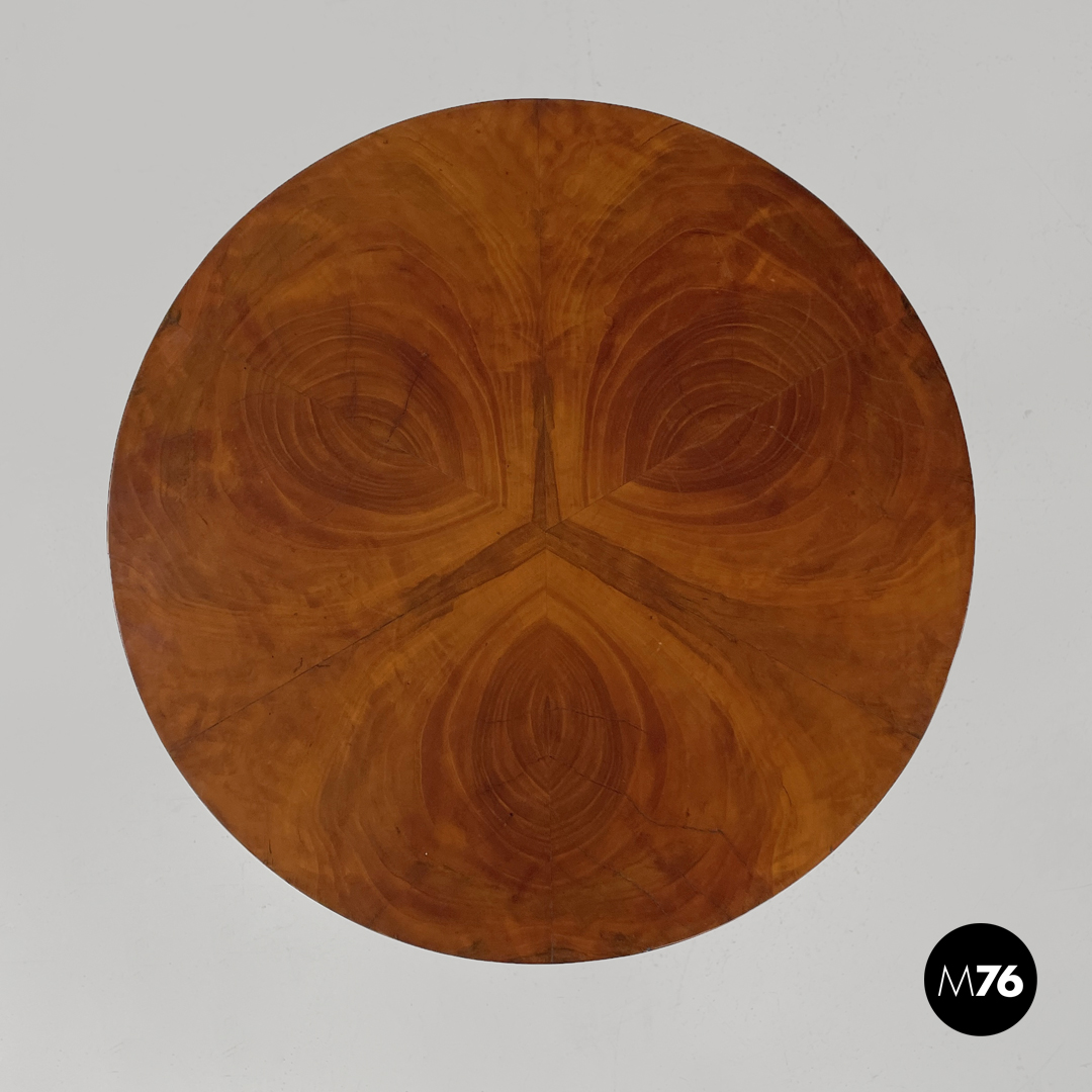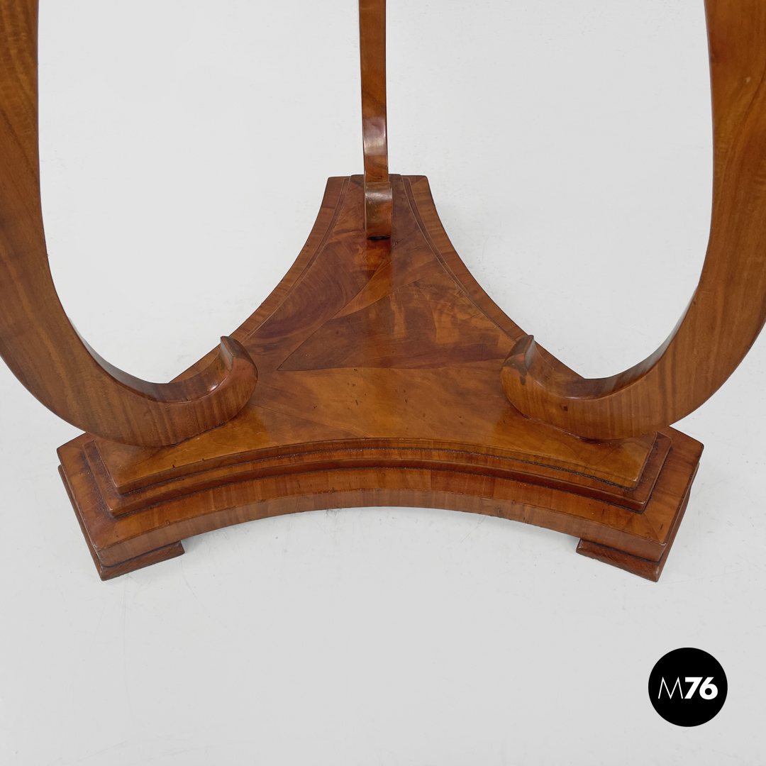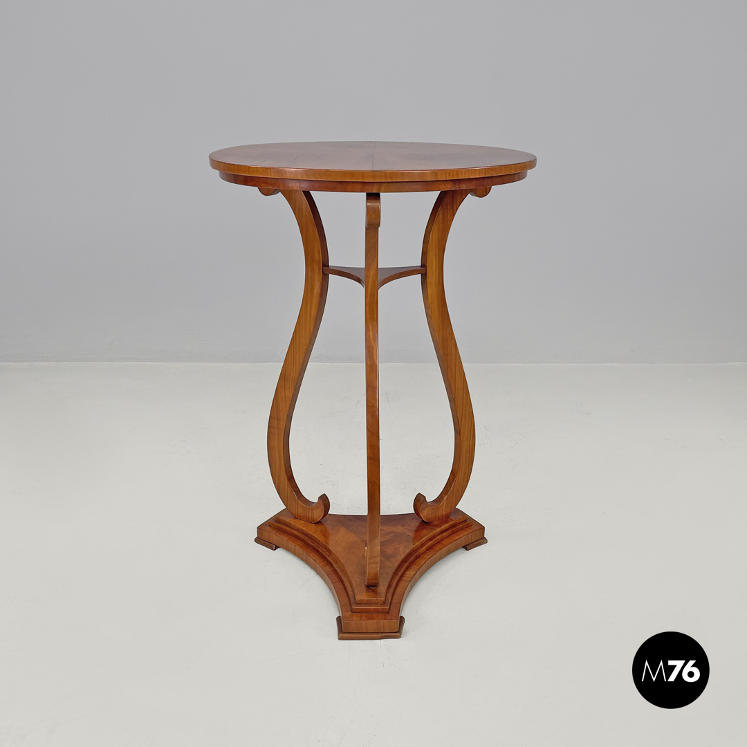 Coppia di piedistalli tondi in legno. Il piano presenta sei linee geometriche che si incrociano nel centro. Le gambe a sezione rettangolare sono curve e tondeggianti, all’appoggio al tavolo e alla base formano un ricciolo. Sotto al piano di trova una piccola mensola triangolare curvata che segue le stesse linee della base. Utilizzabili come tavoli da caffè, colonnine o espositori.In stile Biedermeier.