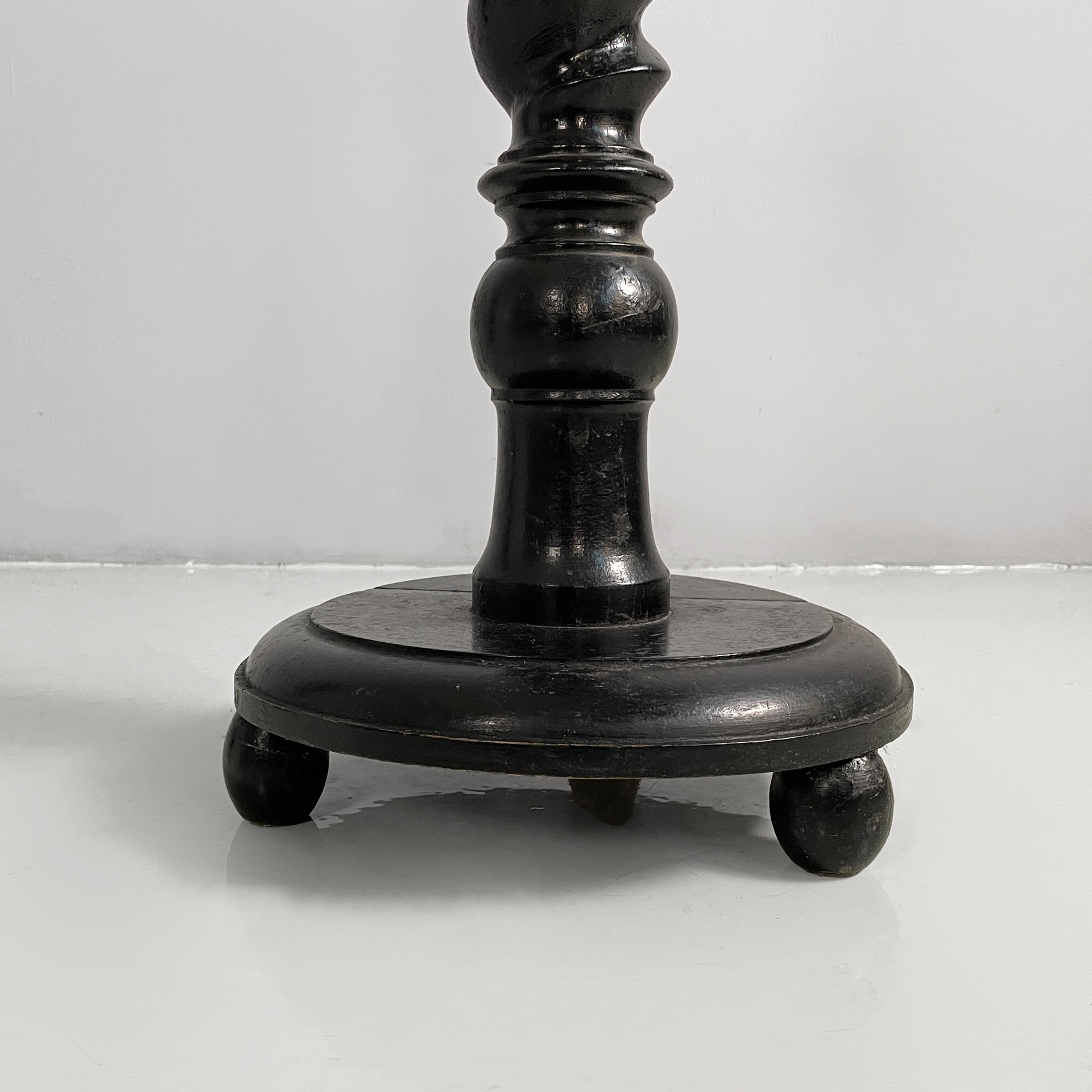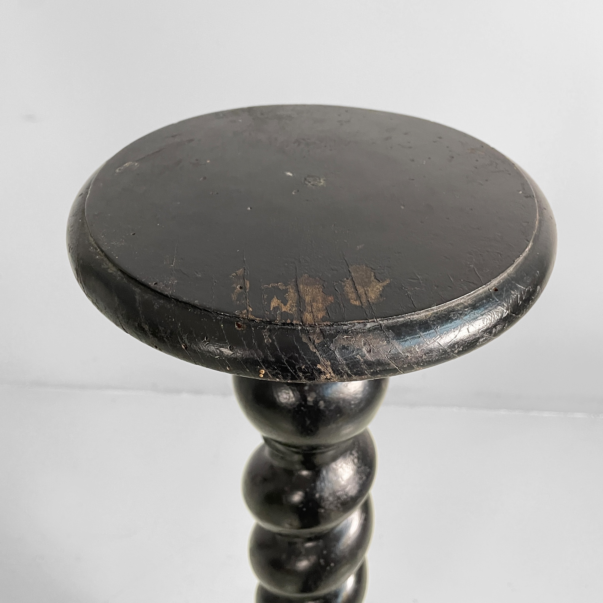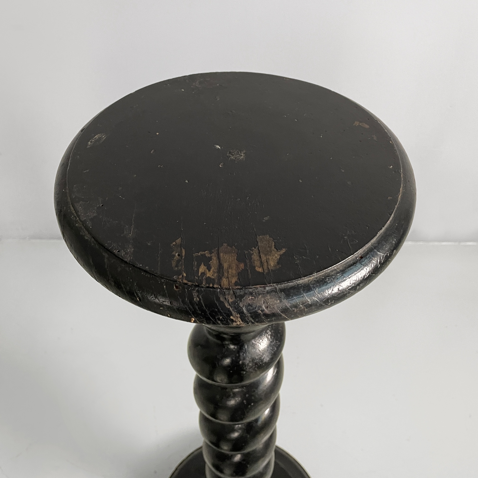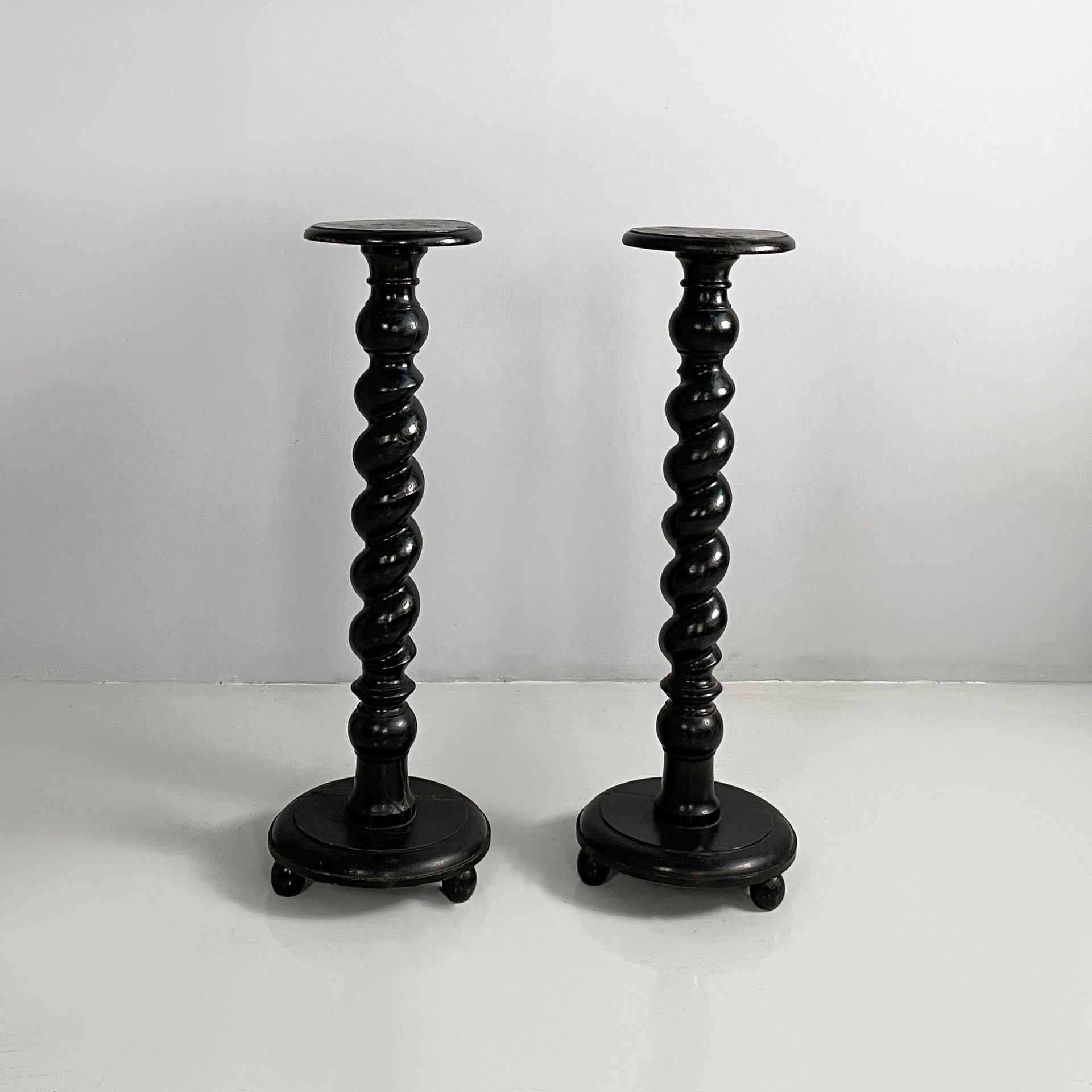 Coppia di colonne o piedistalli con piano tondo in legno verniciato nero. La struttura è in legno tornito verniciato nero. La base tonda ha tre piedini sferici. In stile 1800 ca. Utilizzabili come espositori.