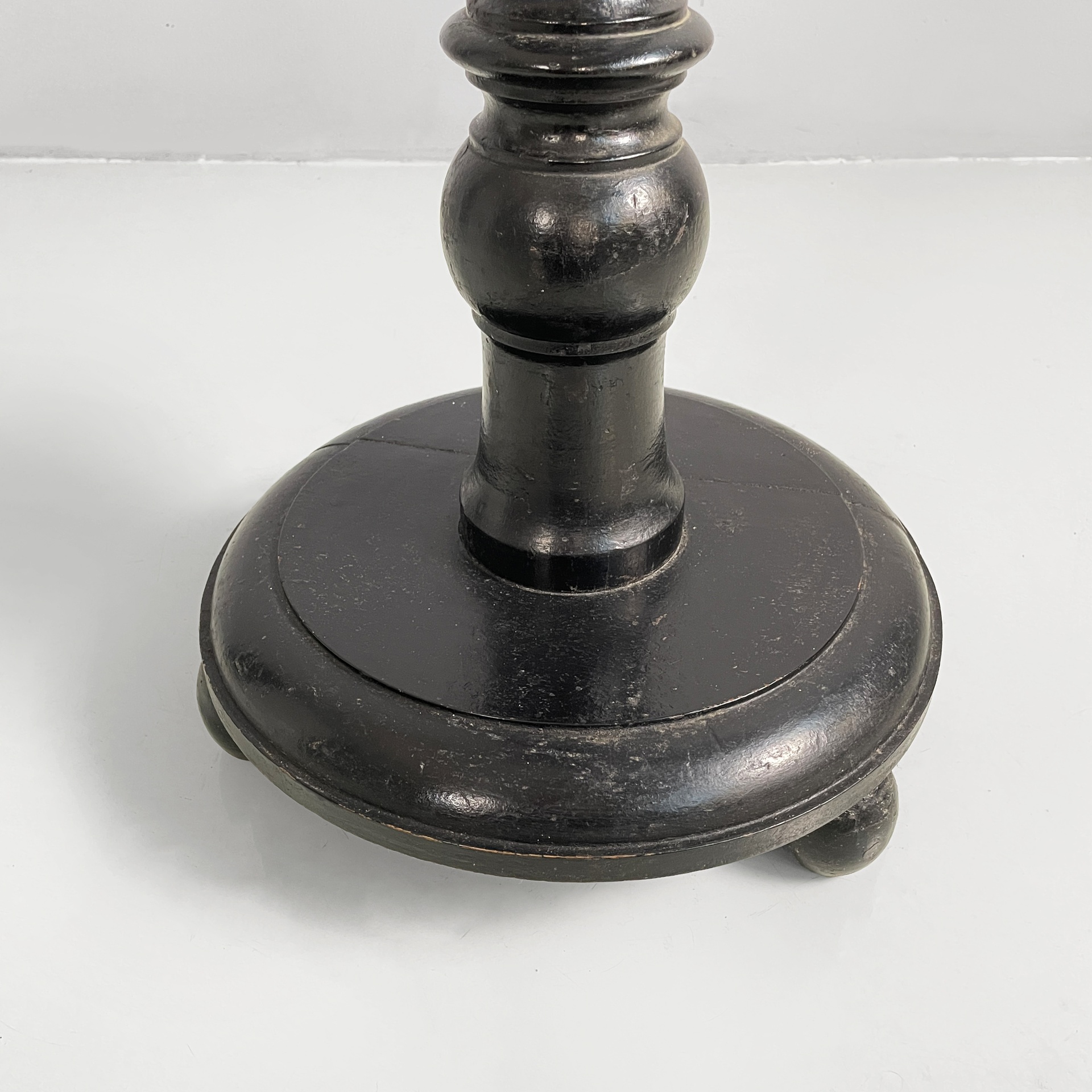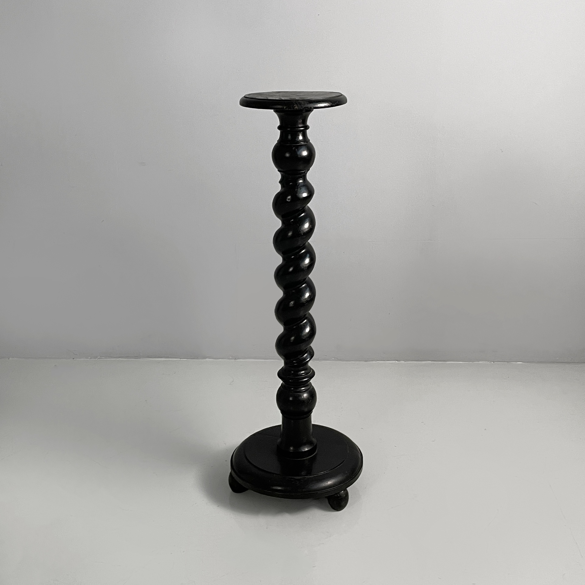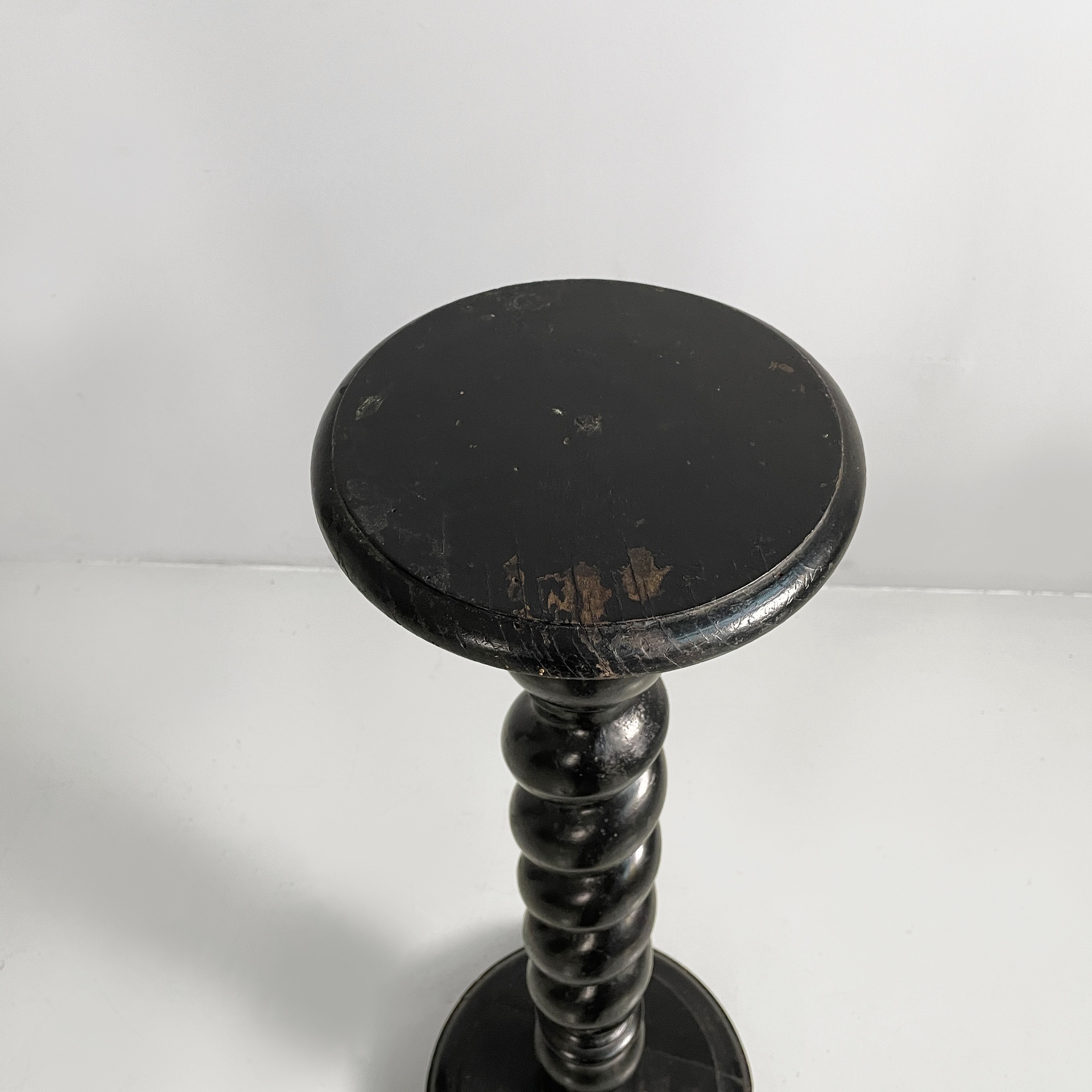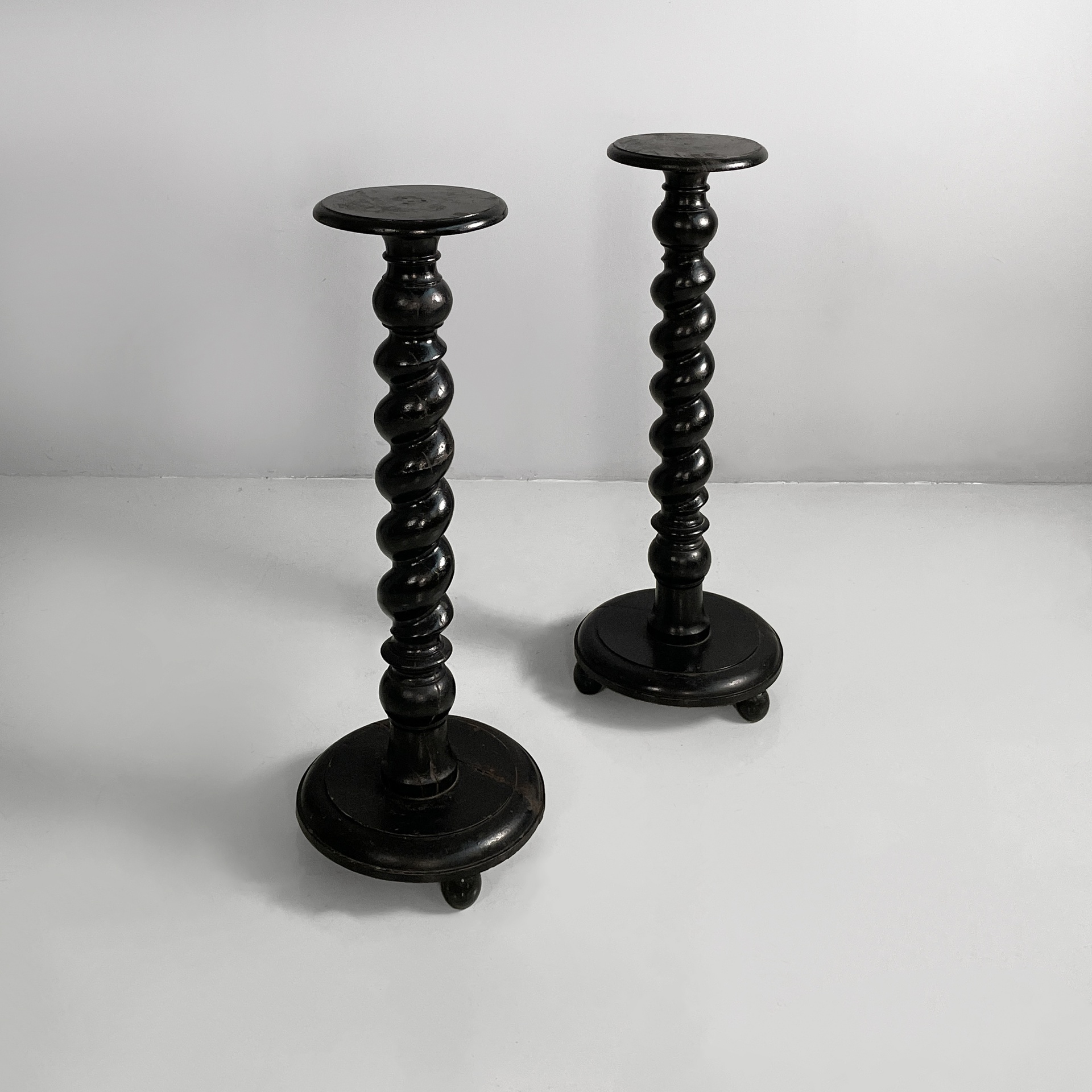 Coppia di colonne o piedistalli con piano tondo in legno verniciato nero. La struttura è in legno tornito verniciato nero. La base tonda ha tre piedini sferici. In stile 1800 ca. Utilizzabili come espositori.