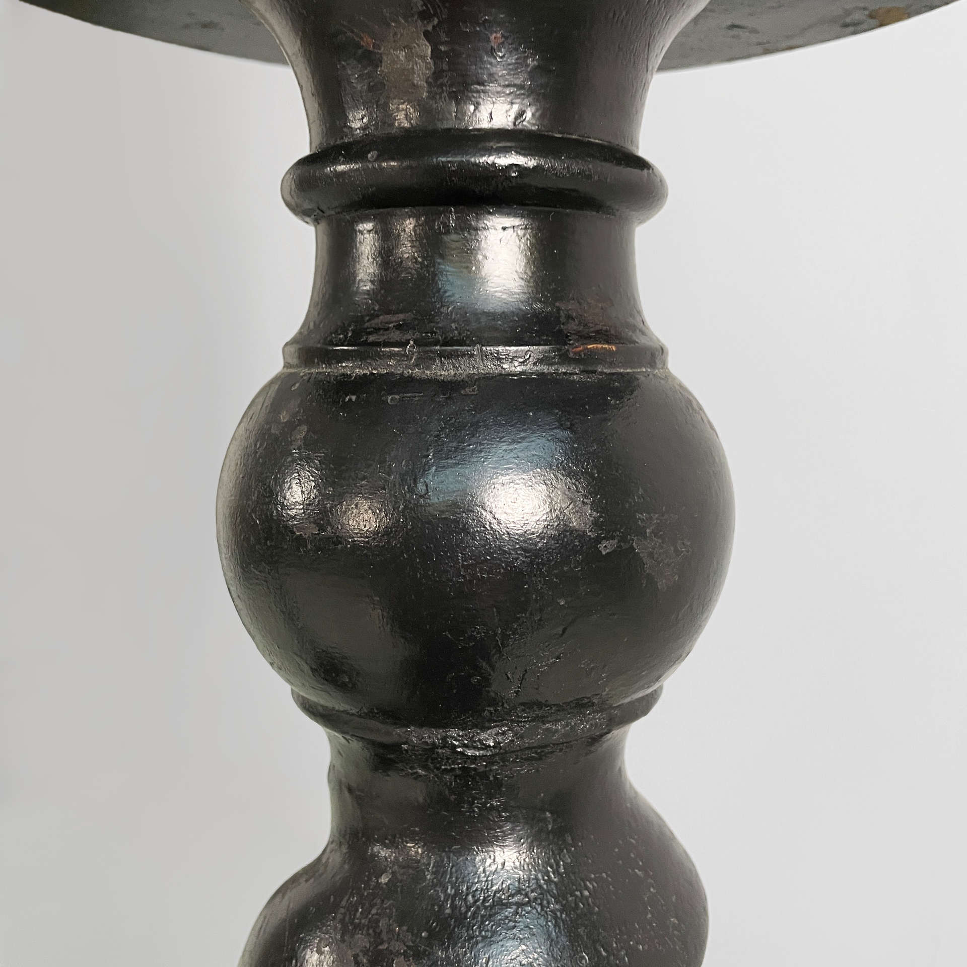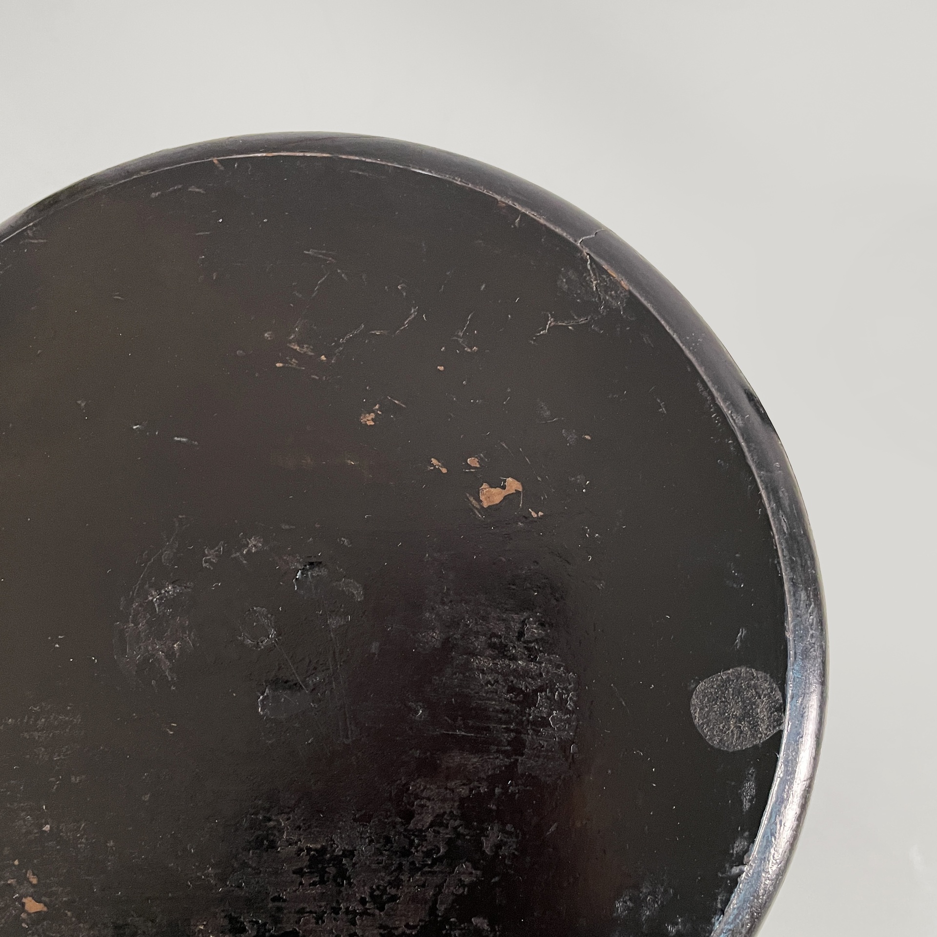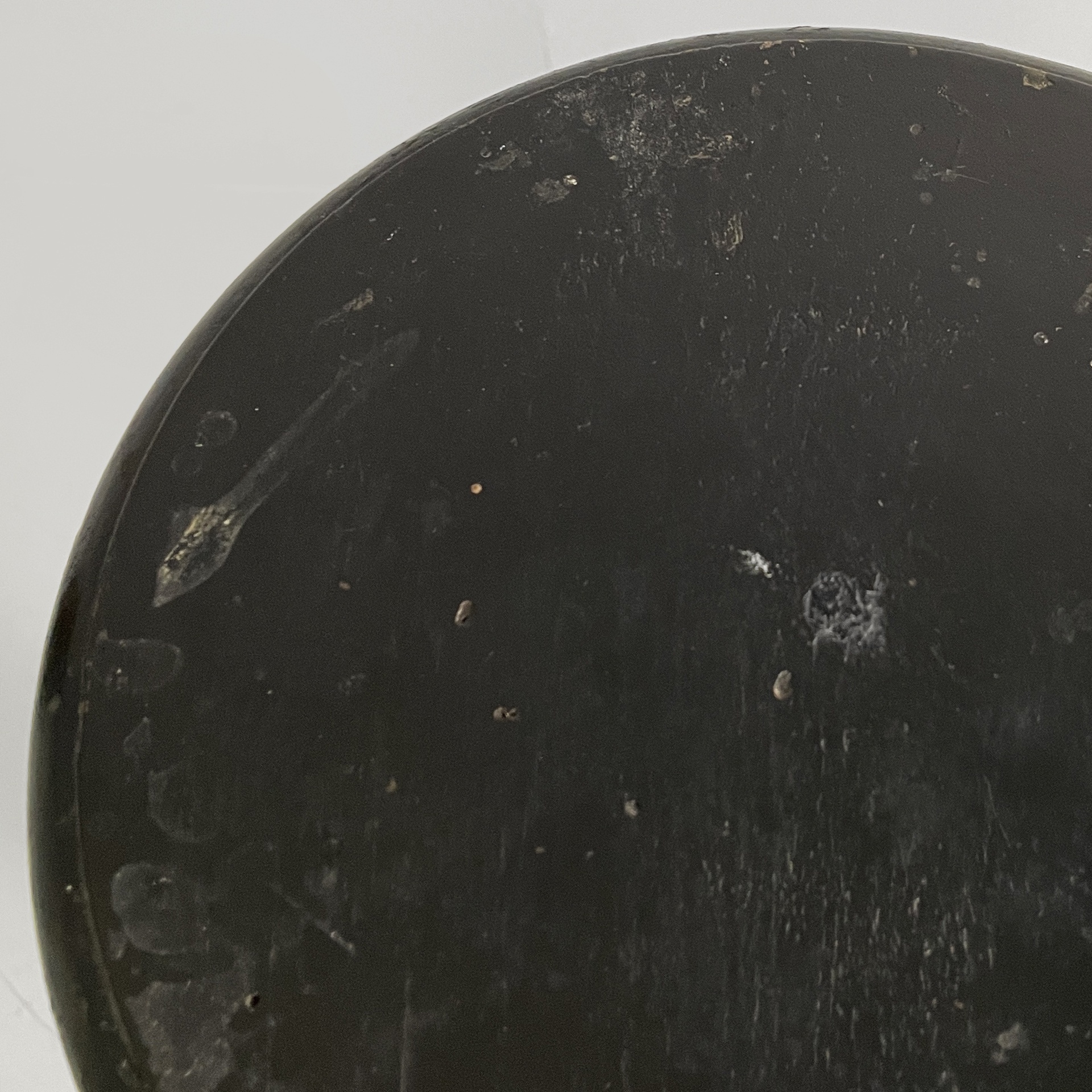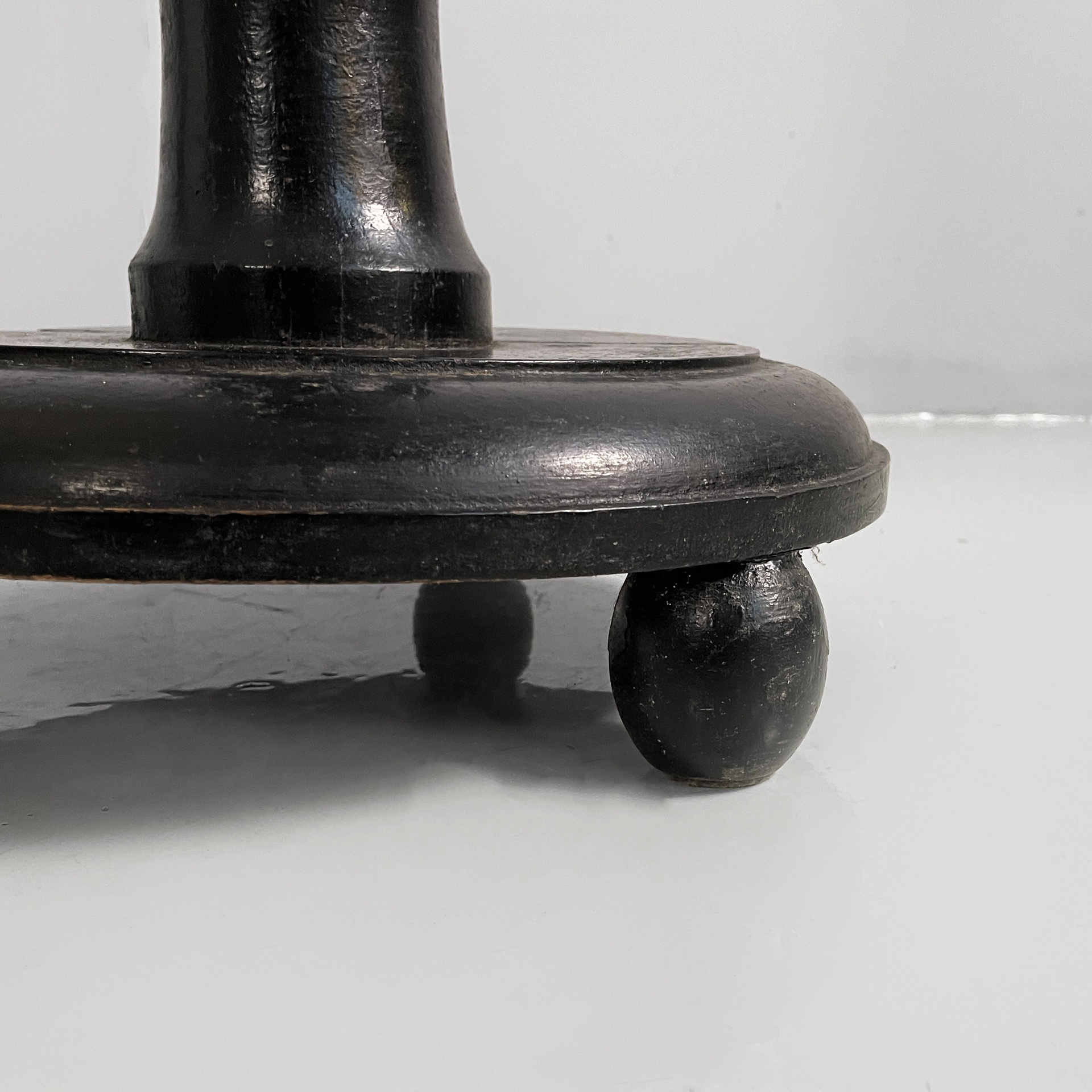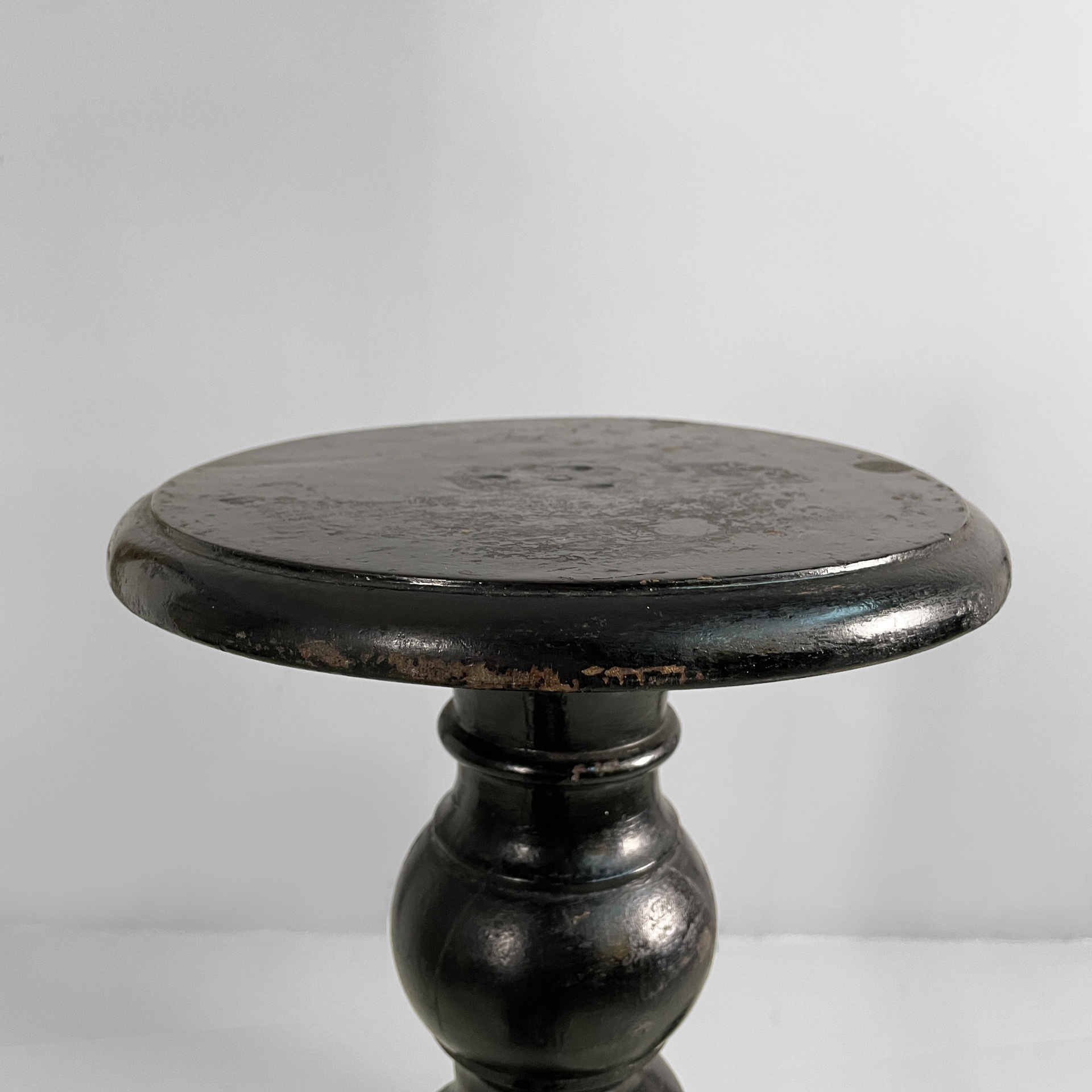 Coppia di colonne o piedistalli con piano tondo in legno verniciato nero. La struttura è in legno tornito verniciato nero. La base tonda ha tre piedini sferici. In stile 1800 ca. Utilizzabili come espositori.