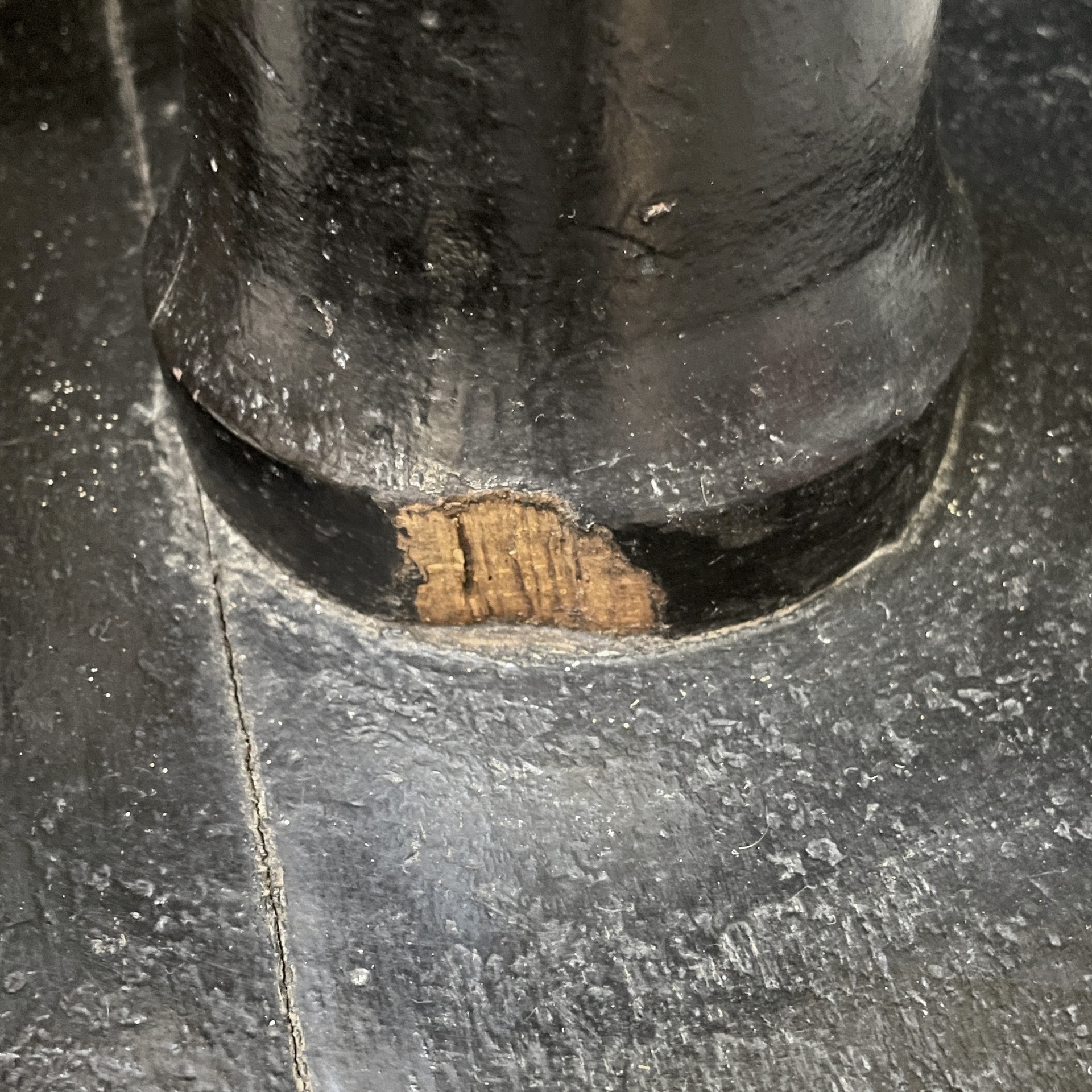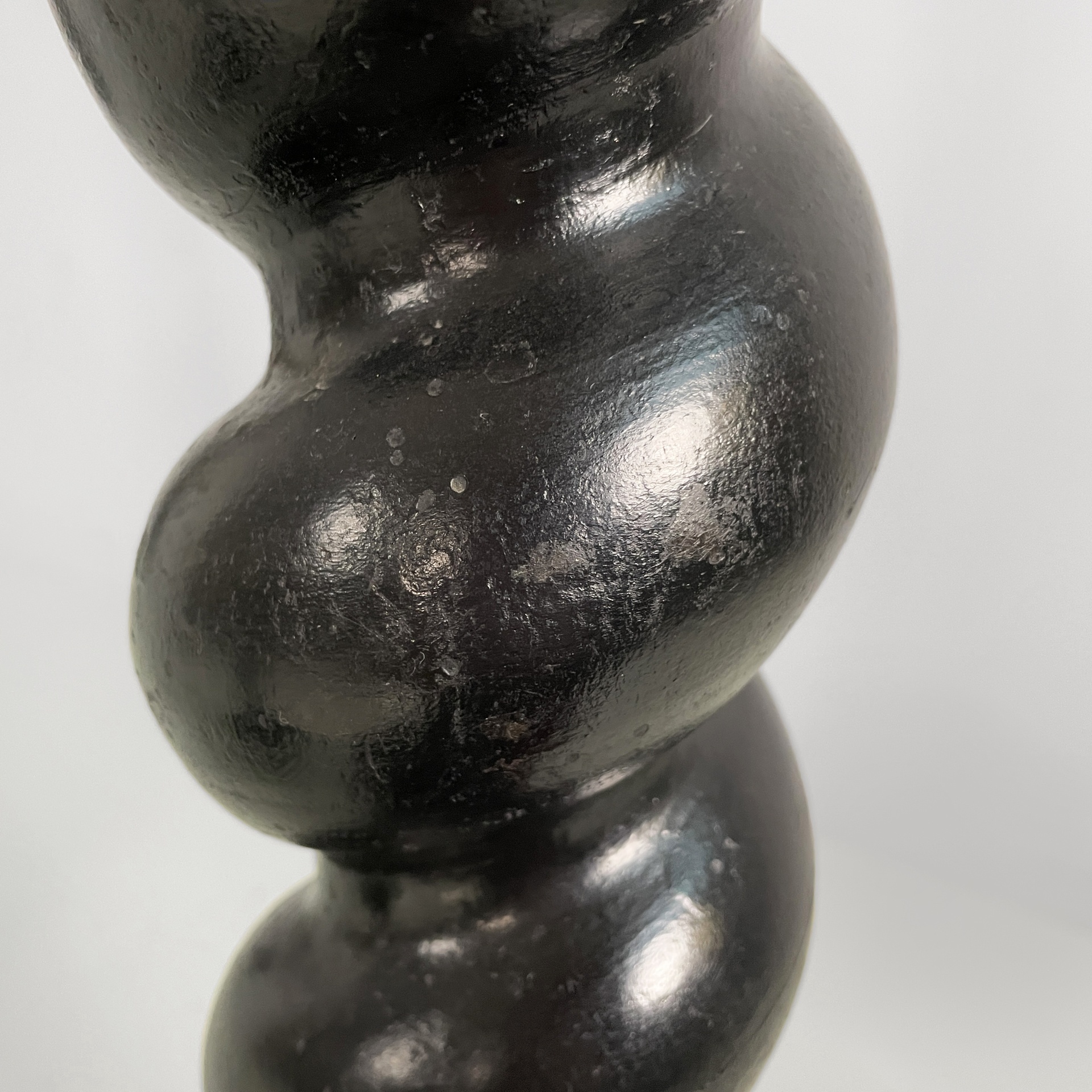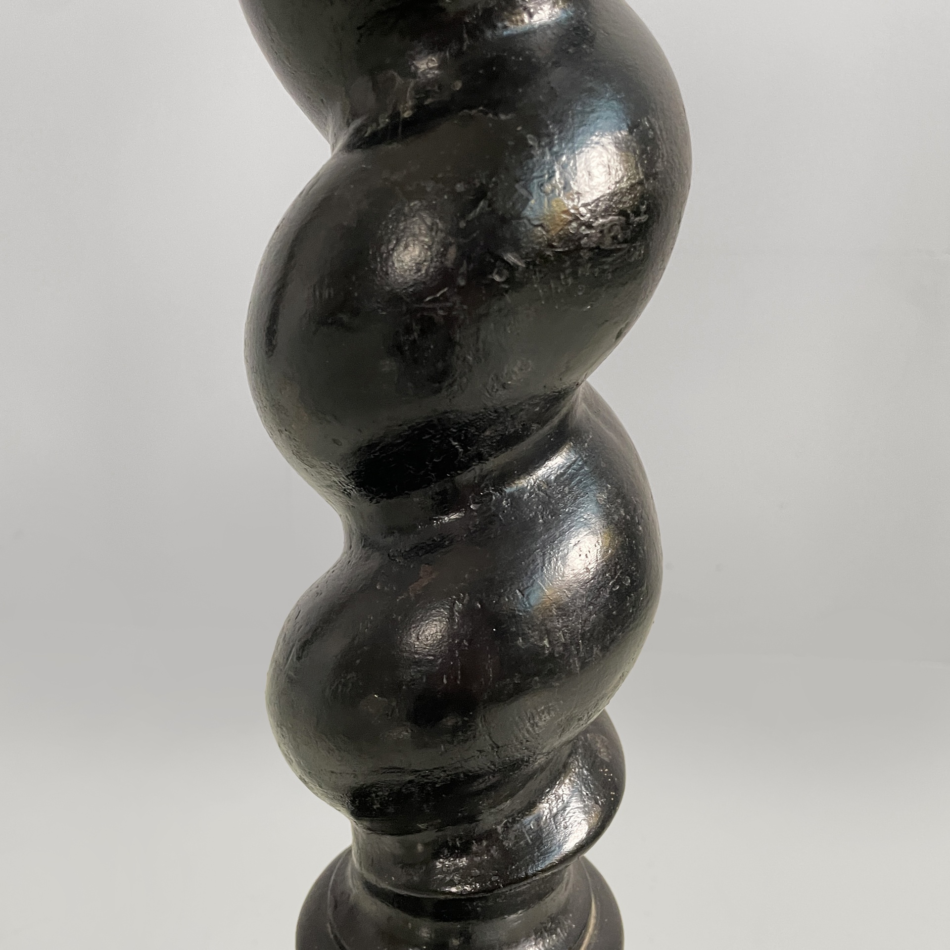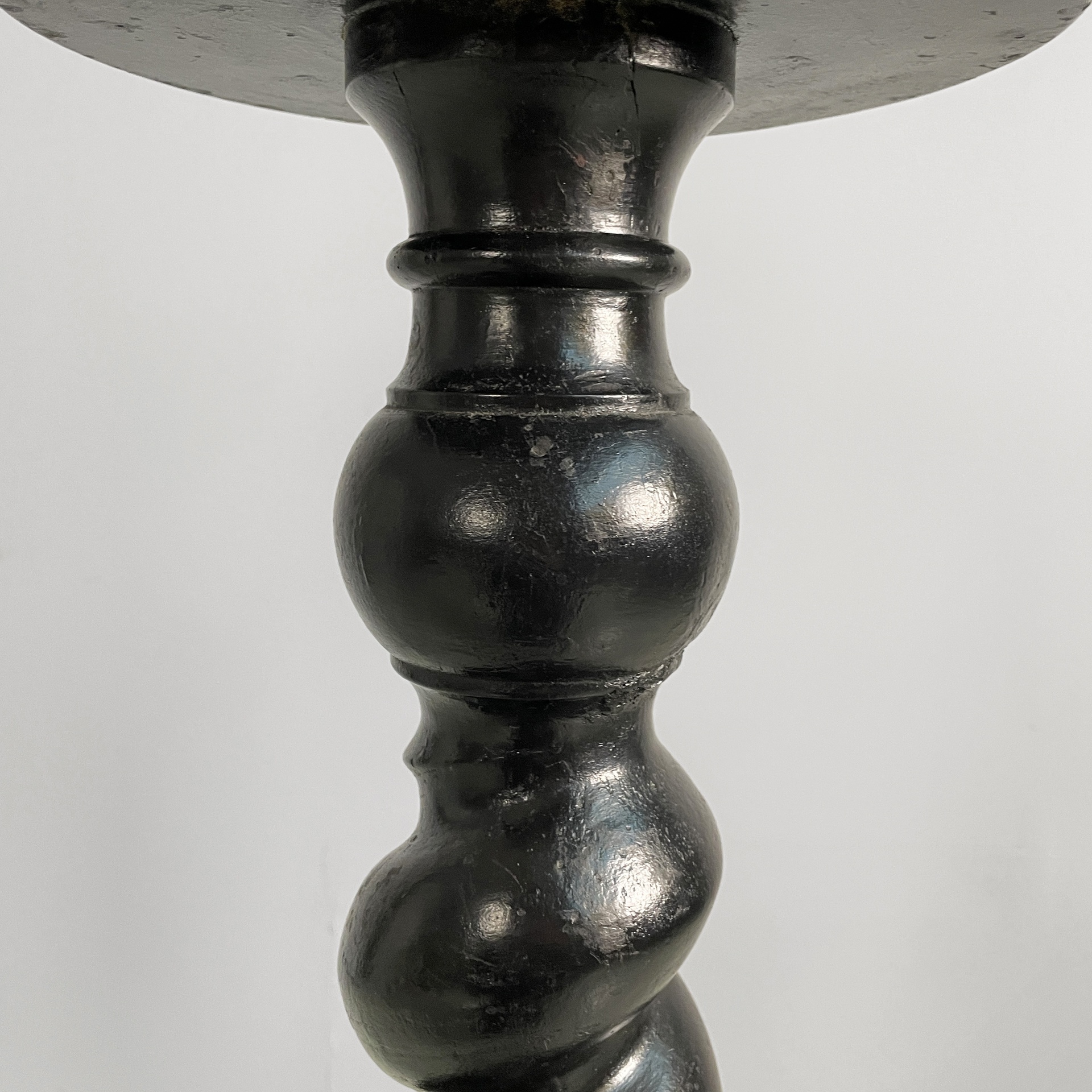 Coppia di colonne o piedistalli con piano tondo in legno verniciato nero. La struttura è in legno tornito verniciato nero. La base tonda ha tre piedini sferici. In stile 1800 ca. Utilizzabili come espositori.